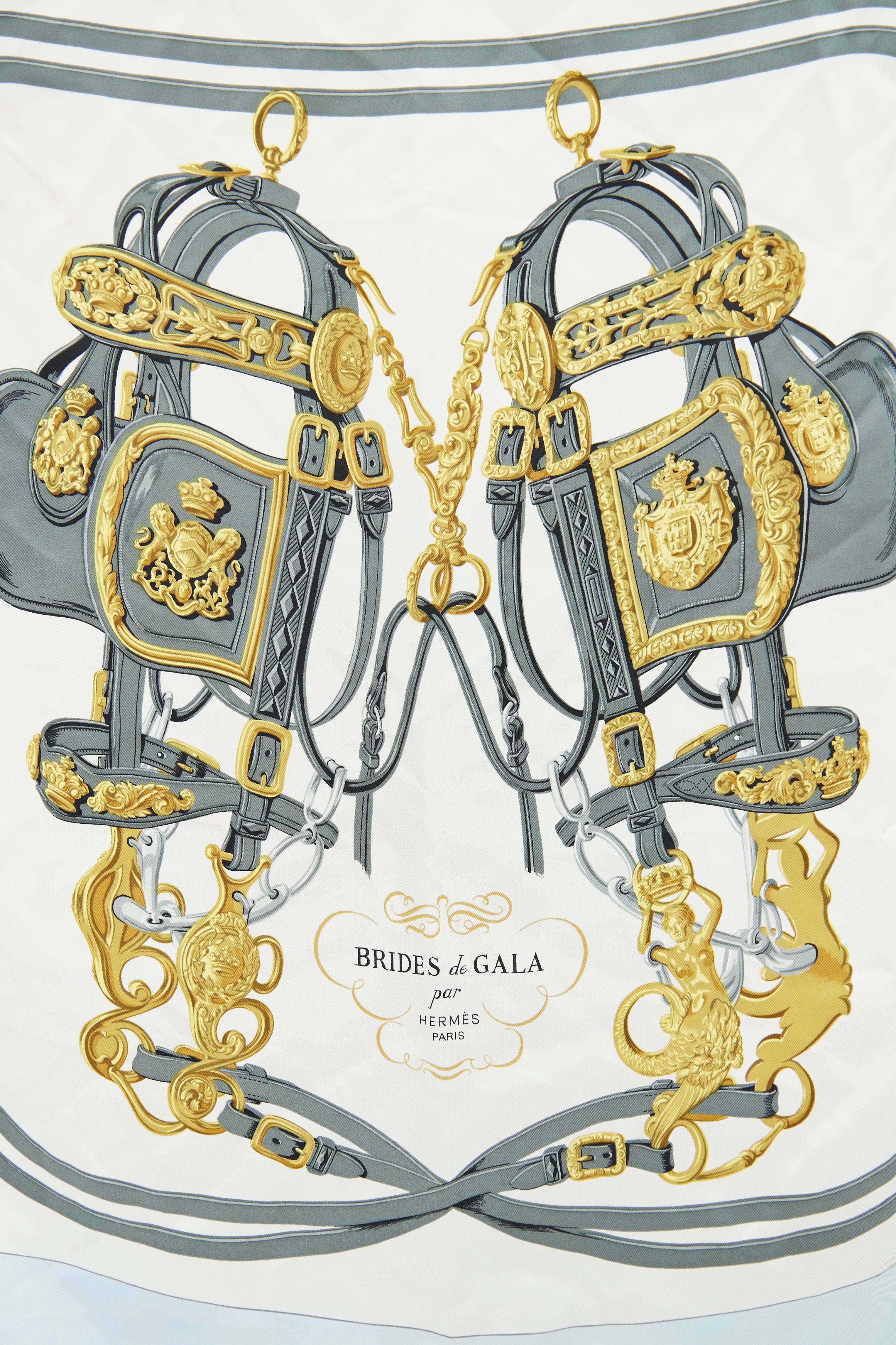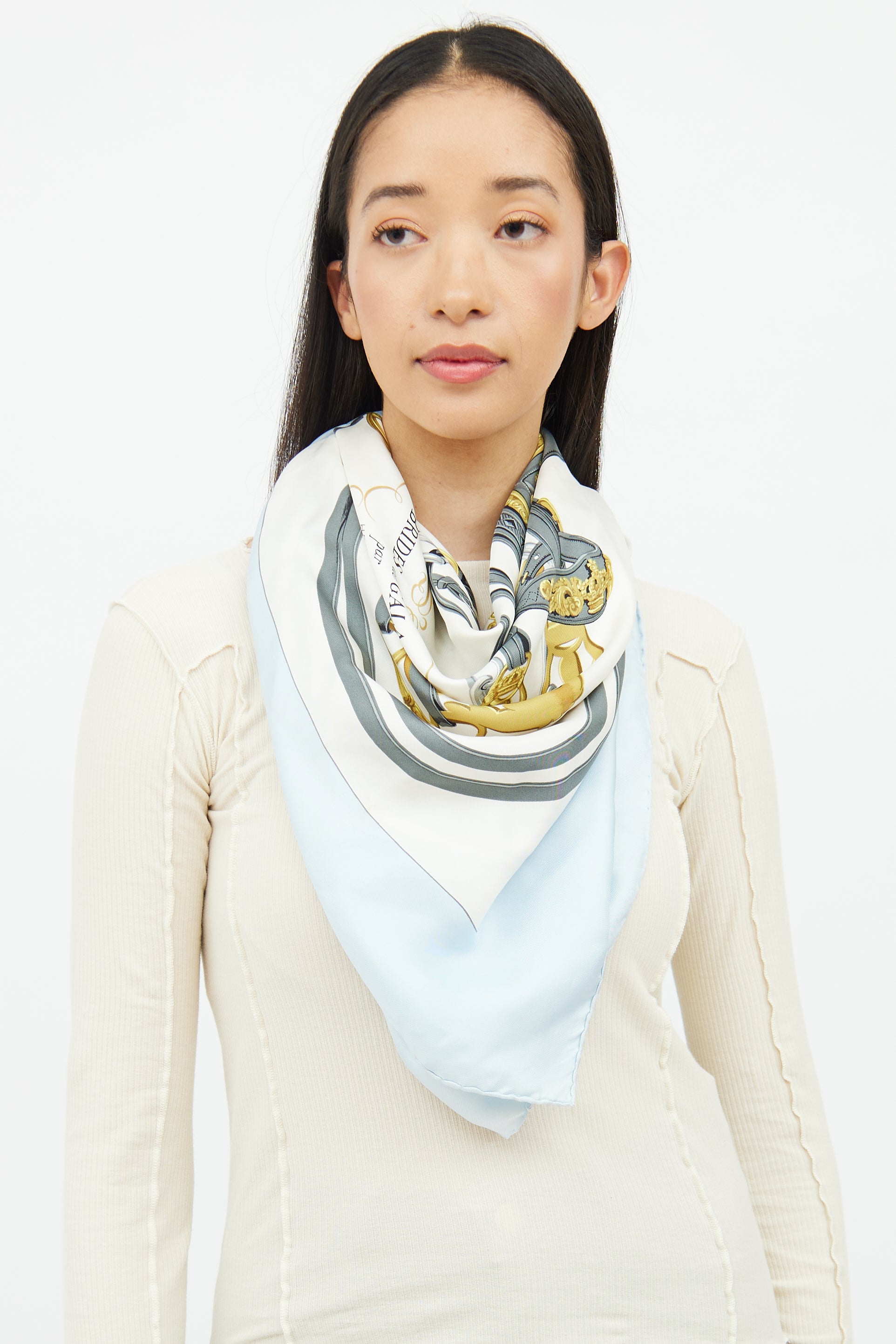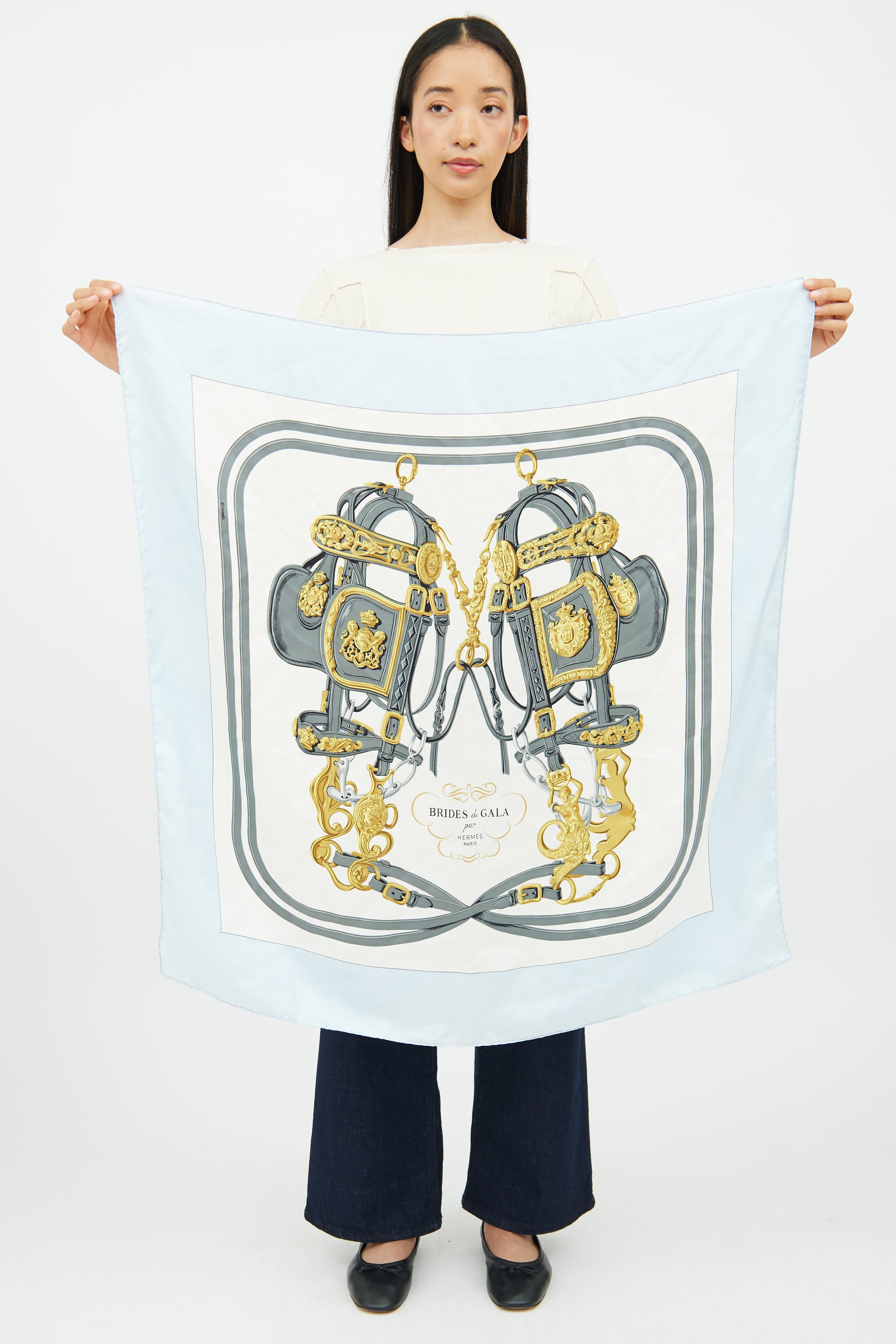Pre-owned Hermès blue and white Brides de Gala 90 scarf featuring featuring Brides de Gala print by Hugo Grygkar, gold bridles motif, and tonal hand-rolled edges.