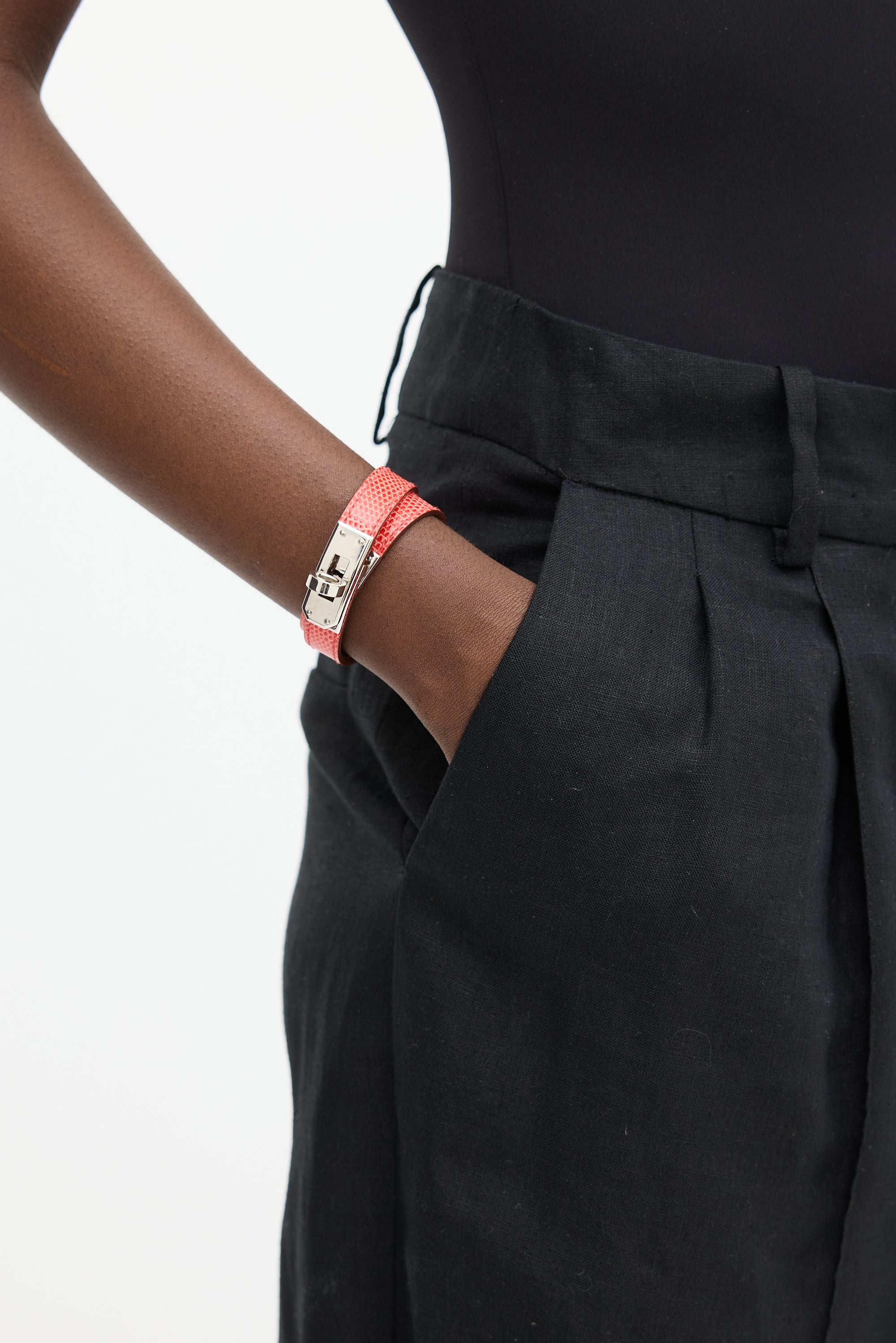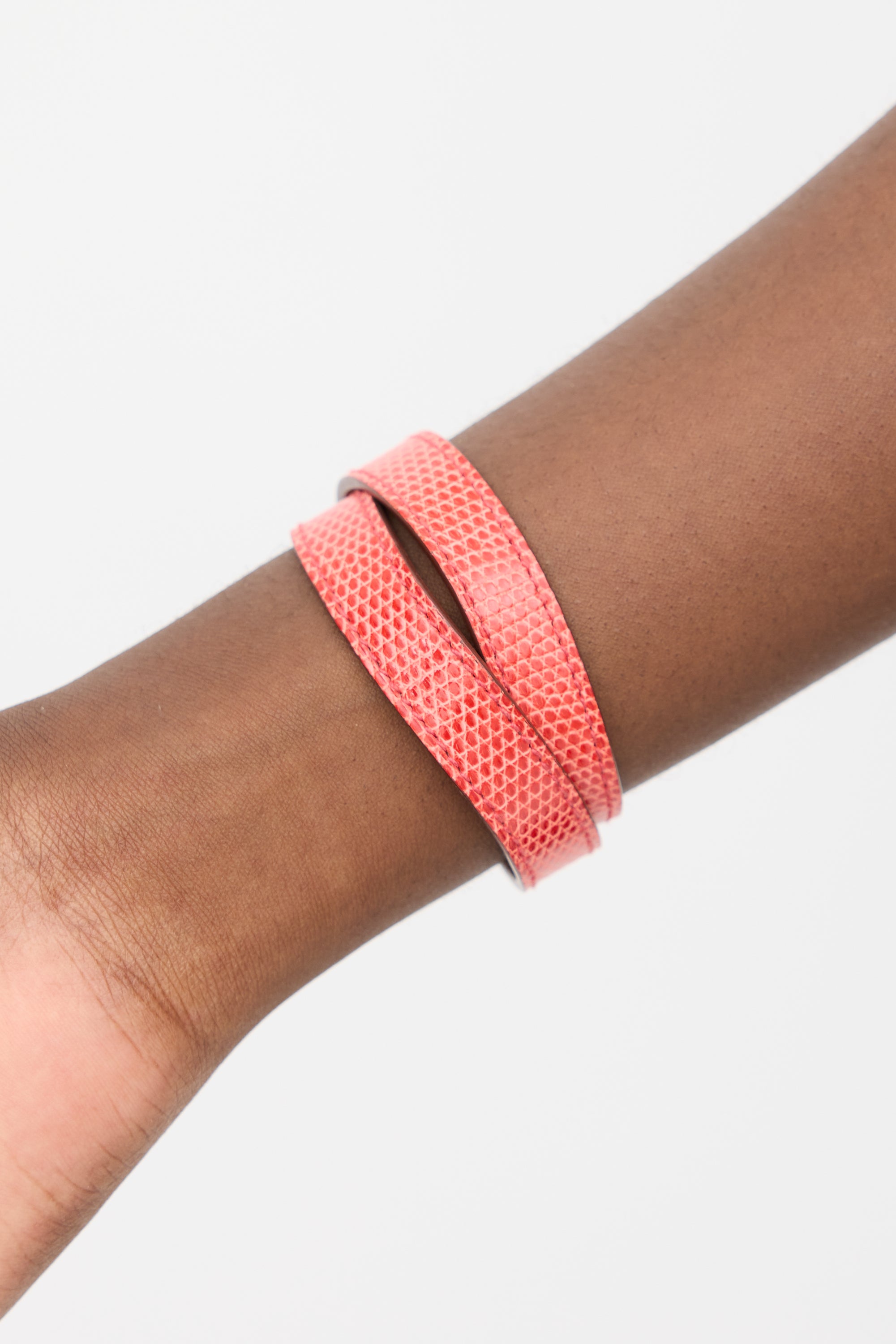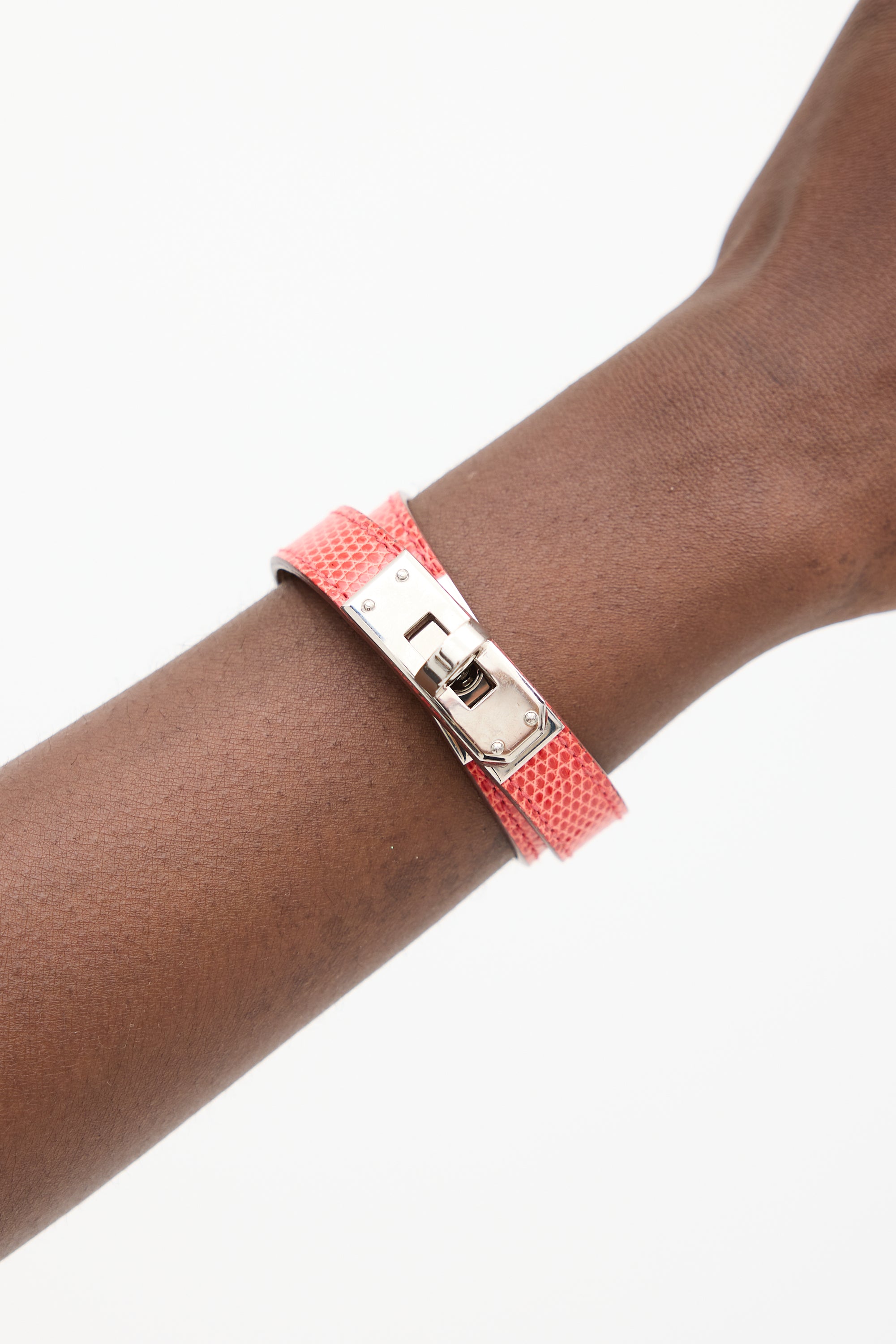 Pre-owned Hermès bougainvillea Kelly Double Tour bracelet in lizard skin featuring a textured band, embossed logo at interior, tonal stitching, palladium plated hardware, and twist lock closure. Comes with original dust bag and box.