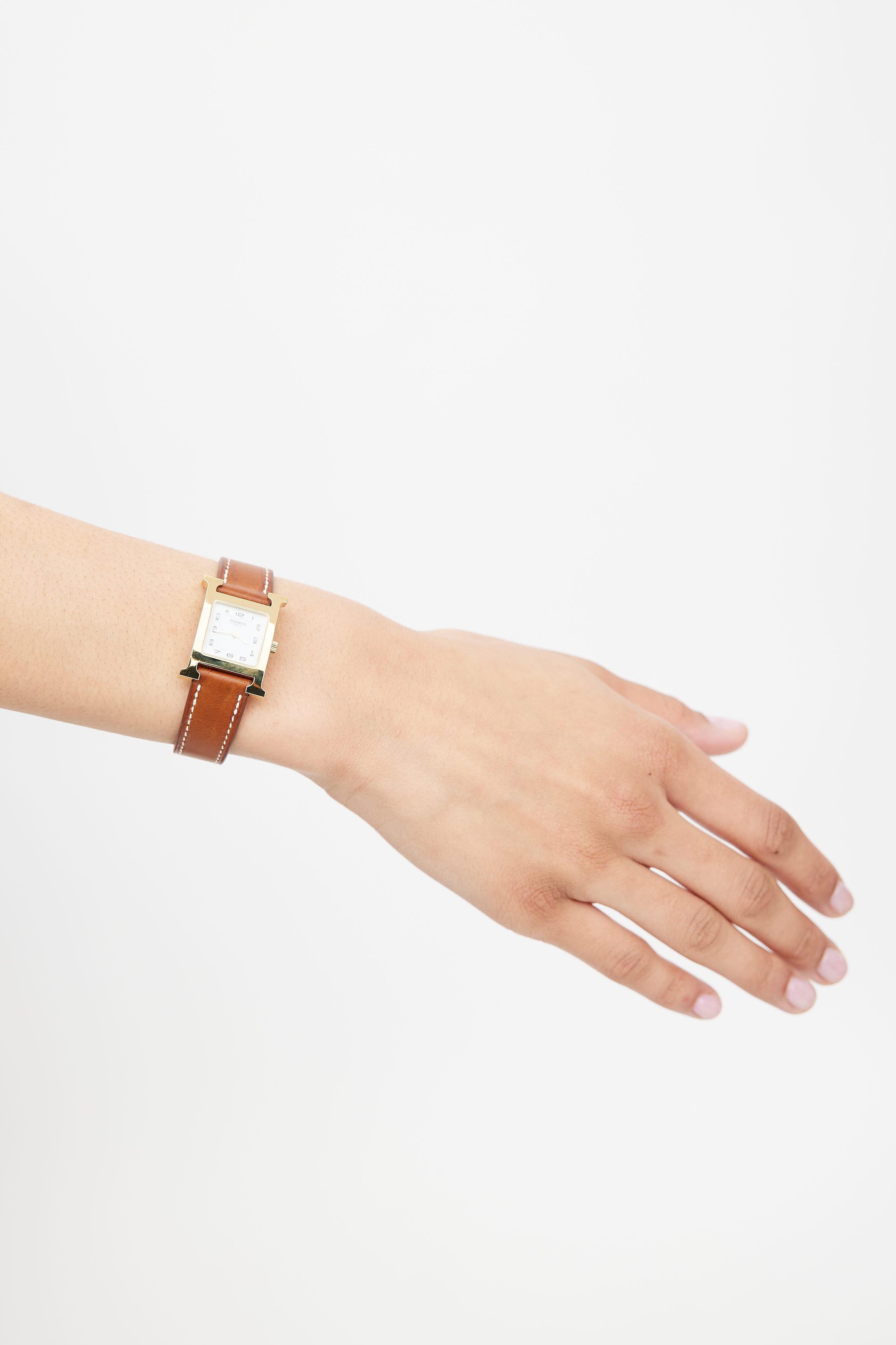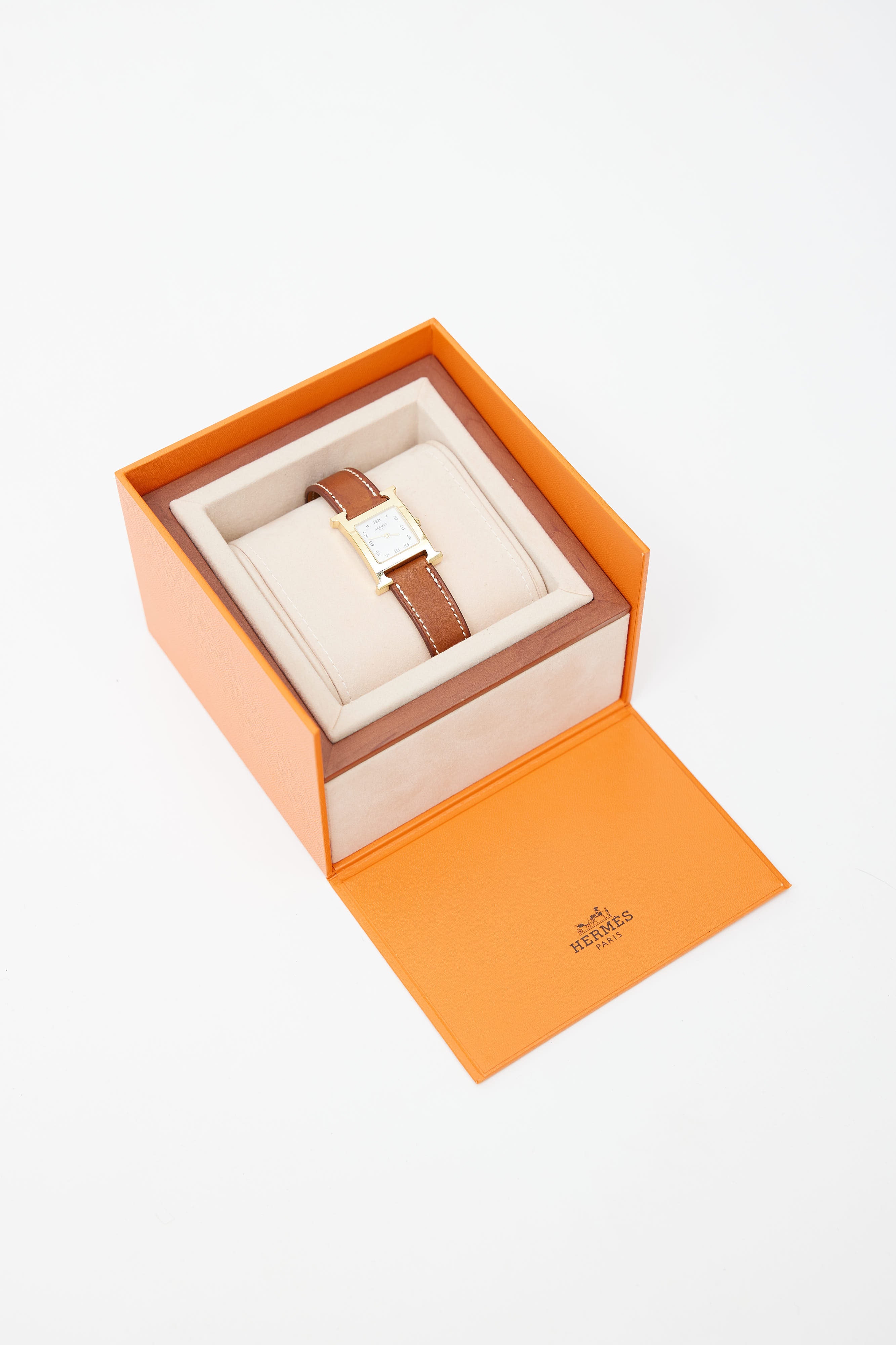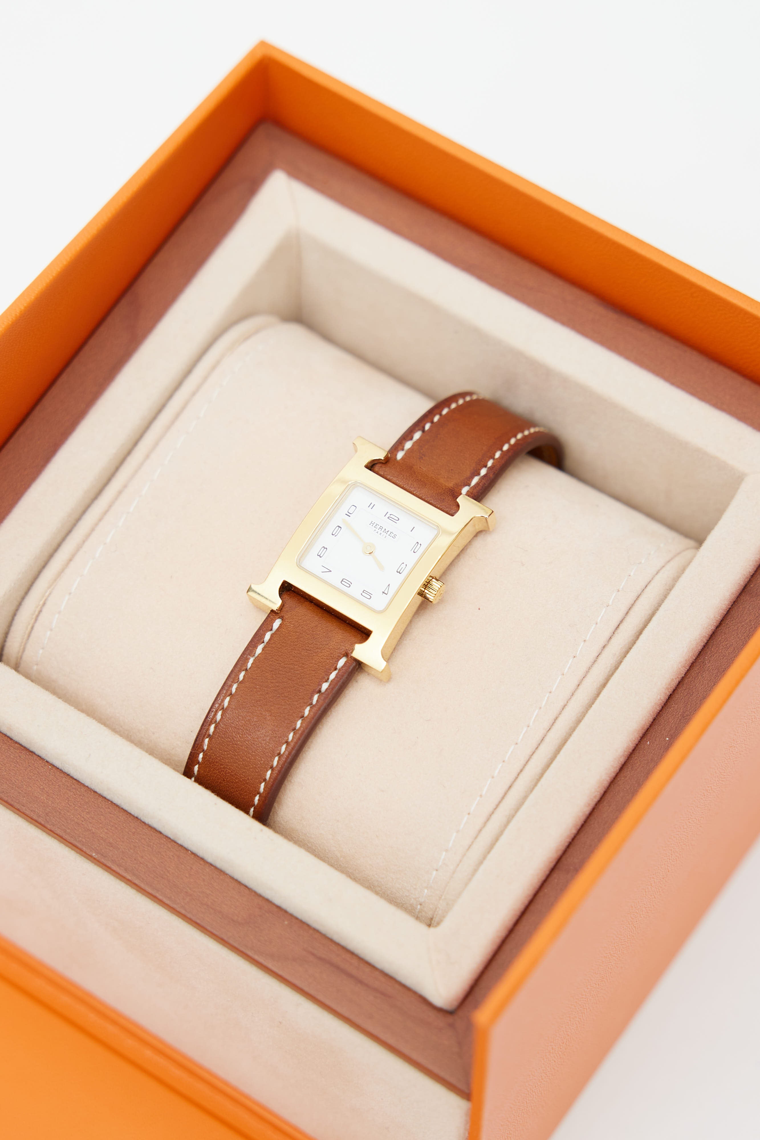 Pre-owned Hermès Heure H Mini 21mm watch featuring yellow gold plated H frame, quartz movement, gold tone clock arms, white contrast stitching, brown Barenia calfskin leather strap, yellow gold plated steel pin buckle, and water resistance to 3 bar. Original box included.