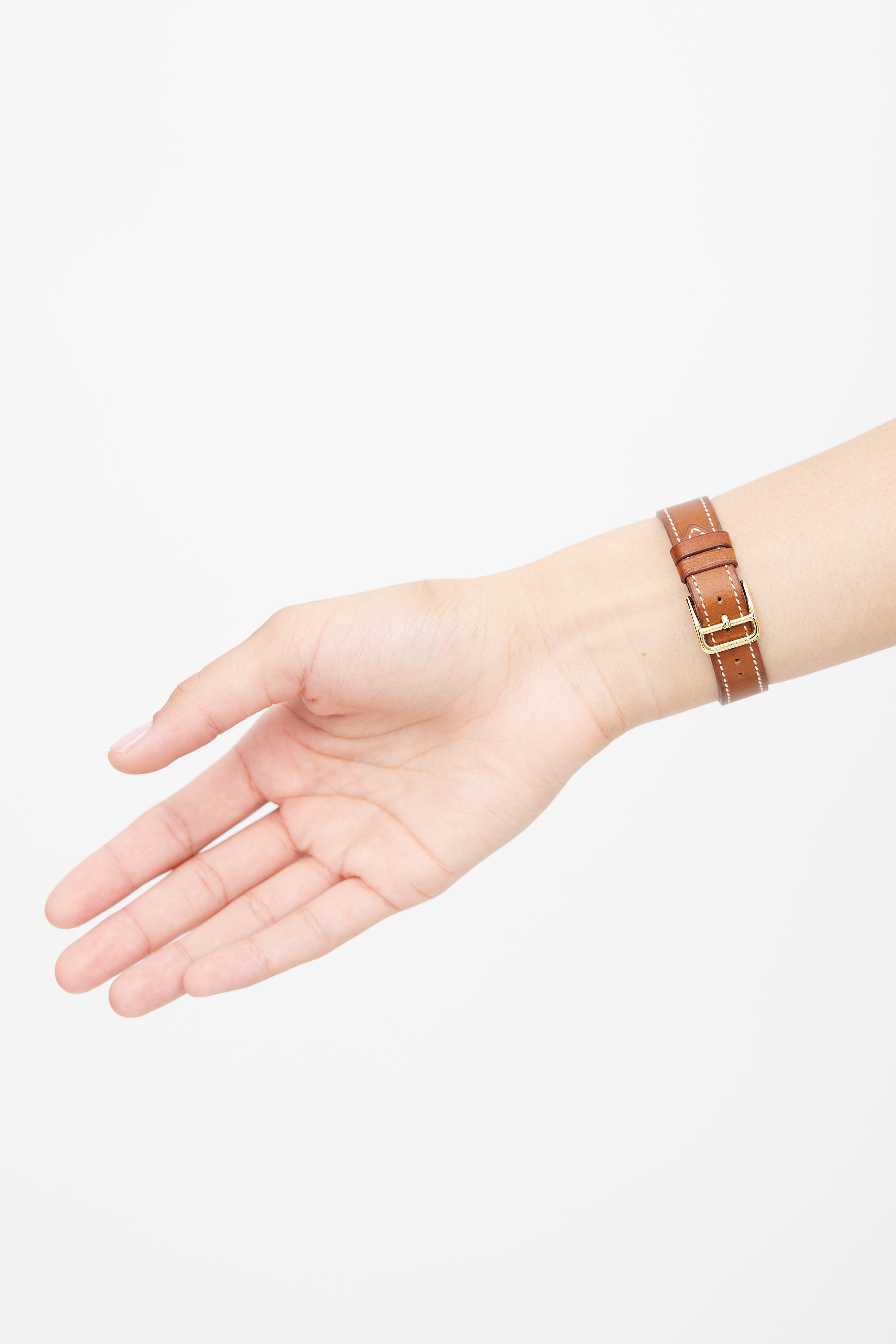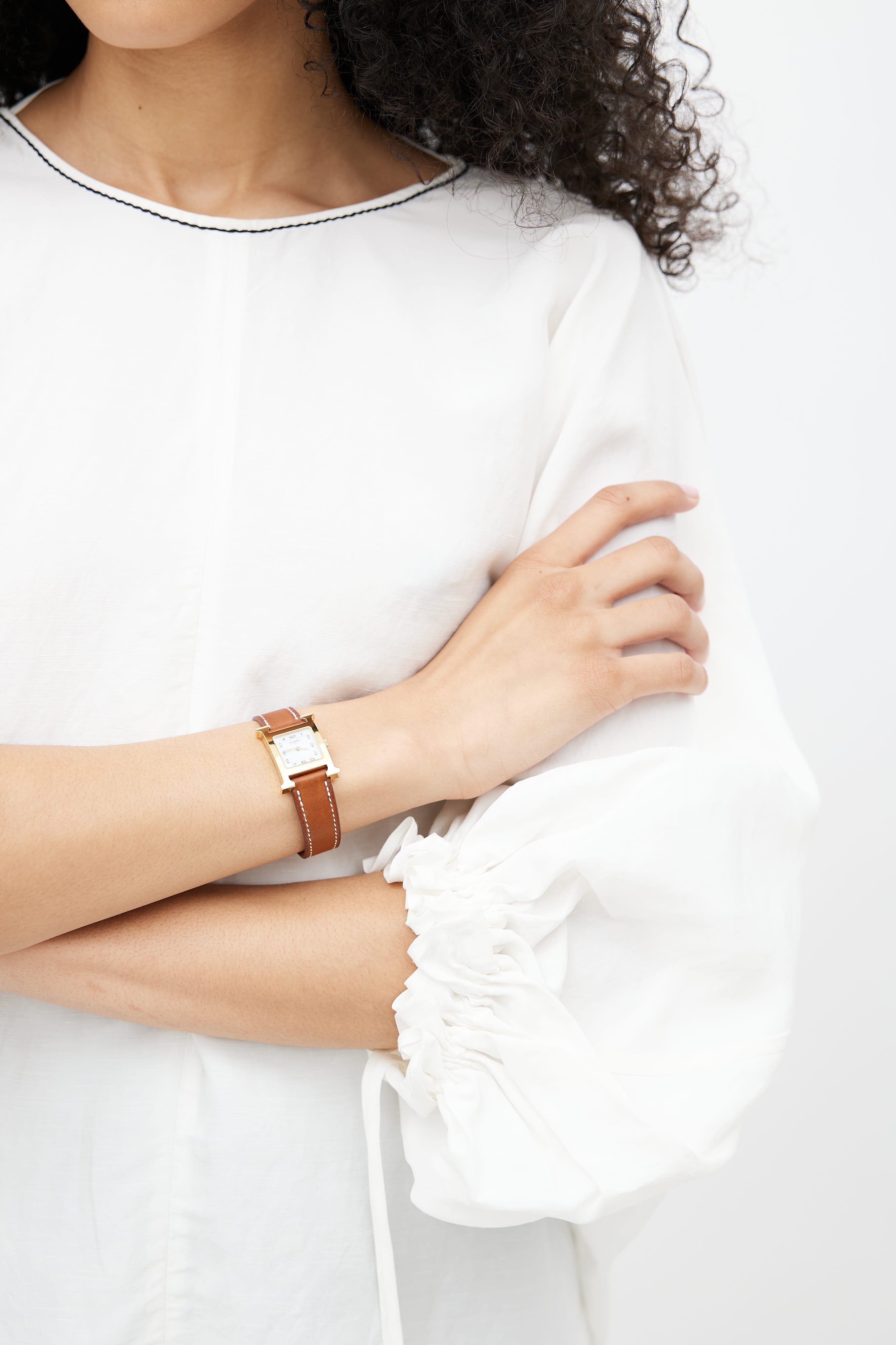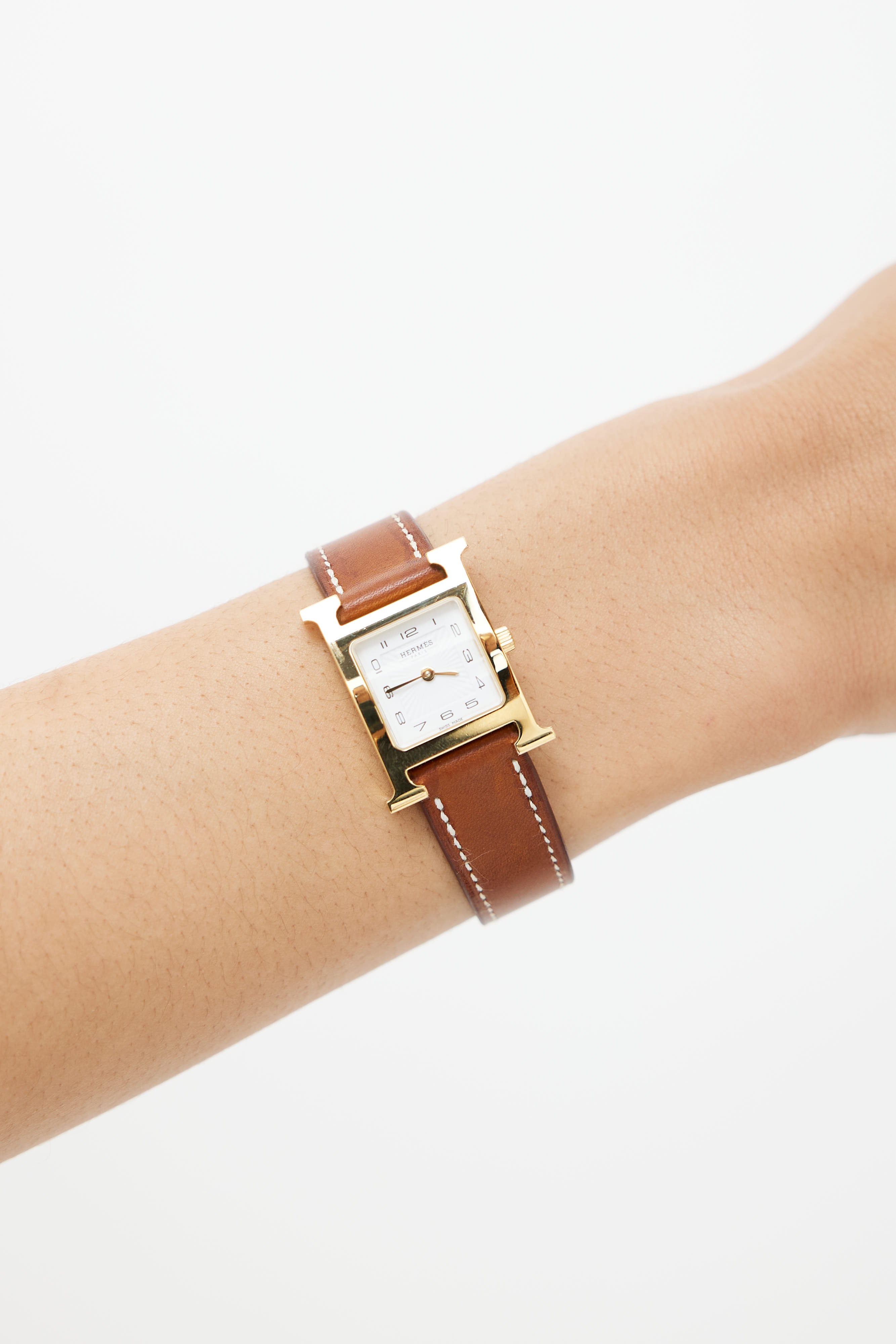 Pre-owned Hermès Heure H Mini 21mm watch featuring yellow gold plated H frame, quartz movement, gold tone clock arms, white contrast stitching, brown Barenia calfskin leather strap, yellow gold plated steel pin buckle, and water resistance to 3 bar. Original box included.