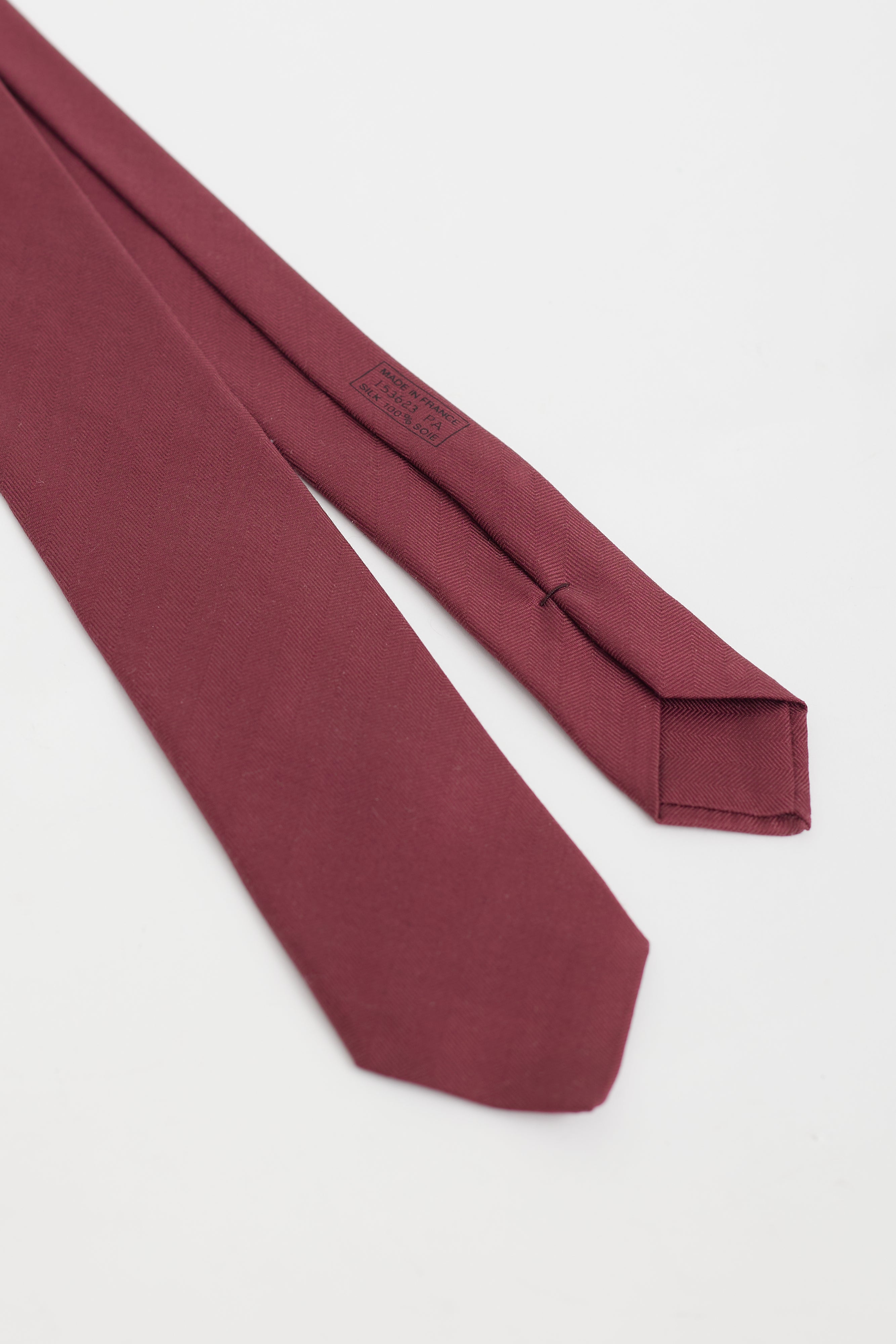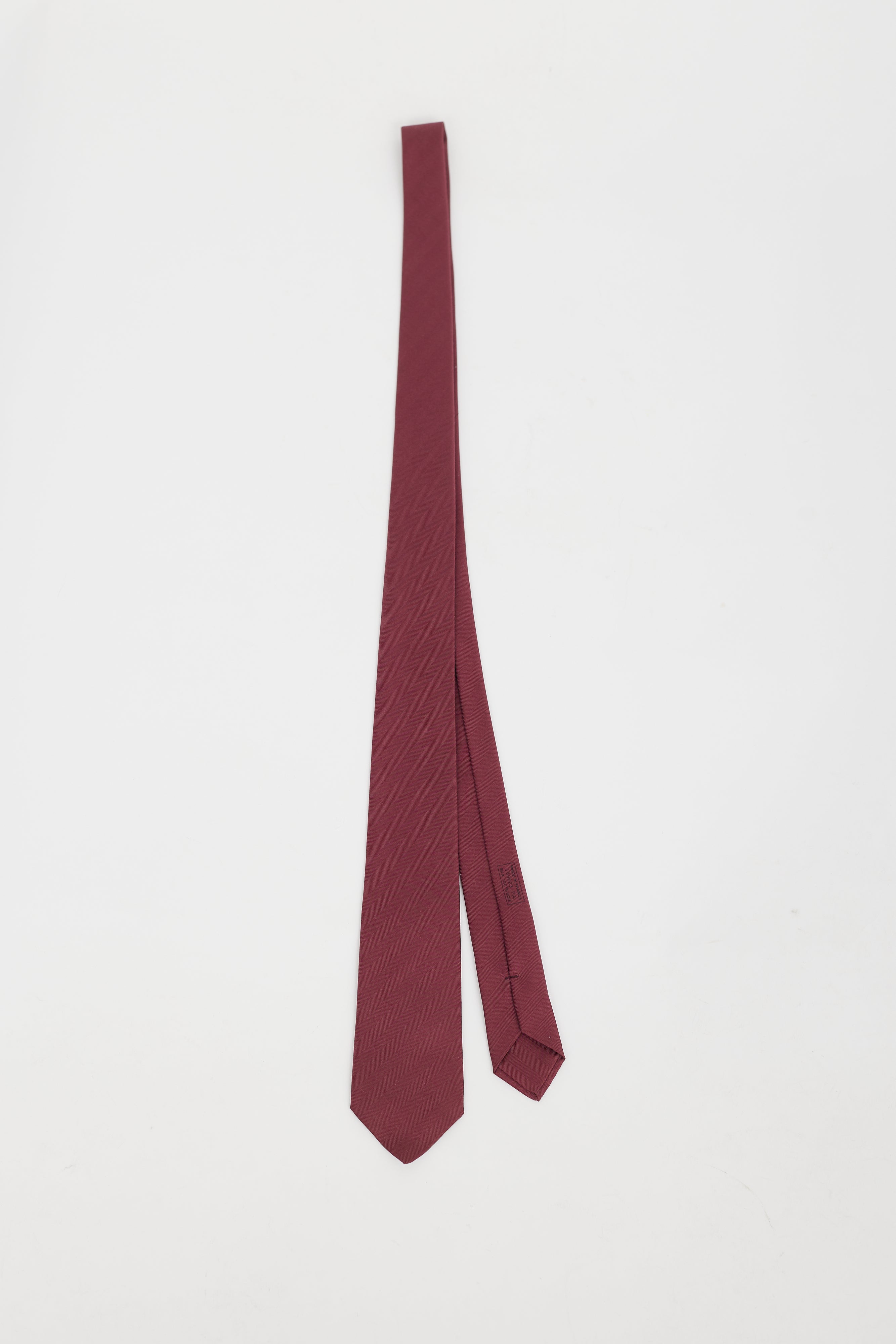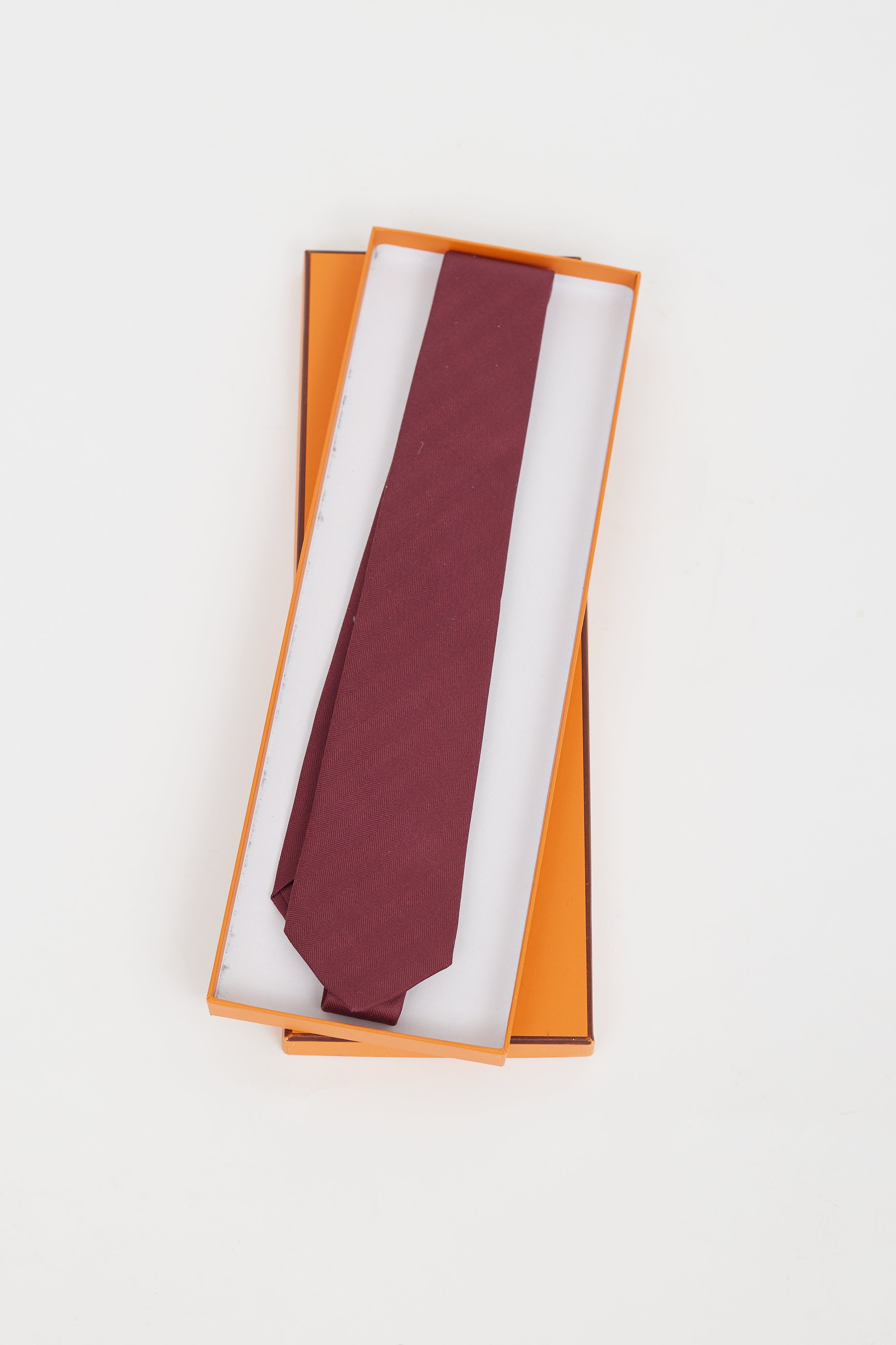 Pre-owned Hermès burgundy silk tie featuring black printed logo label at front. Comes with original box.