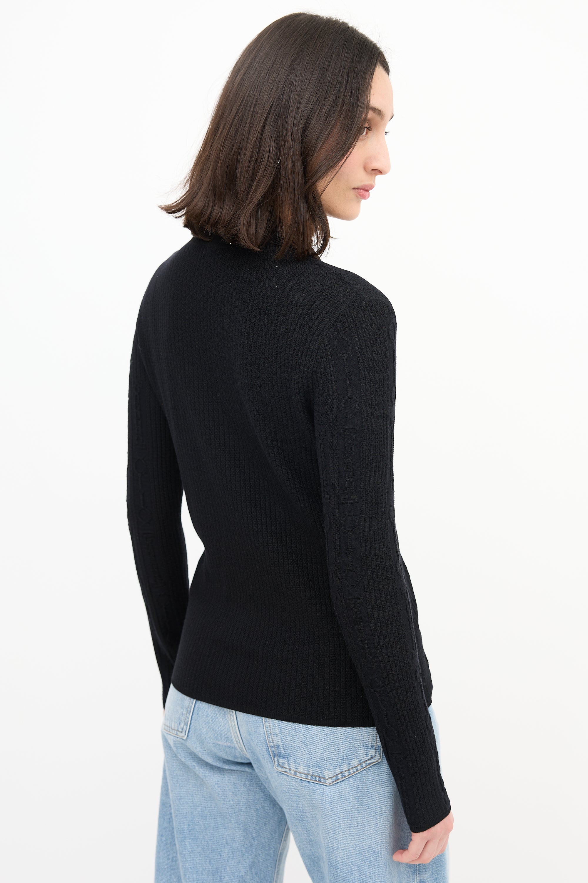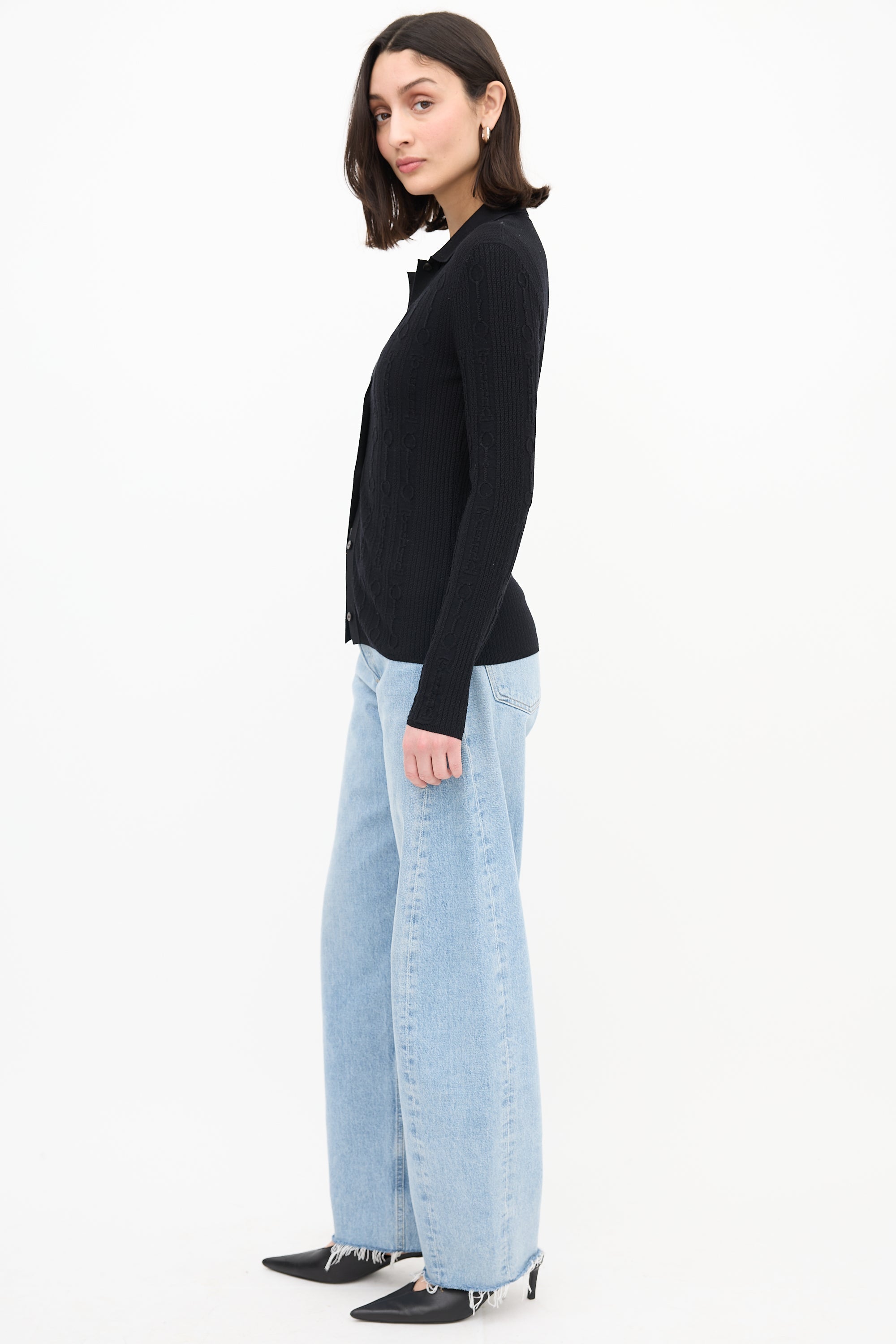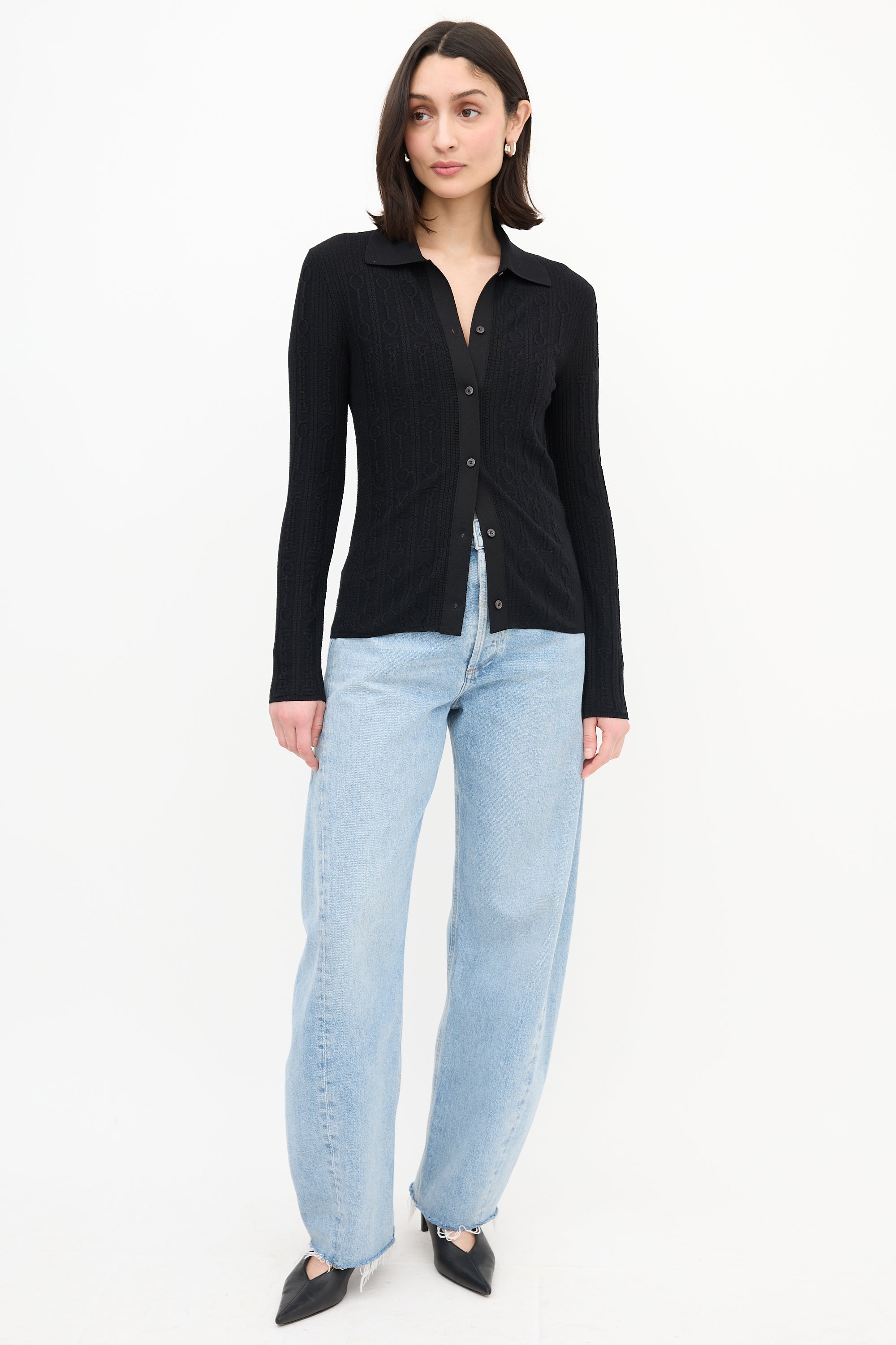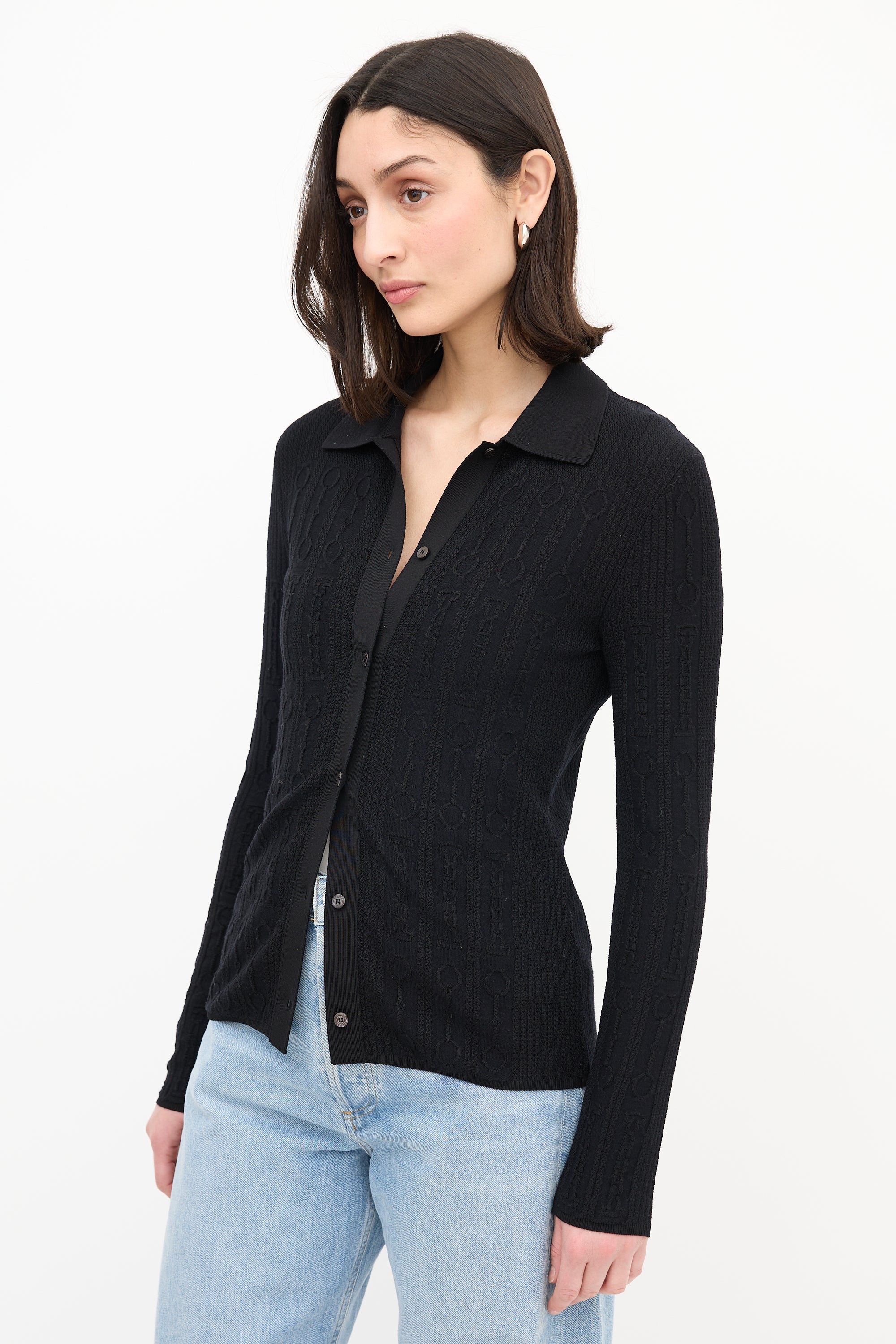 Pre-owned Hermès black shirt cardigan featuring "Effet Kaleidoscope" motif cable stitch, spread collar, and buttoned front. Comes with original box and extra button.