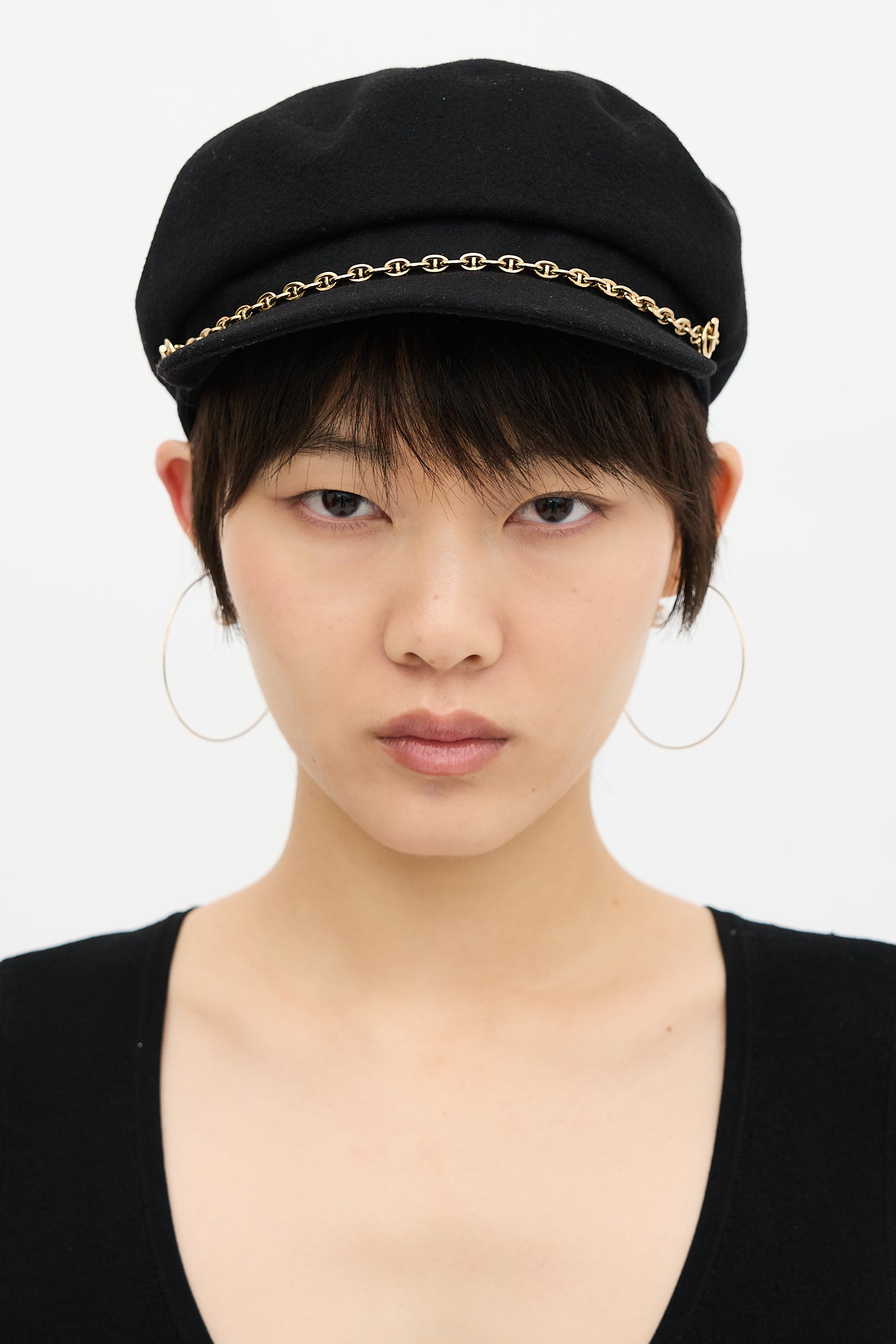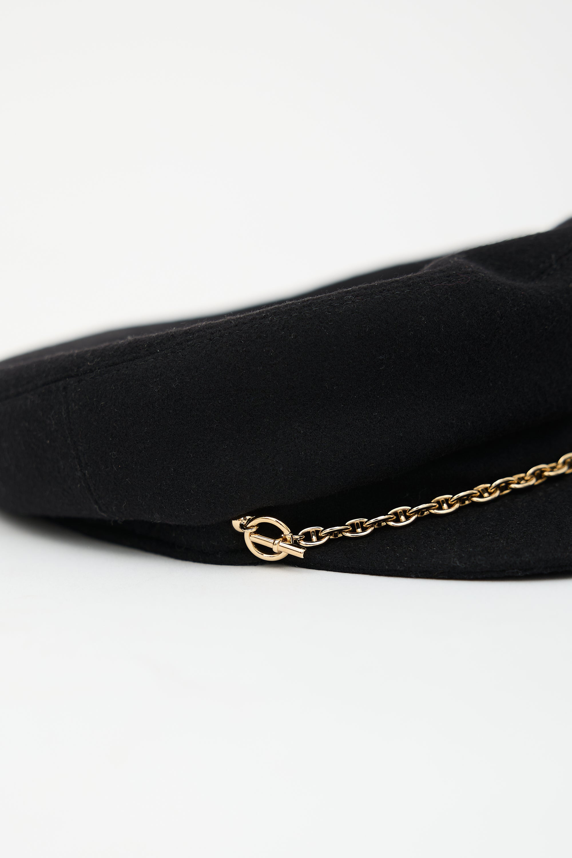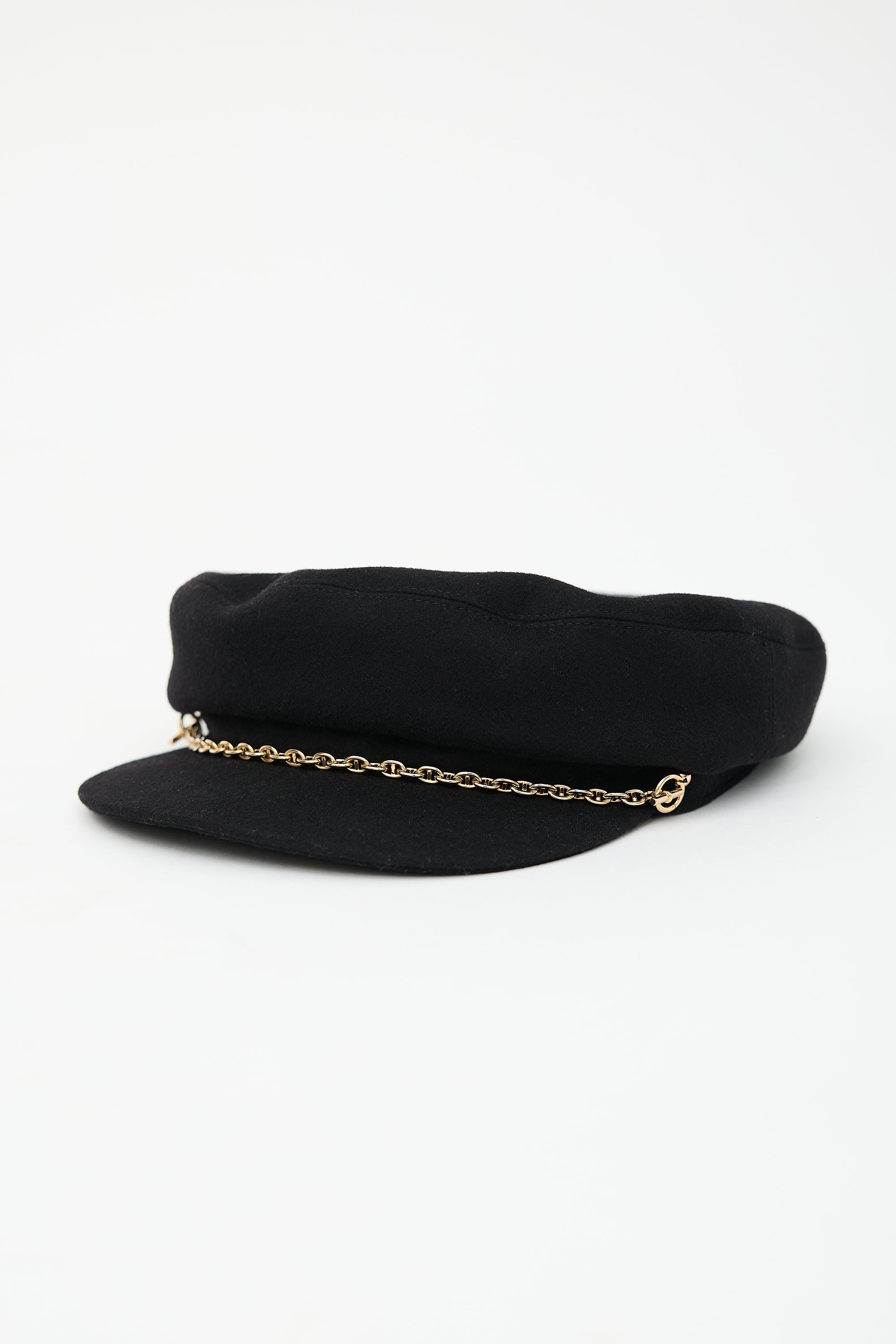 Pre-owned Hermès black cashmere Deauville newsboy cap featuring removable gold tone Chaîne d'ancre link at front brim, stripe lining with Brides de Gala patch, and grosgrain brim lining.