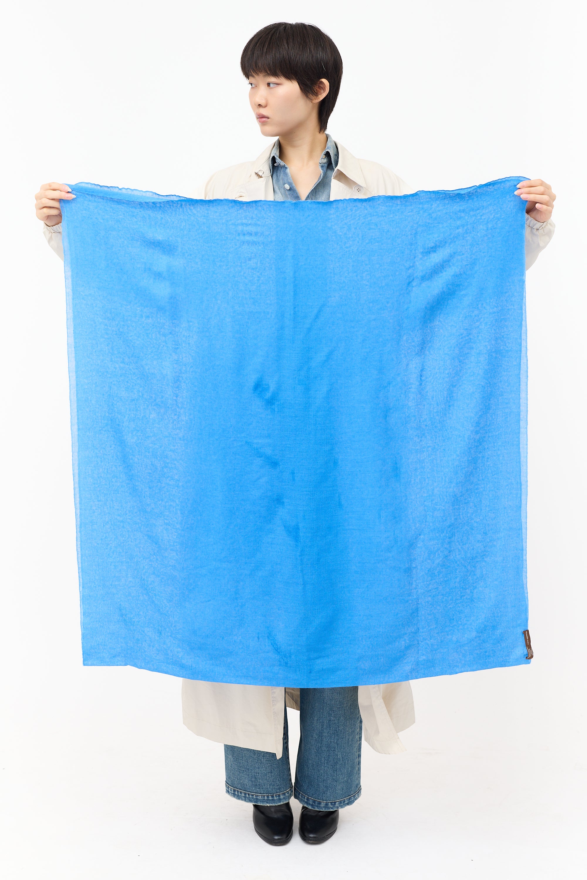 Pre-owned Hermès blue cashmere and silk scarf featuring tonal stamped logo at bottom right corner and hand rolled edges.