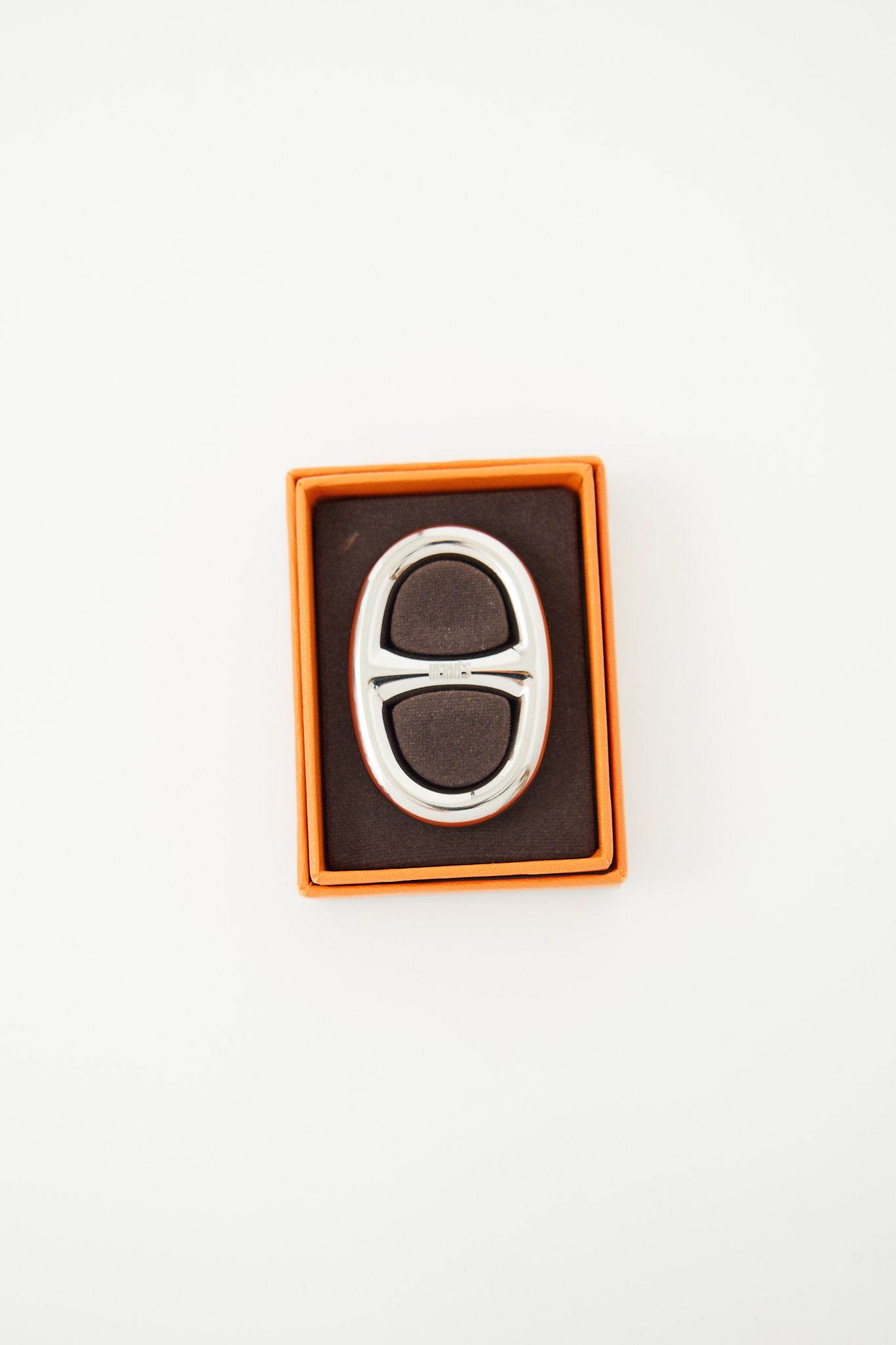Pre-owned Hermès Chaine D'ancre suitable for 90cm scarf featuring silver and palladium plated hardware, cylinder shape, dual loops and "Hermès" logo text stamped.