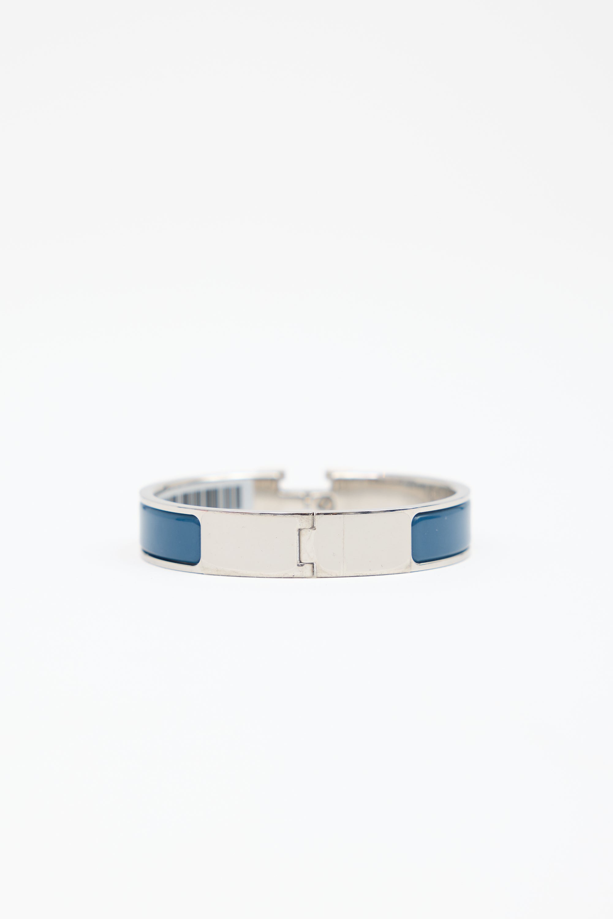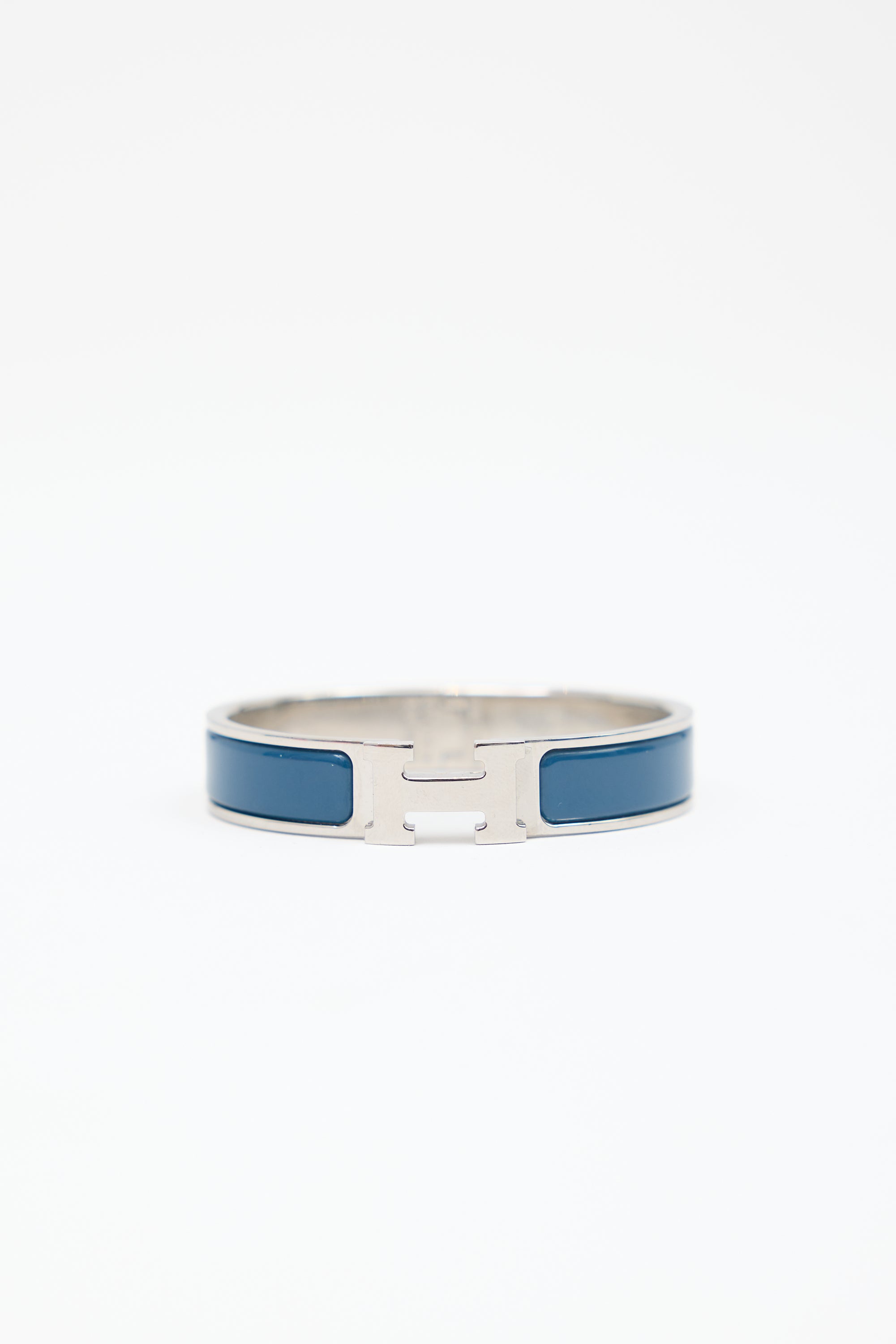 Pre-owned Hermès Clic H bracelet featuring Bleu de Genes enamel and palladium plated band, hinge, and H twist clasp. "HERMES" stamped at interior. Comes with original box.