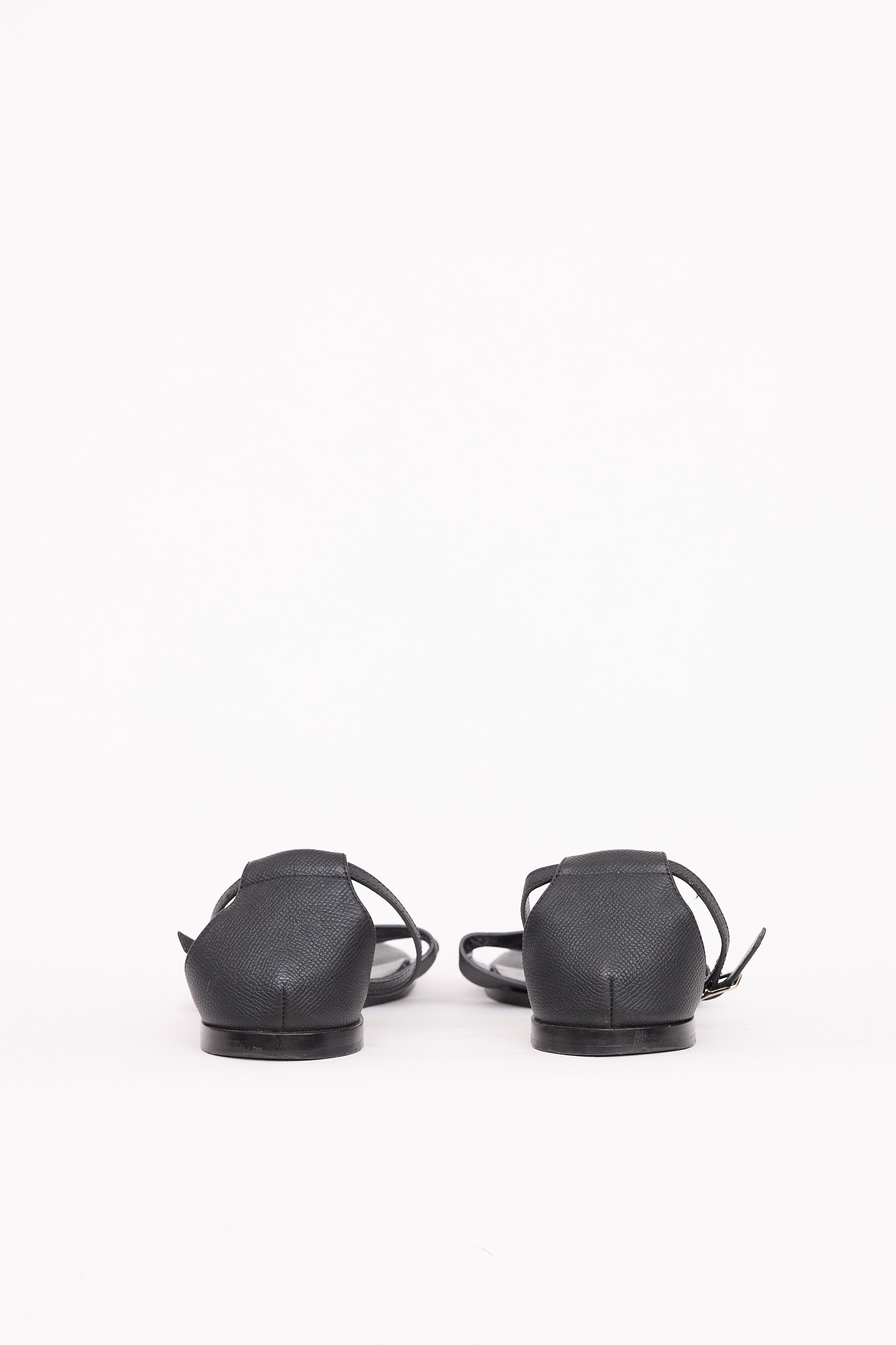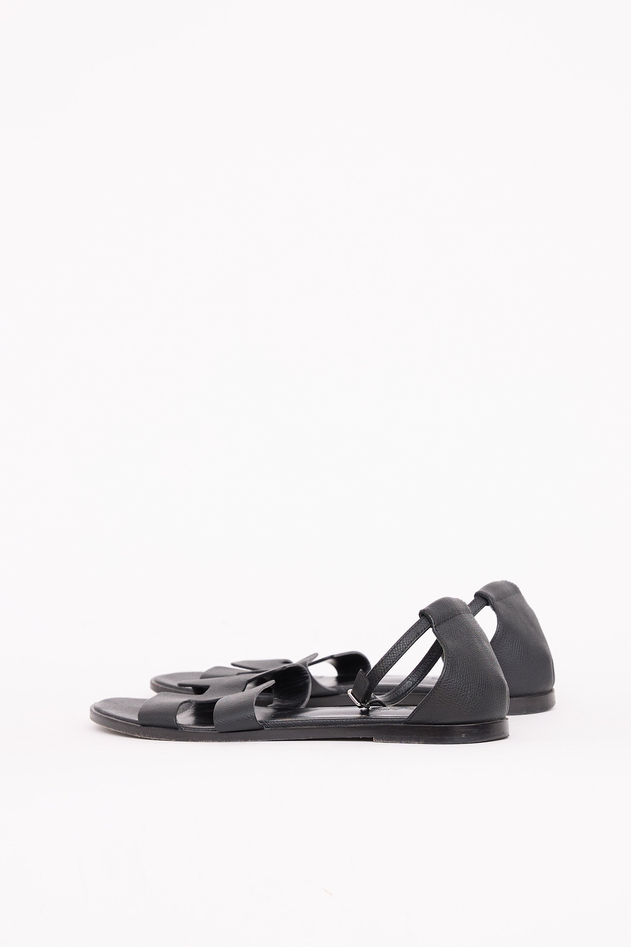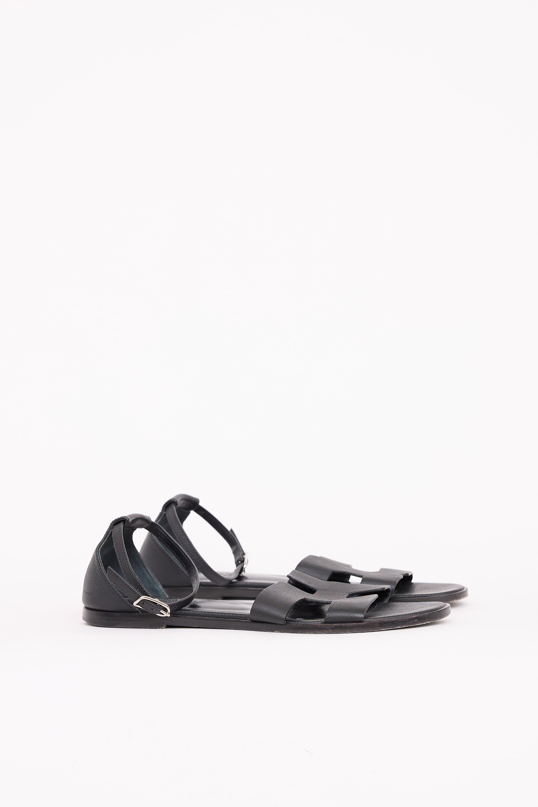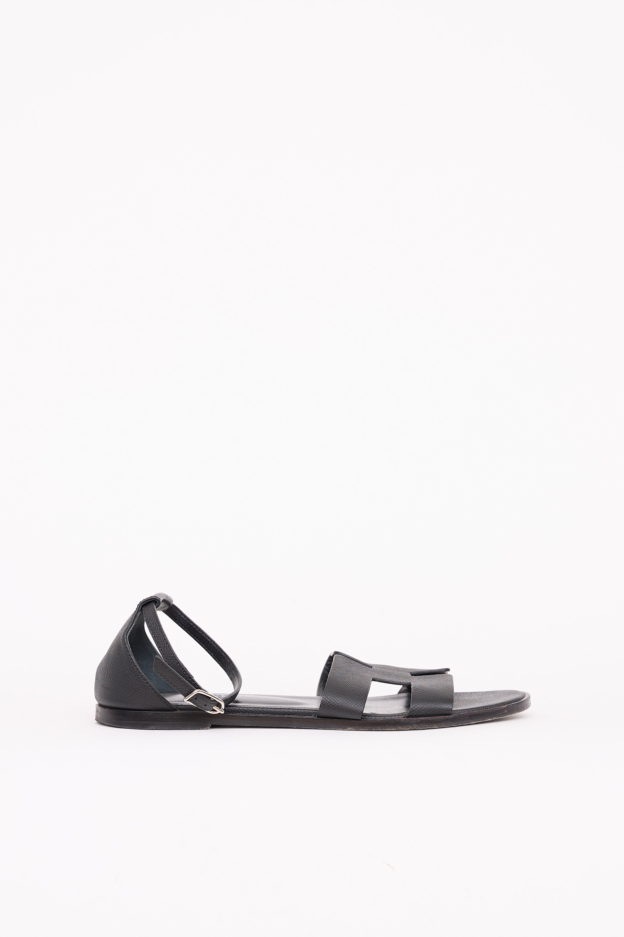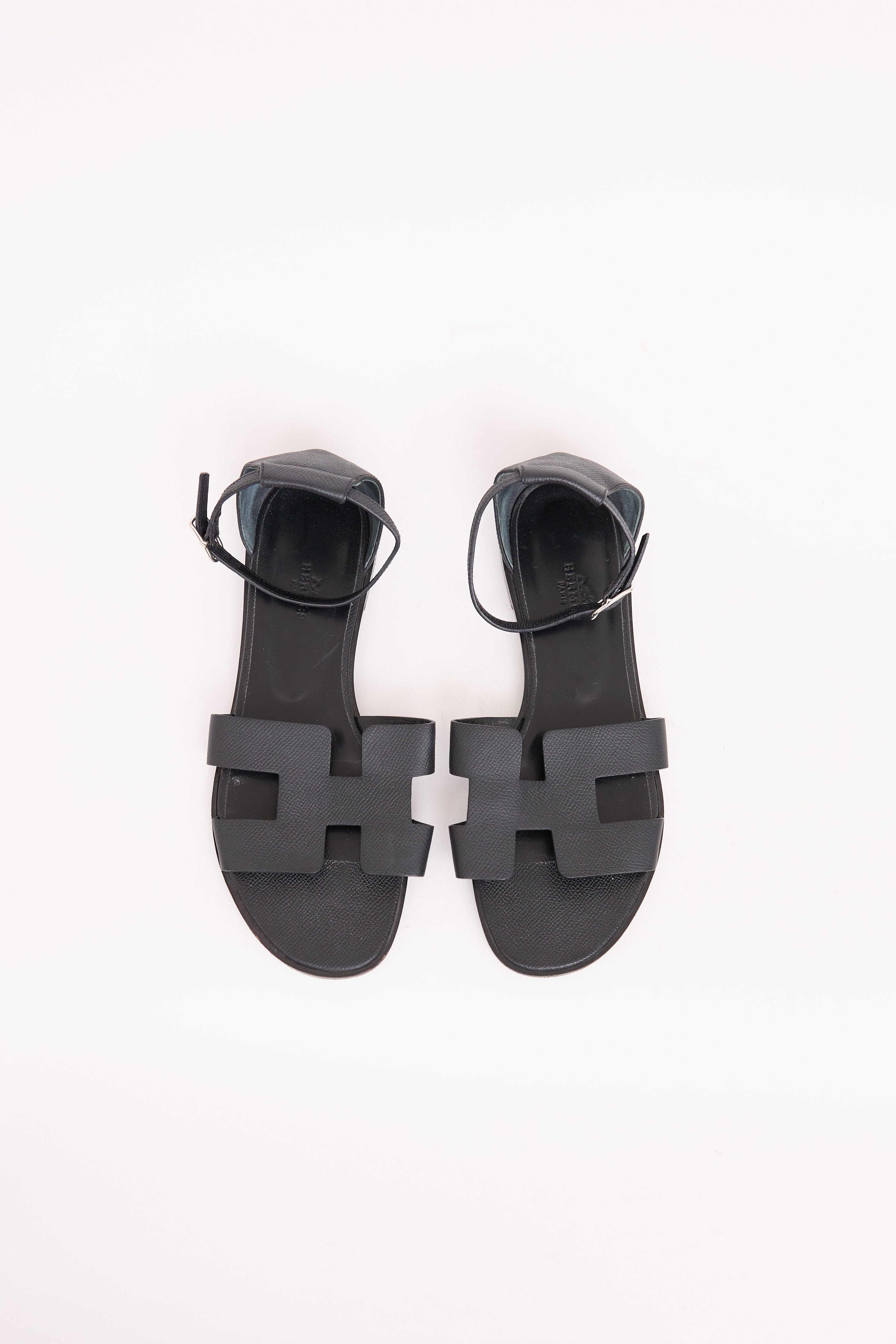 Pre-owned Hermès black leather Santorino flat sandal featuring black Epsom leather "H" cut-out at toe box, adjustable ankle strap with heel cup, open toe, leather insole and very low stacked heel.