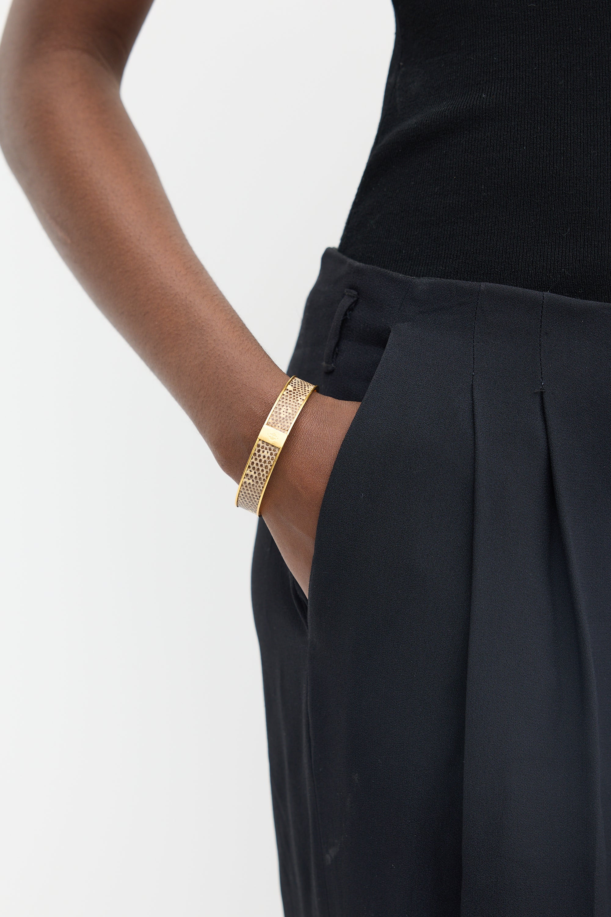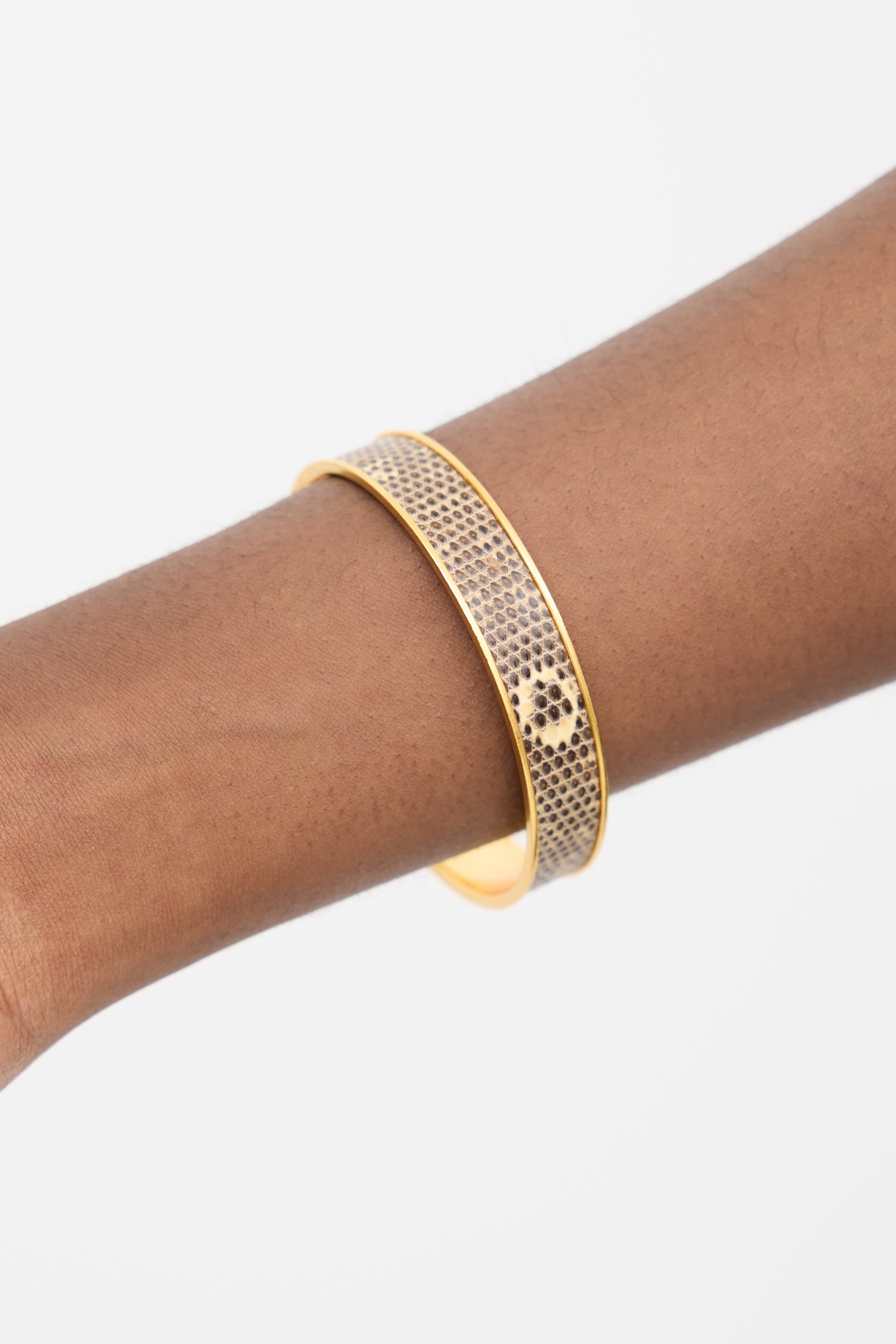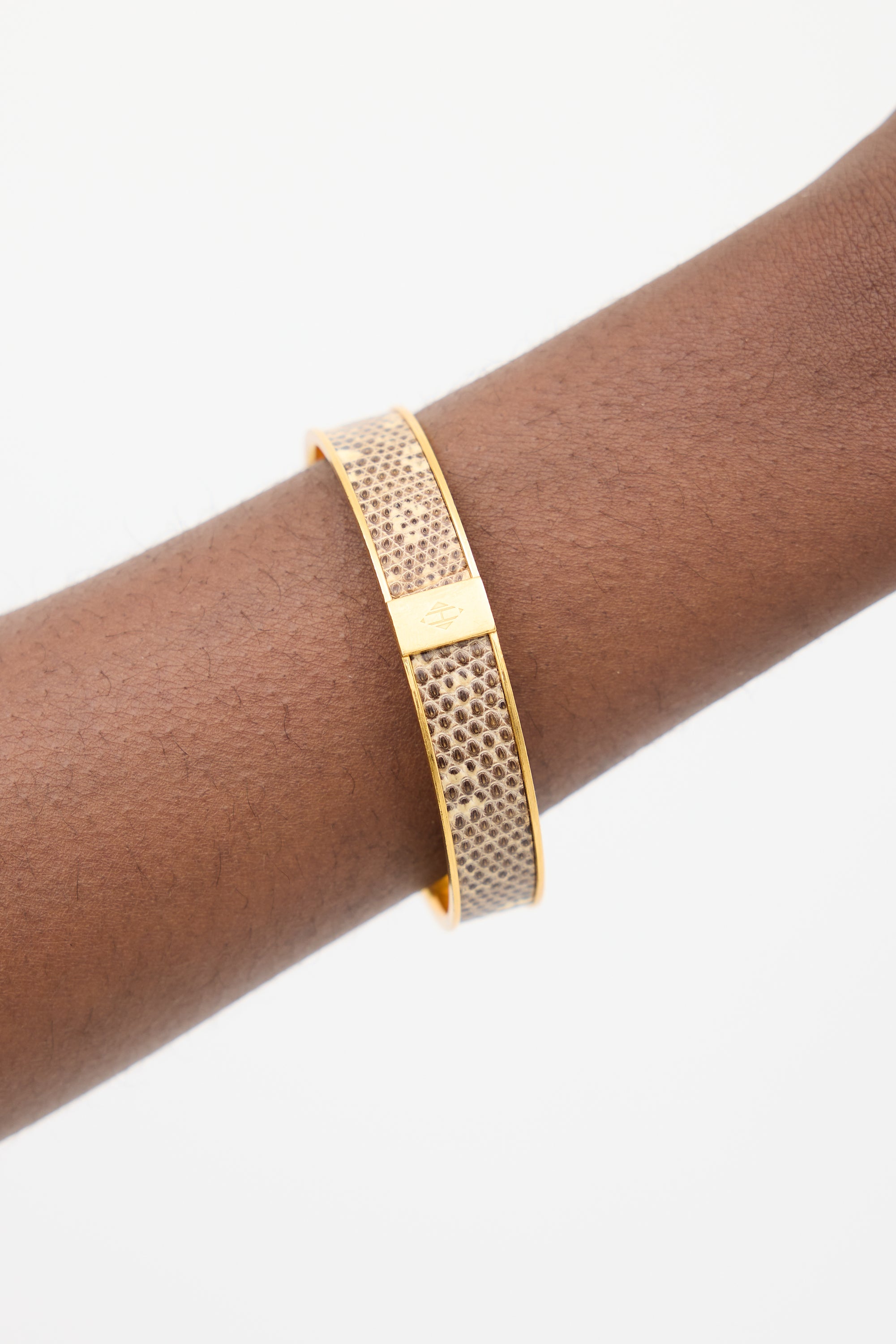 Pre-owned Hermès Kawaii gold plated bangle bracelet featuring inlaid brown lizard leather band and stamped H diamond motif.