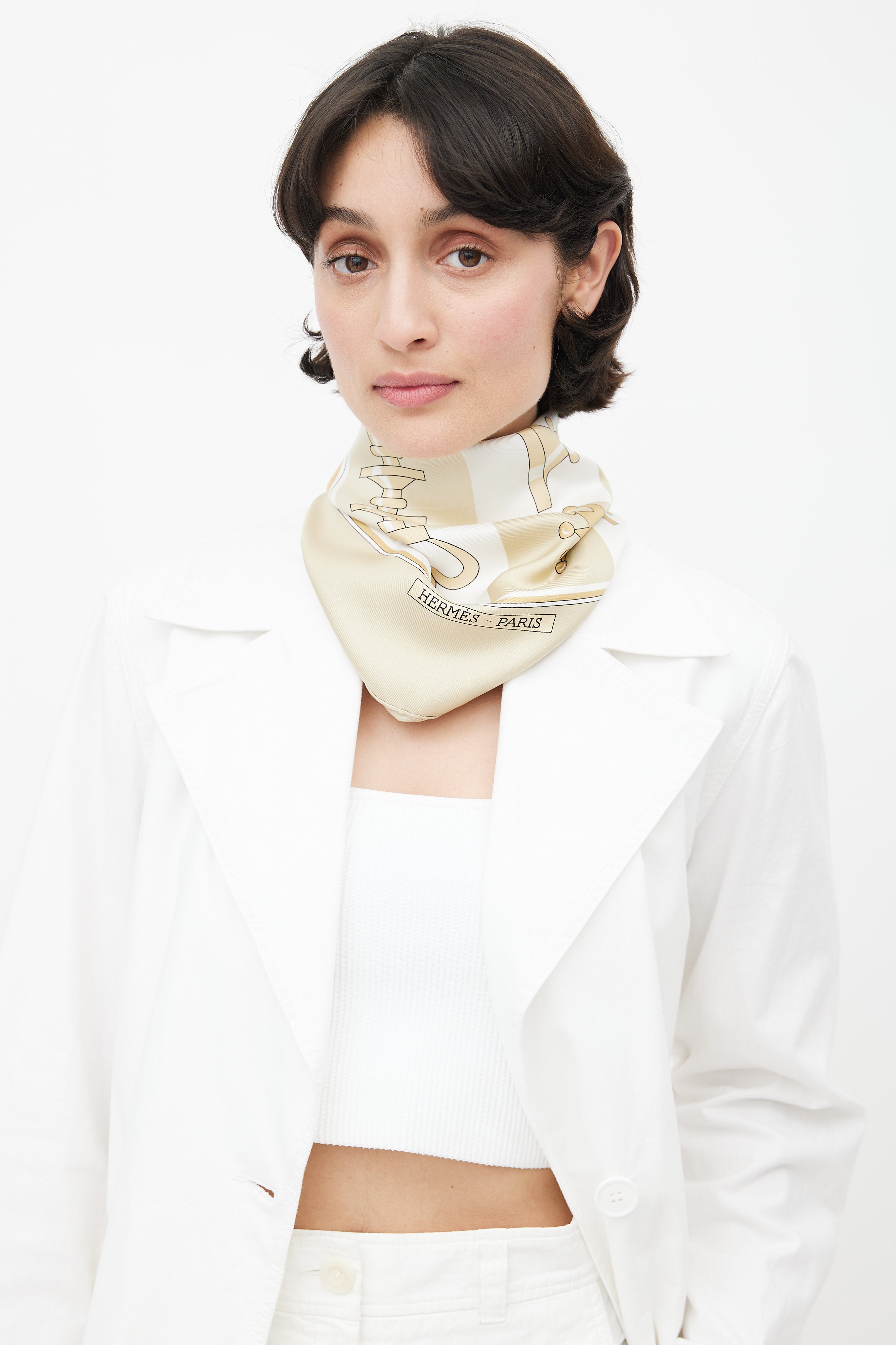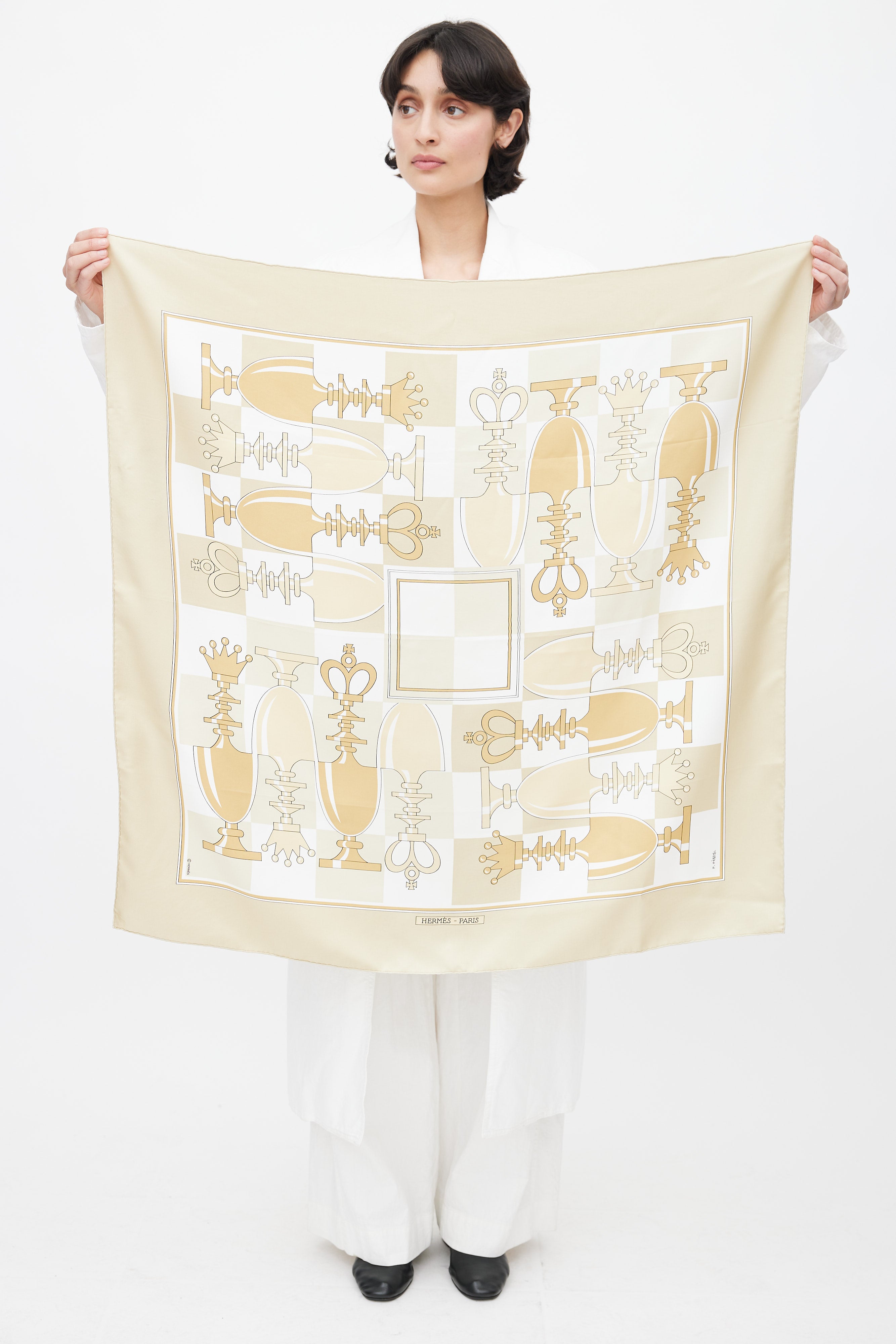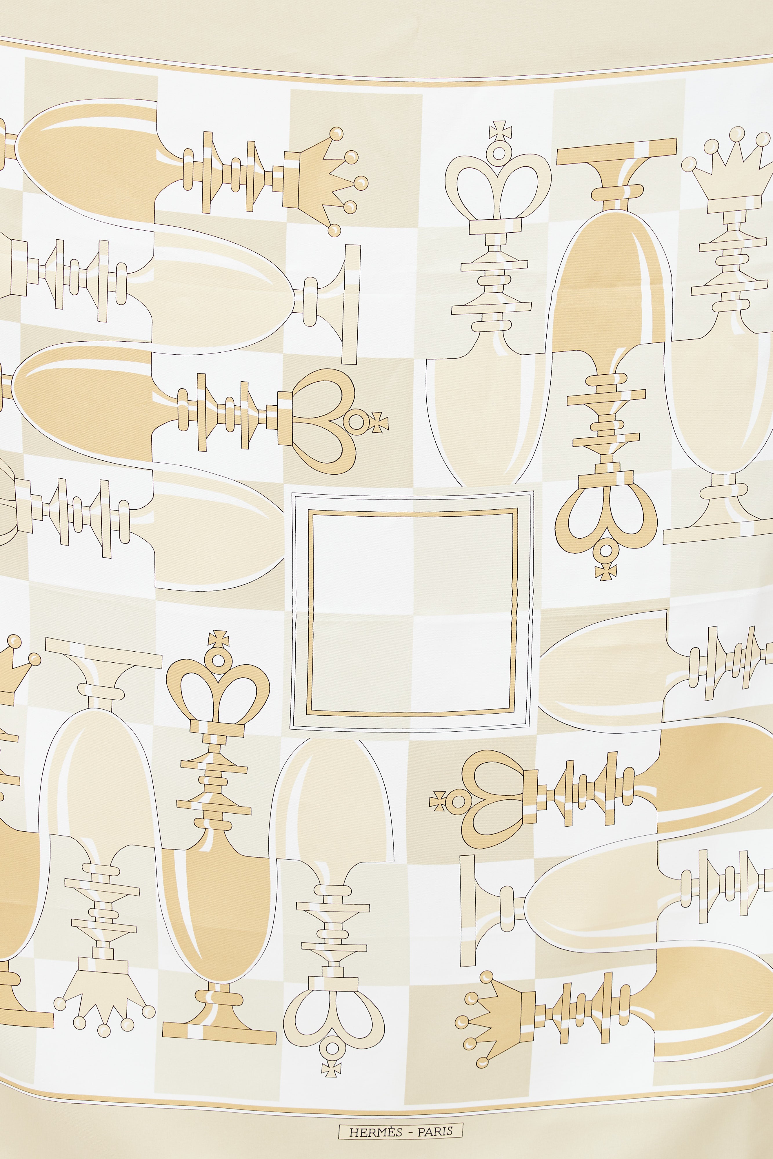 Pre-owned Hermès white and gold scarf featuring Echecs II/ Echiquier print by Pierre Peron, chess motif, and tonal hand-rolled edges.