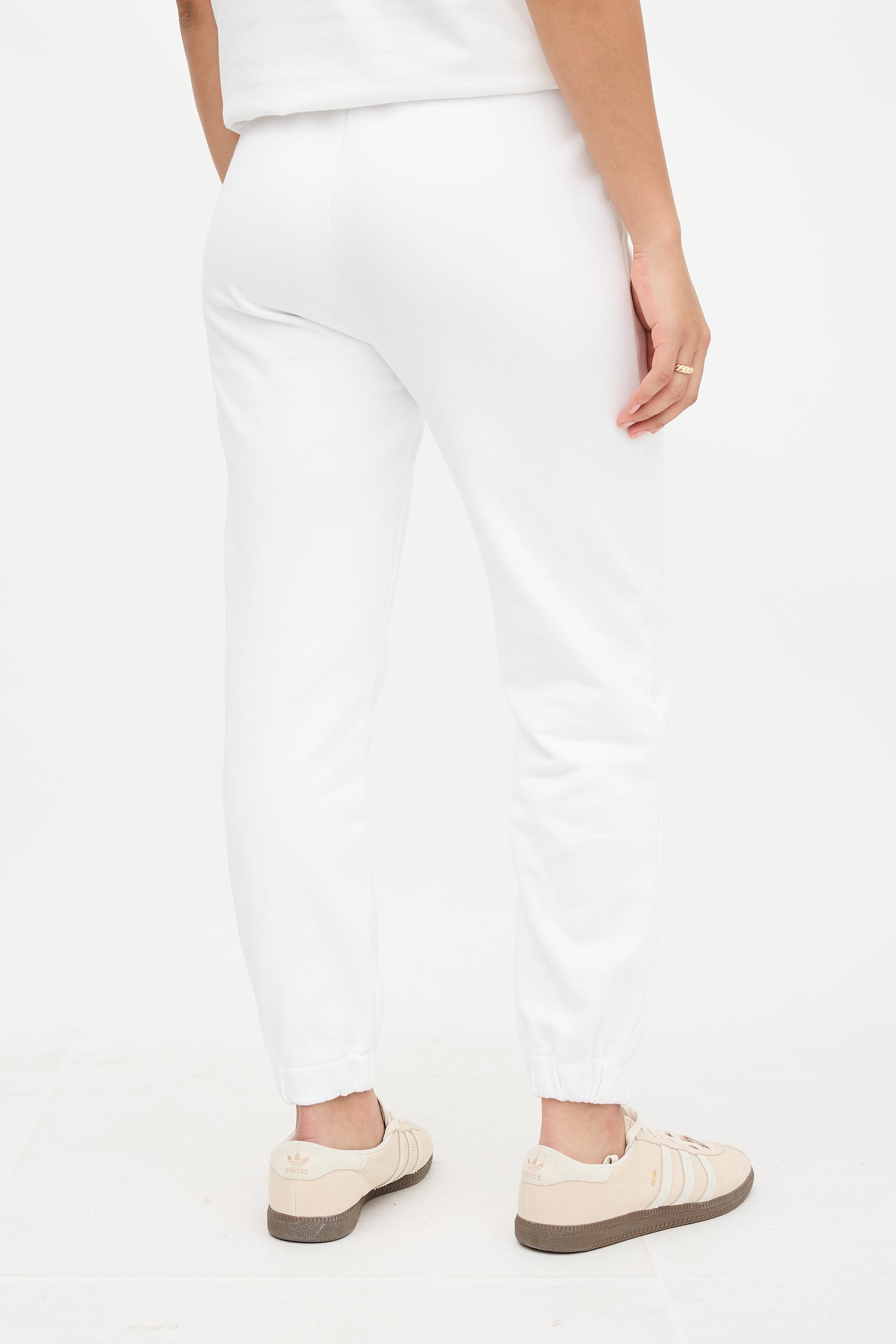 Pre-owned Hermès white sweatpants featuring a mid rise, elasticized drawstring waistband, two pocket styling, front pintucks, and tonal Grand Tralala script at left thigh.