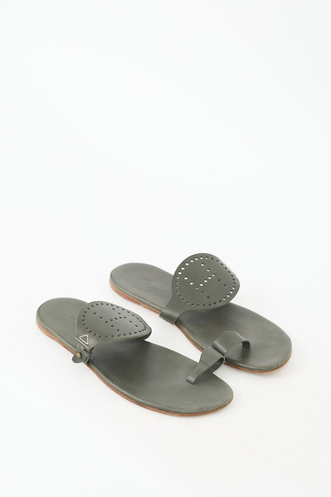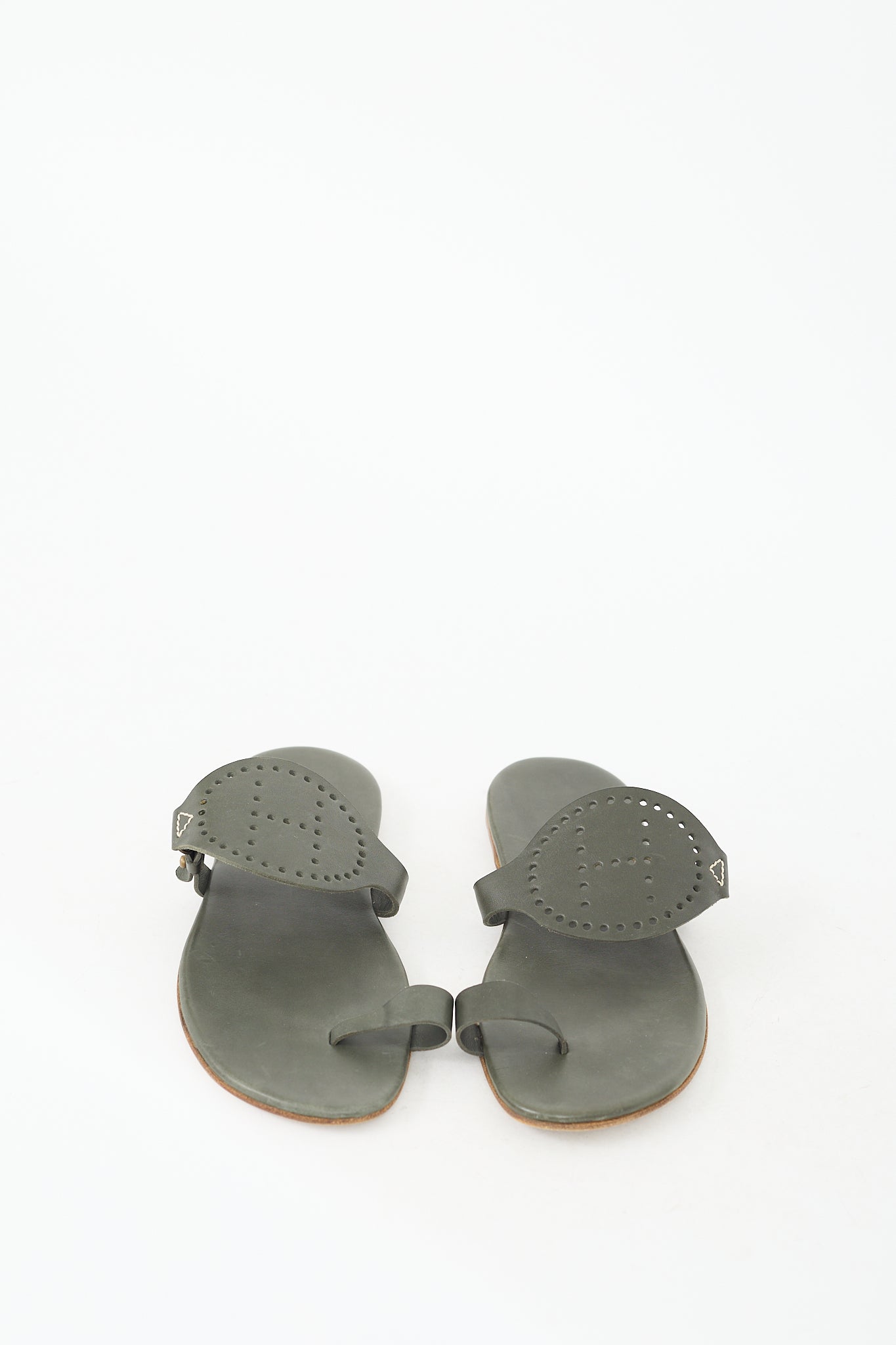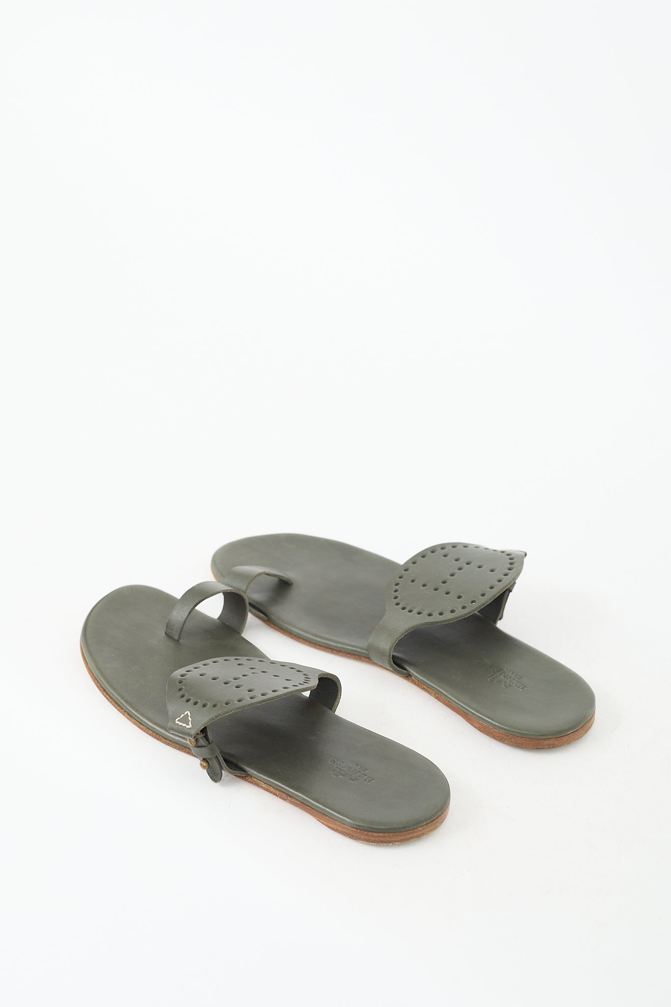 Pre-owned Hermès green Hera sandal featuring an open rounded toe, leather upper, toe ring design, "Gamma" belt inspired strap across instep with perforated H motif, and leather insole and outsole. Comes with original dust bag.