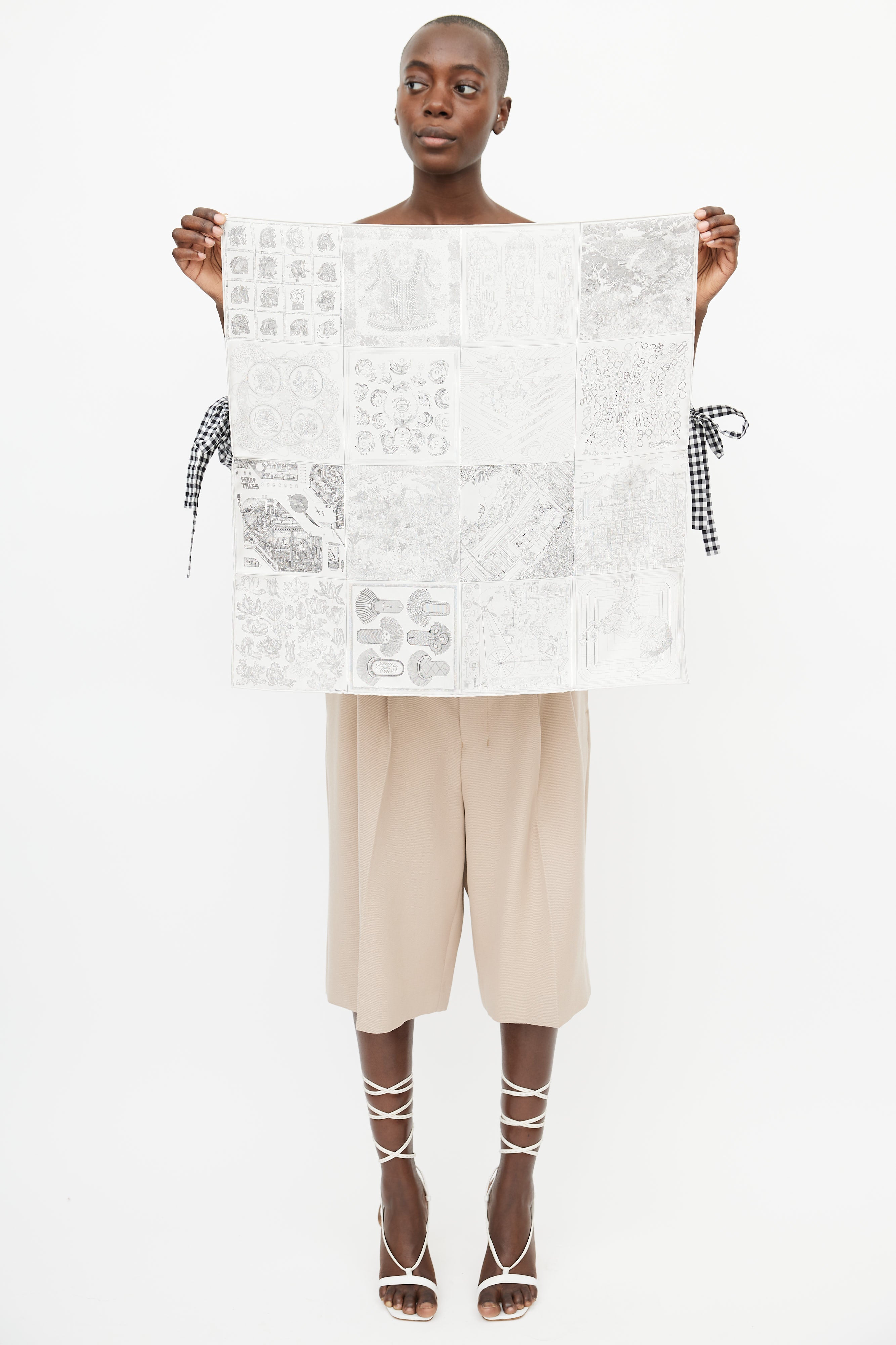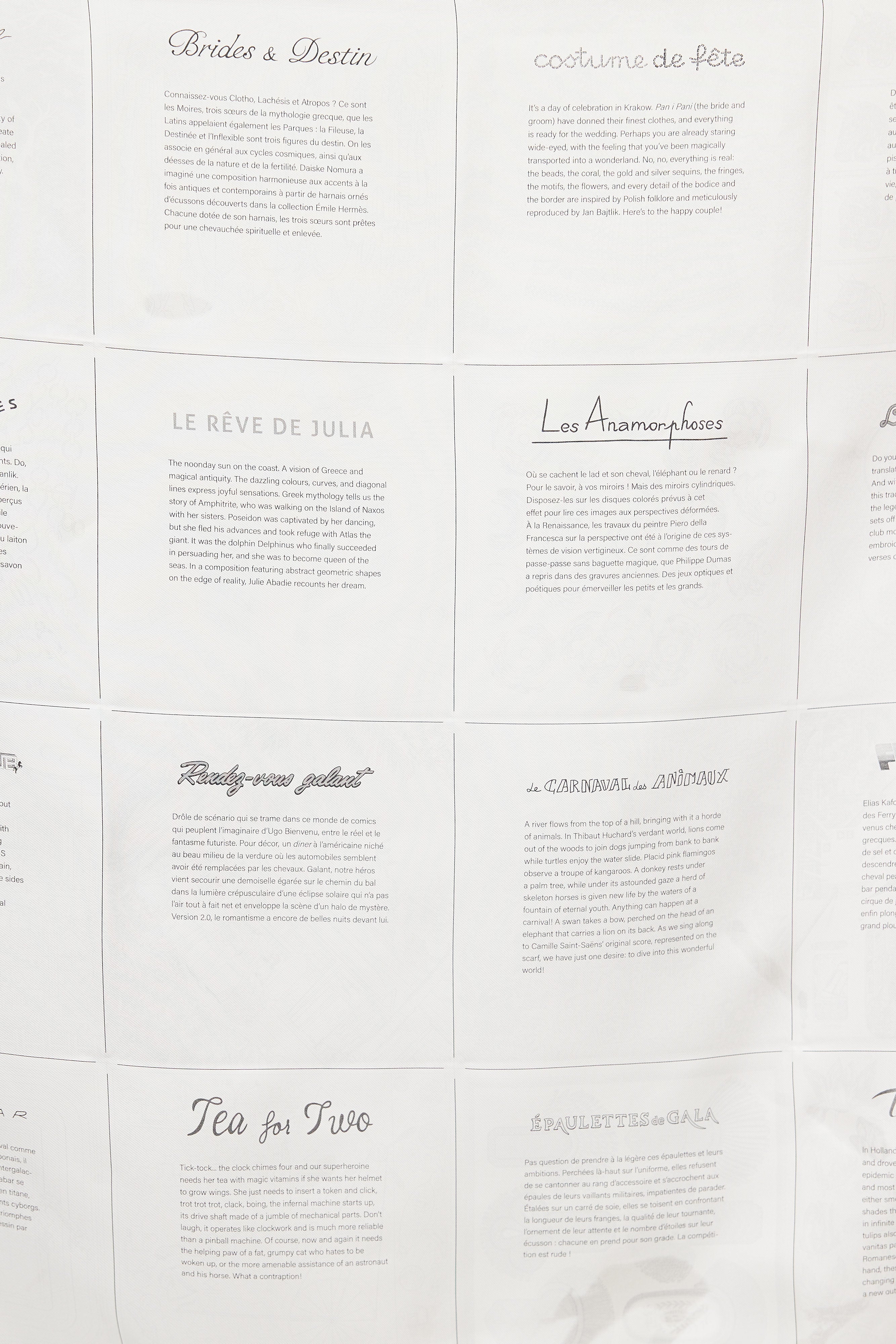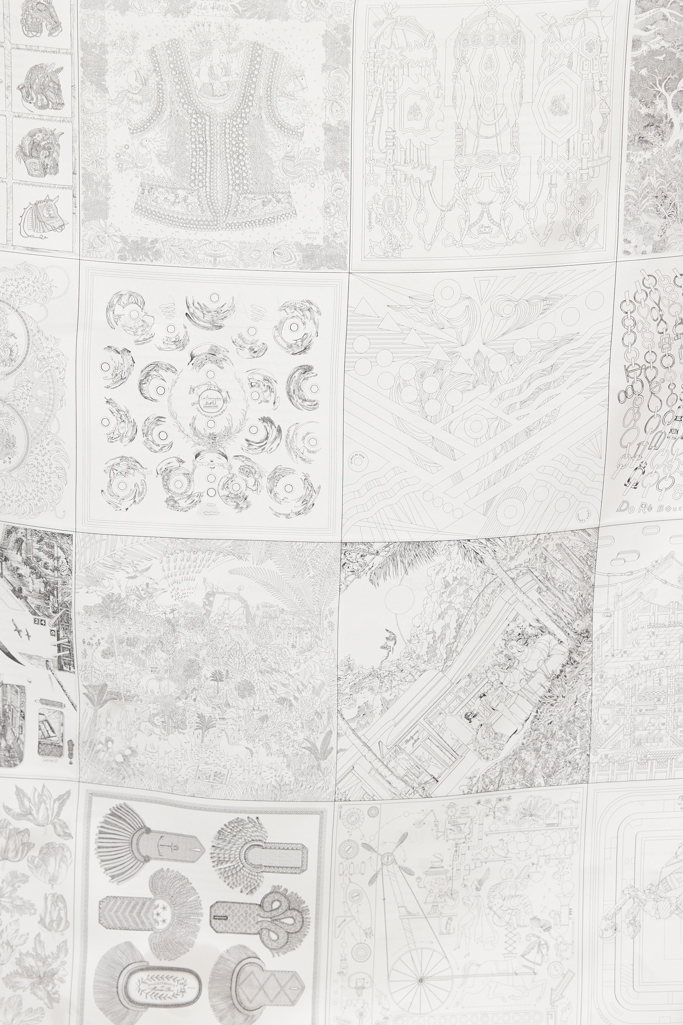 Pre-owned Hermès grey silk scarf featuring multiple square print designs, and tonal hand-rolled edges. Comes with box.