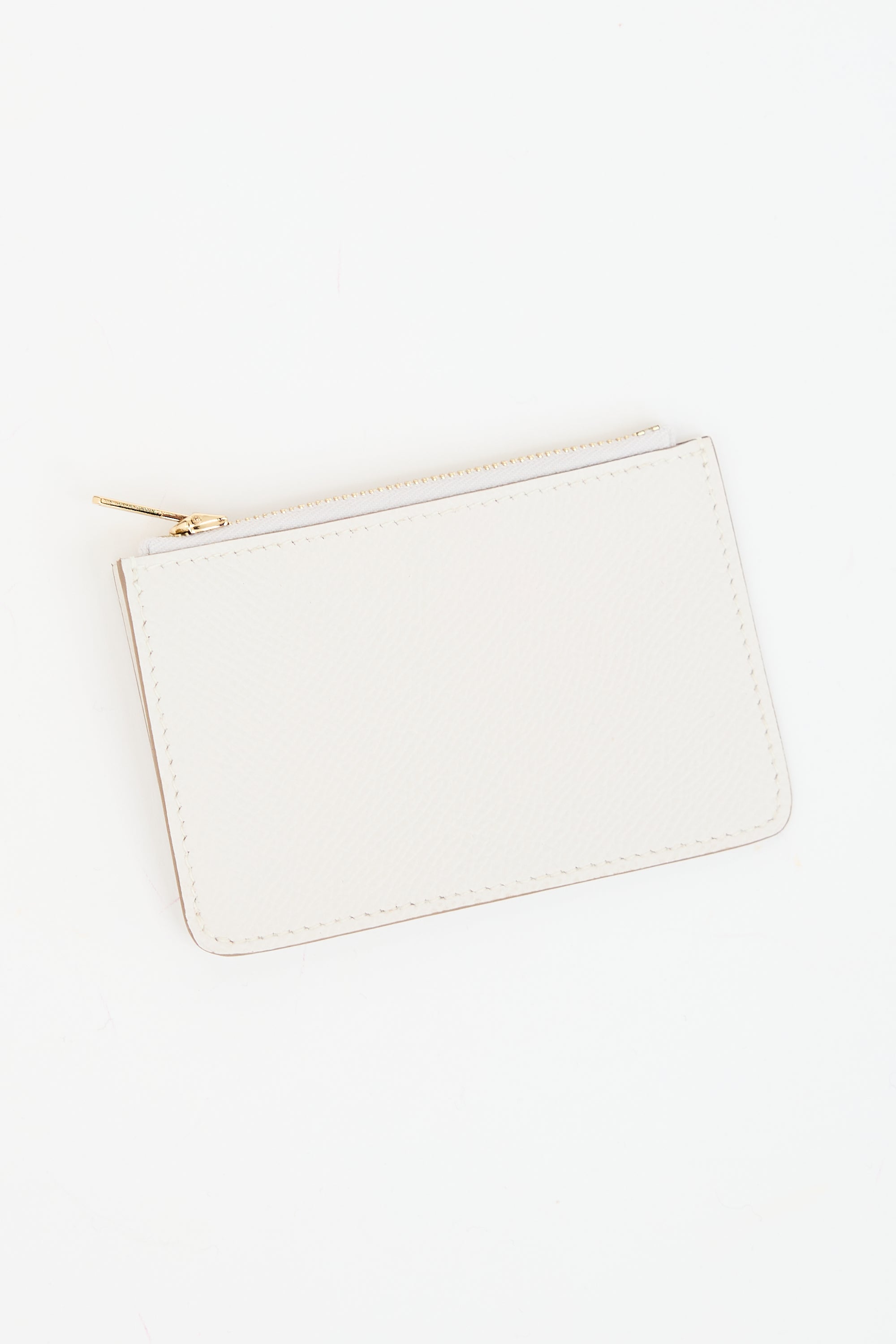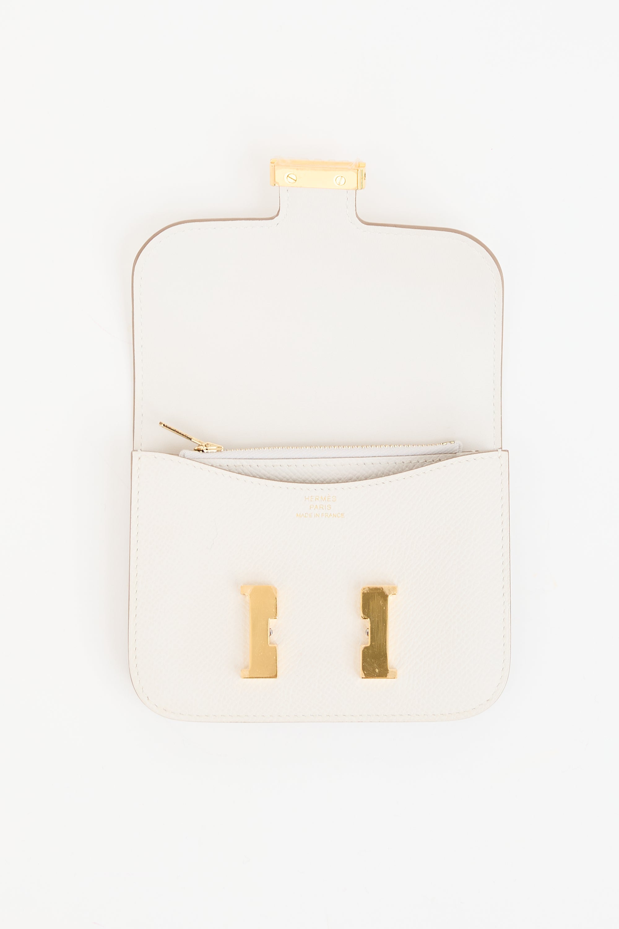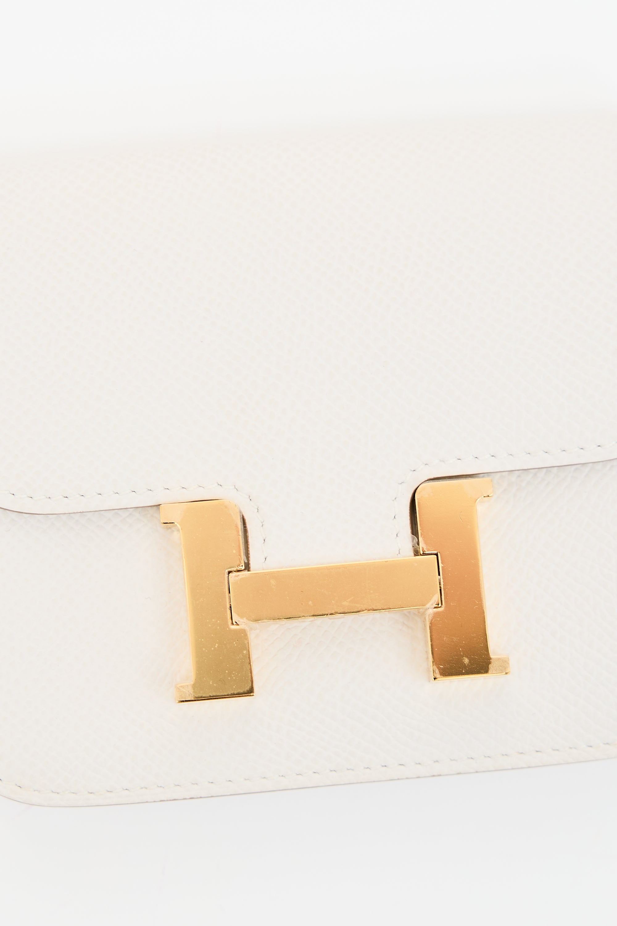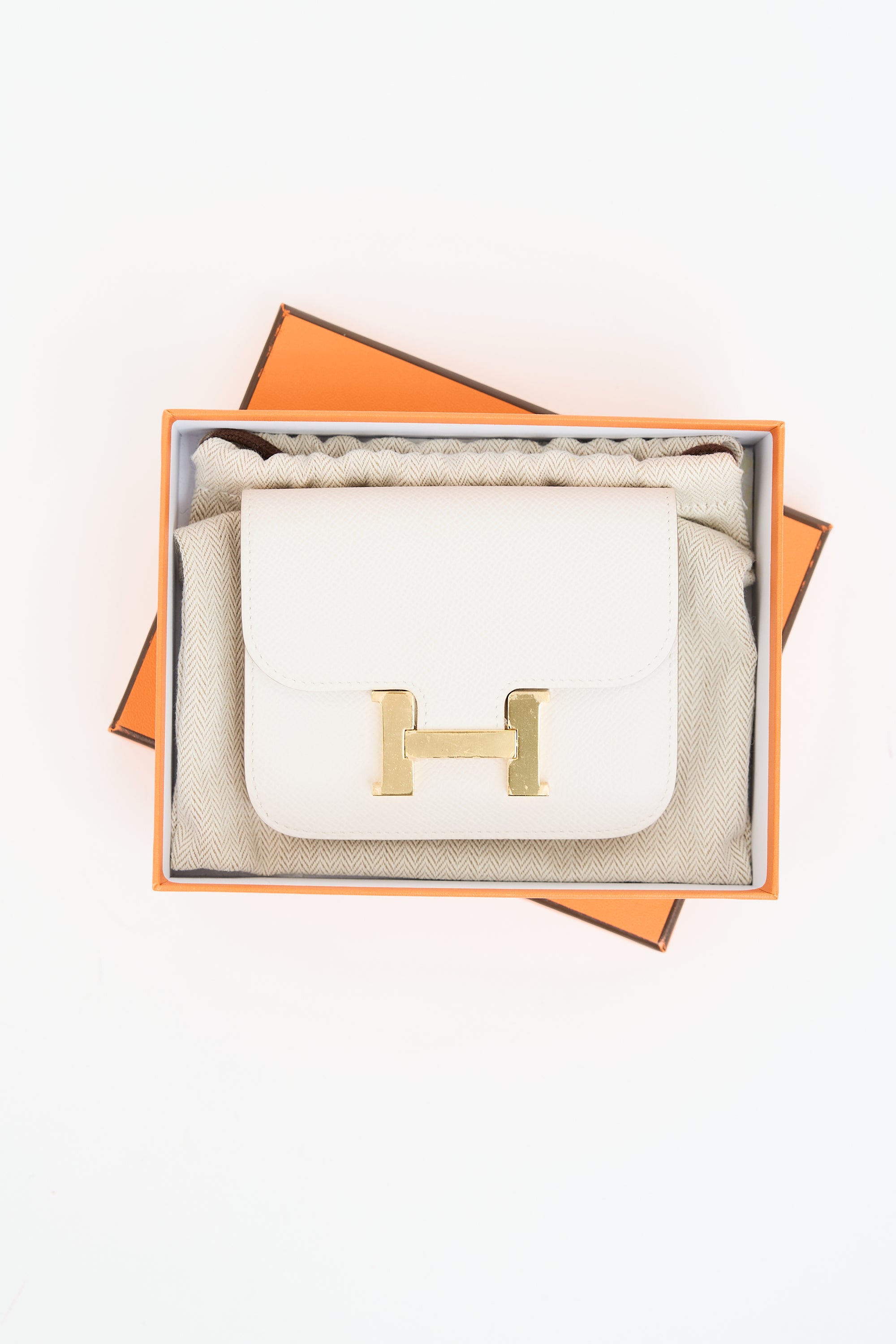 Pre-owned Hermès slim Constance wallet in Gris Pale epsom leather featuring gold tone H buckle at front, back loop for belt attachment, one main compartment, two card slots inside, and detachable zip pouch. Comes with original receipt, dust bag and box.