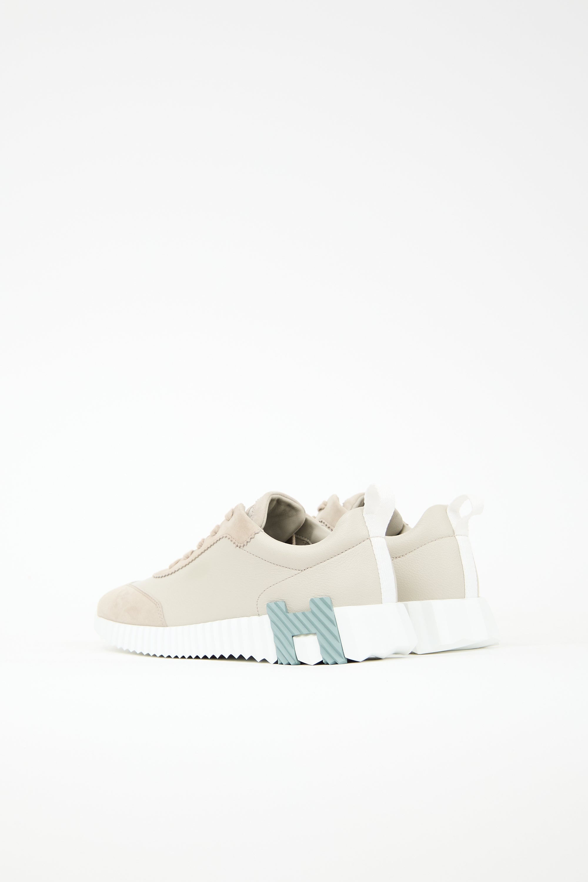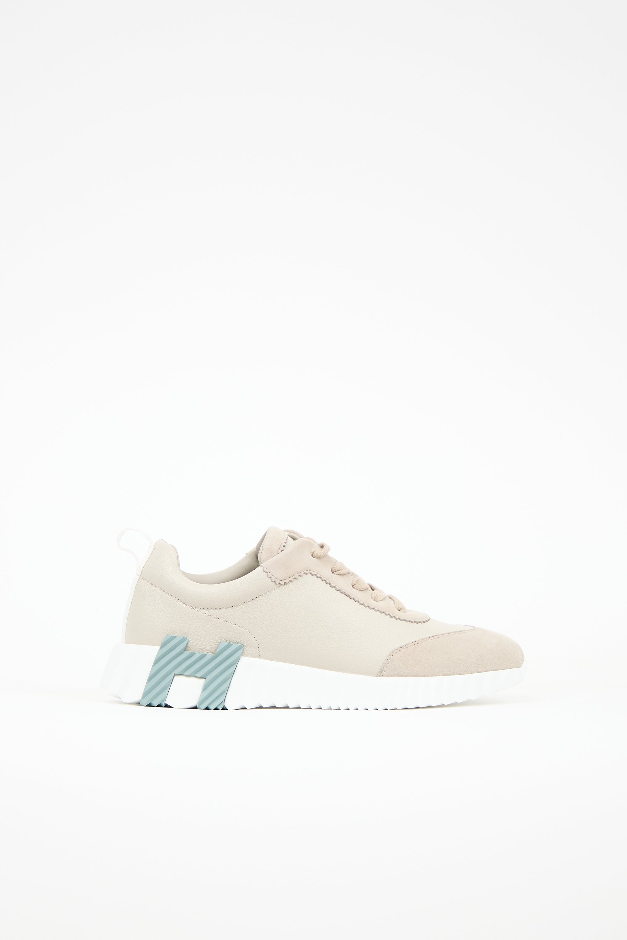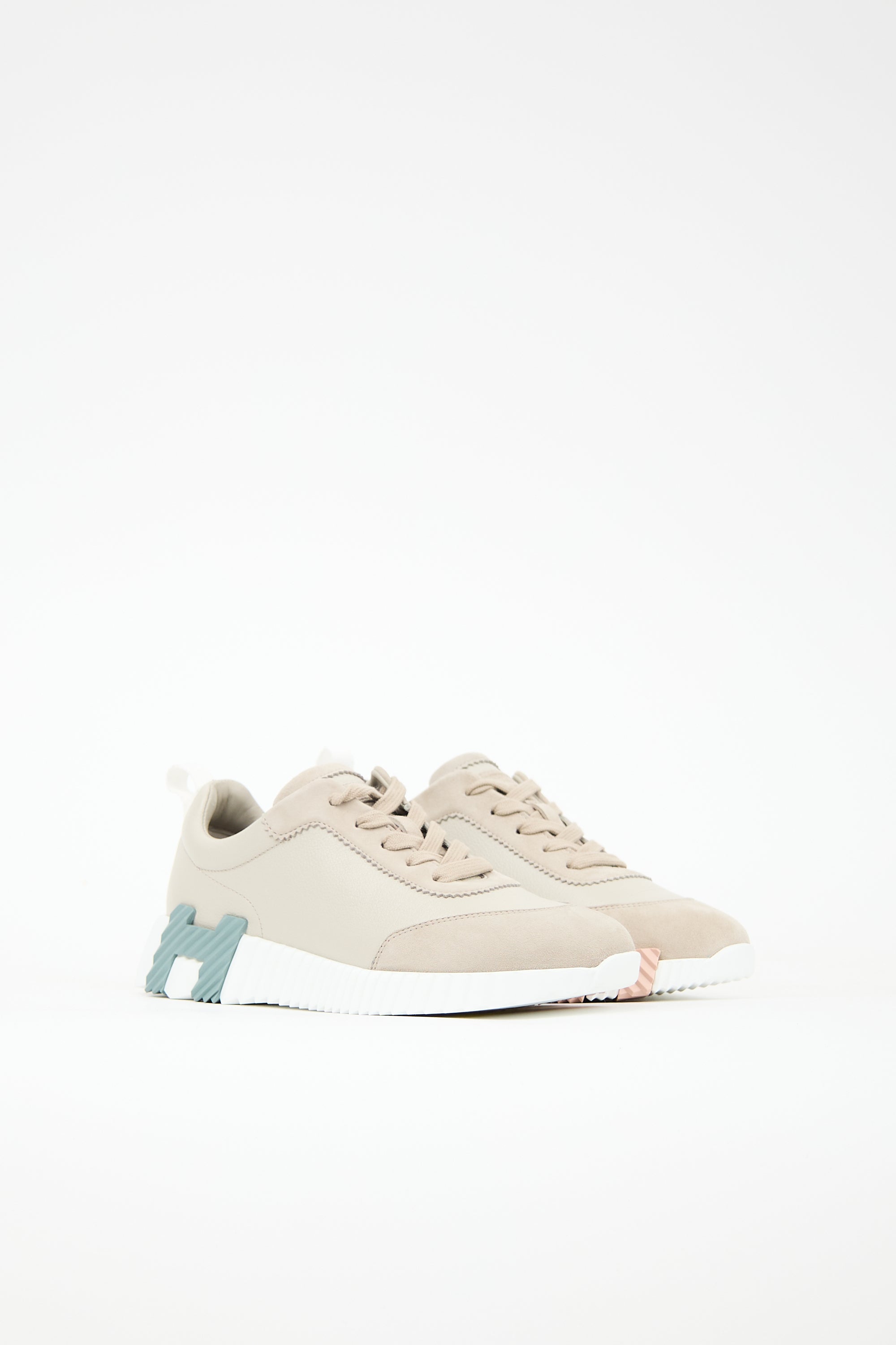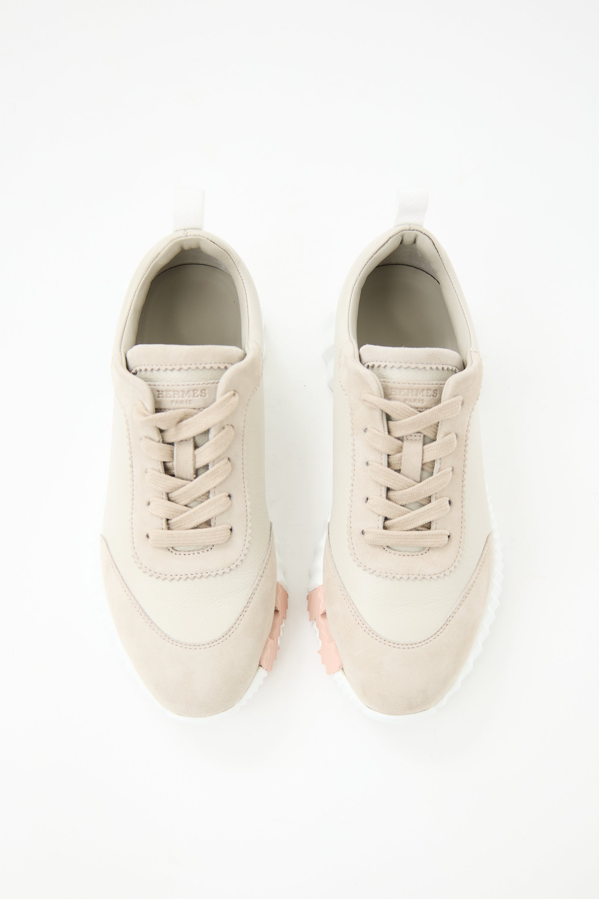 Pre-owned Hermès beige Femme Bouncing sneaker featuring rounded toe, leather and suede upper, lace up vamp, stamped logo tab at tongue, pull tab at counter, and white rubber sole with inset grey and pink rubber H motifs. Comes with original box, dust bags, and extra set of shoelaces.