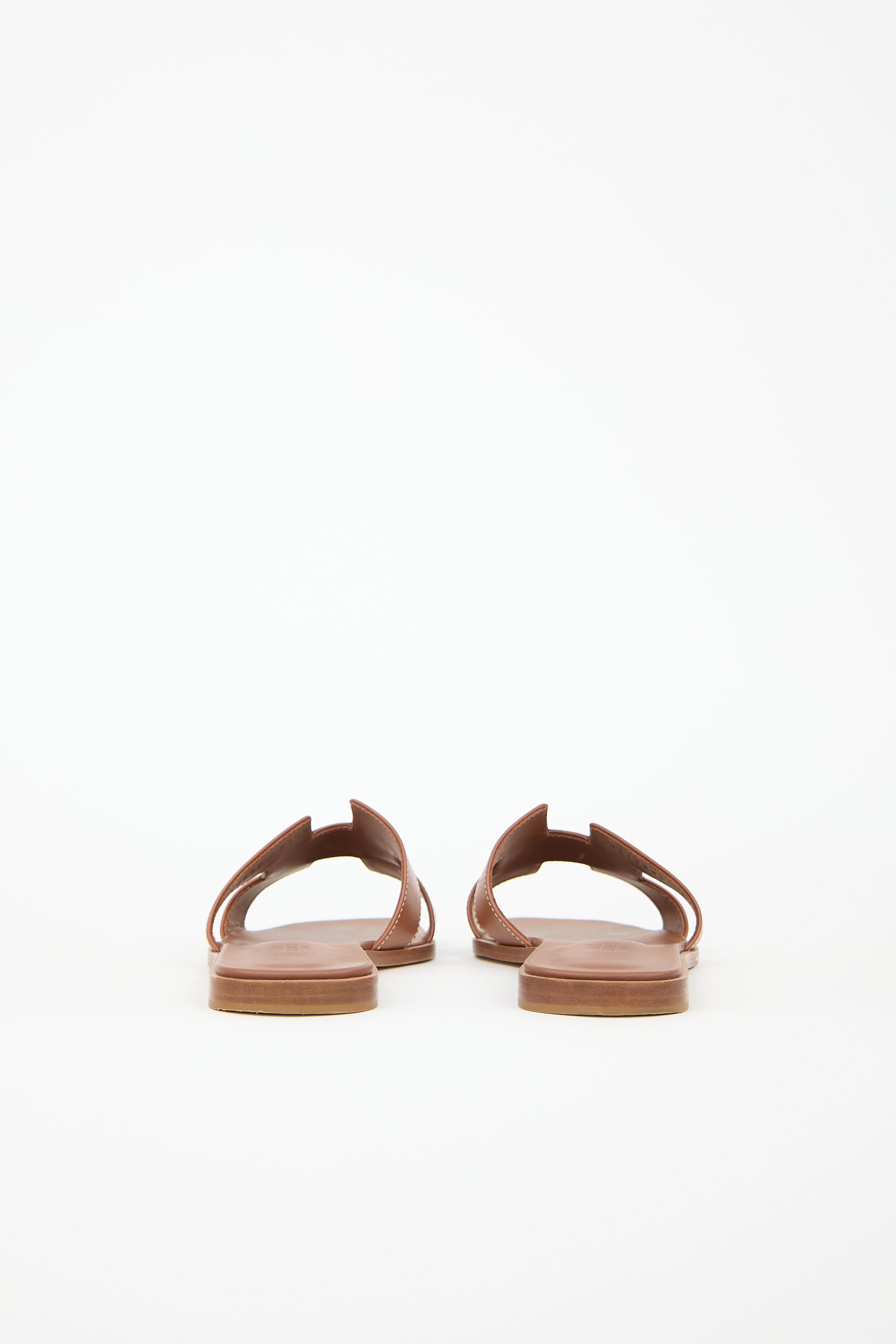 Pre-owned Hermès brown leather Oran sandals featuring open square toe, cut out "H' at vamp, and short stacked heel.