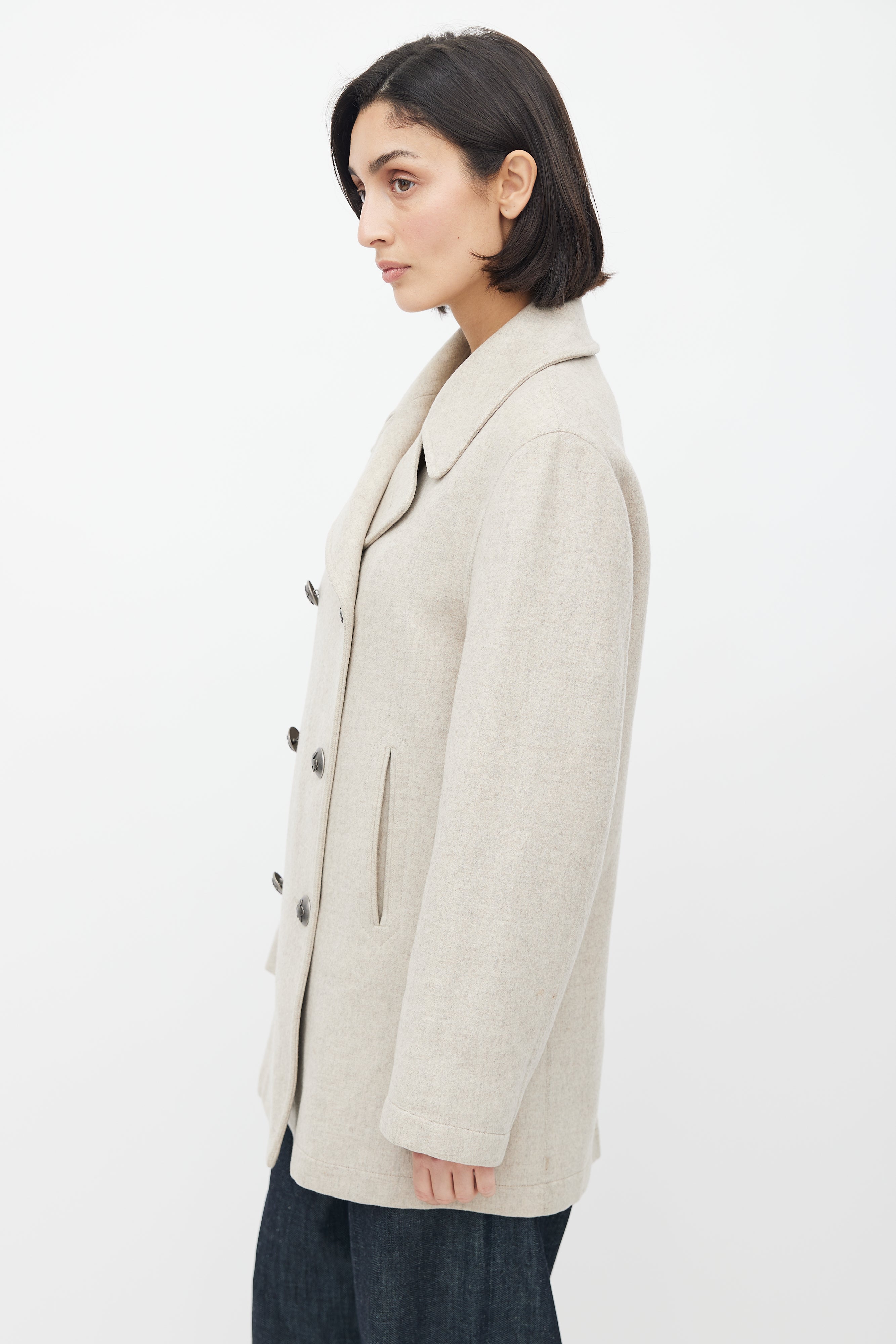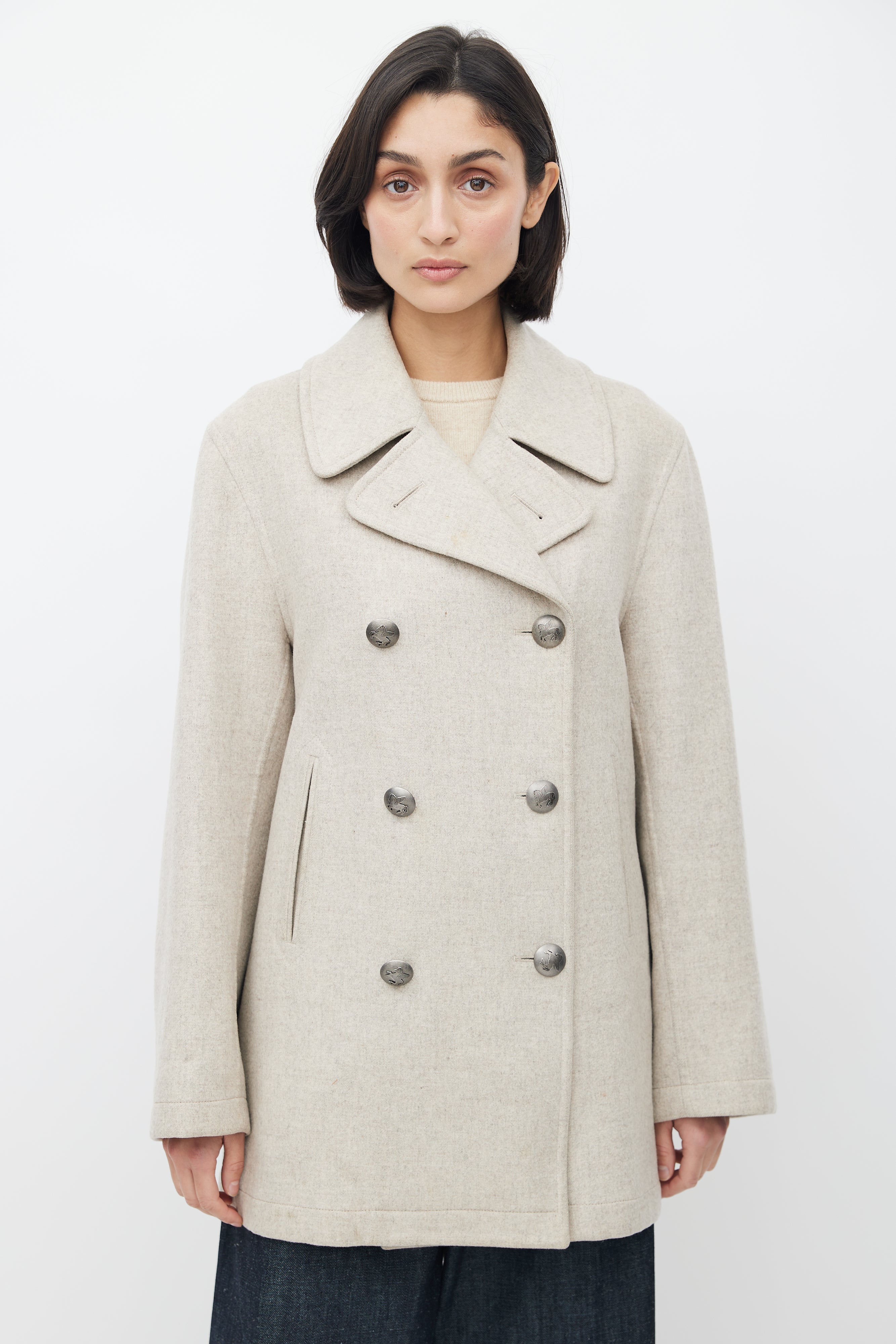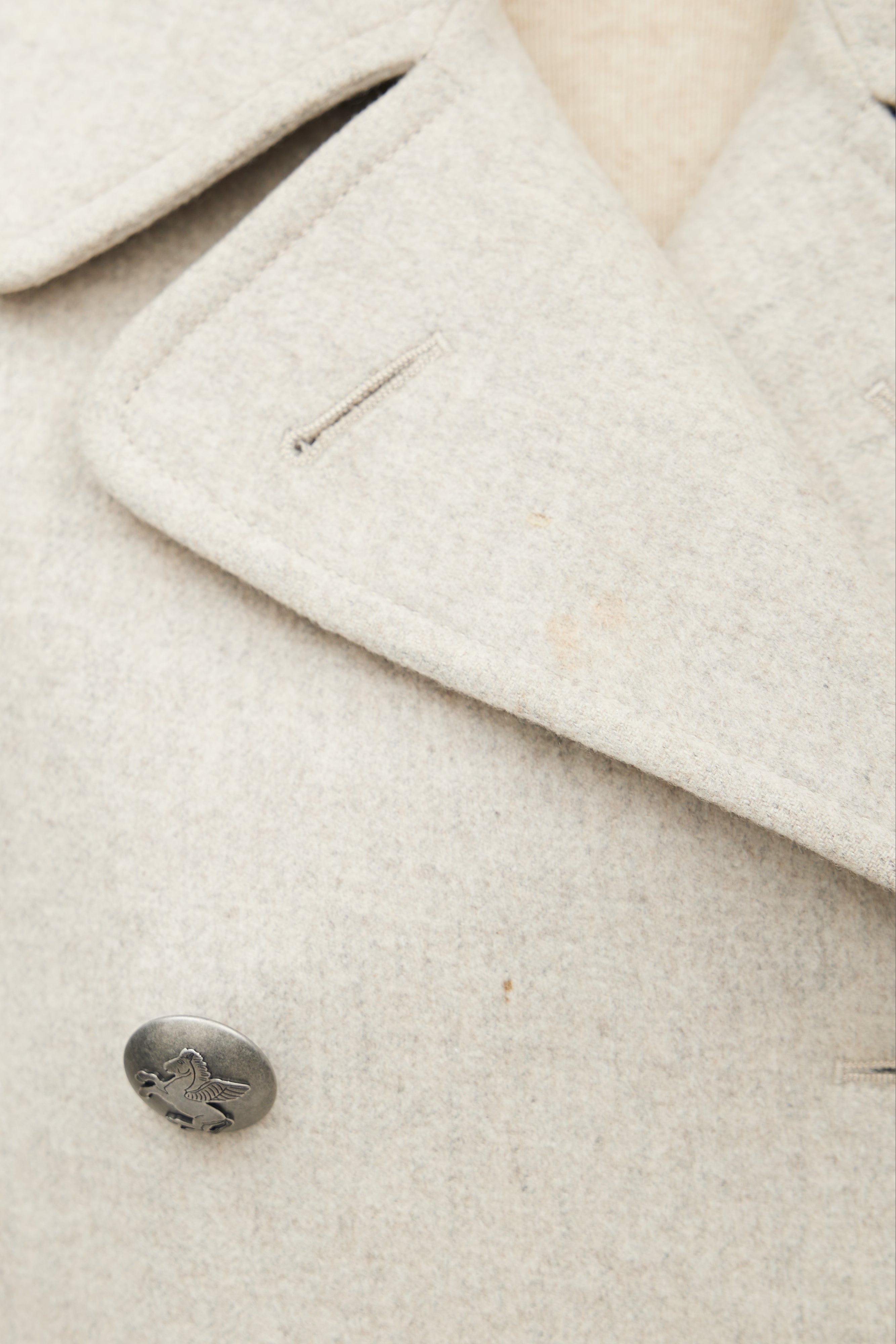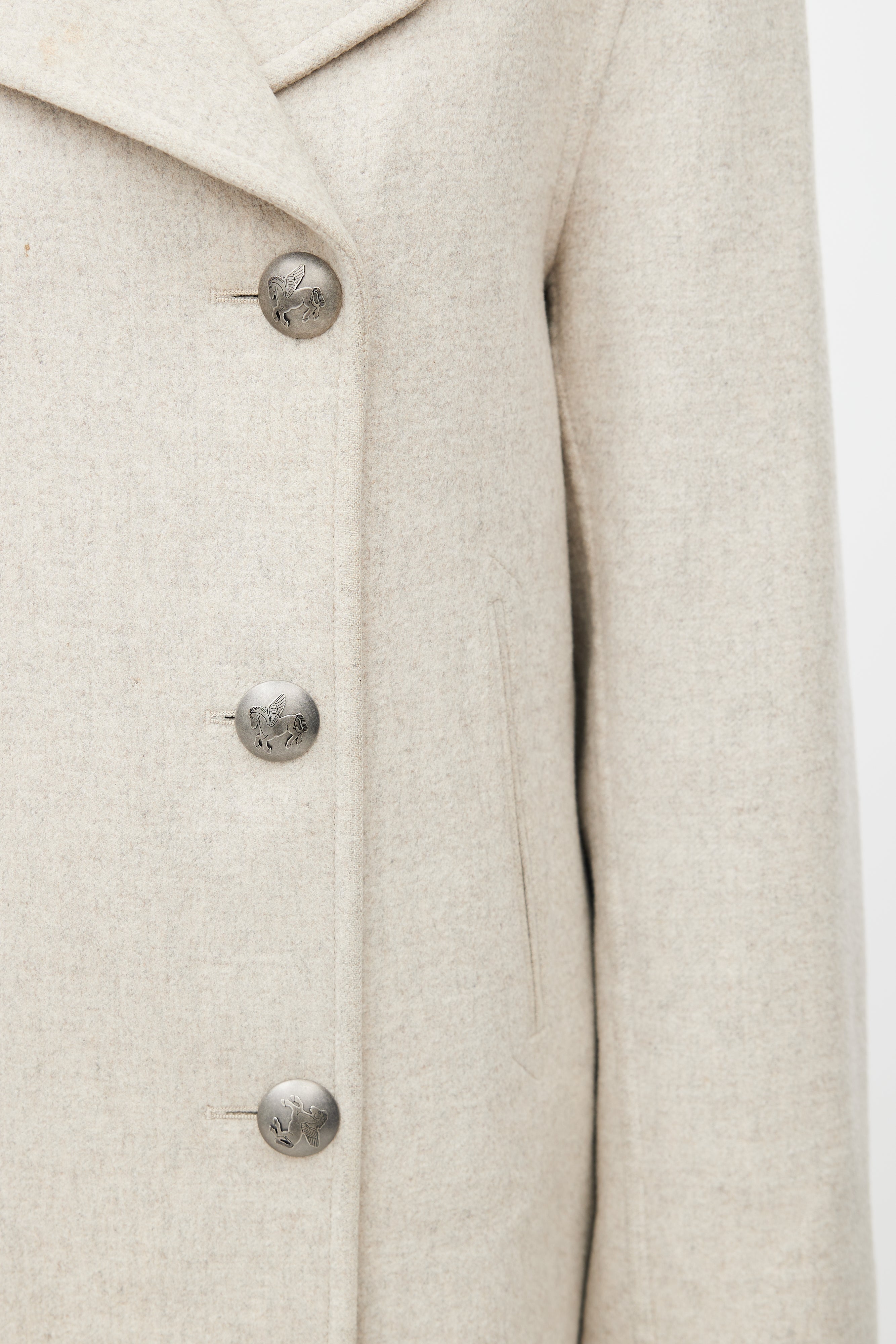 Pre-owned Hermès light grey coat featuring aged silver tone double breasted up front with horse embellishment, peak lapel, two hip pockets, and back vent. Unlined.