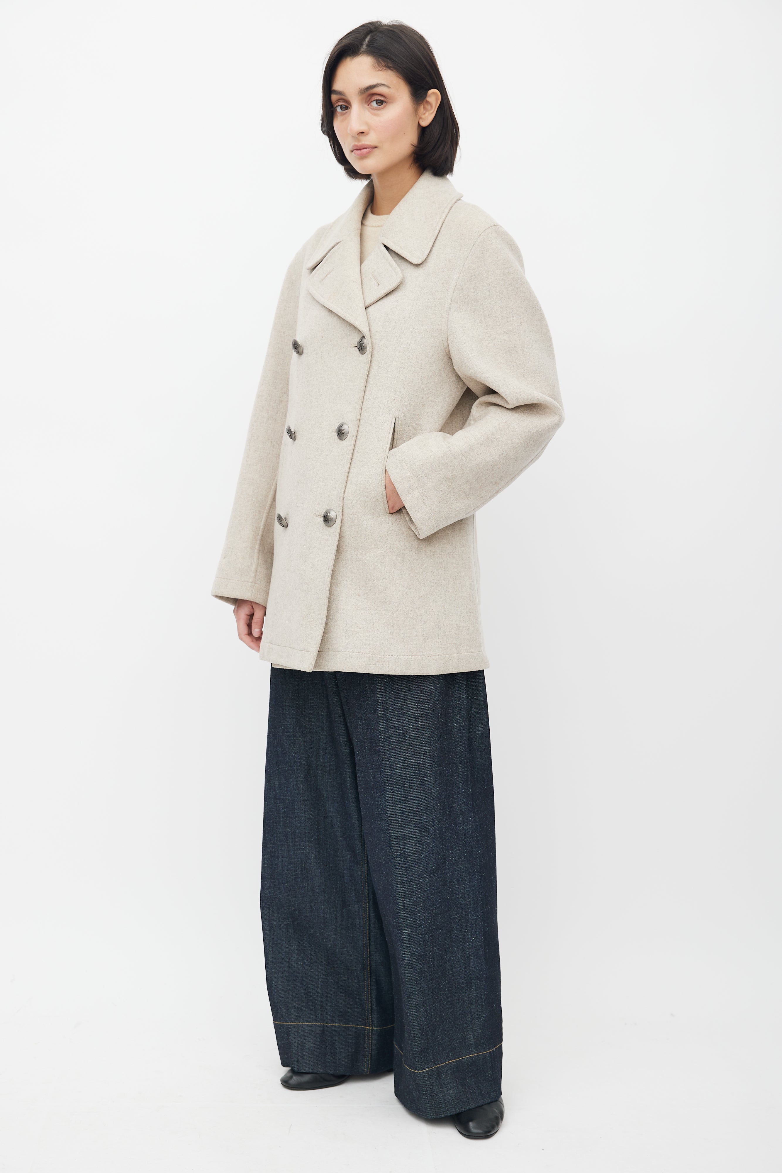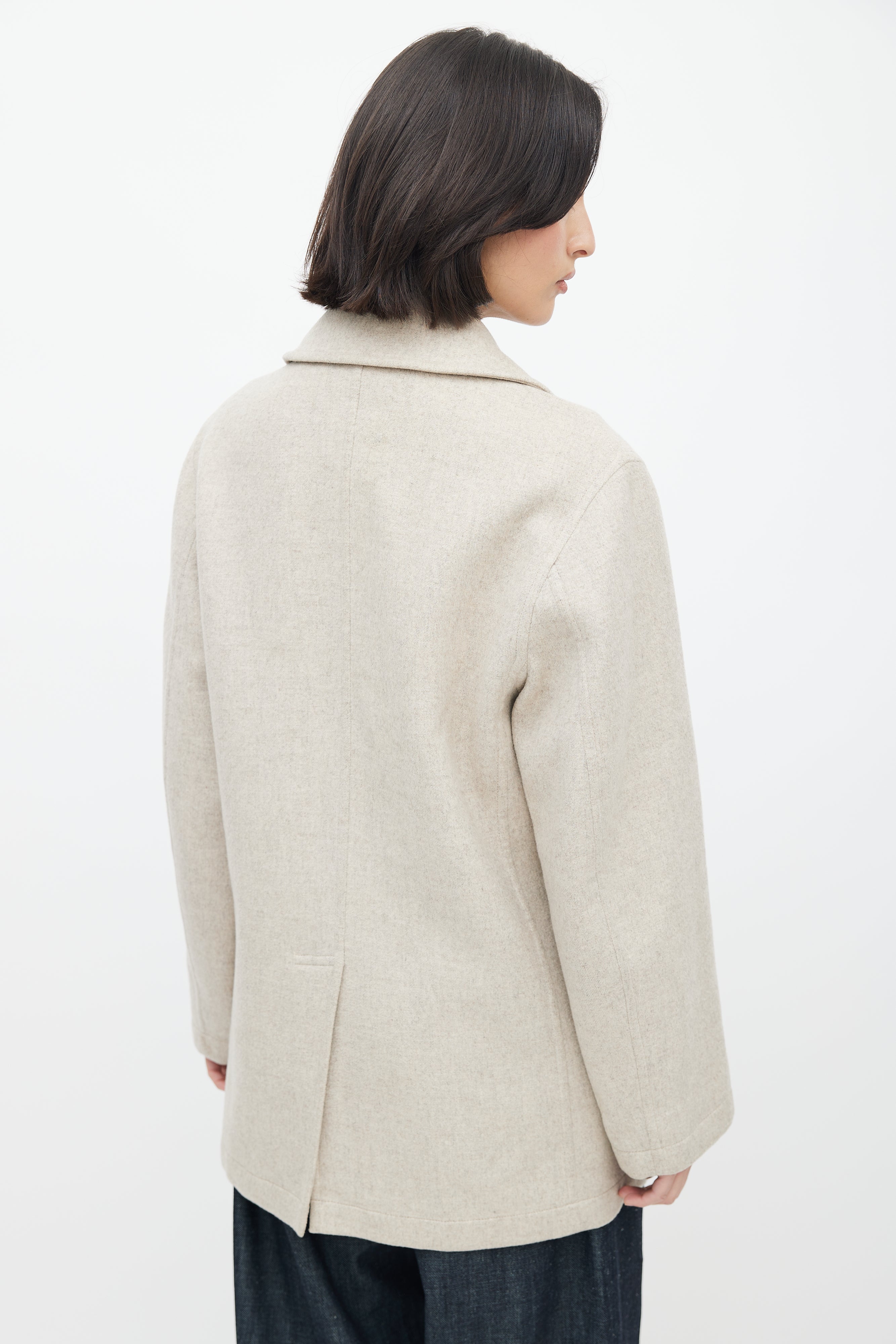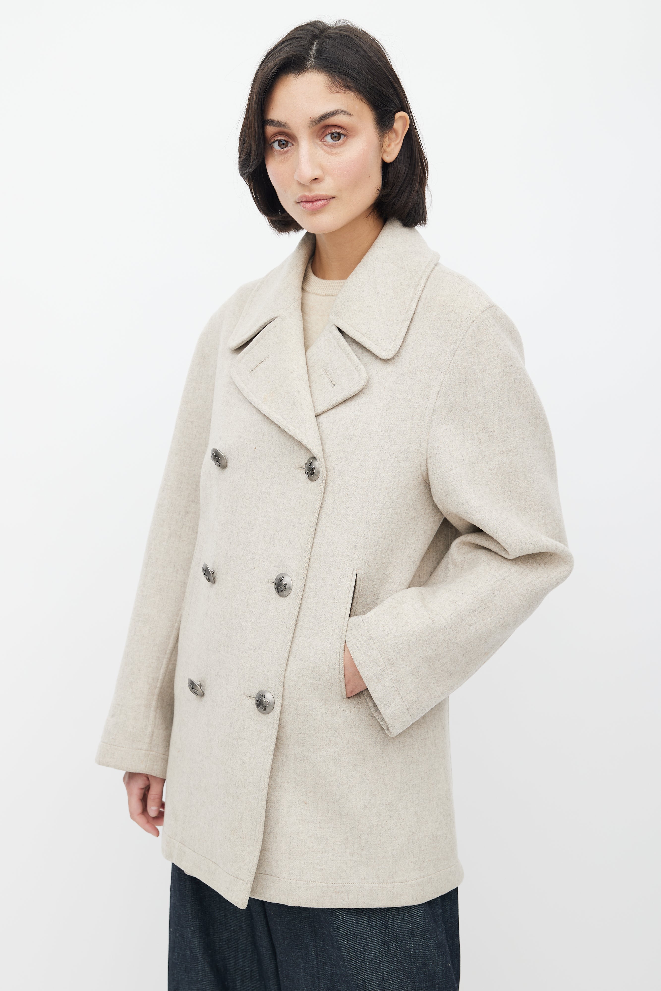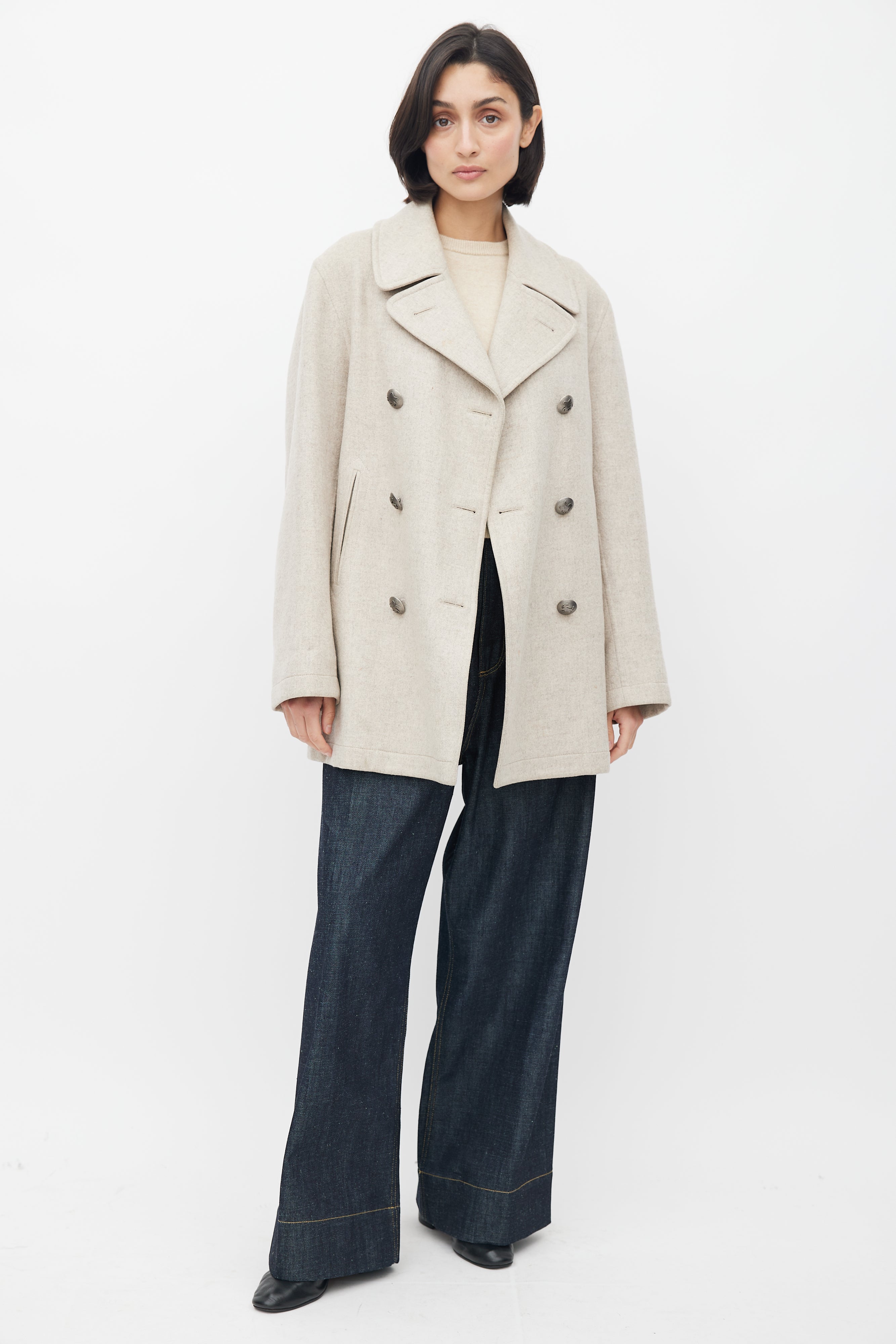 Pre-owned Hermès light grey coat featuring aged silver tone double breasted up front with horse embellishment, peak lapel, two hip pockets, and back vent. Unlined.