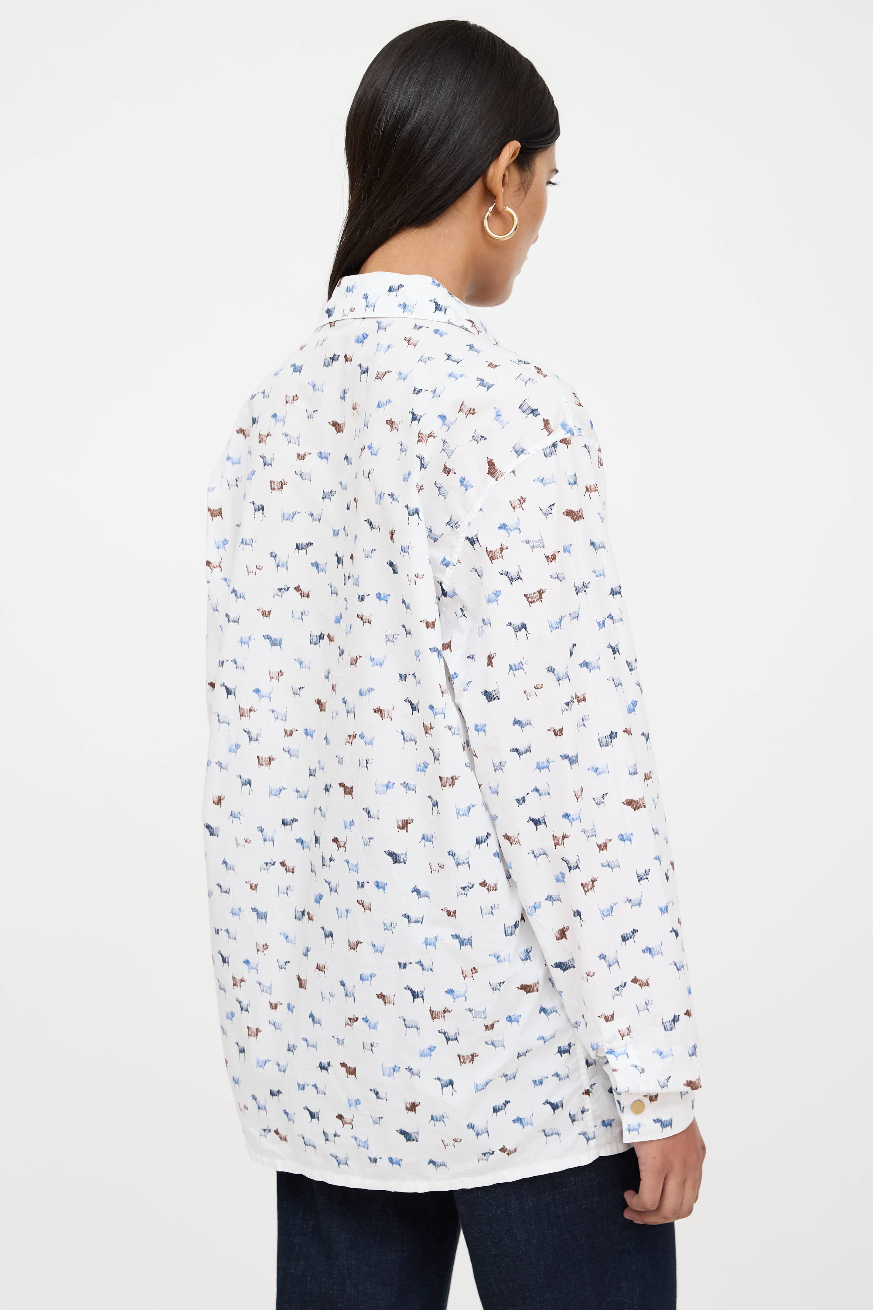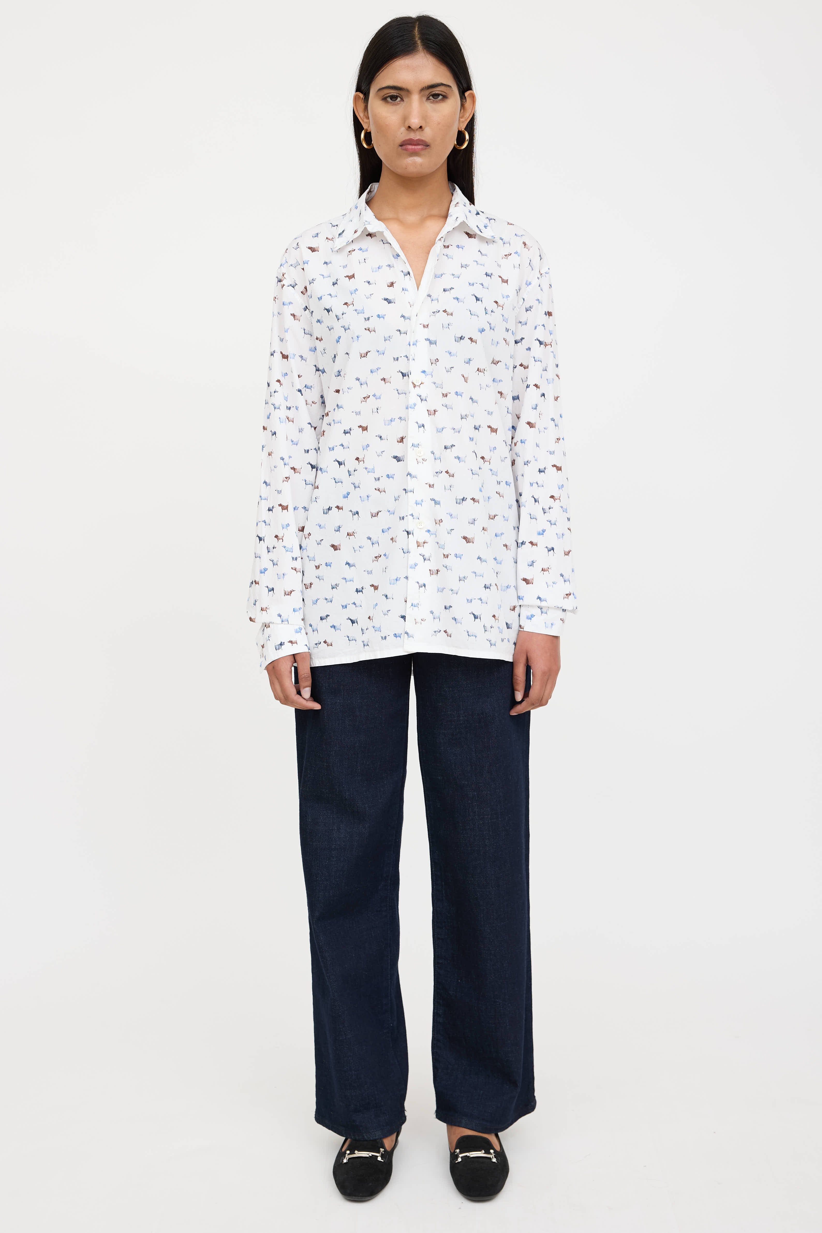 Pre-owned Hermès white shirt featuring a multicolour Meli Medor dog pattern throughout, pointed collar, long sleeves with buttoned cuffs, and button up closure.