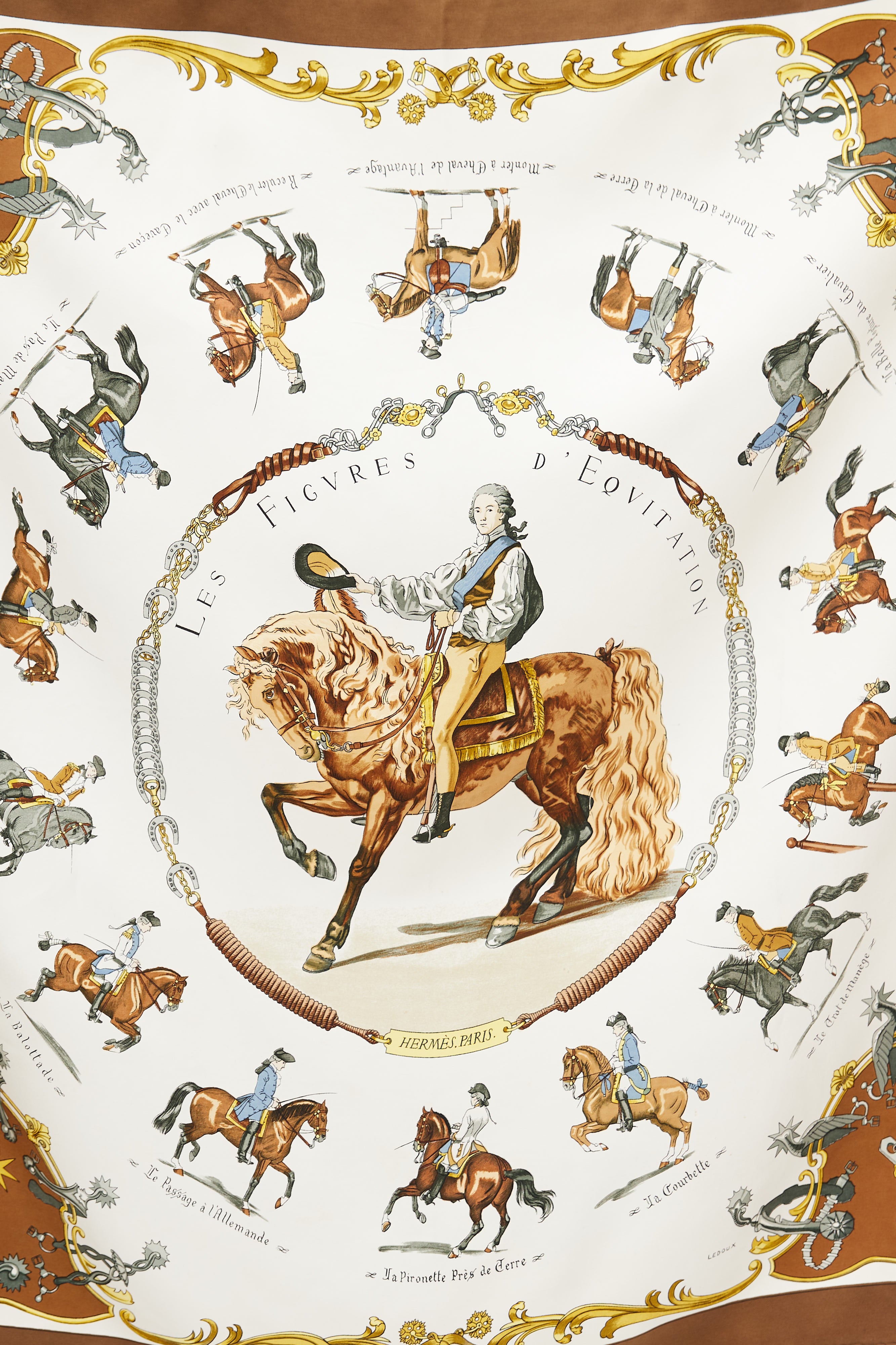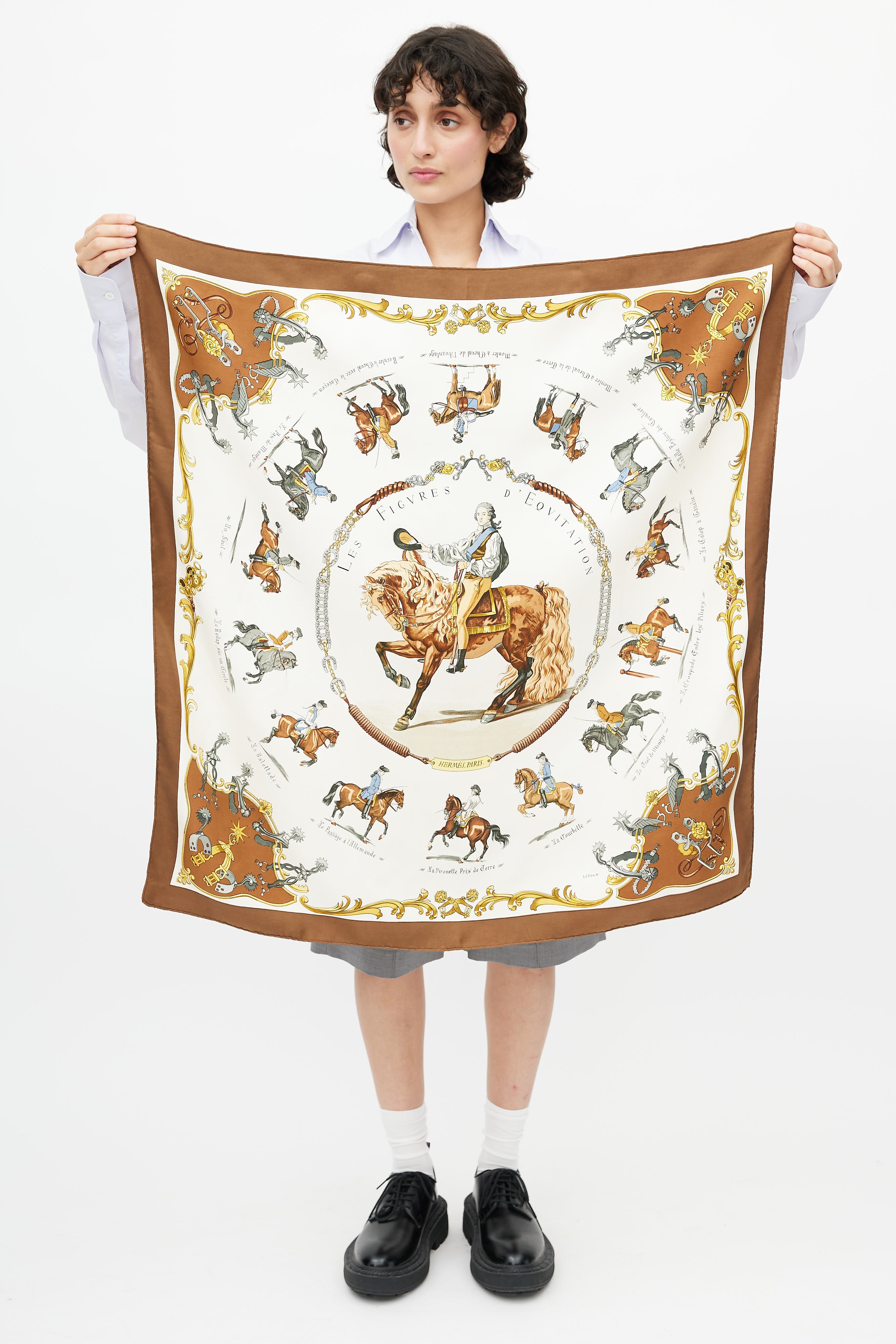 Pre-owned Hermès cream scarf featuring Les Figures d'Équitation print by Philippe Ledoux, multicolour equestrian motif, and brown frame with hand rolled trim.