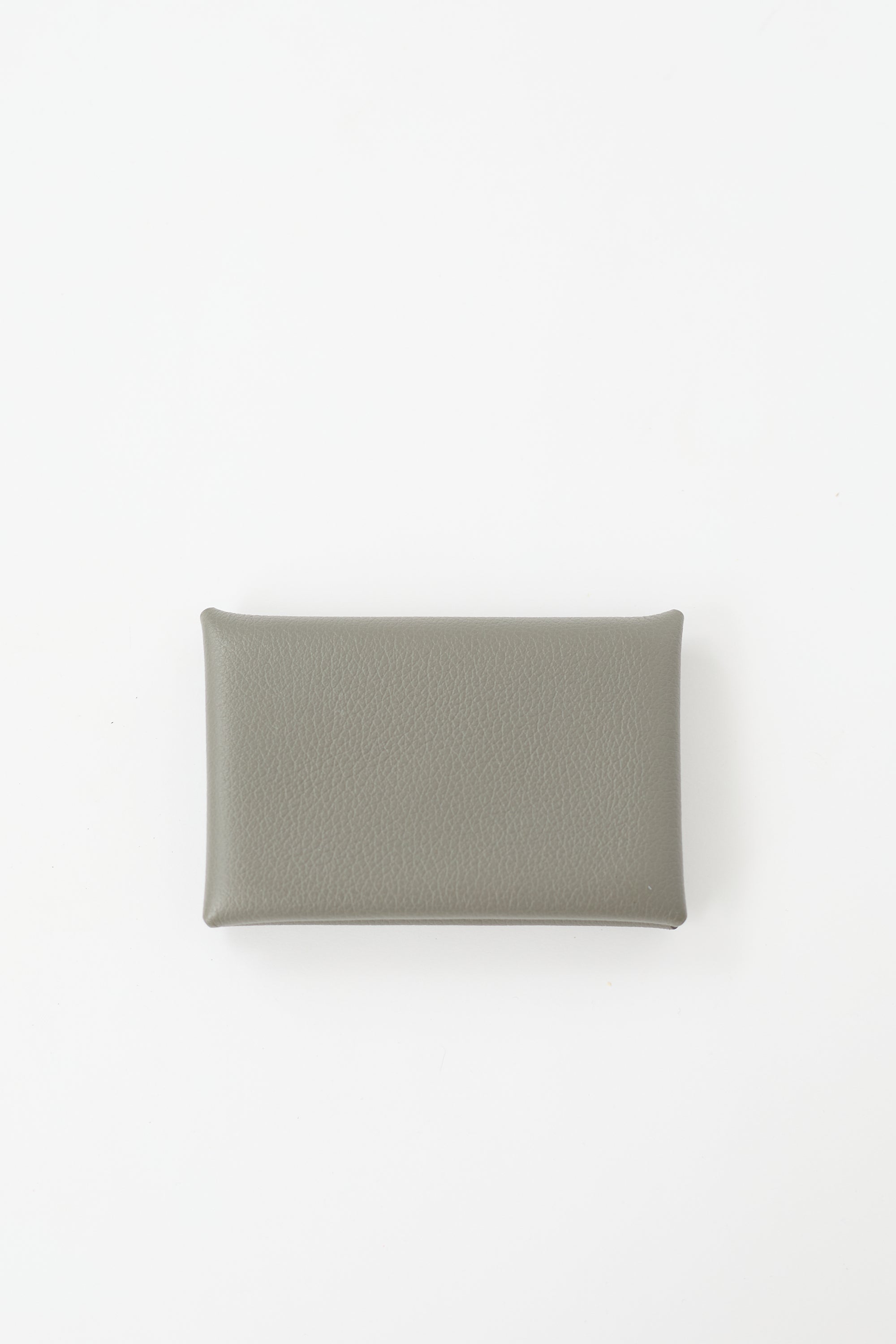 Pre-owned Hermès grey Mysore goatskin leather Calvi card holder featuring snap button closure, two slip pockets inside, and silver stamped logo. Includes original box.