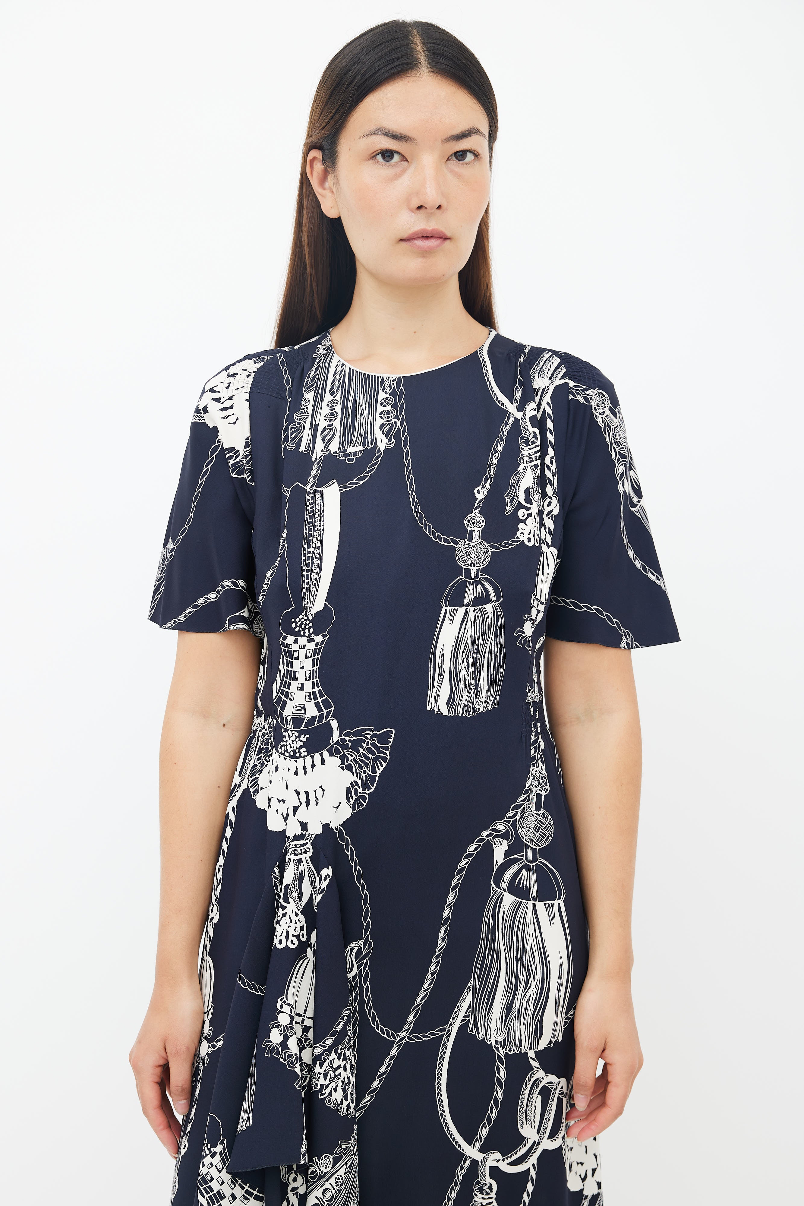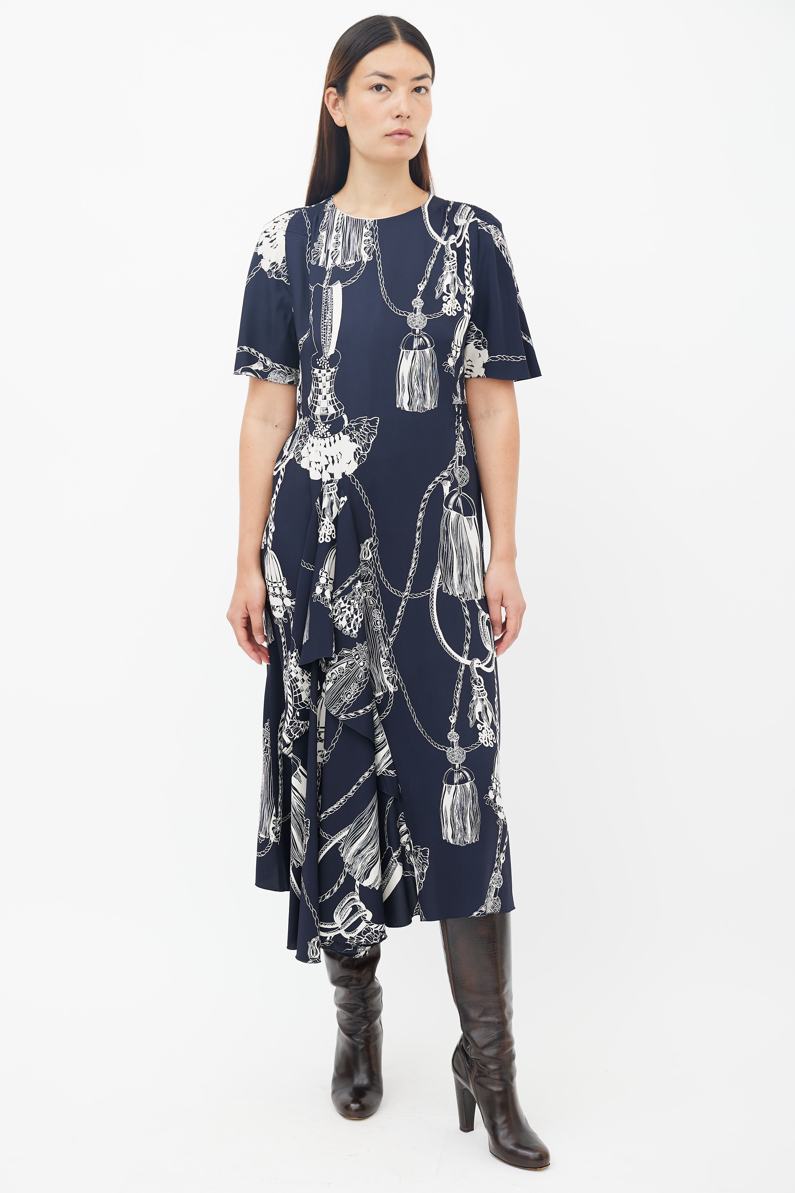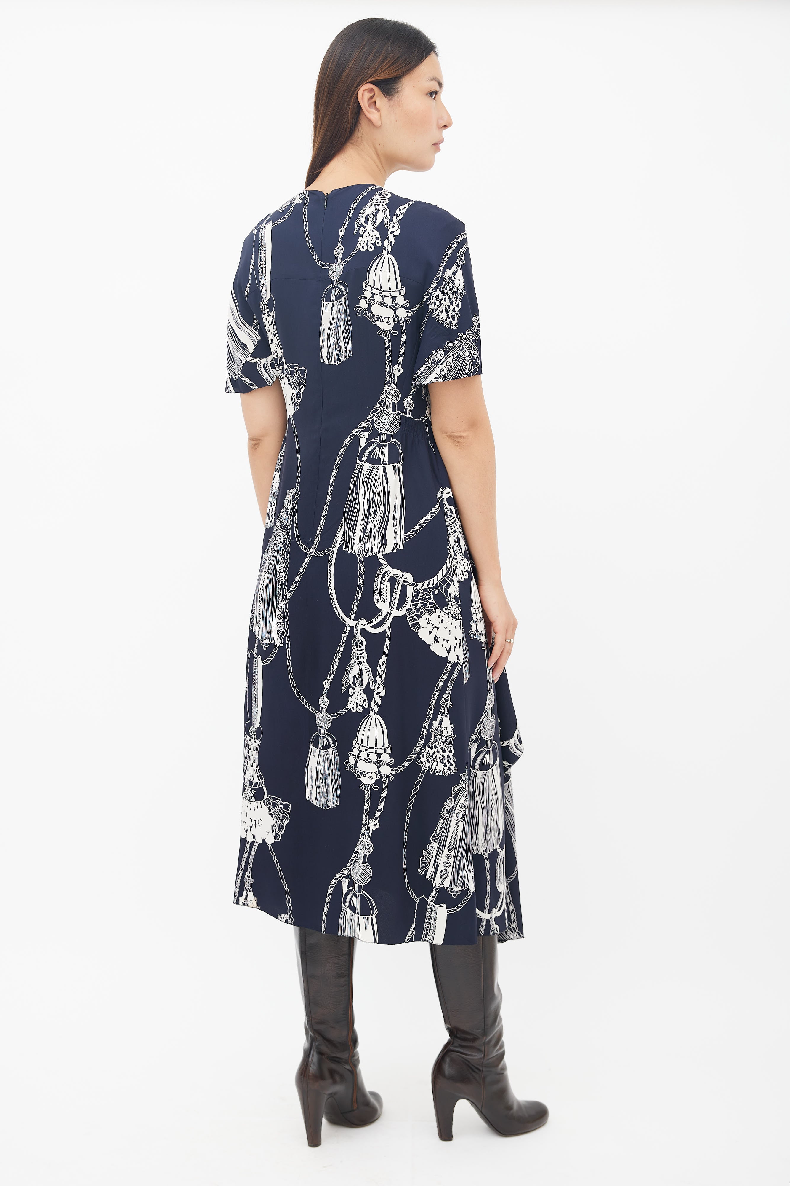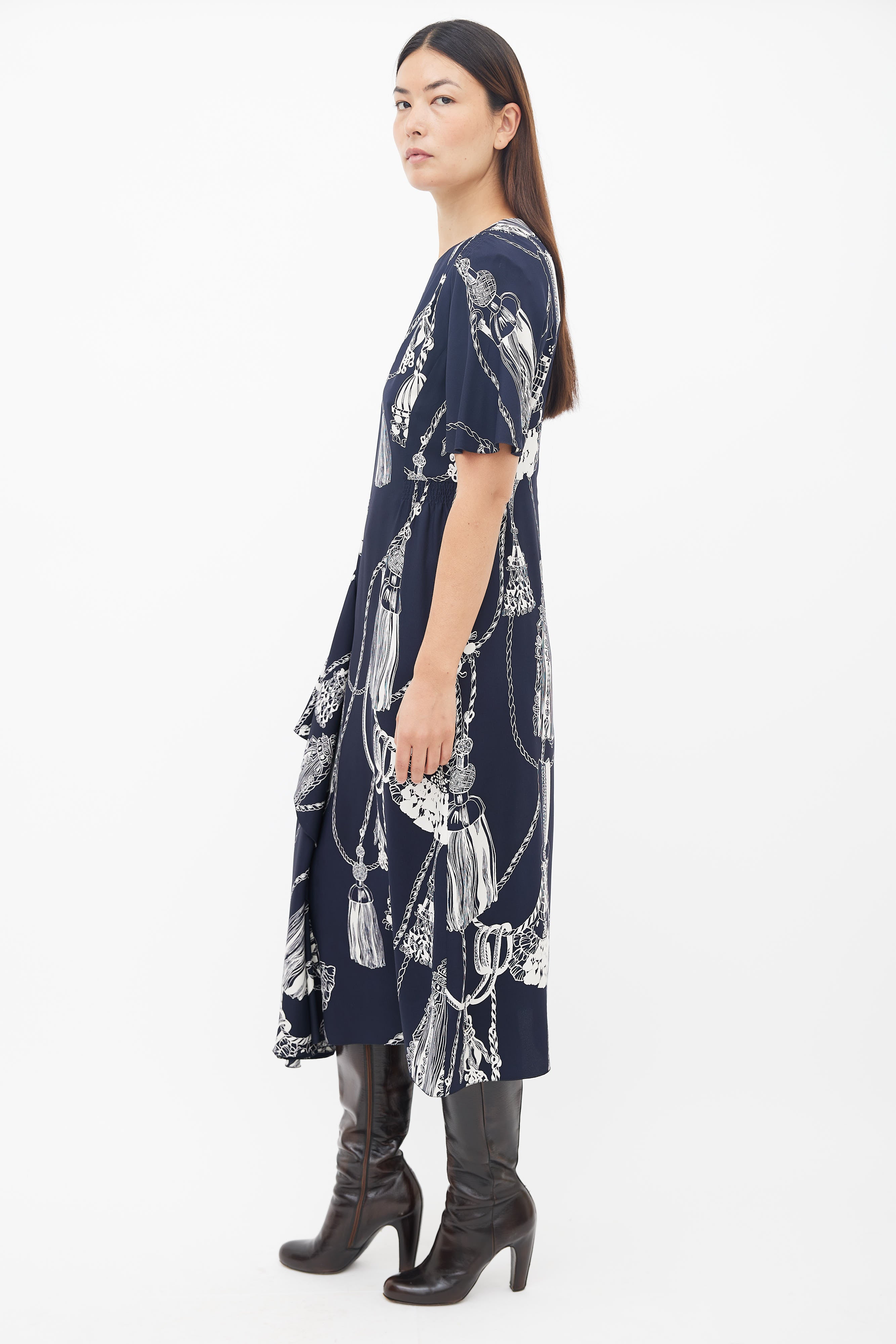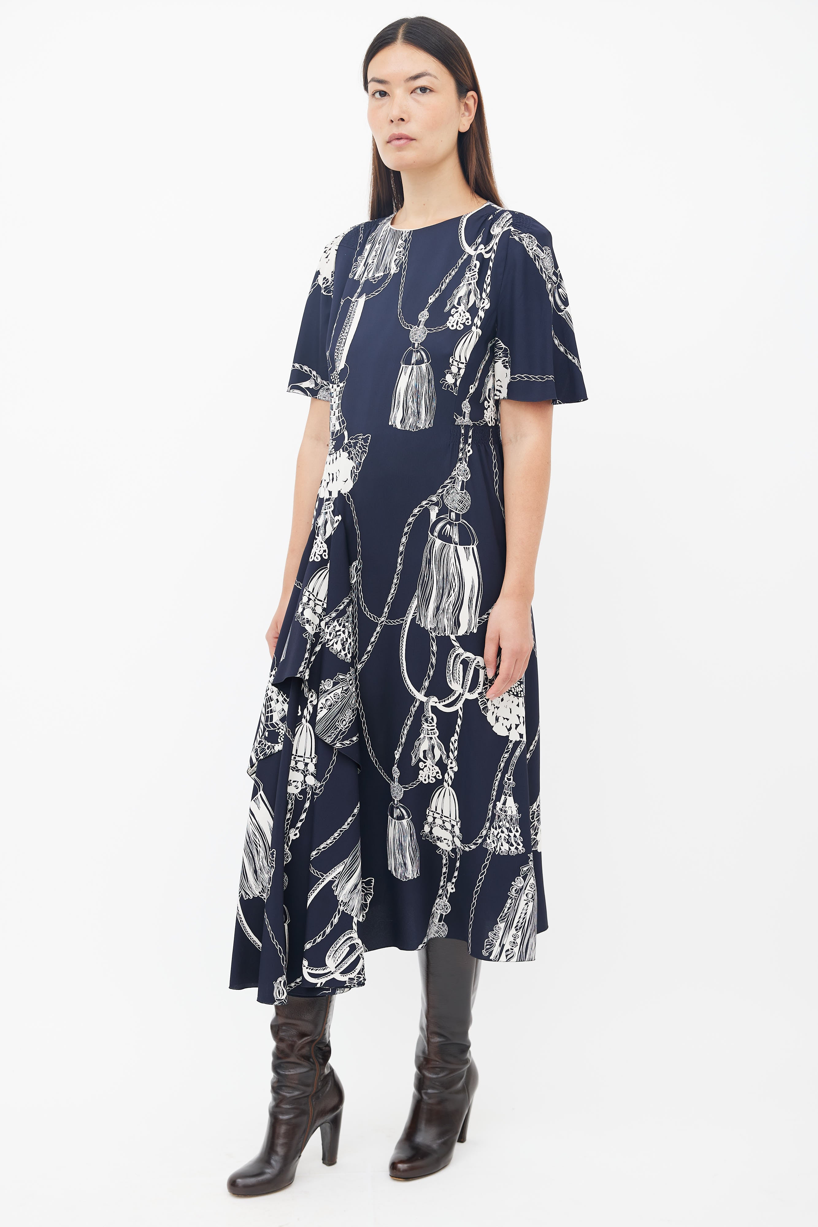 Pre-owned Hermès silk printed ruffled dress in navy and cream featuring a braided rope and tassel print throughout, crew neckline, short sleeves, smocking detail at shoulder and waist, ruffle insert at front, lined bodice, and concealed zip closure at back.