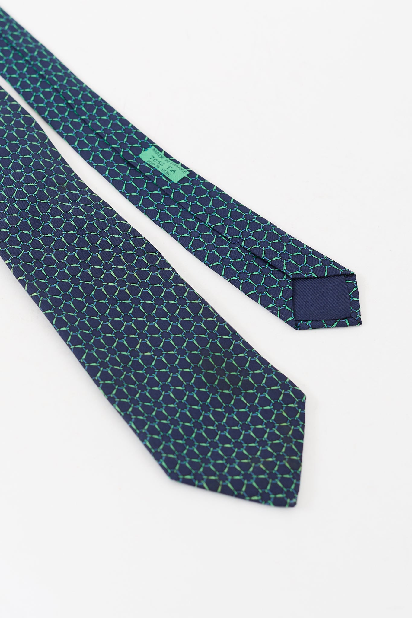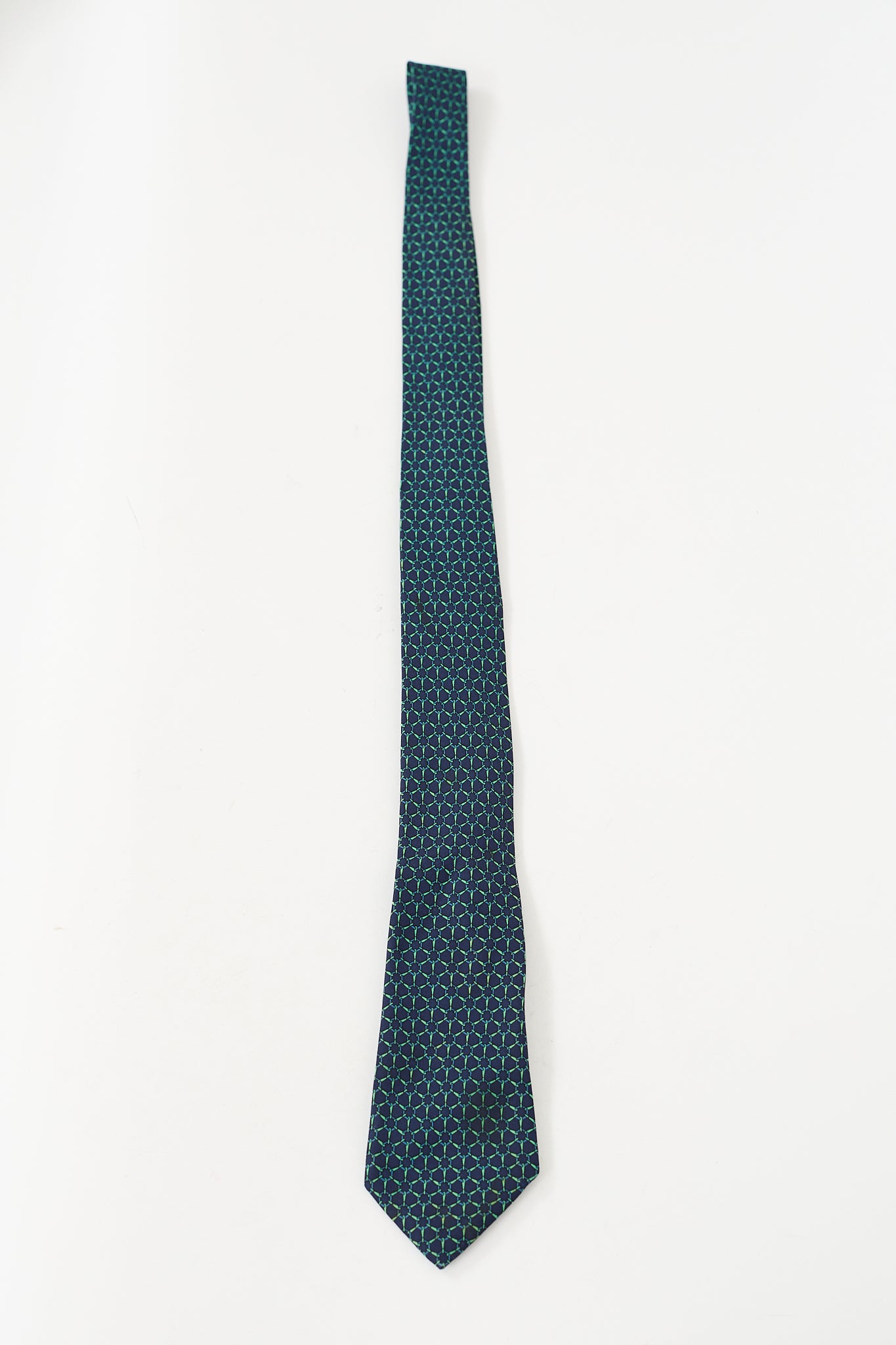 Pre-owned Hermès navy and green silk tie featuring geometric pattern throughout, box logo at narrow end, and logo tab at reverse.