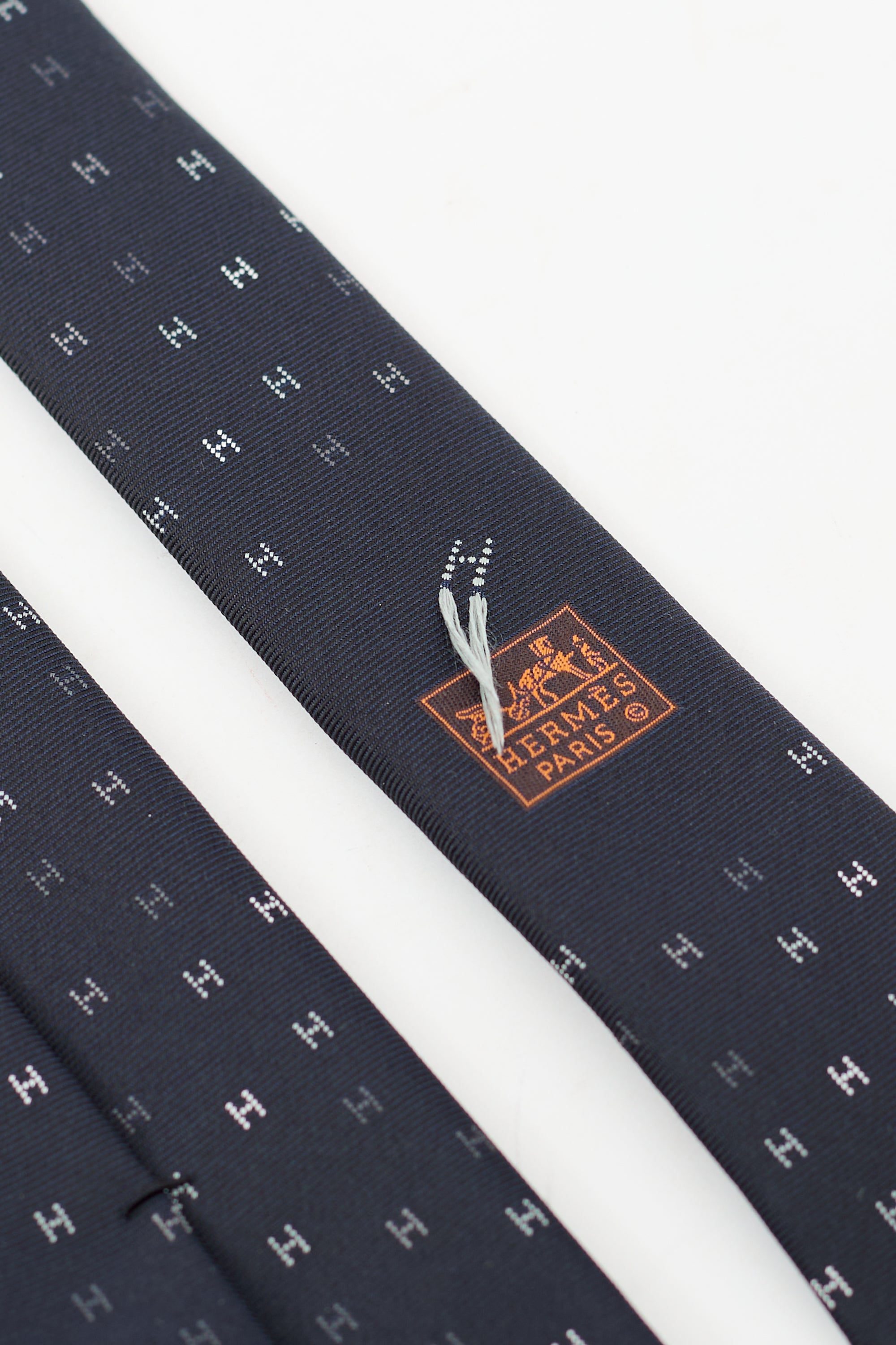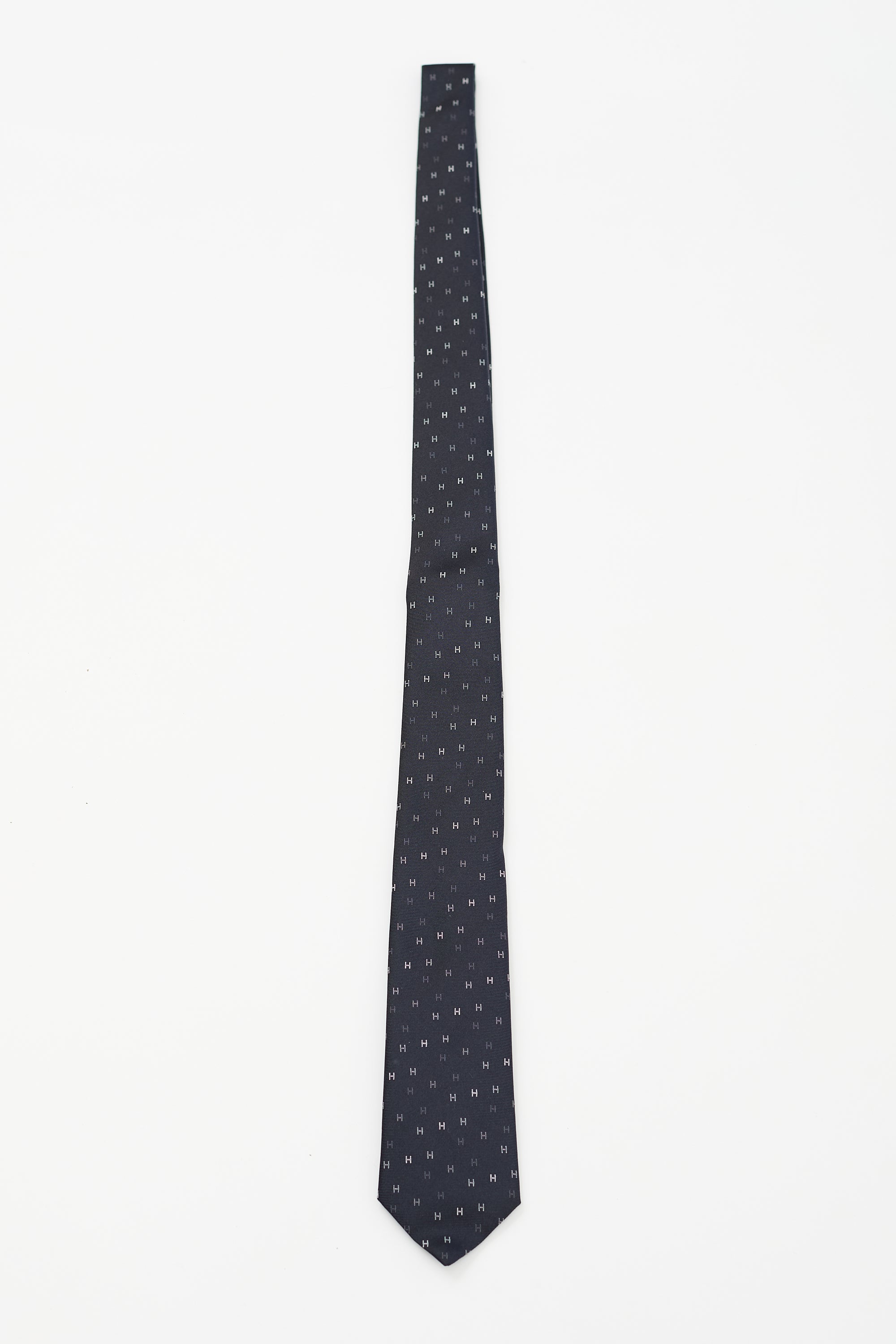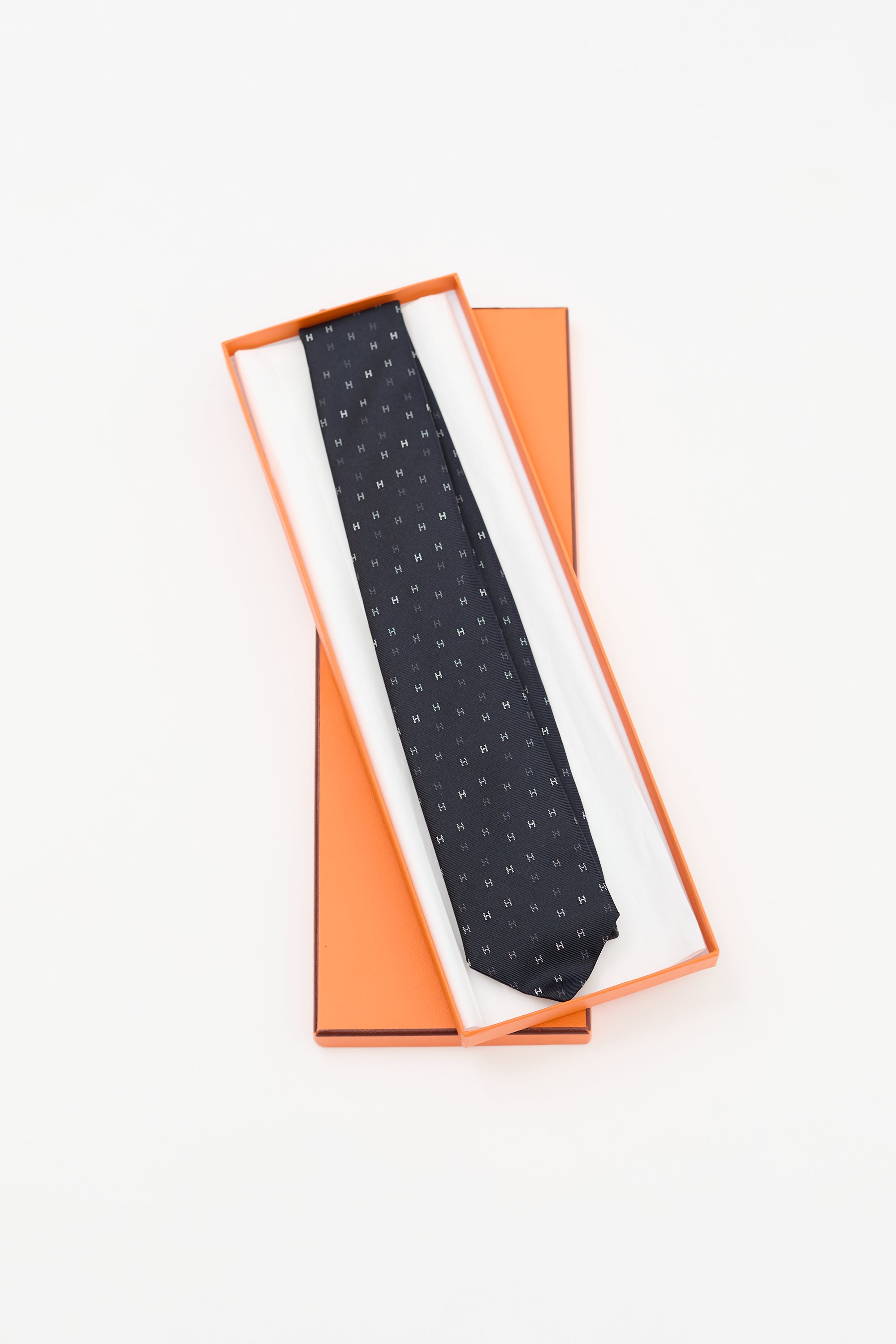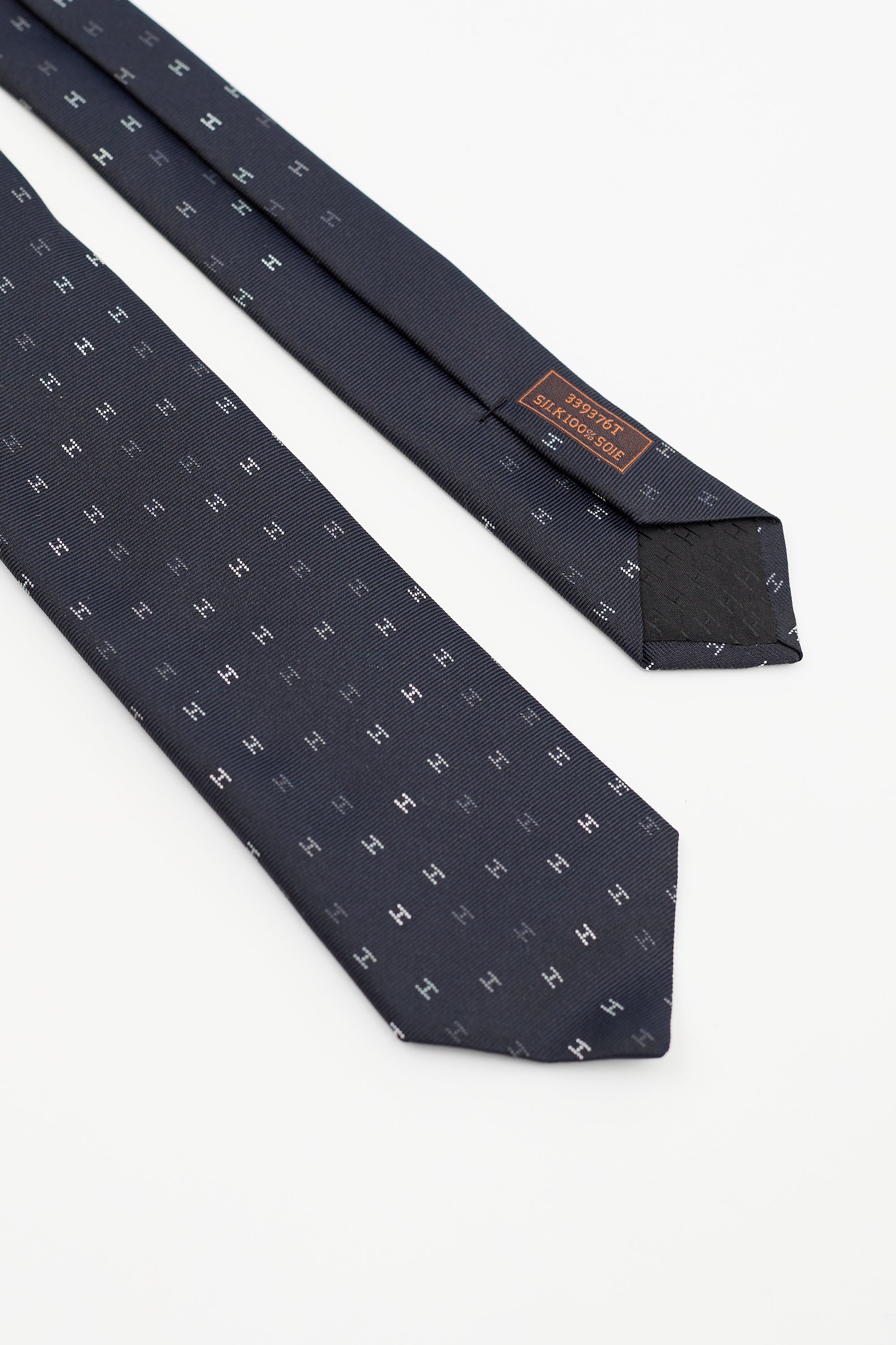 Pre-owned Hermès navy silk H Scintillant tie featuring multicolour H pattern and loose thread detail at back of tie. Comes with original box