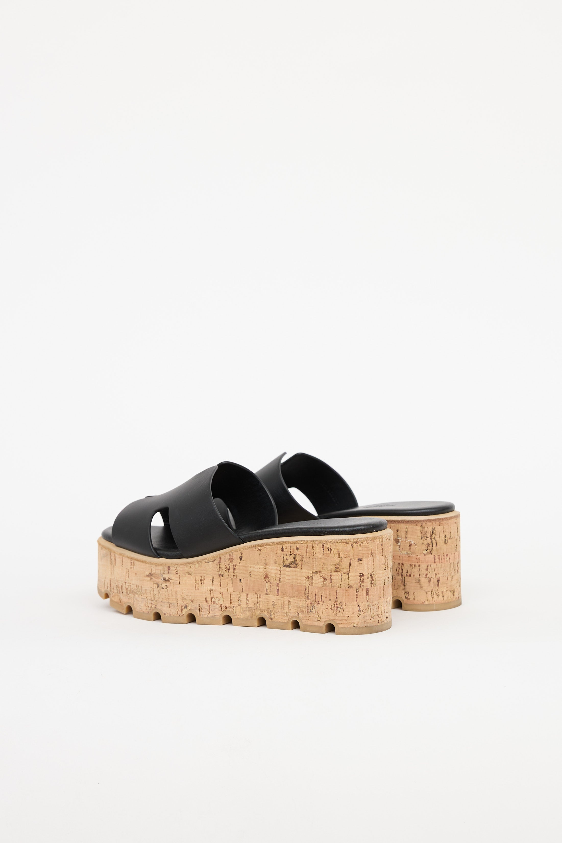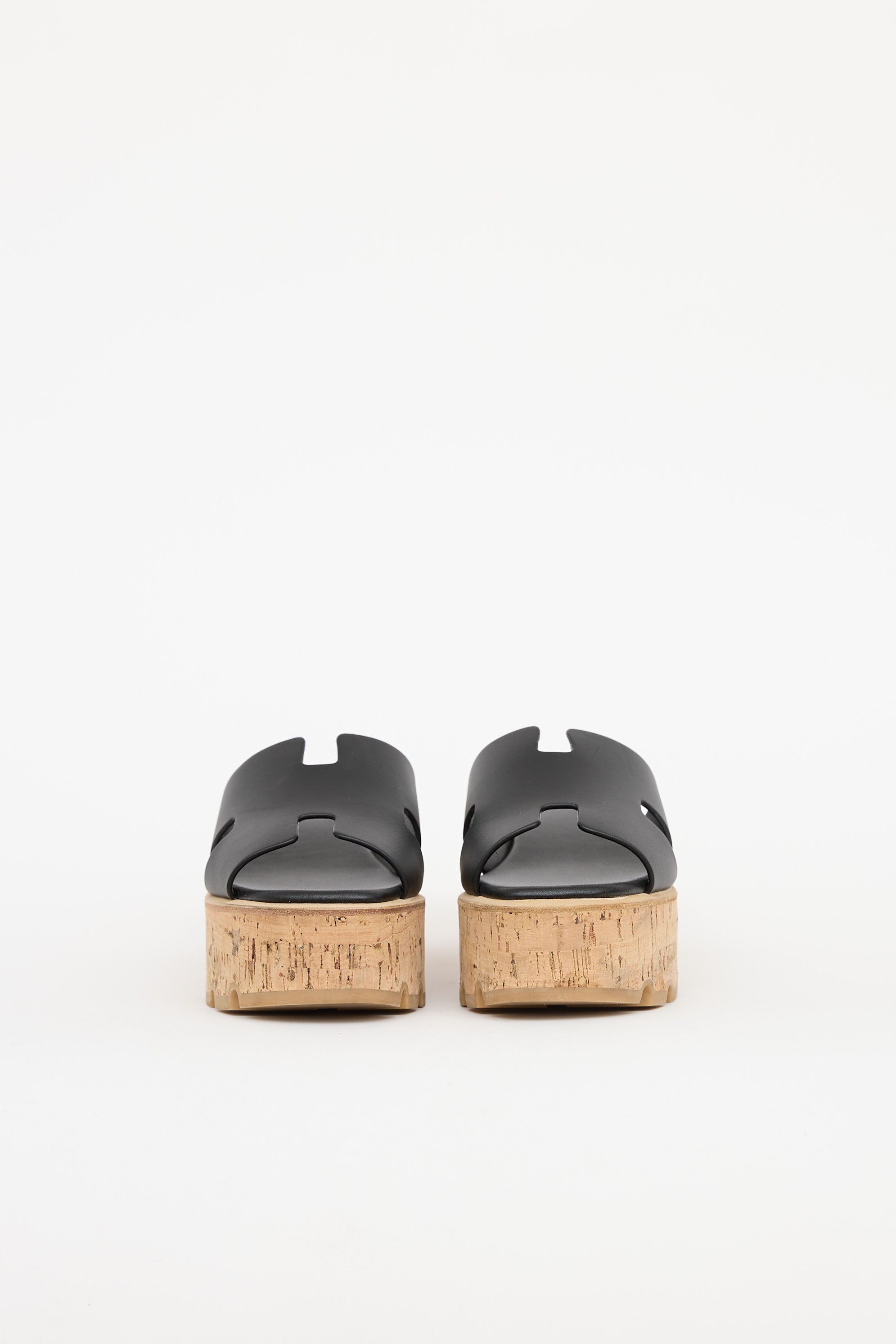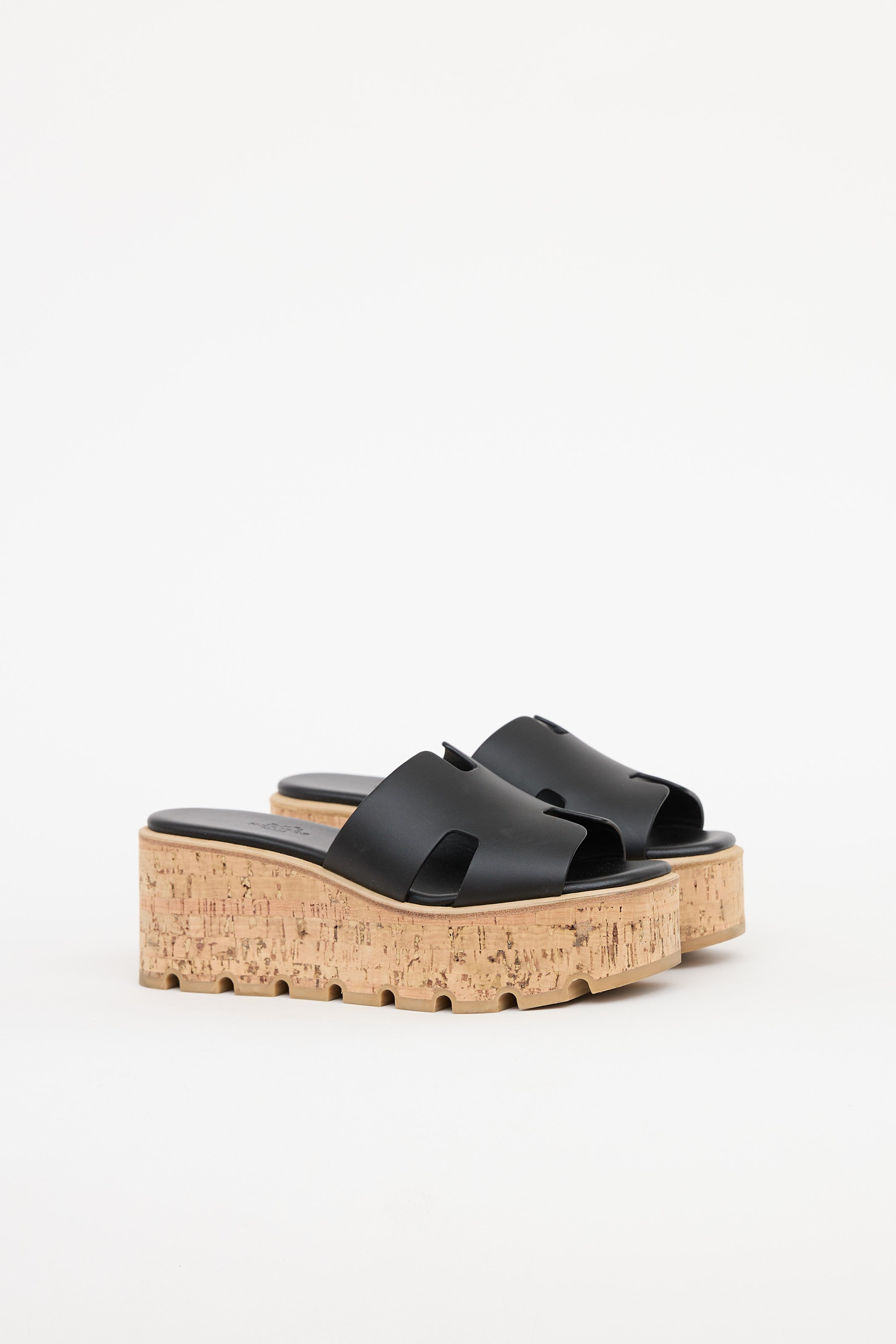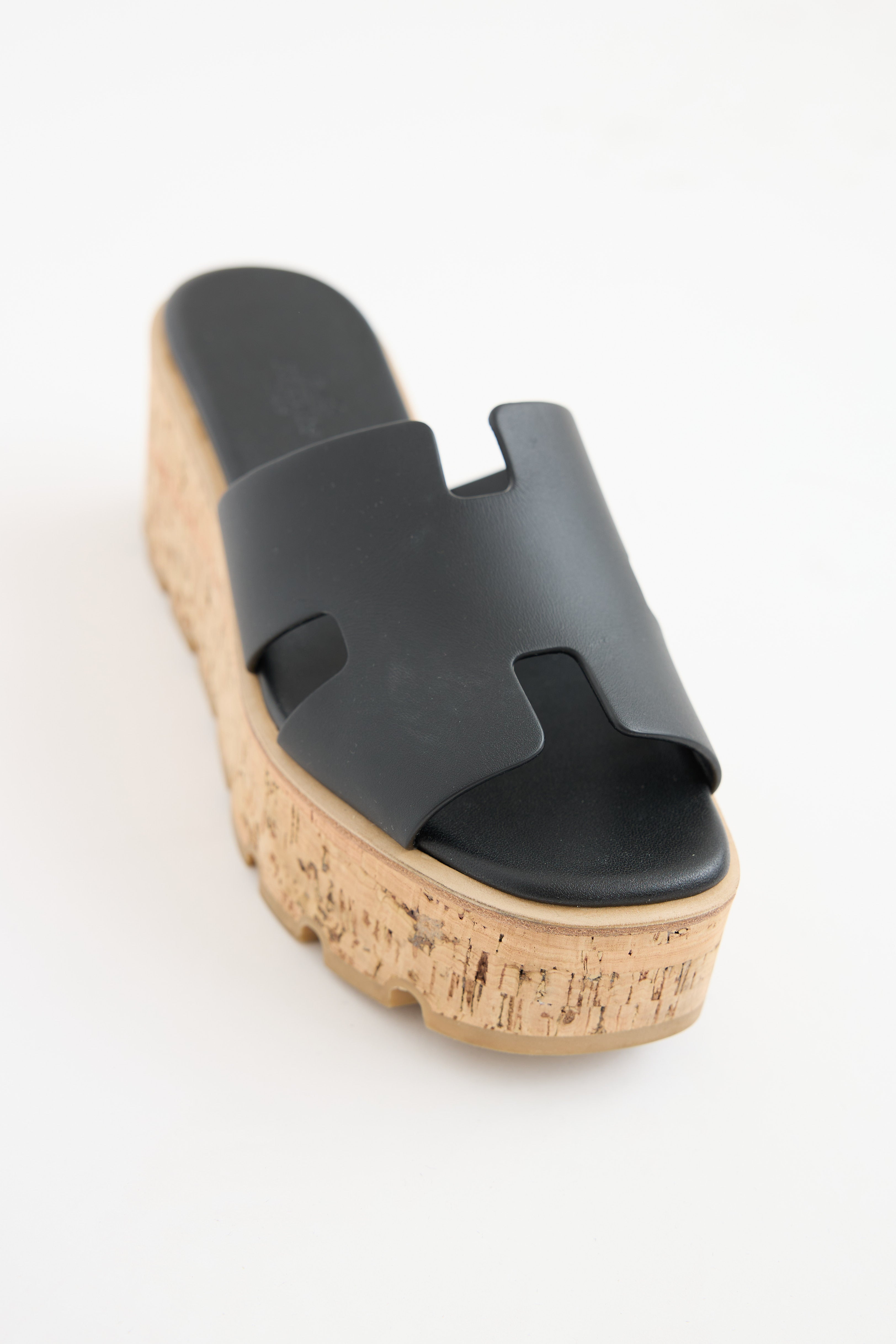 Pre-owned Hermès Noir Eze sandal featuring slip on entry, cork platform midsoles, leather 'H' cut out at vamp, and treaded rubber soles.