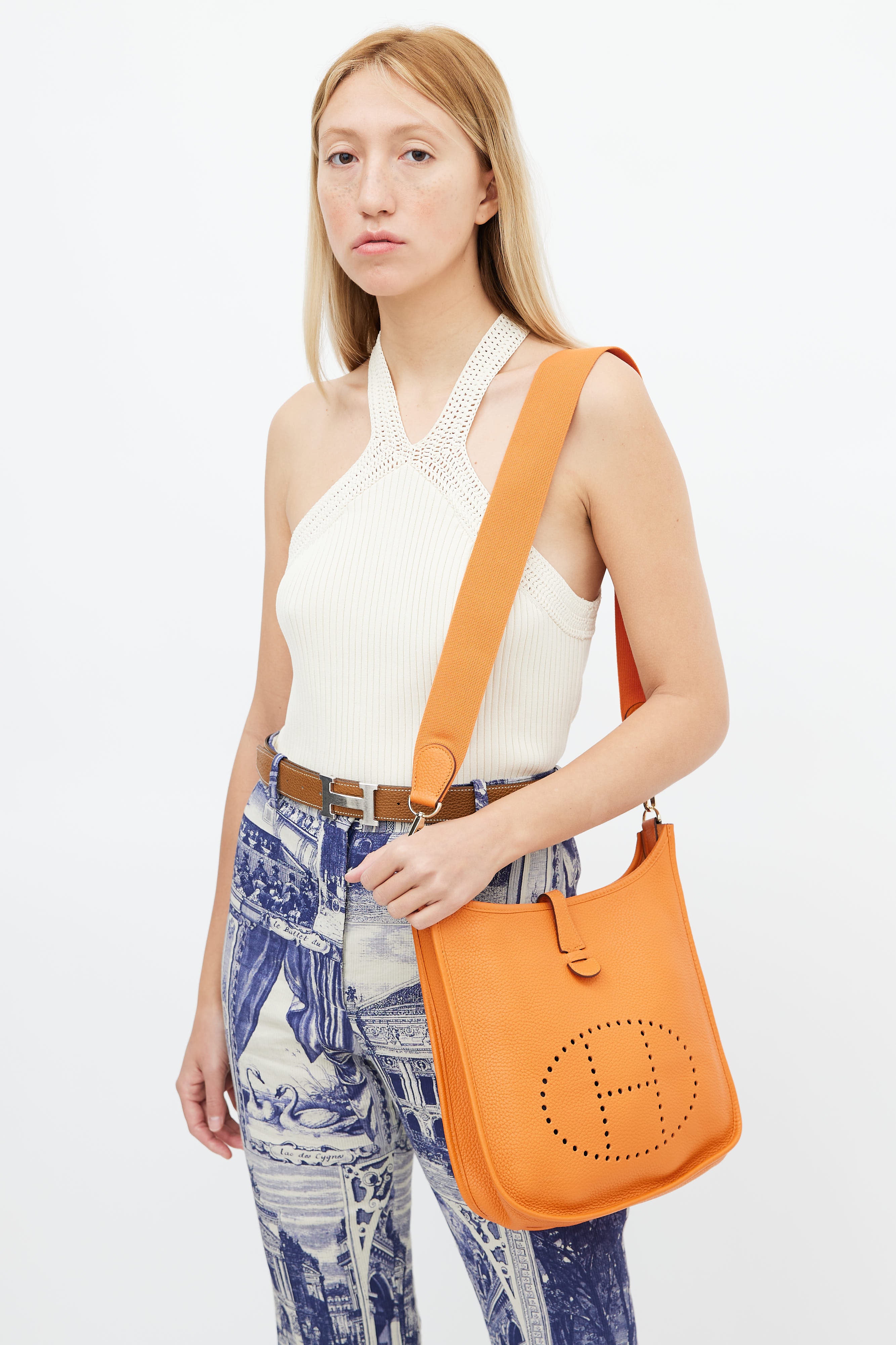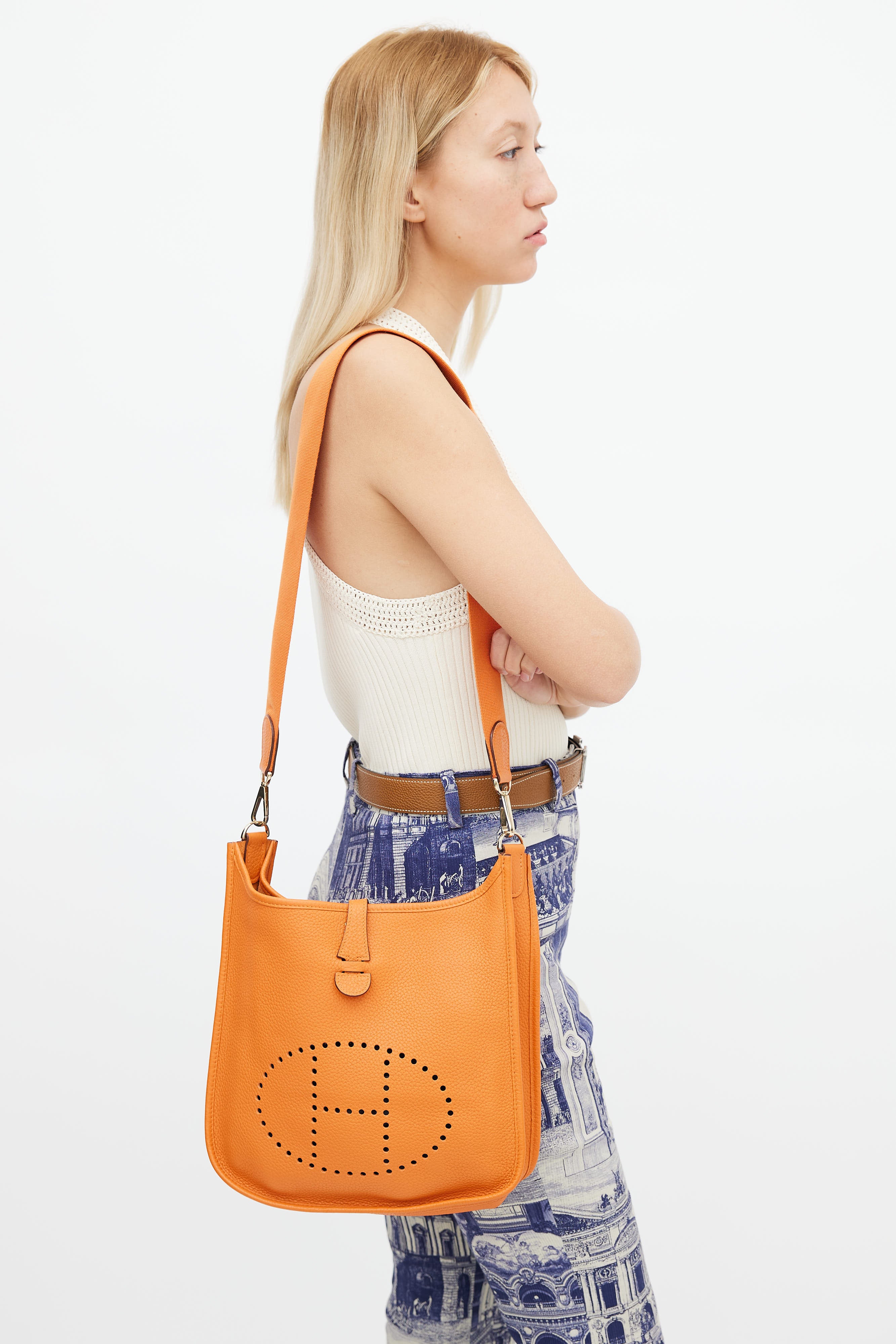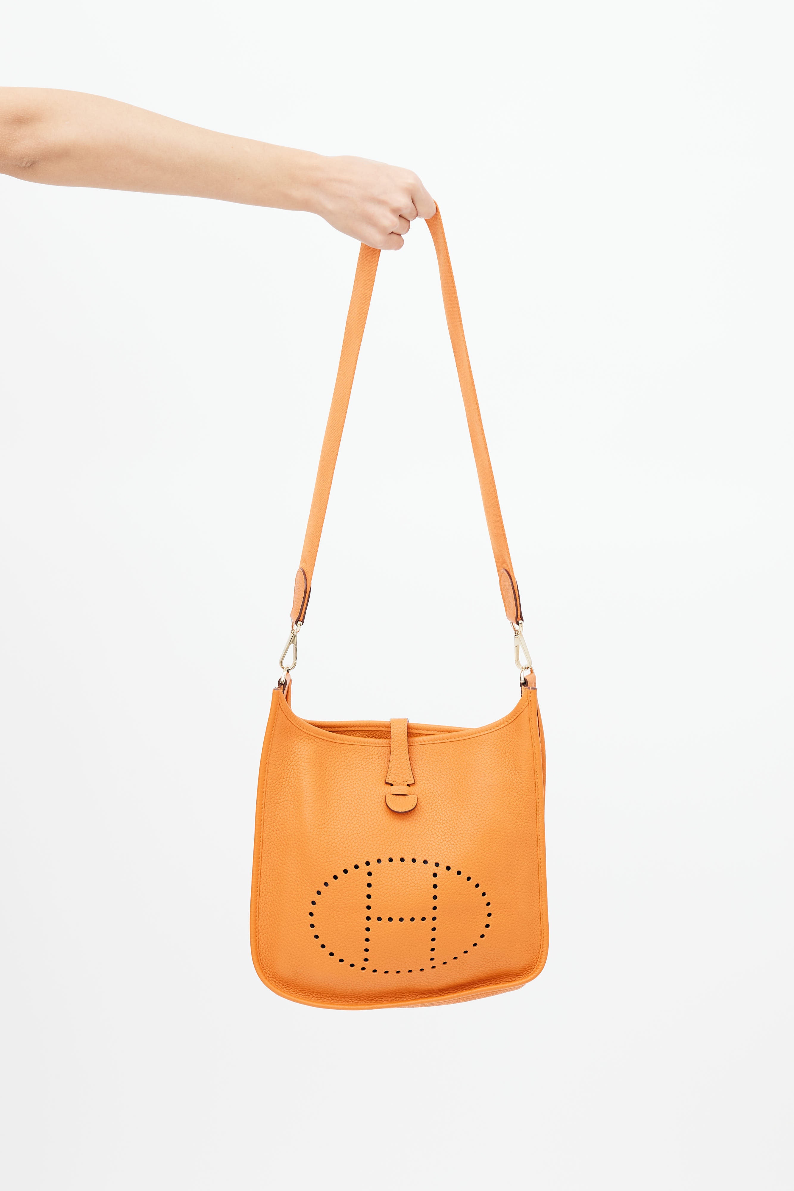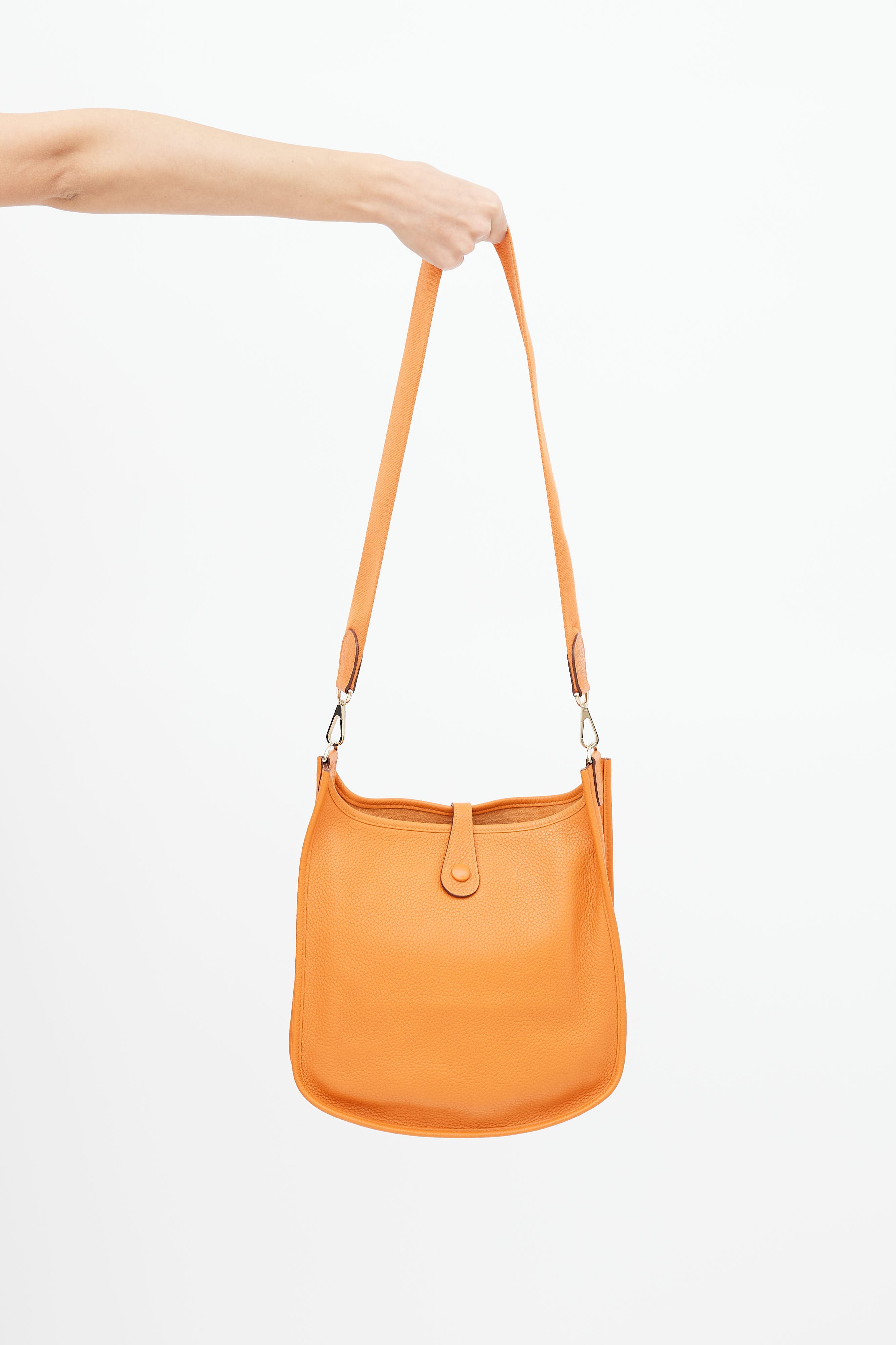Pre-owned Hermès orange Evelyne I PM shoulder bag in Clemence leather featuring a snap button strap closure at top, canvas strap, gold-tone hardware, laser cut logo at front and a suede interior.