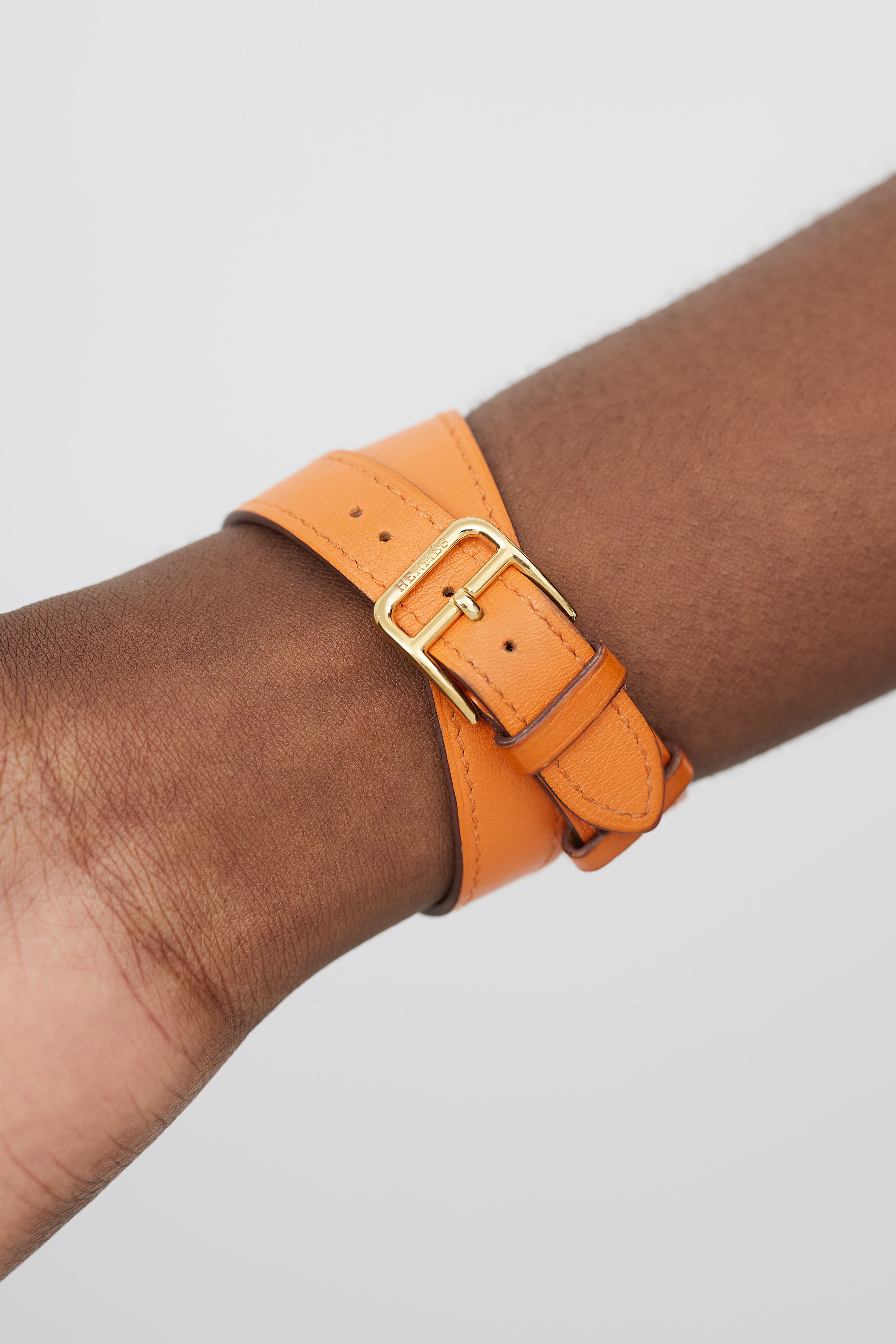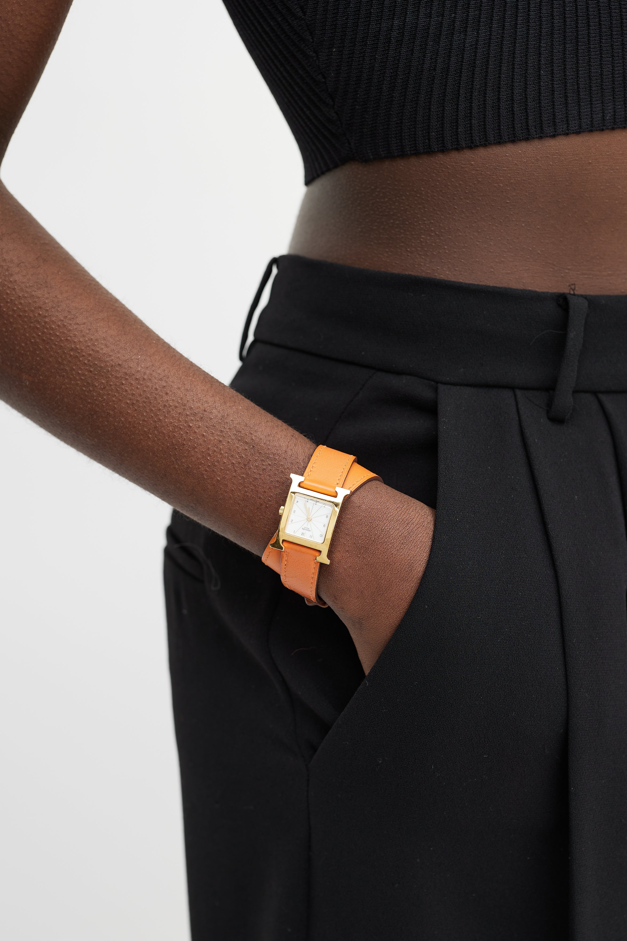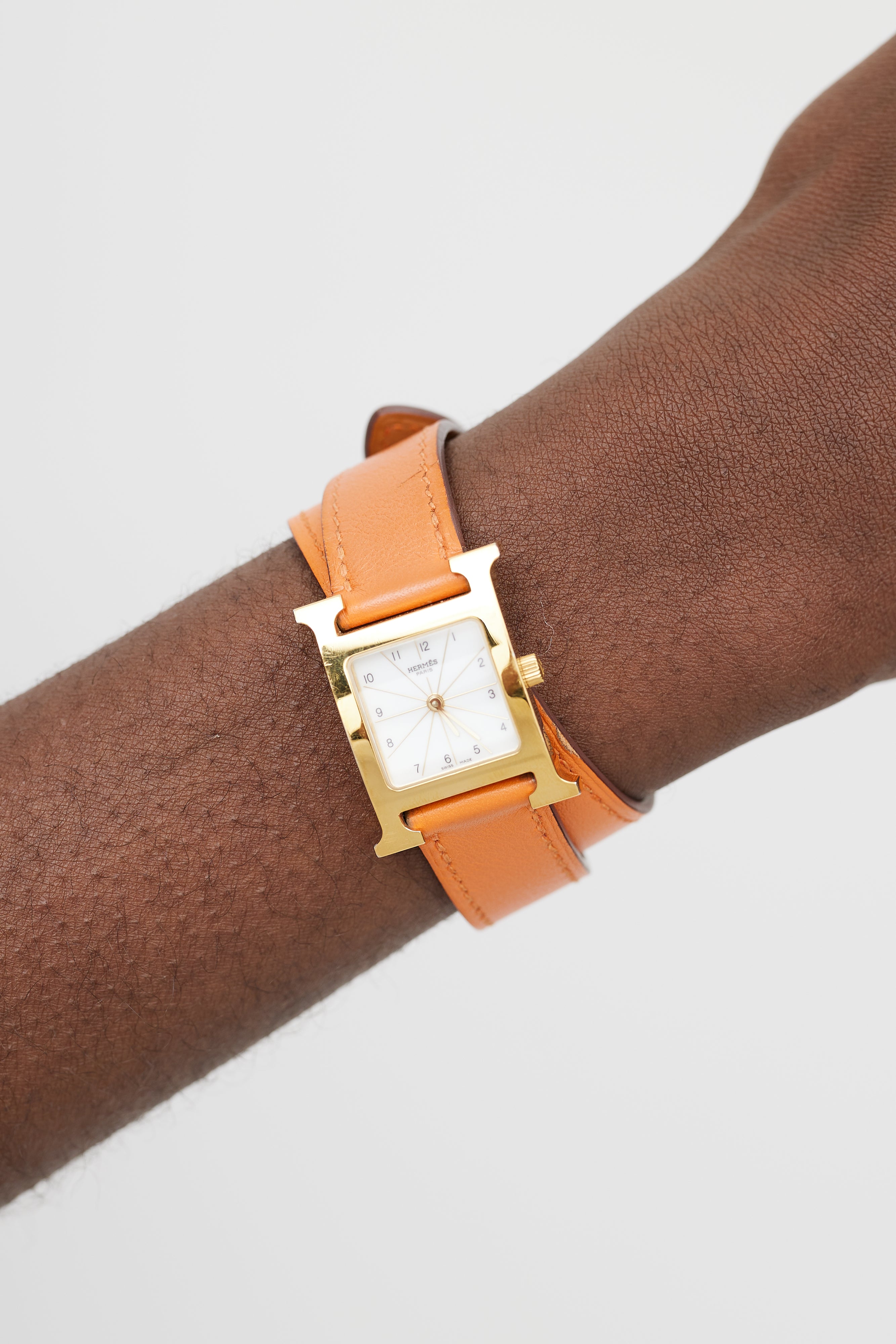 Pre-owned Hermès orange Heure H watch featuring H watch face, gold plated steel hardware, quartz movement, white dial with sunburst motif, interchangeable wrap around strap, and engraved logo at back.