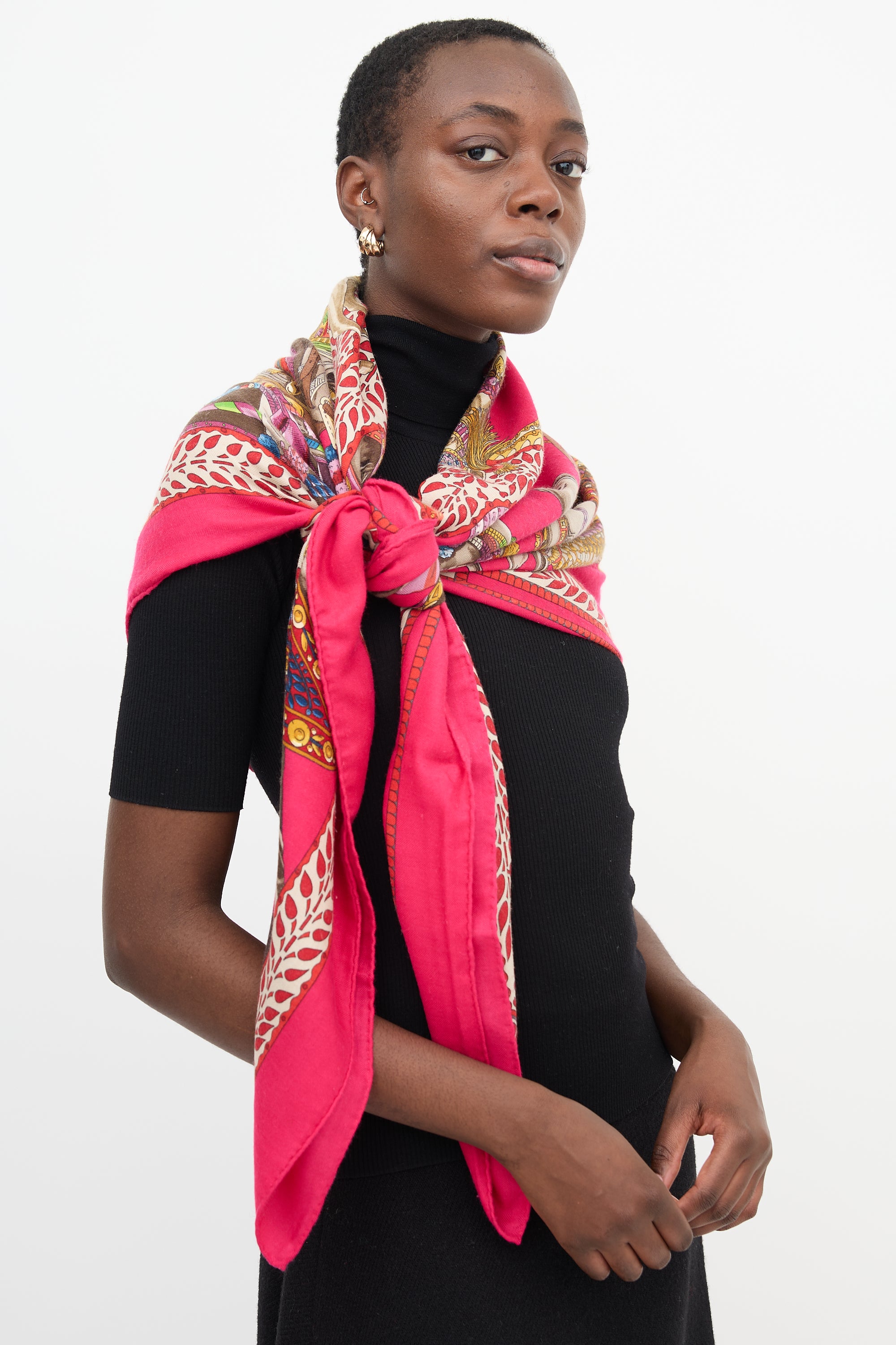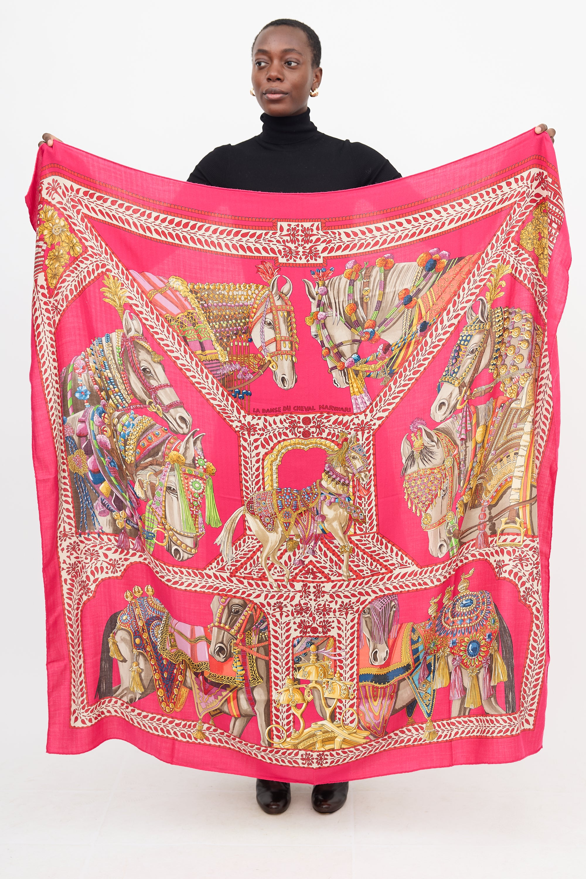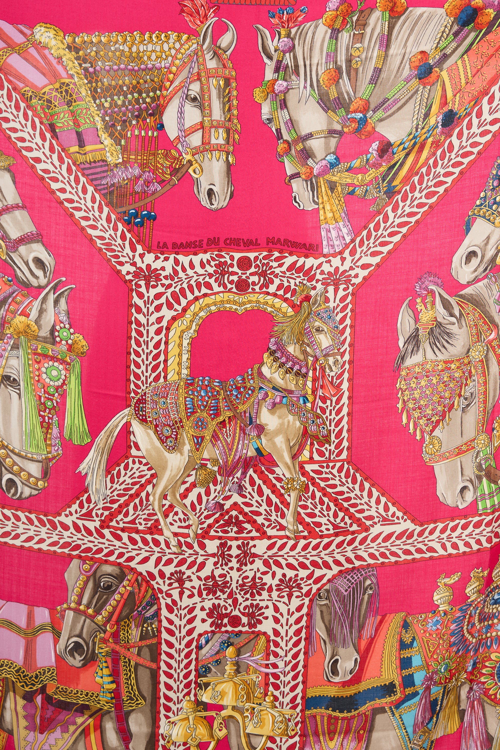 Pre-owned Hermès pink cashmere scarf featuring La Danse Du Cheval Marwari design by Annie Faivre, decorated horse motif, and hand rolled edges.