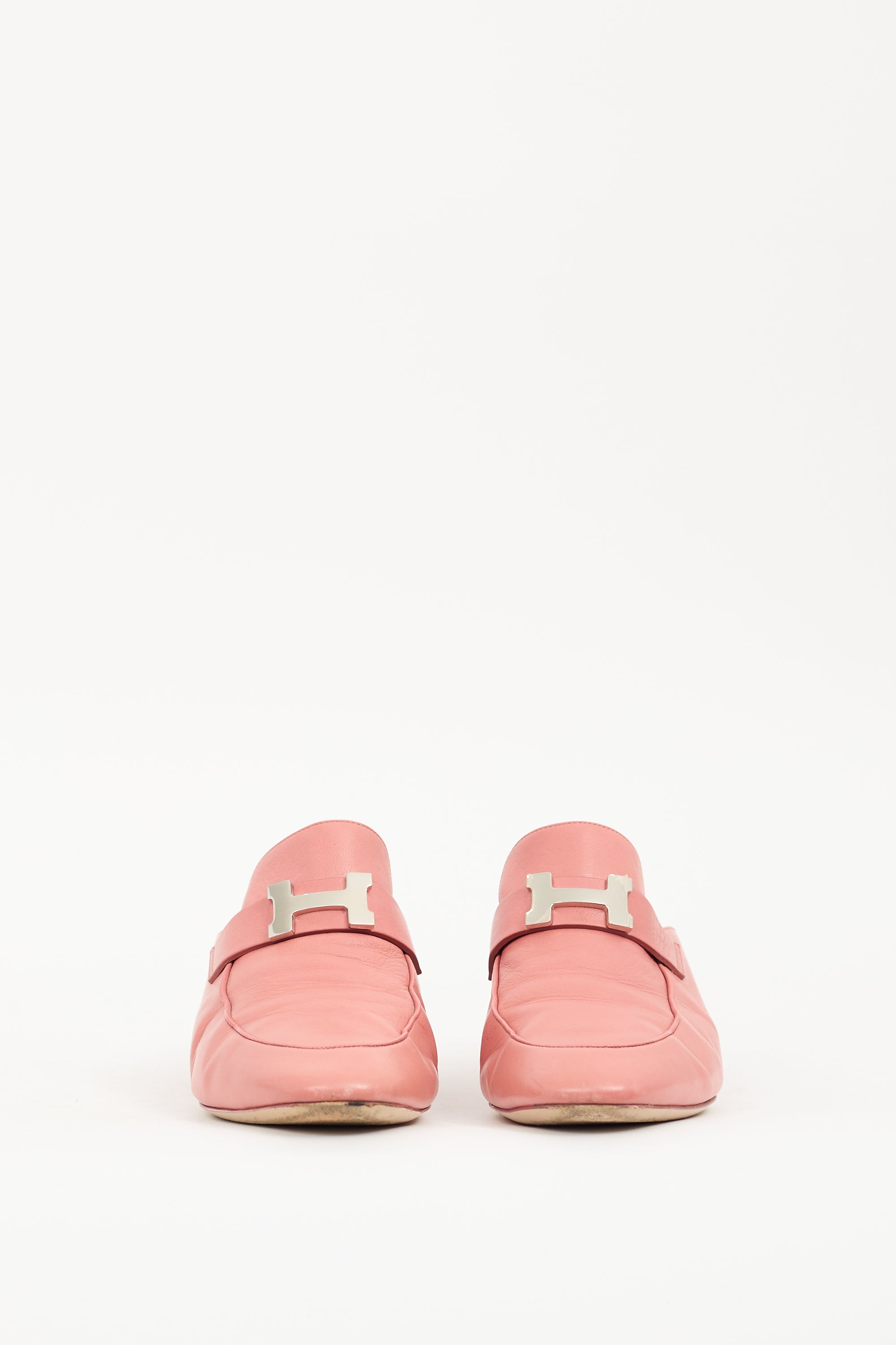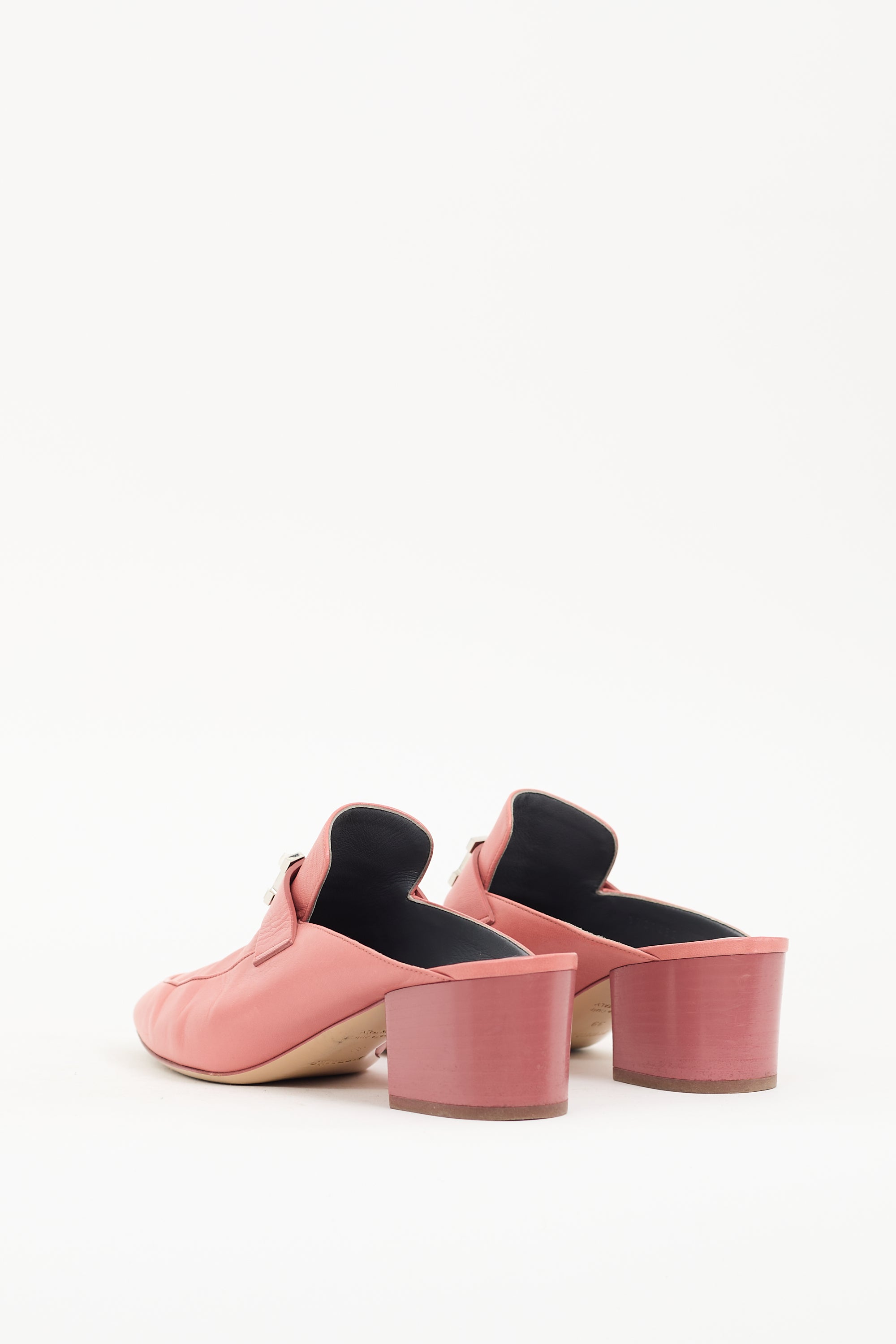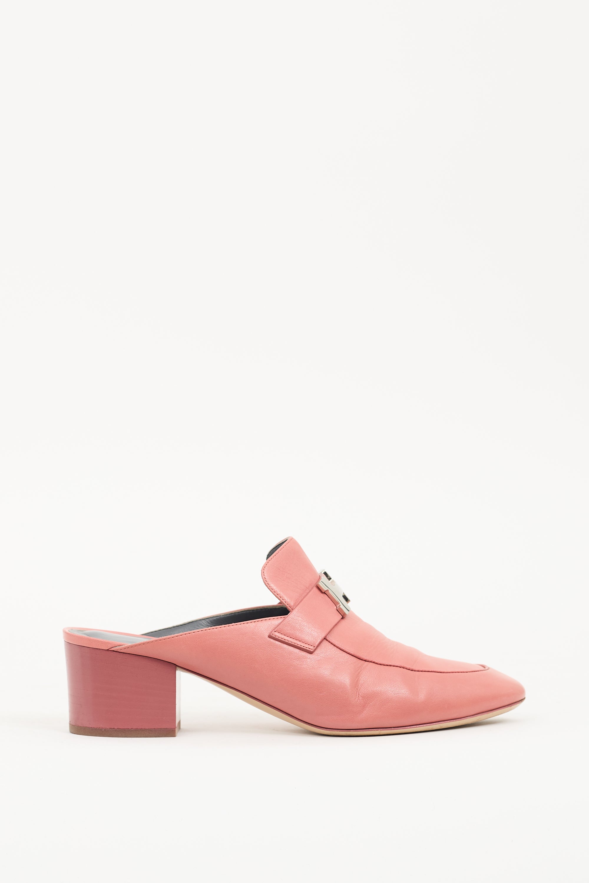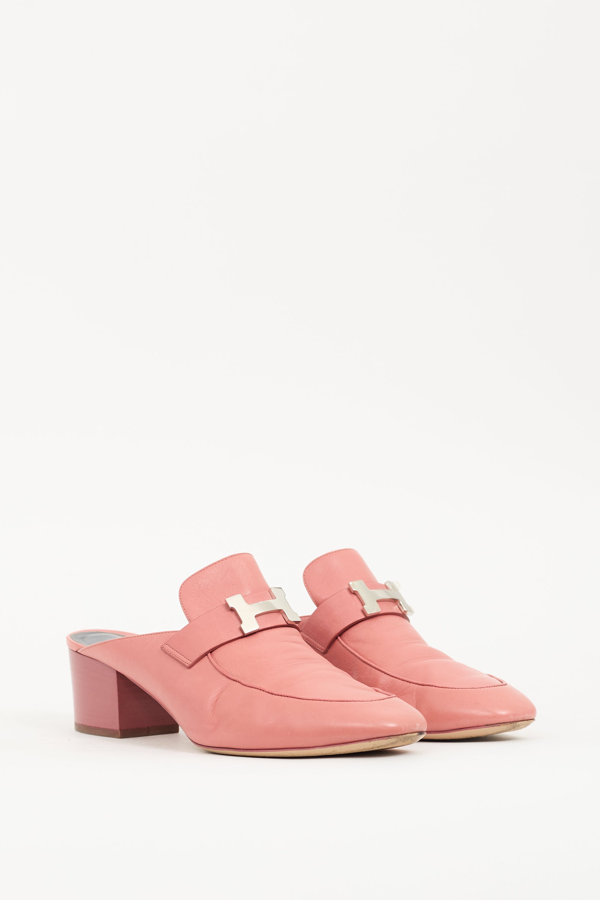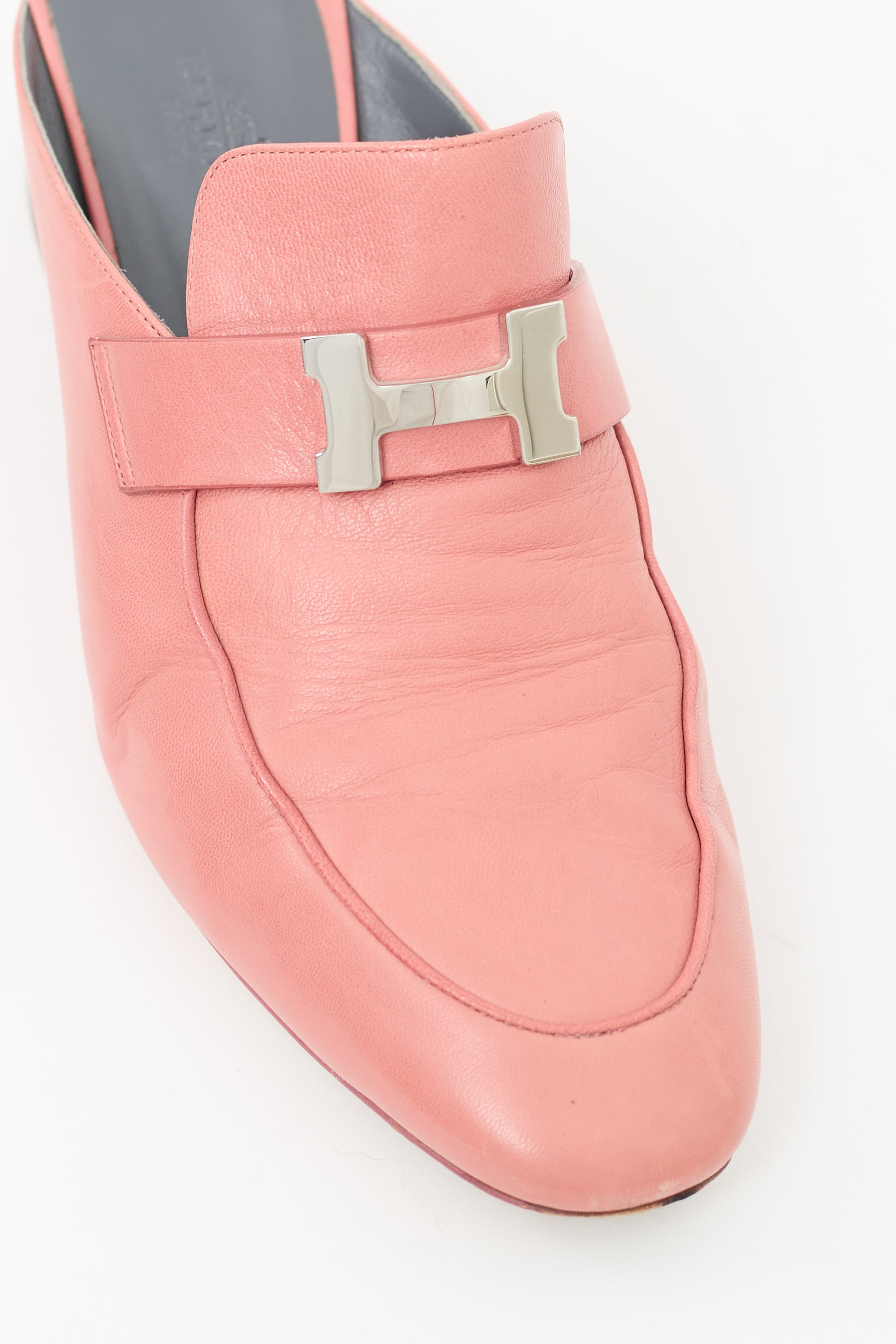 Pre-owned Hermès pink leather Paradis mules featuring almond toe, silver tone hardware detail across vamp, slip on entry, and stacked block heel. Comes with original box.