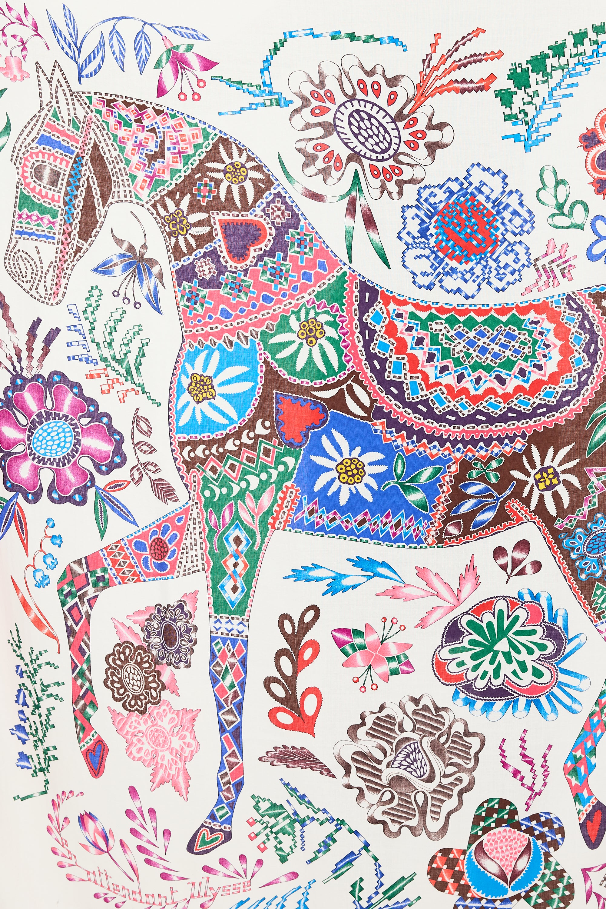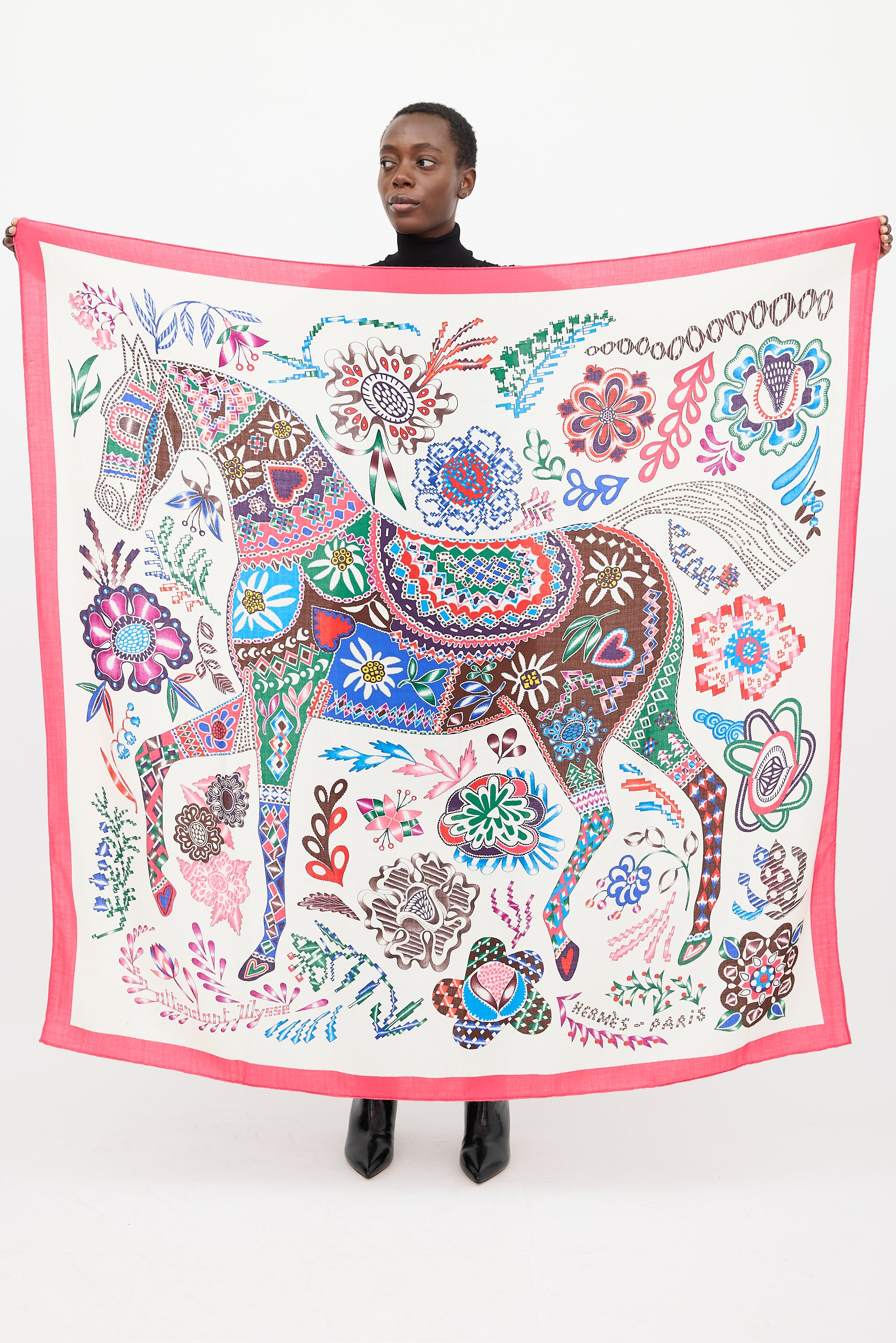 Pre-owned Hermès pink and multicolour cashmere and silk blend shawl featuring En Attendant Ulysse print by Florence Manlik, horse and floral motif, and hand rolled edges. Comes with original box.