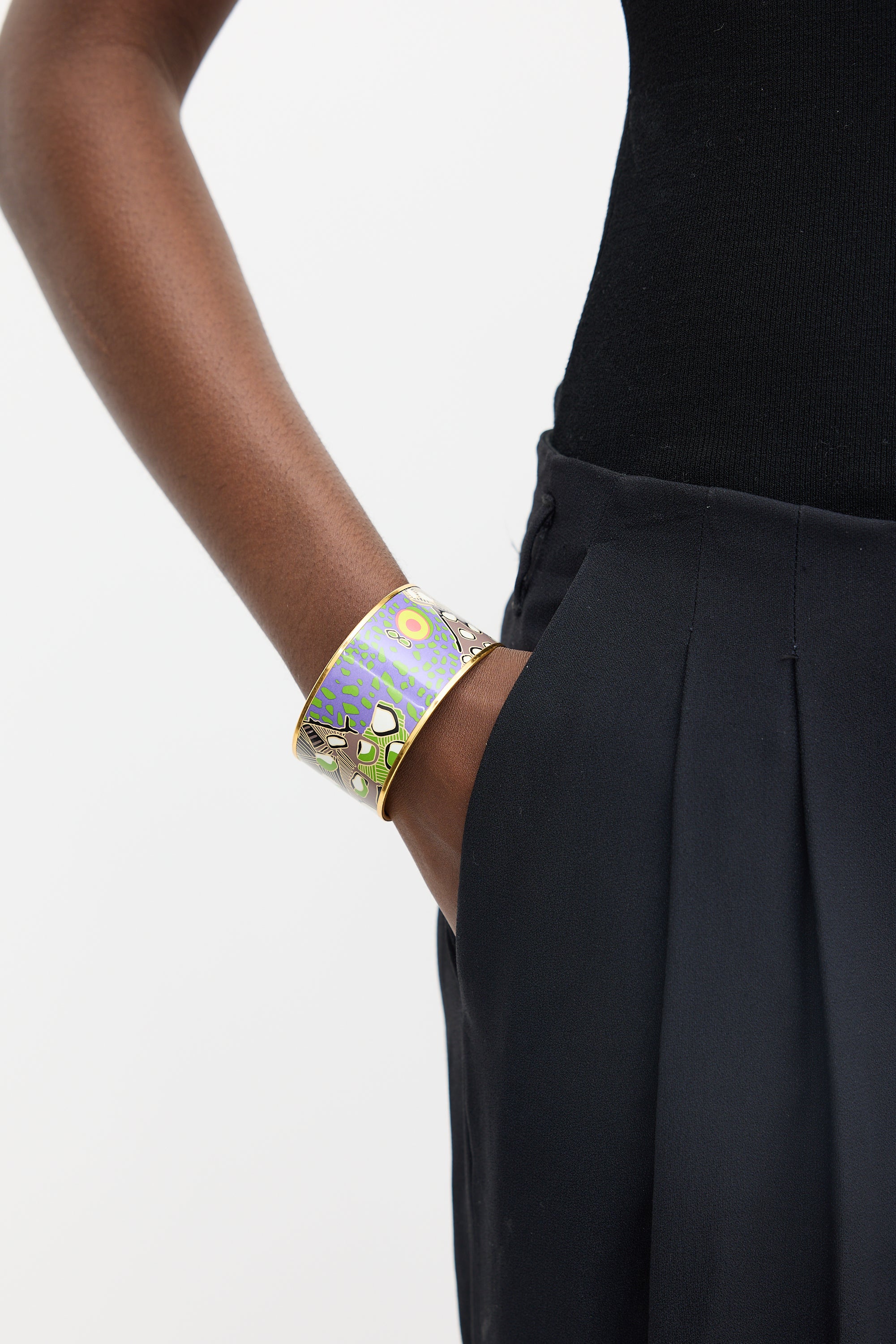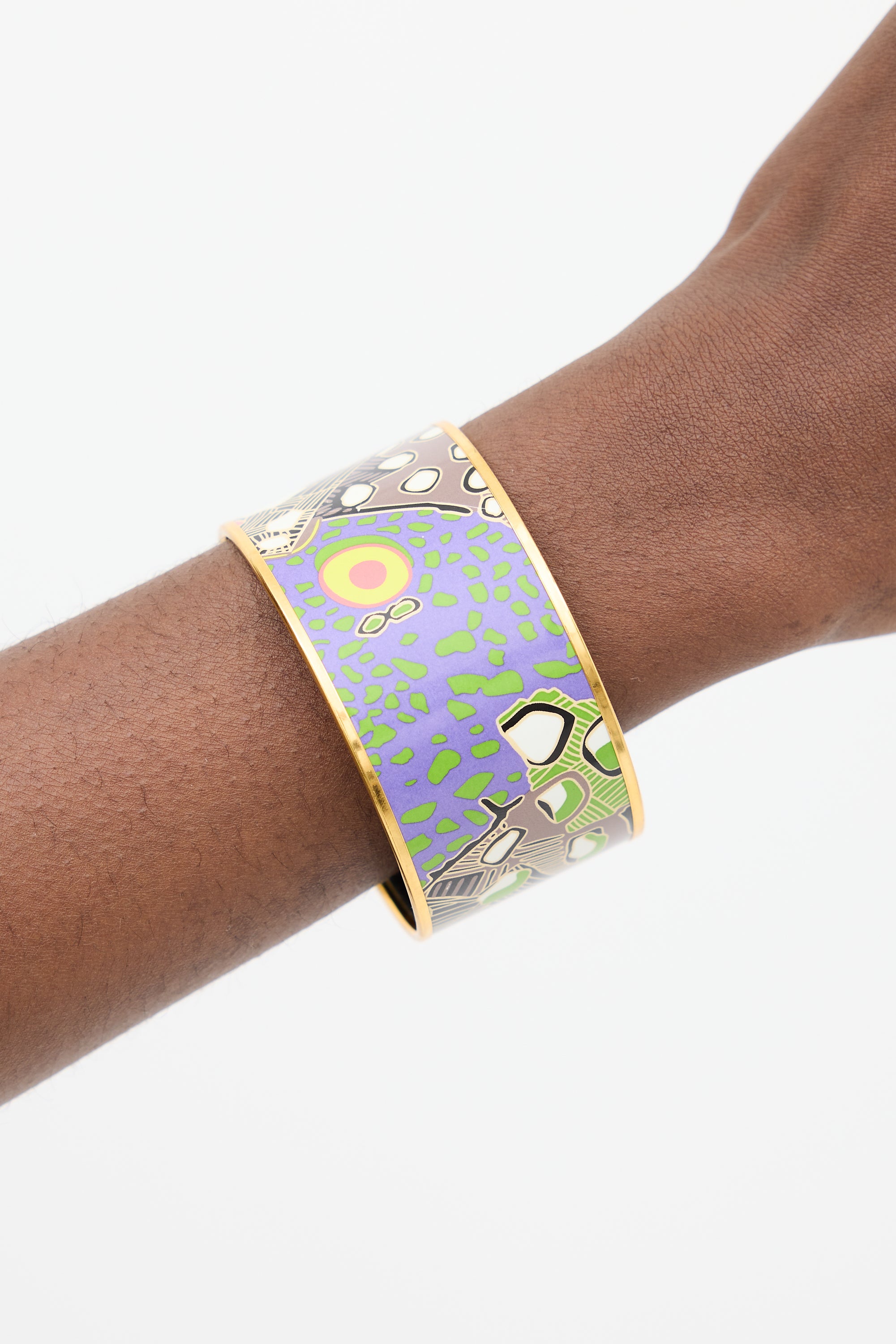Pre-owned Hermès purple and multicolour Extra Wide bangle bracelet featuring mixed print enamel inlay, gold plated gilded edge, and inner gold tone logo stamp. Stamped with designer signature, "Made in France", and "N."