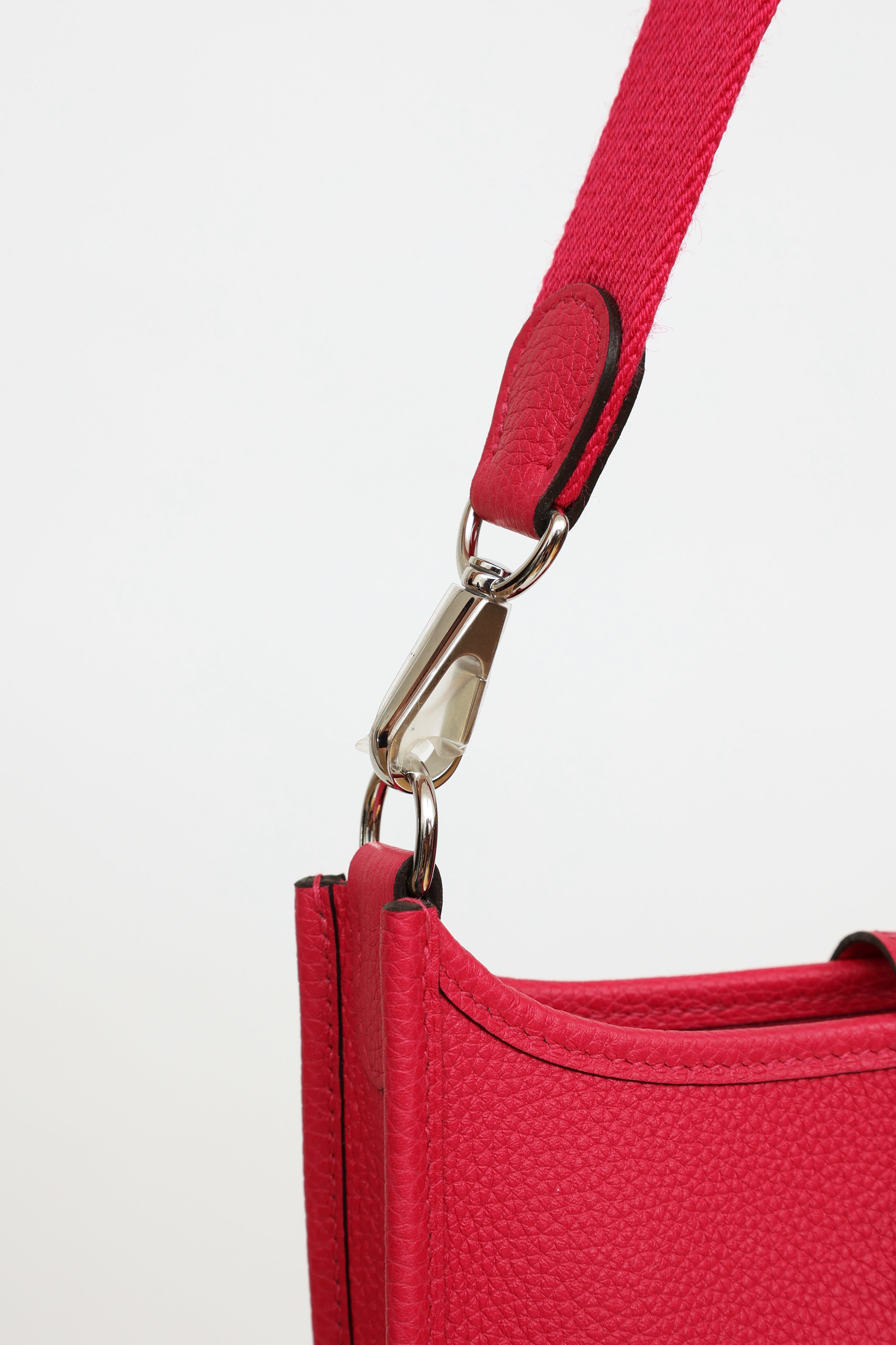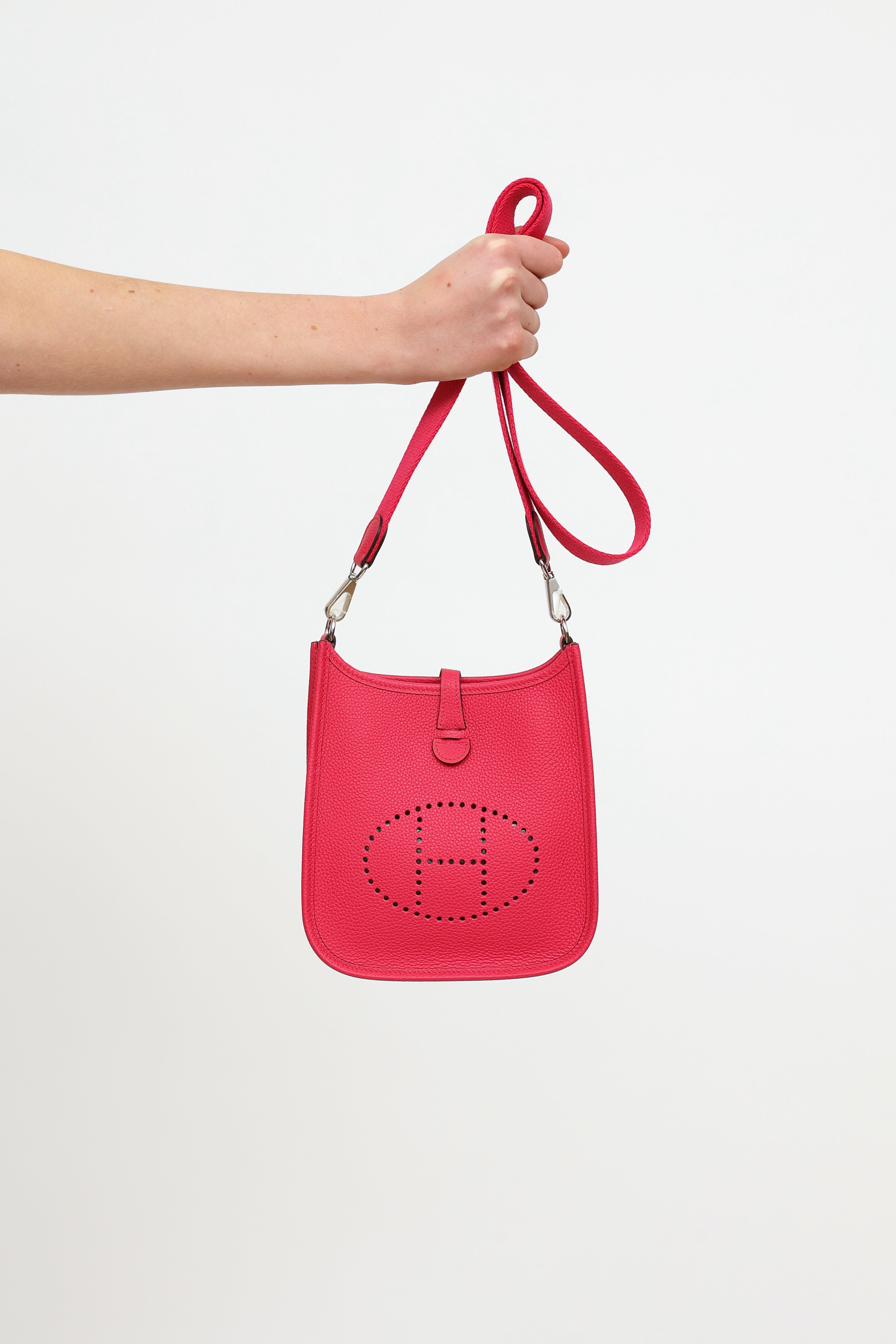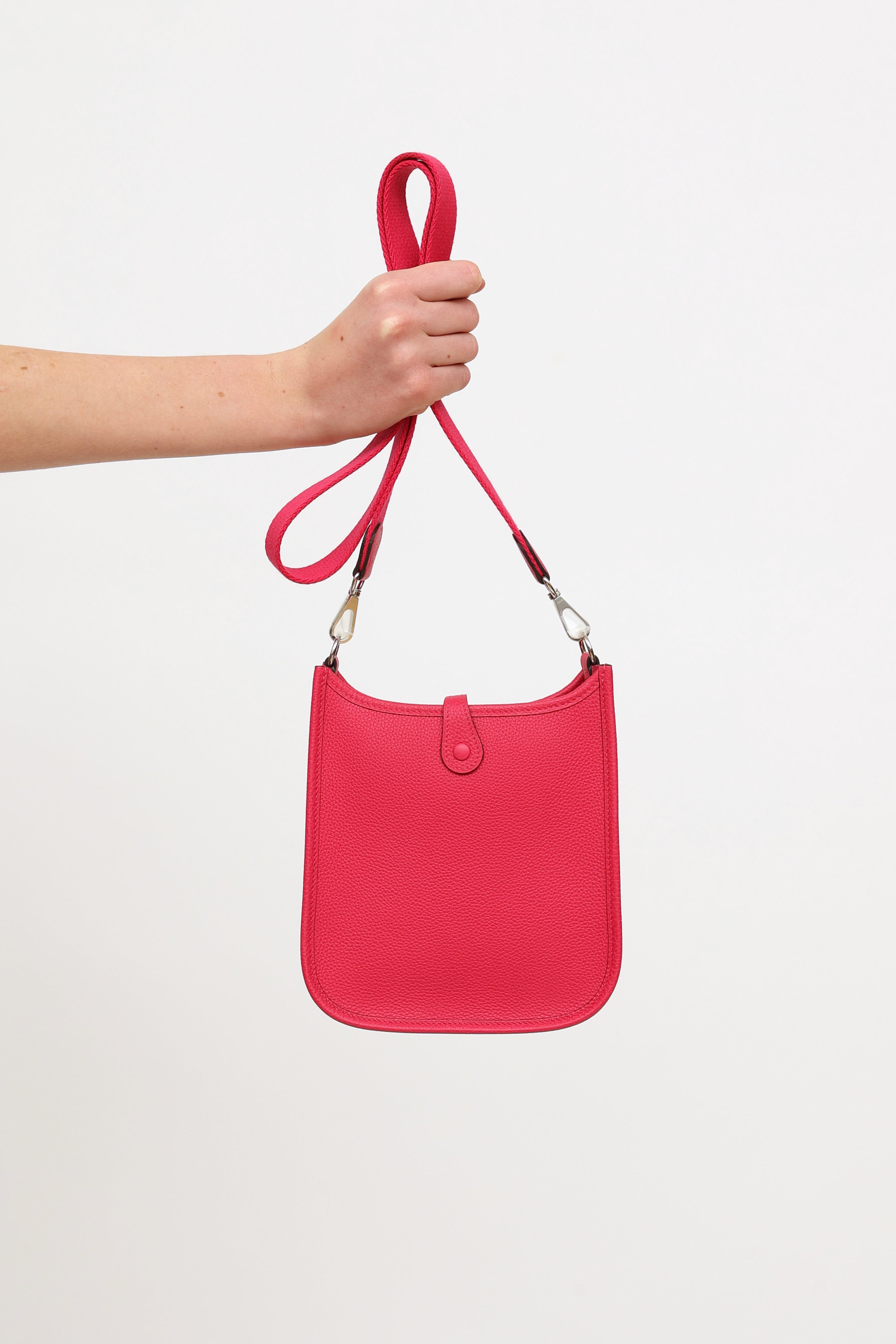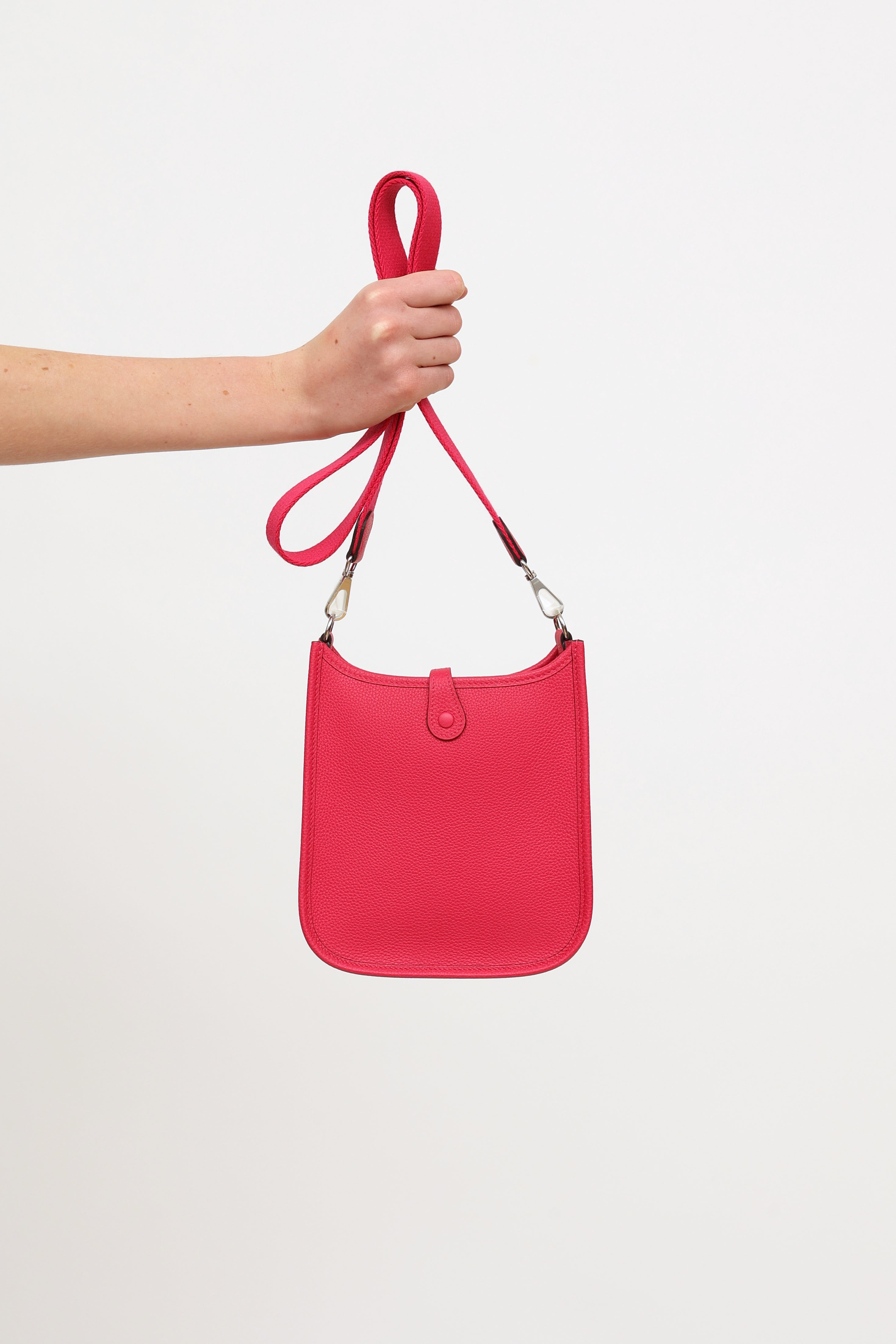 Pre-owned Hermès Rose Mexico Mini Evelyne 16 Amazone crossbody bag featuring fuchsia Clemence leather, palladium hardware, perforated H at front, single strap closure with snap button, detachable tonal canvas shoulder strap and one main compartment with tonal suede interior.