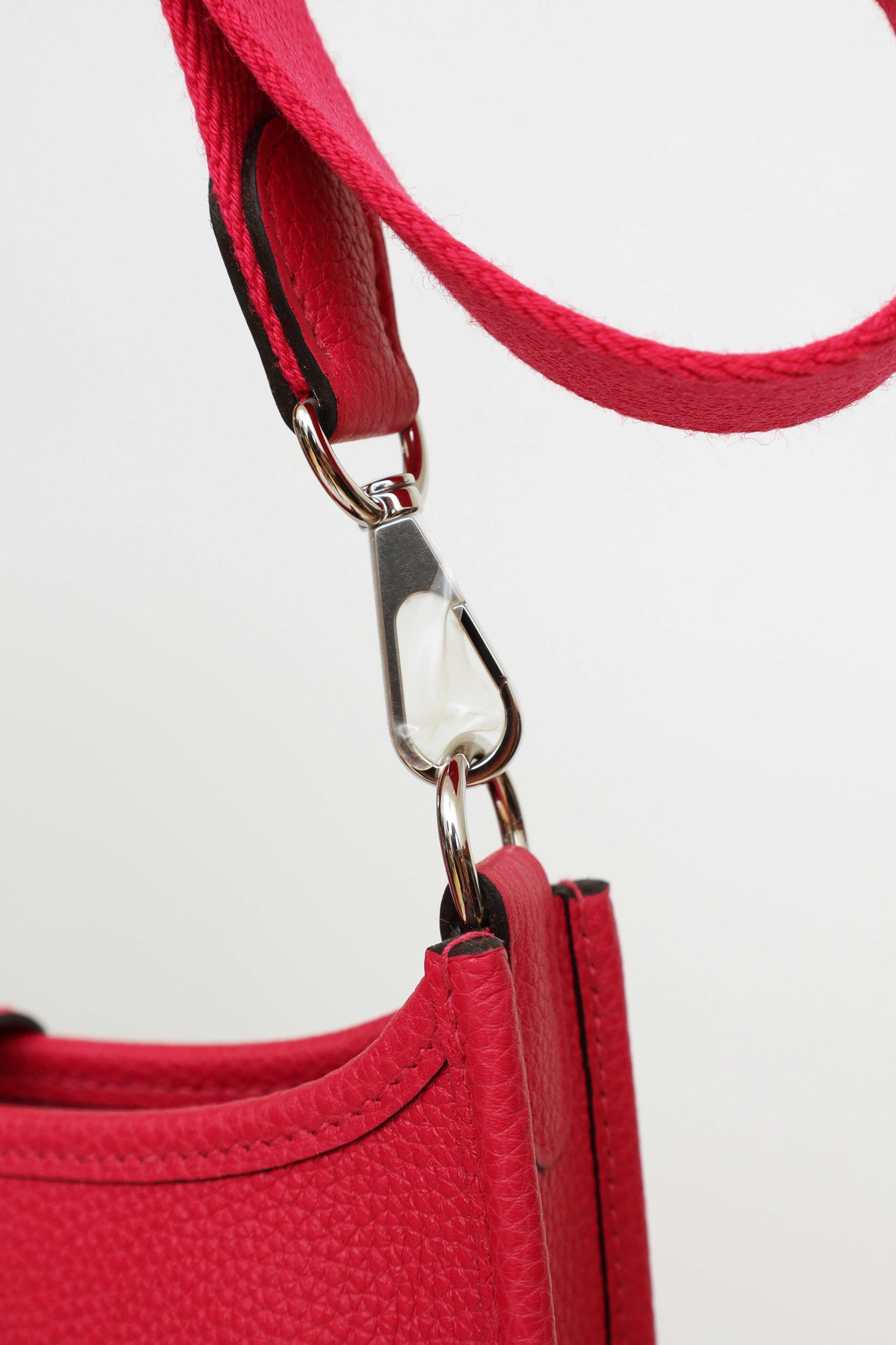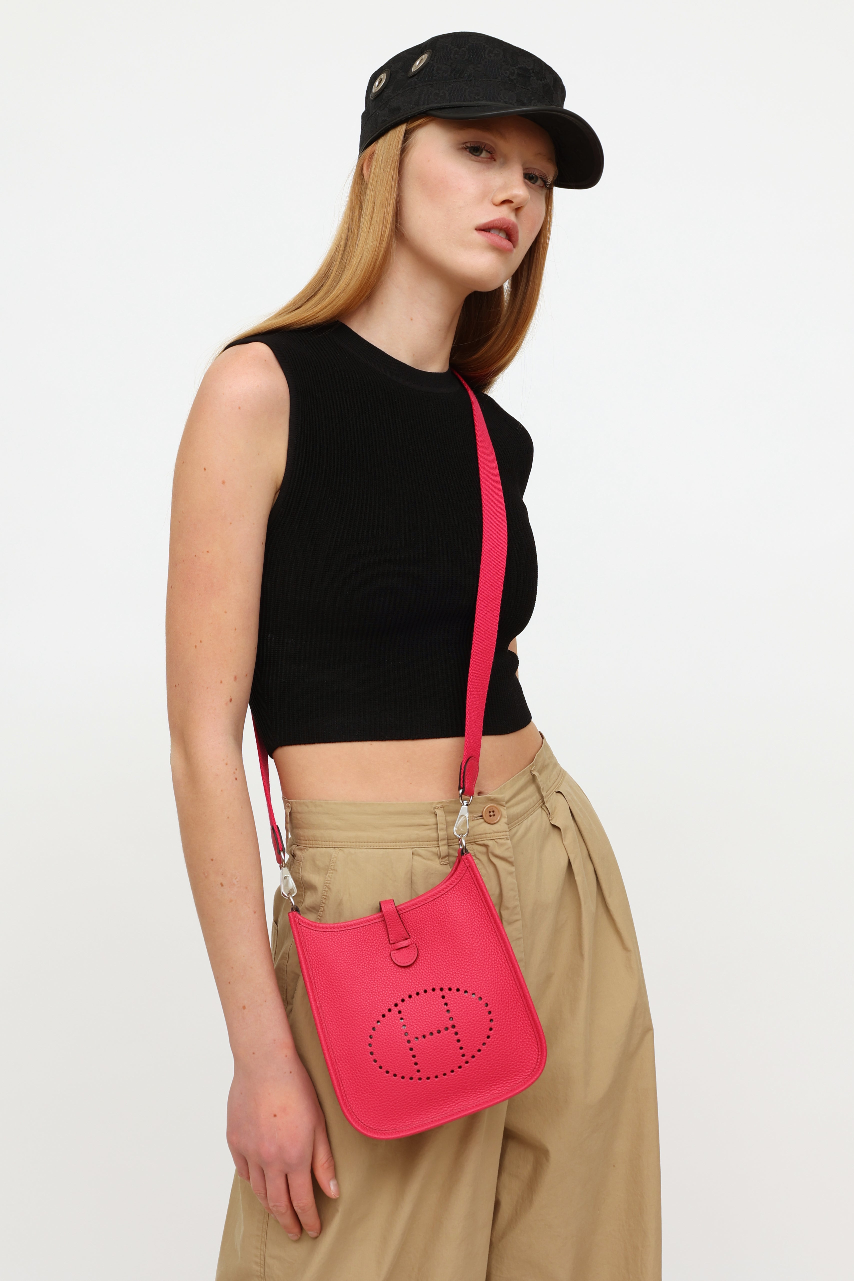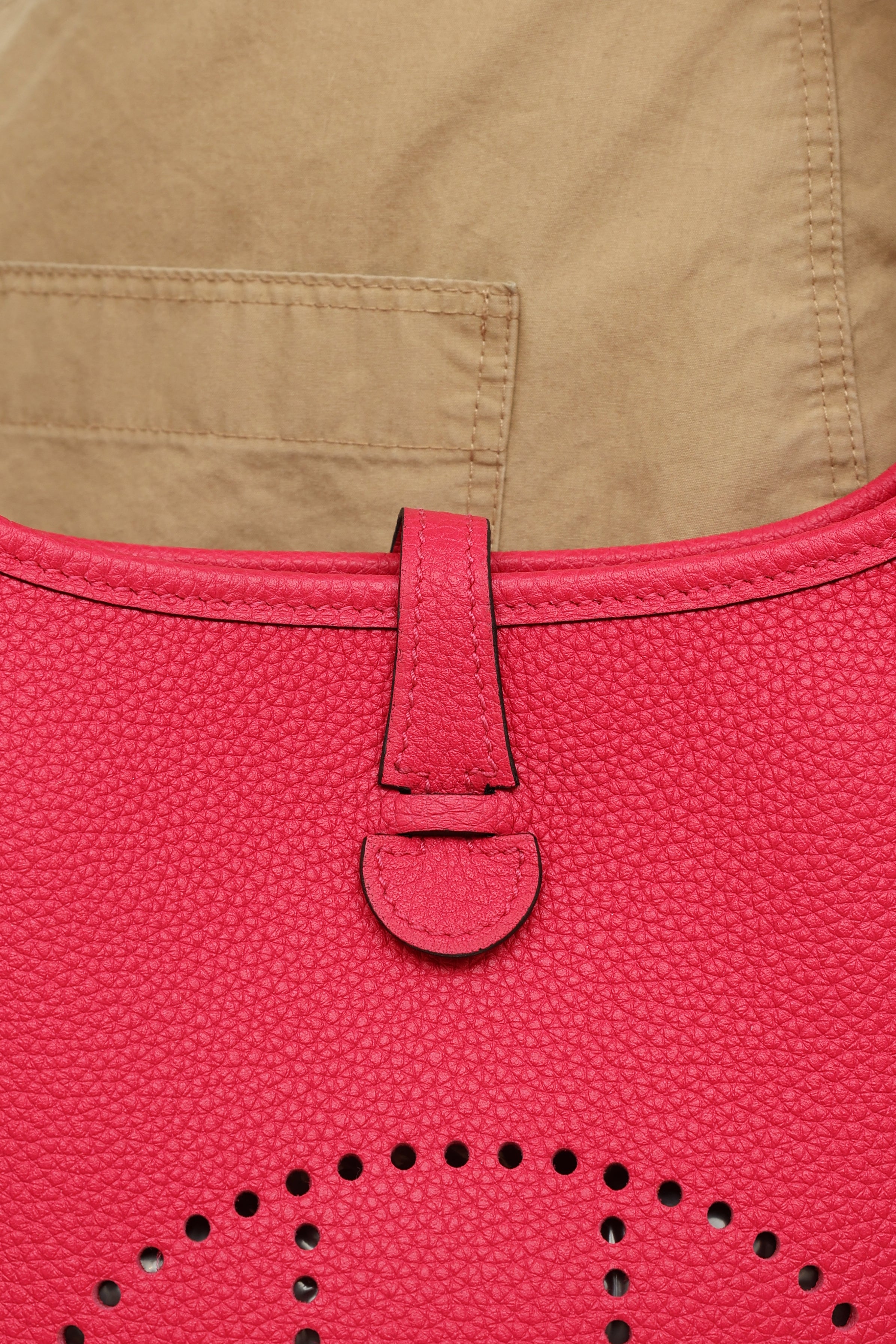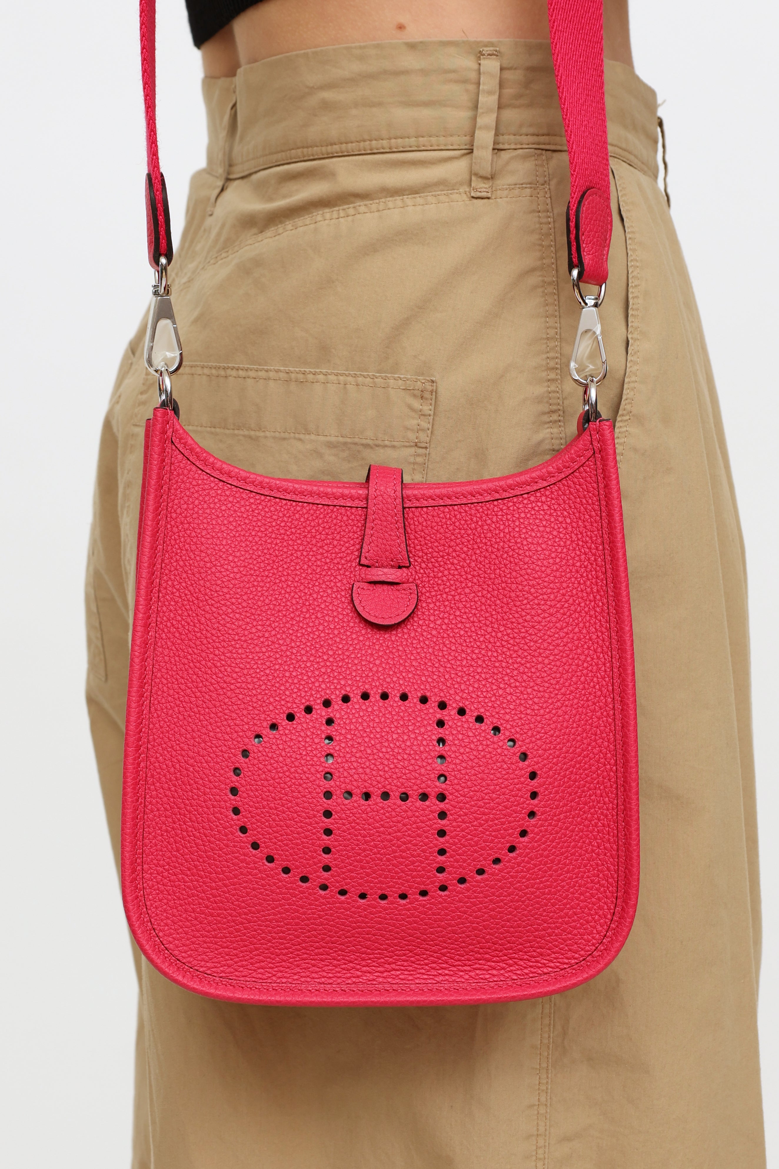 Pre-owned Hermès Rose Mexico Mini Evelyne 16 Amazone crossbody bag featuring fuchsia Clemence leather, palladium hardware, perforated H at front, single strap closure with snap button, detachable tonal canvas shoulder strap and one main compartment with tonal suede interior.