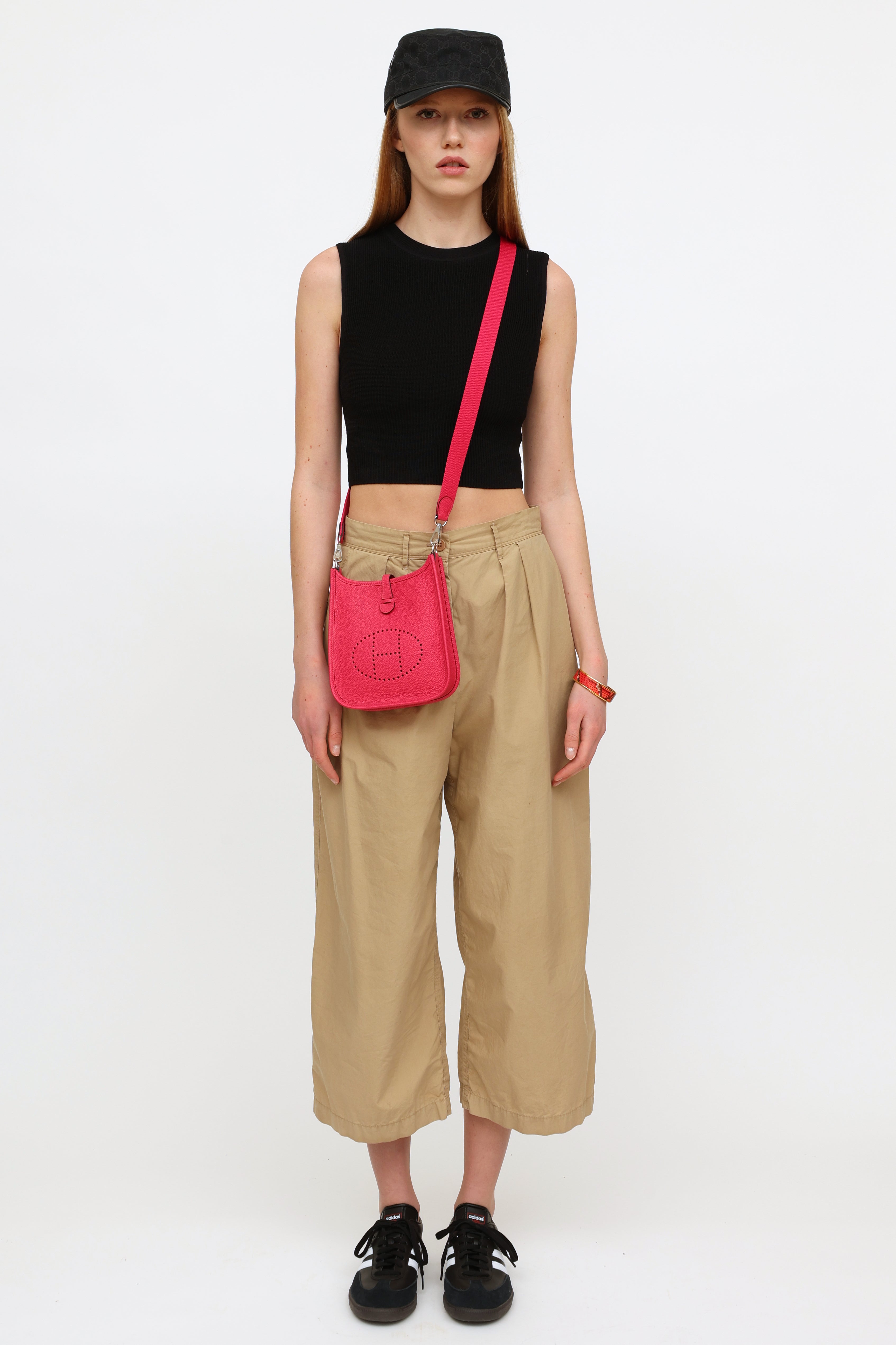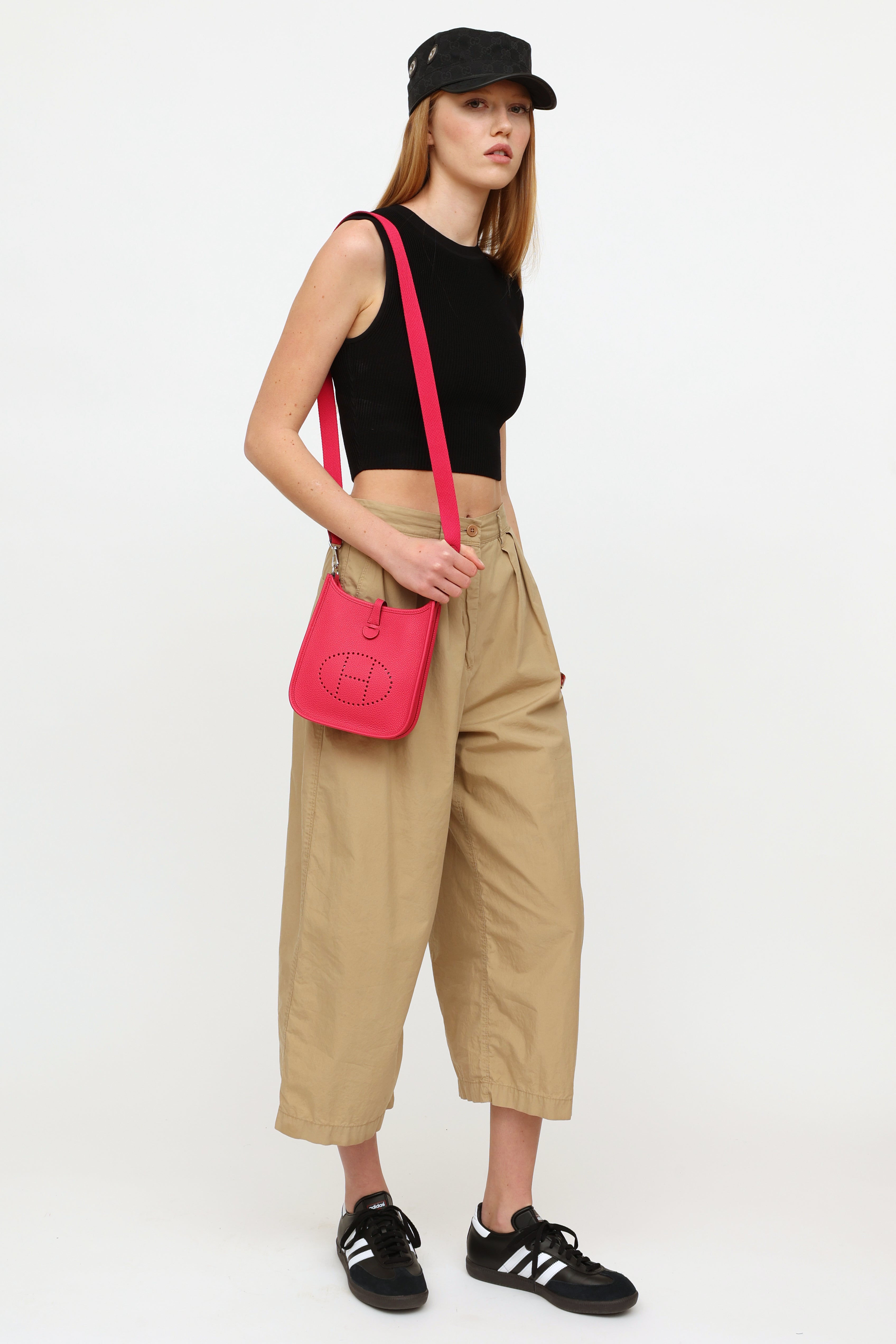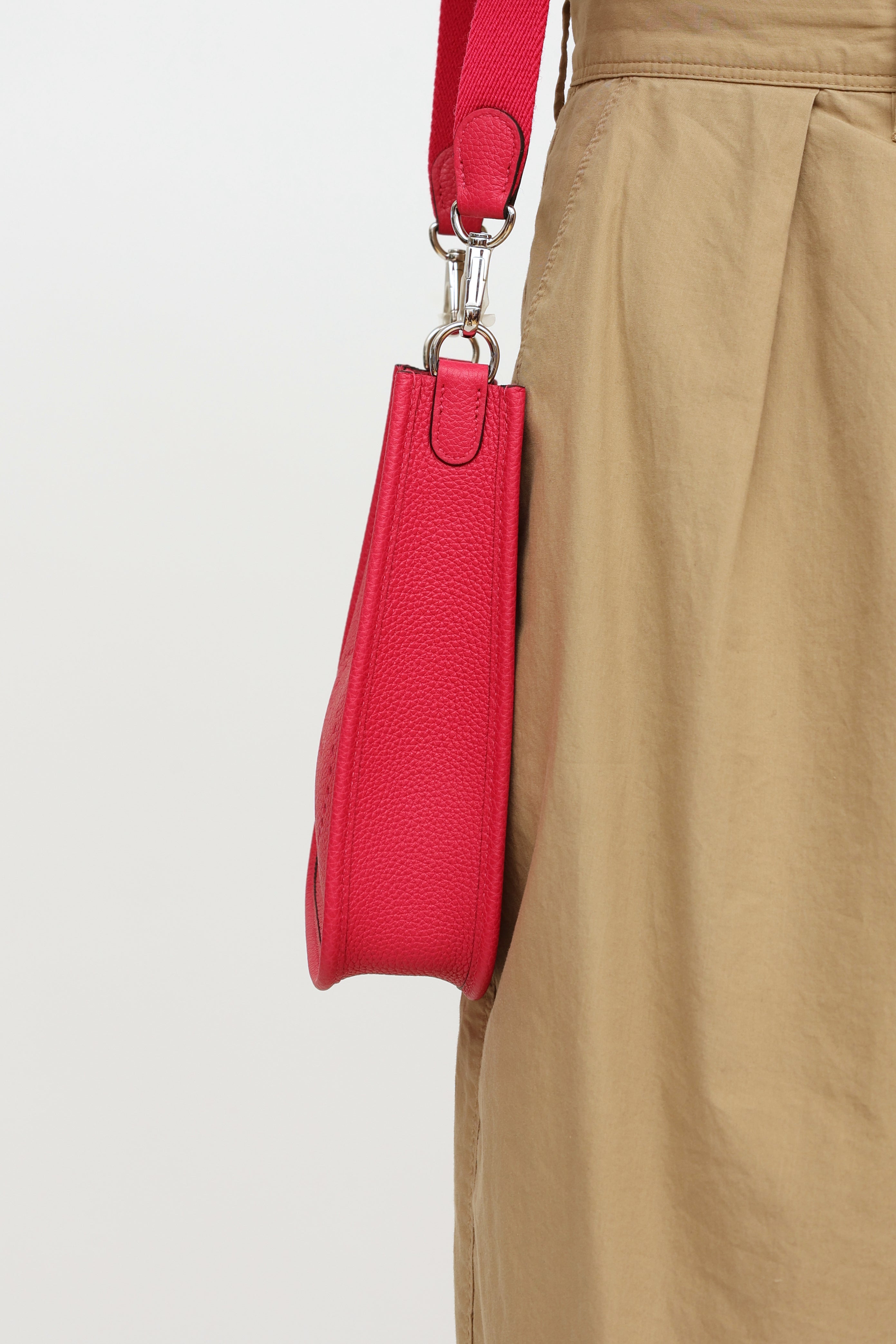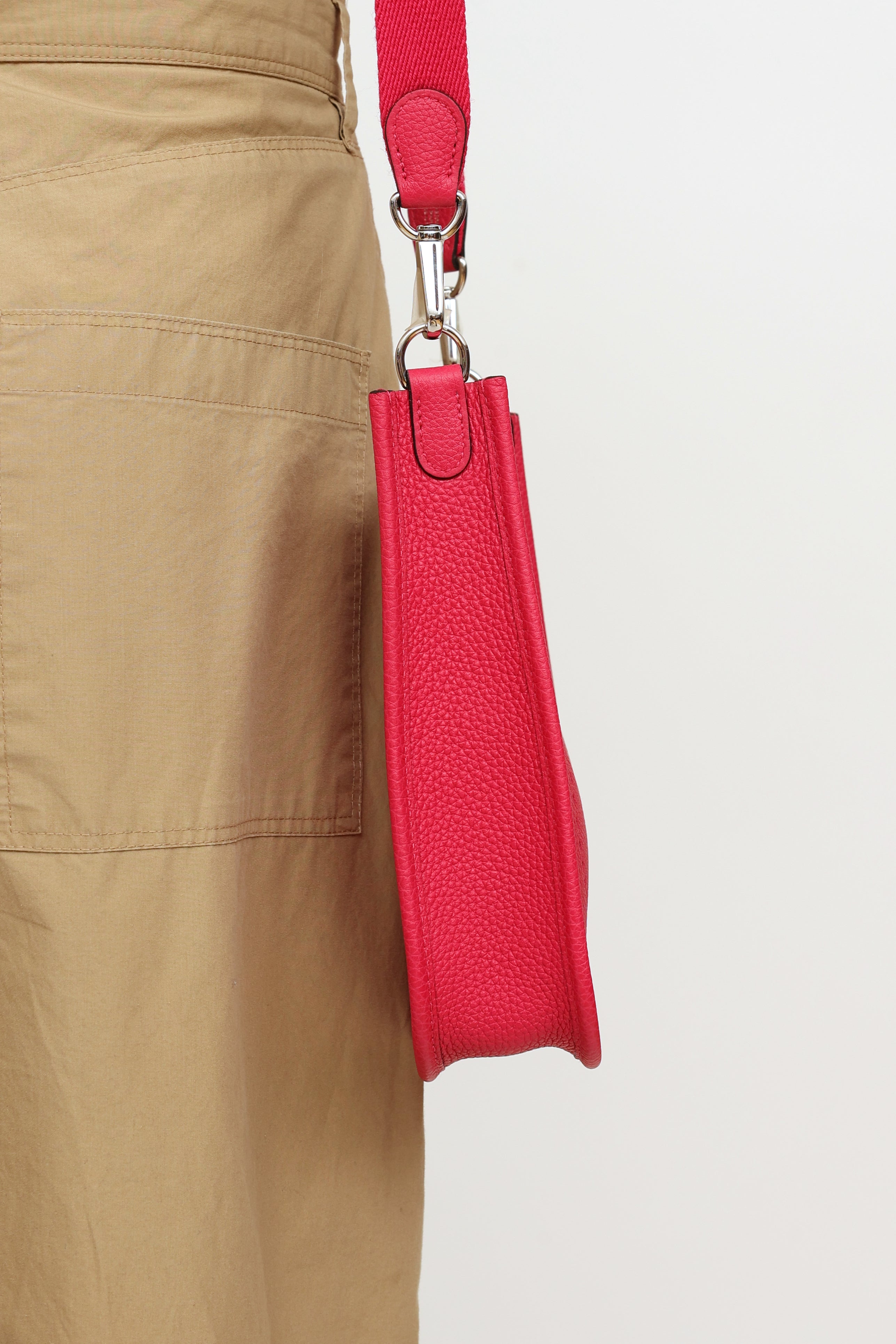 Pre-owned Hermès Rose Mexico Mini Evelyne 16 Amazone crossbody bag featuring fuchsia Clemence leather, palladium hardware, perforated H at front, single strap closure with snap button, detachable tonal canvas shoulder strap and one main compartment with tonal suede interior.