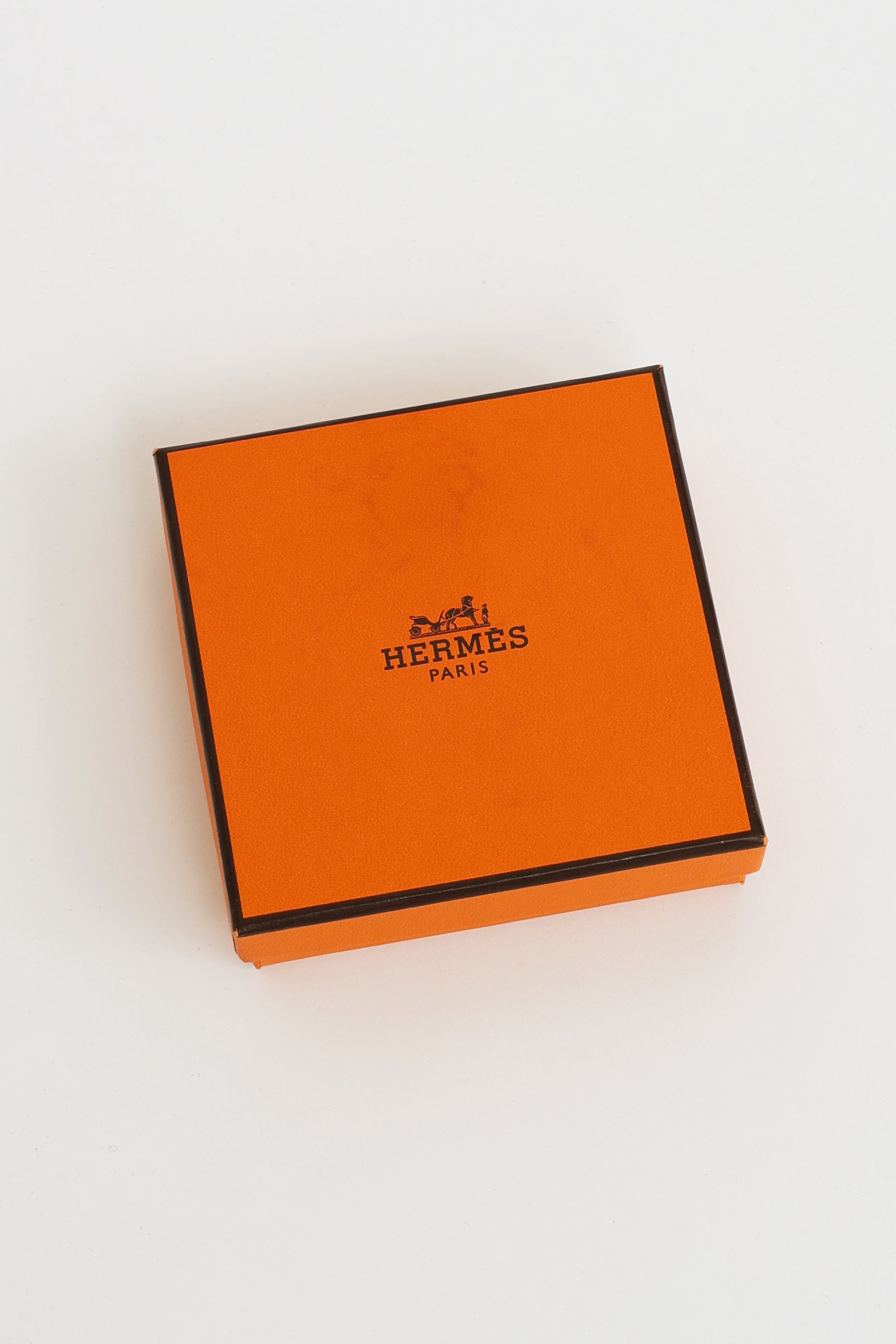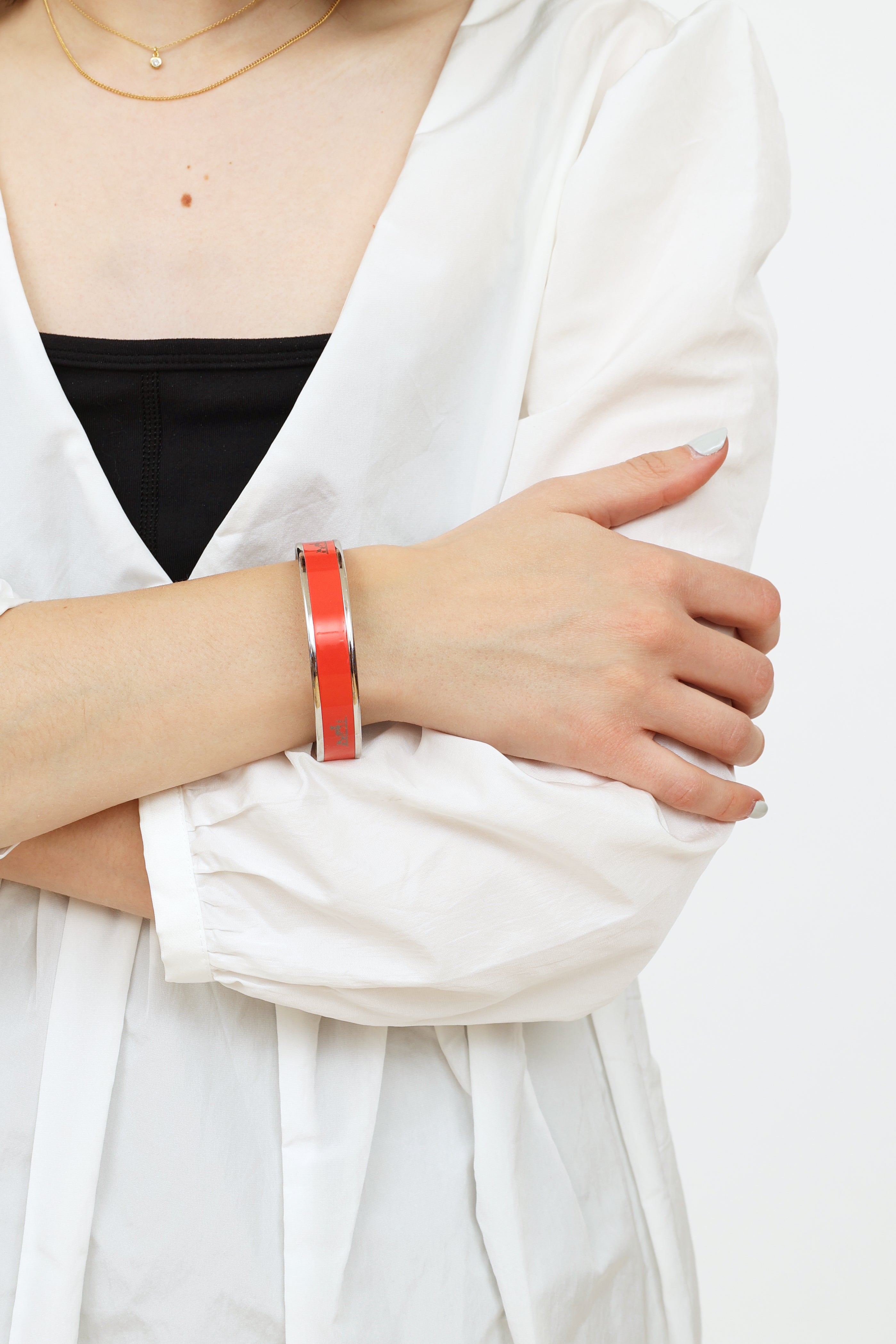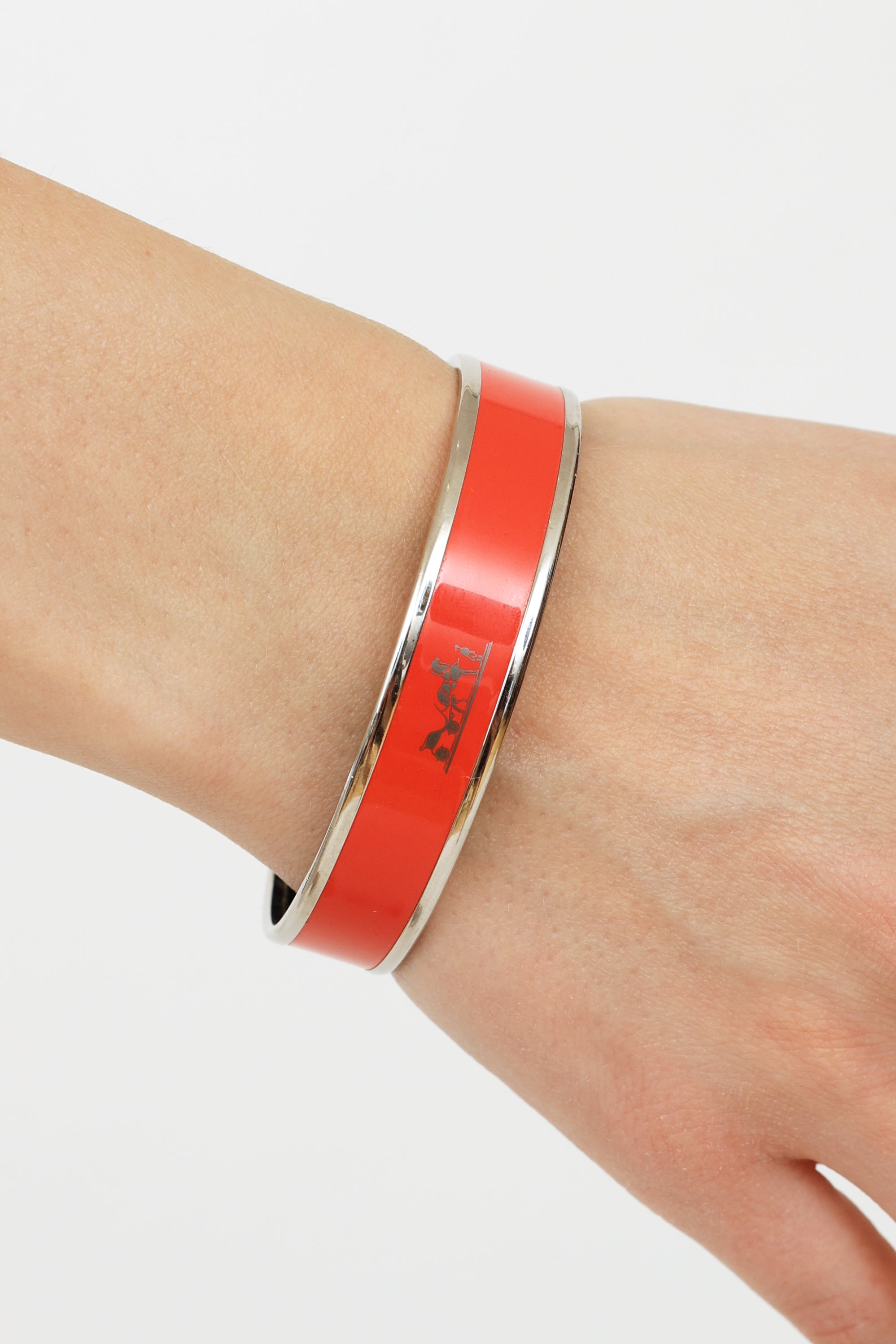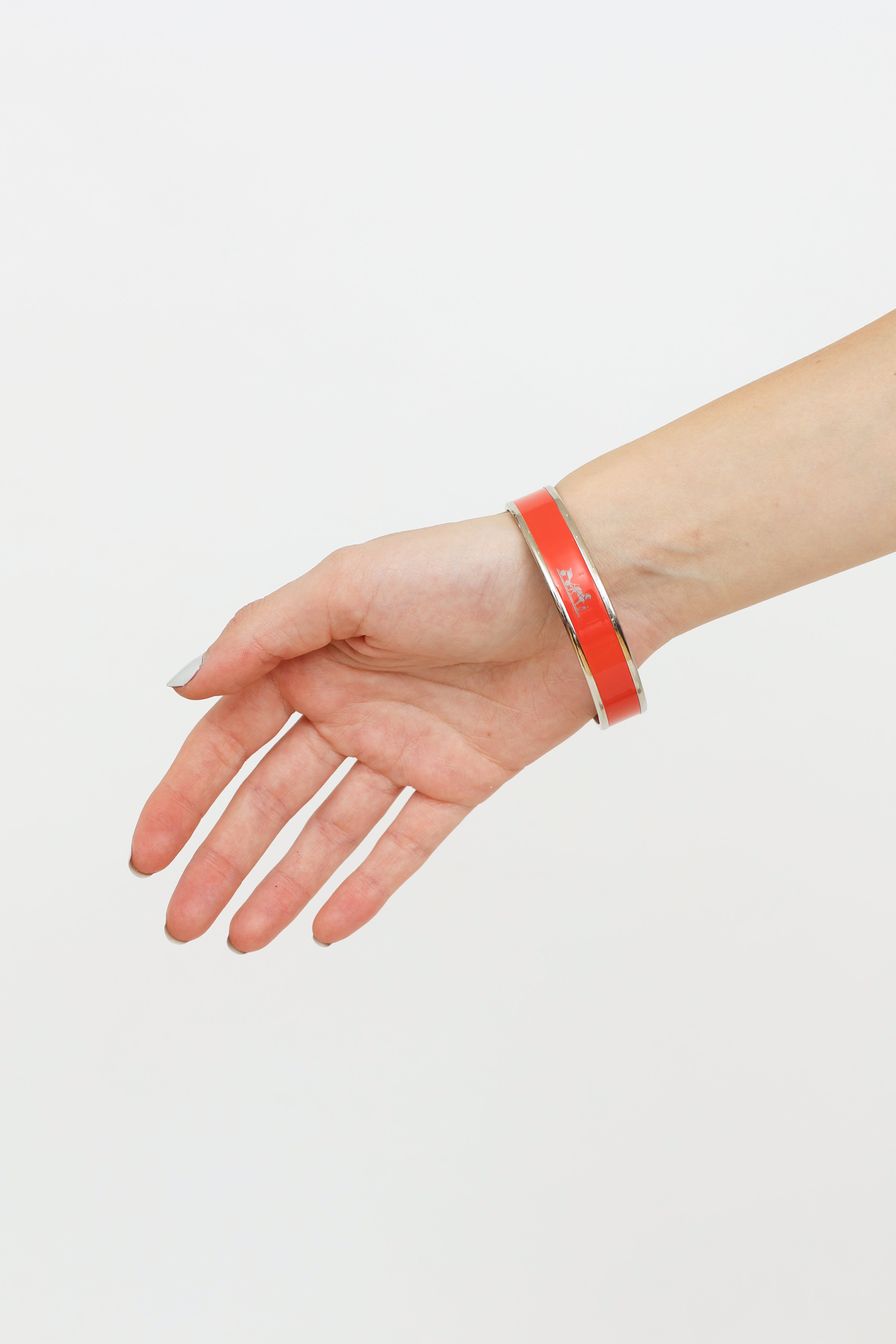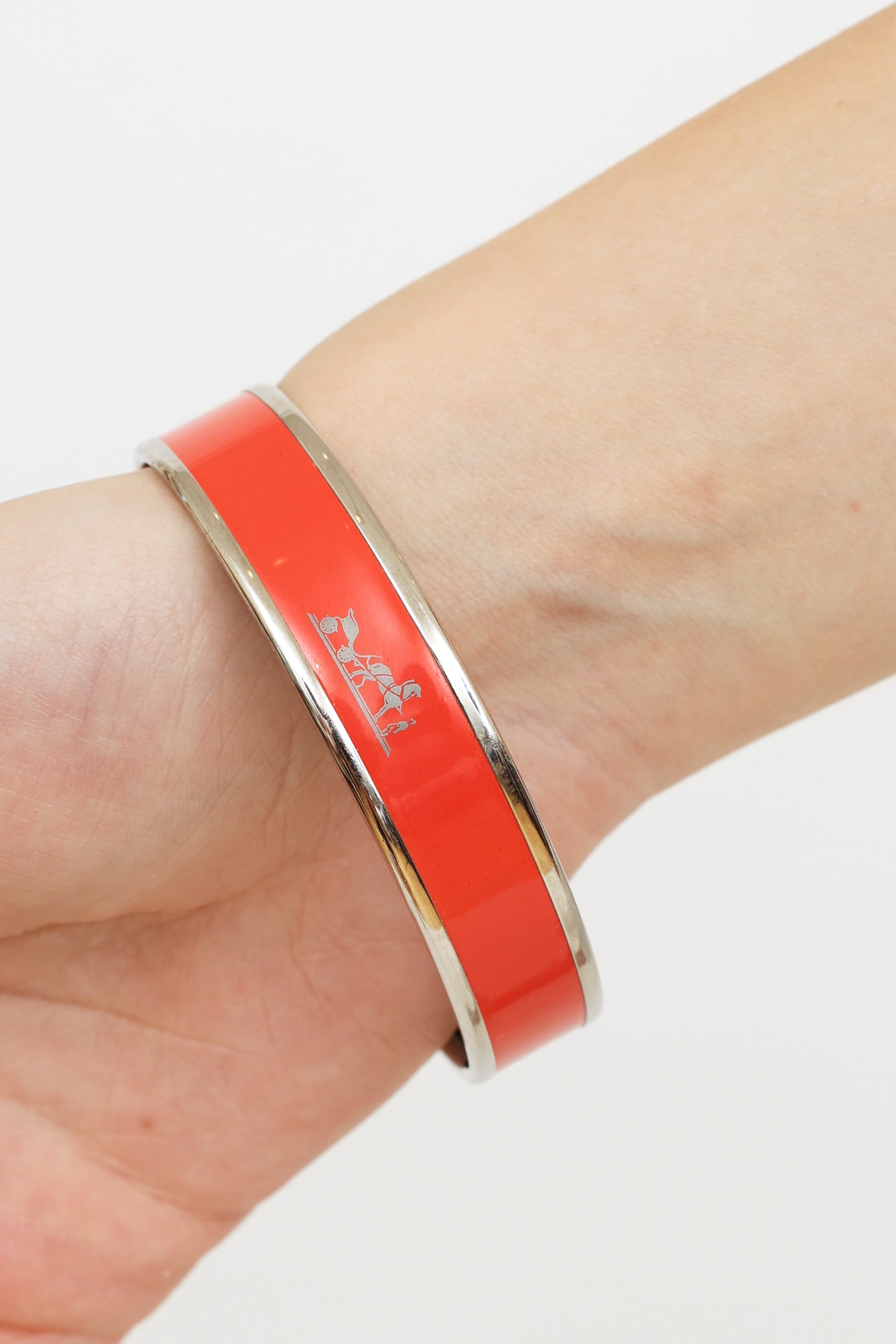 Pre-owned Hermès rouge Casque enamel Caleche bangle featuring red enamel at centre with silver-tone horse and carriage graphic, silver-tone rims and black enamel interior with gold-tone logo stamp.