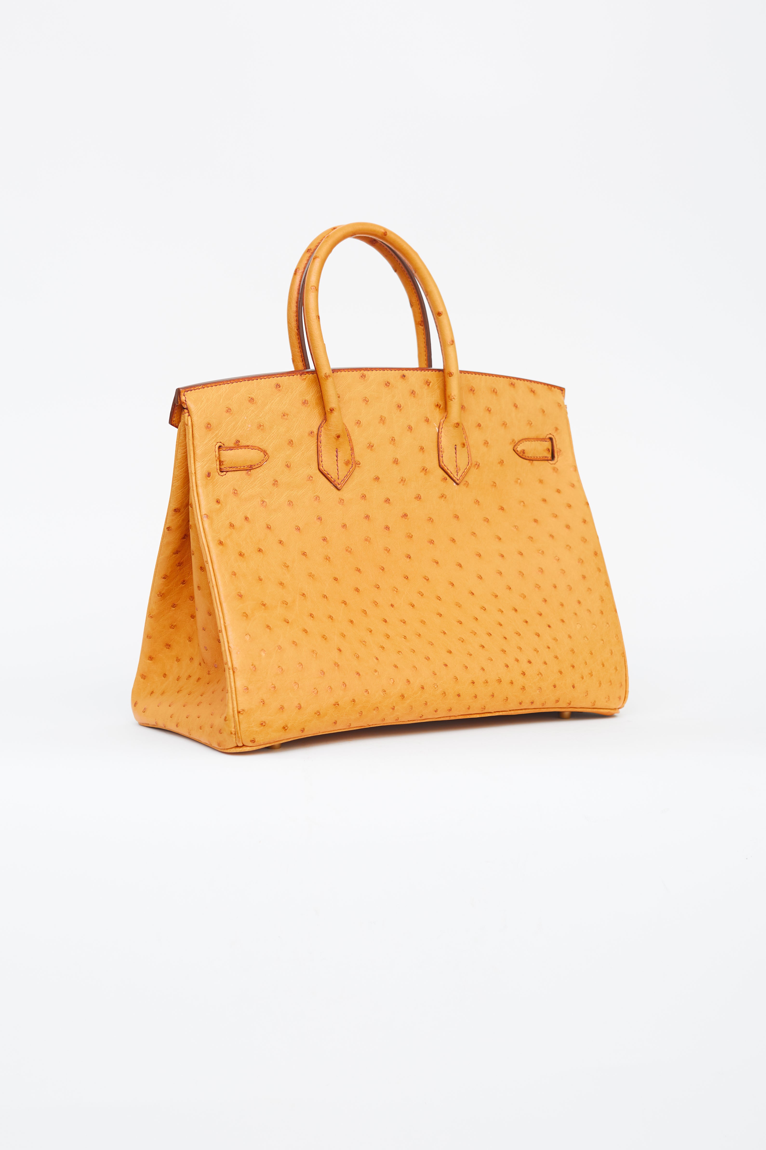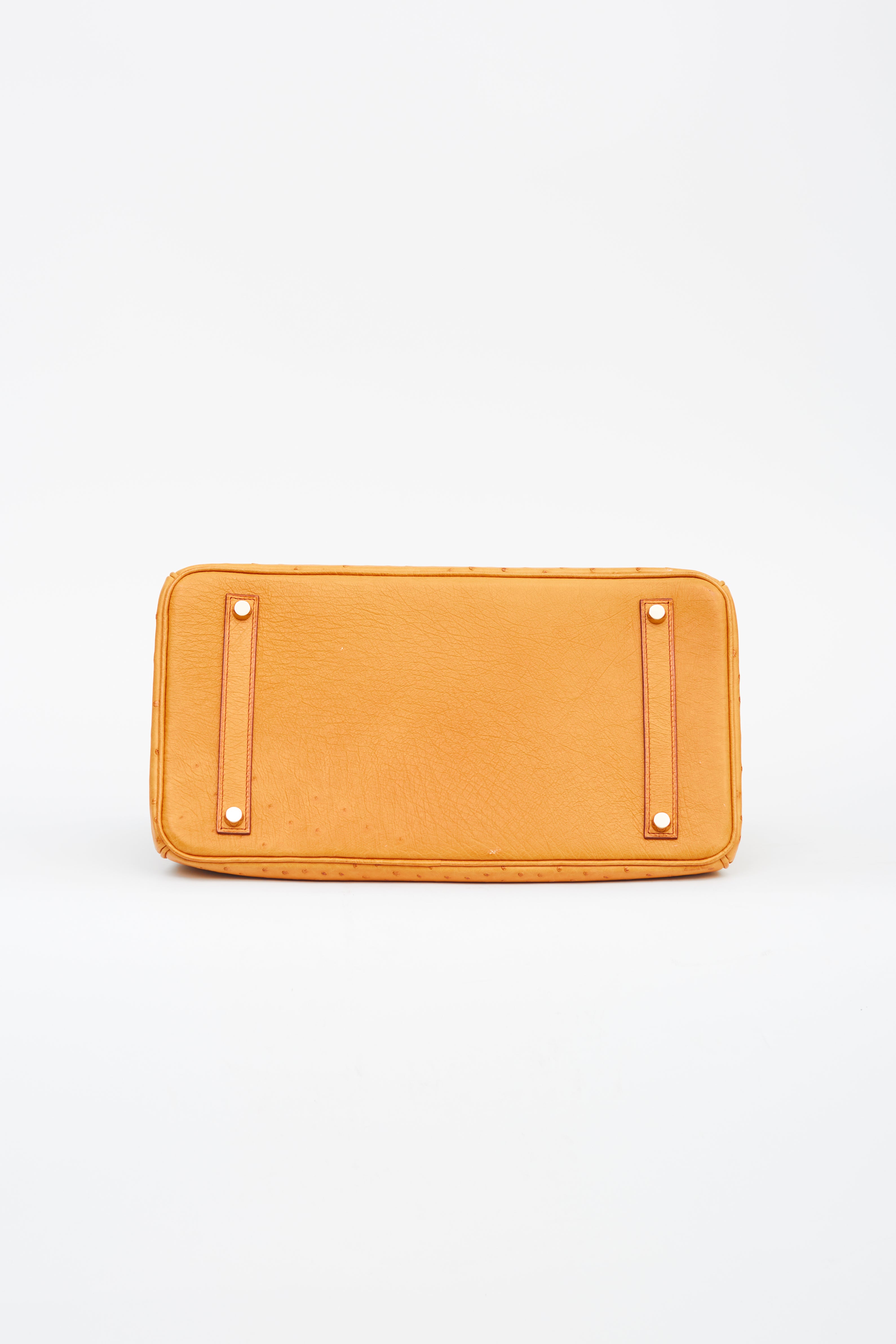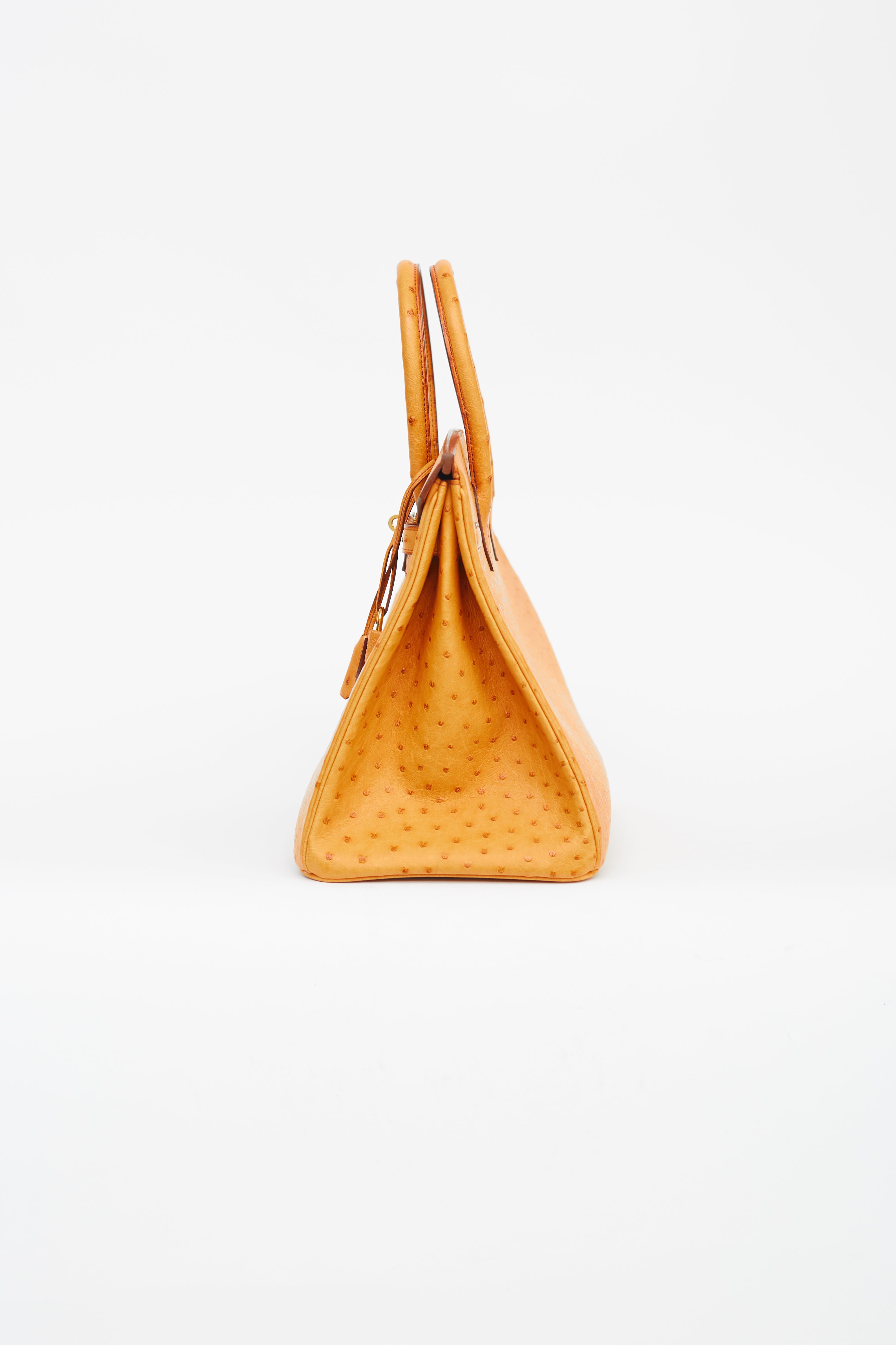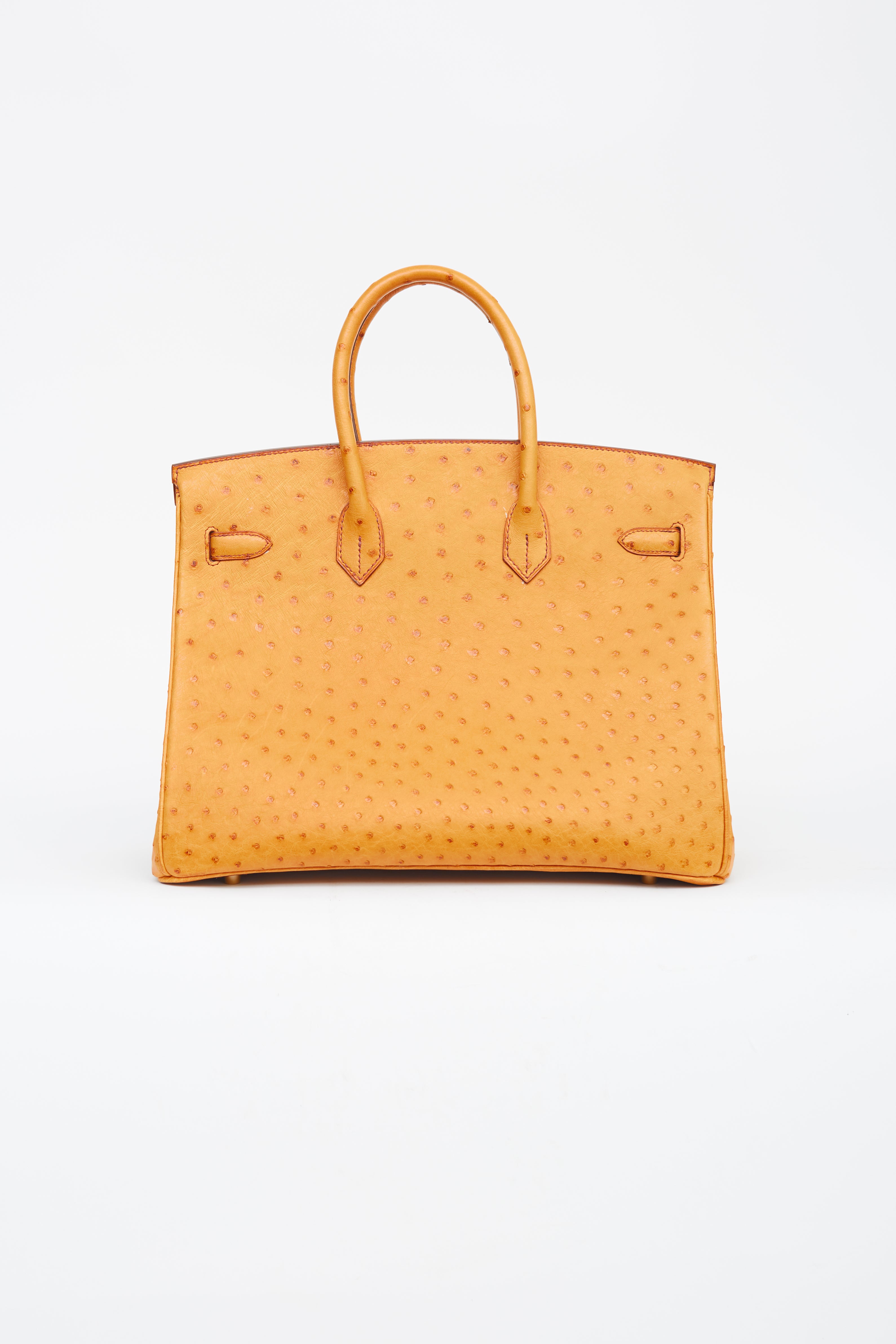 Pre-owned Hermès 2007 Birkin 35 in Saffron ostrich leather featuring two rolled top handles, brown stitching and glazing, gold-tone hardware, top flap with side straps, twist closure, protective metal feet at bottom, key and padlock attachment, single compartment and one slip and zip pocket.