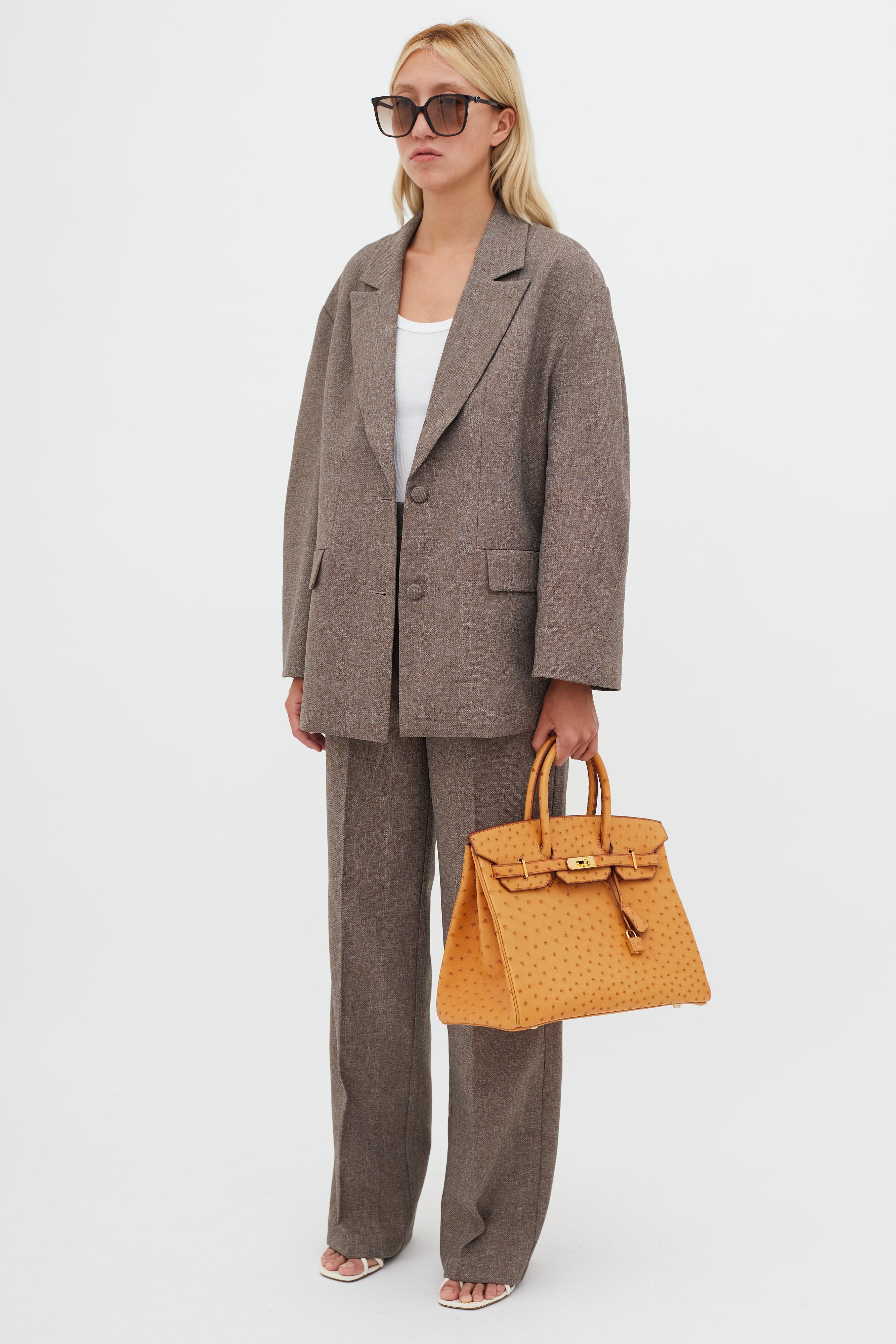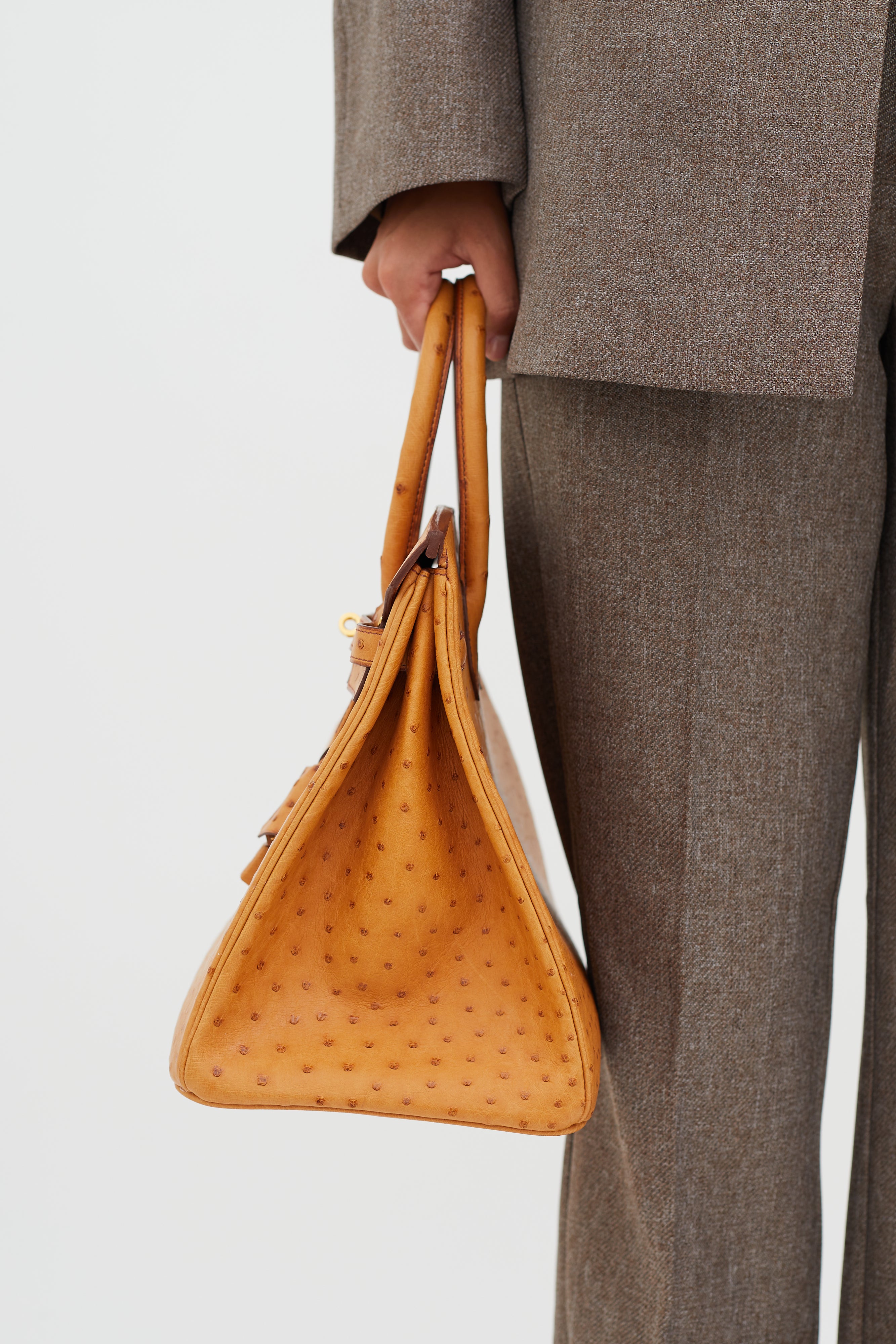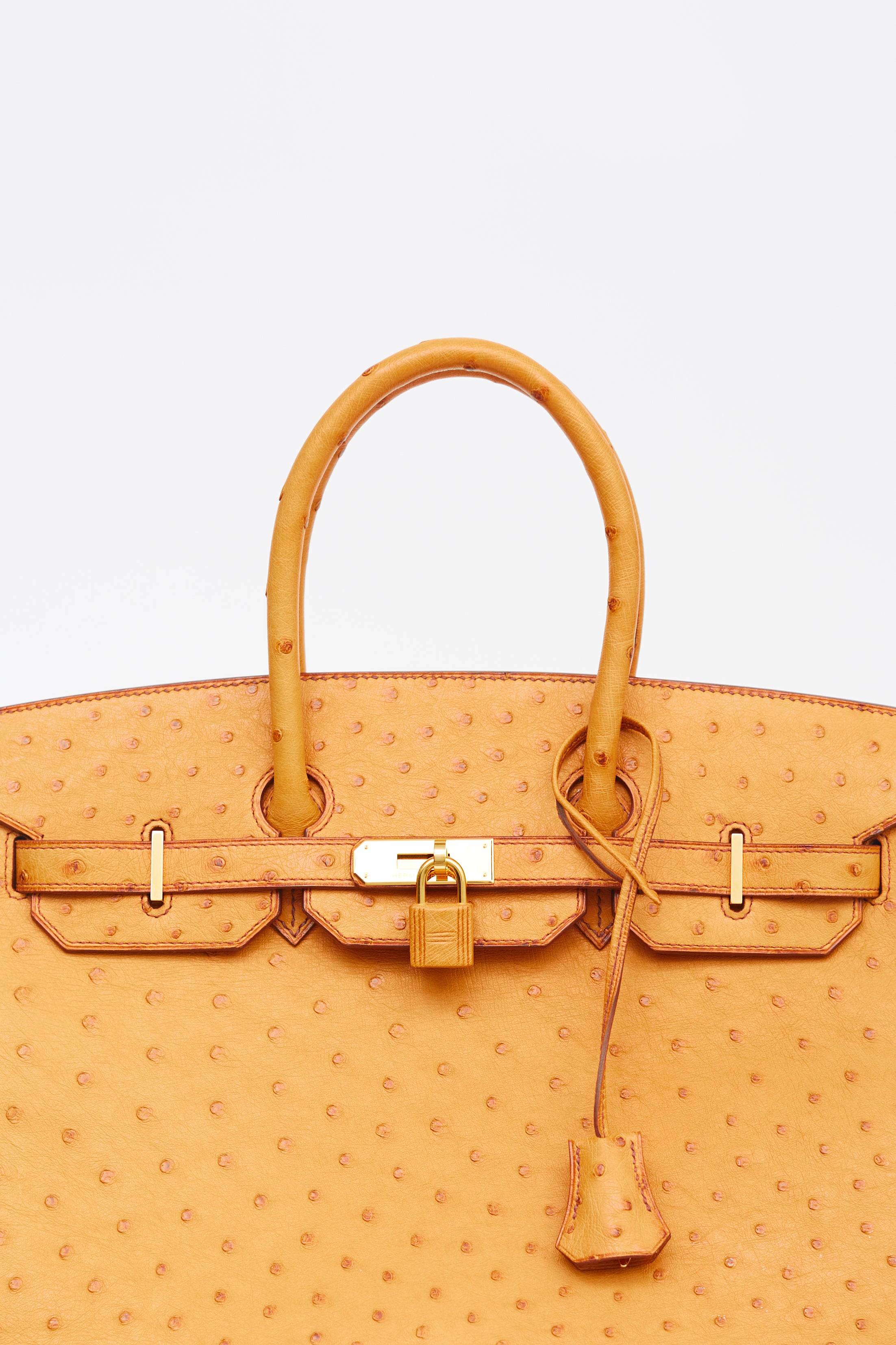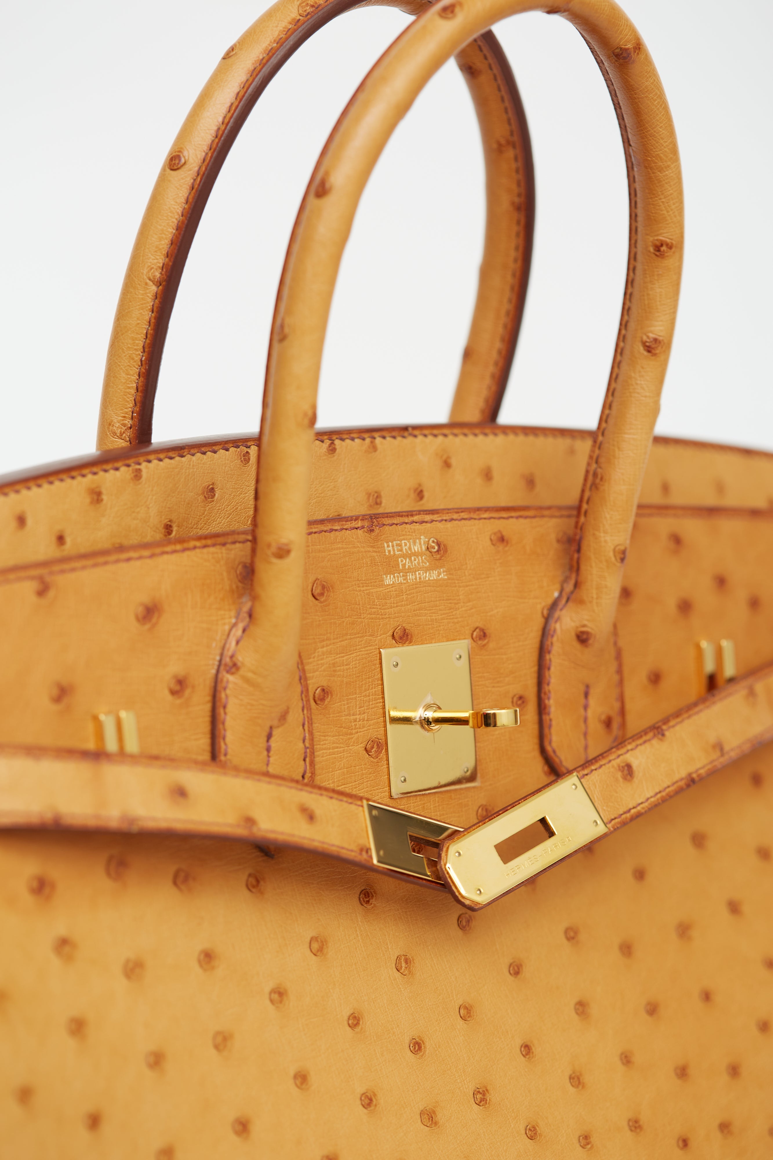 Pre-owned Hermès 2007 Birkin 35 in Saffron ostrich leather featuring two rolled top handles, brown stitching and glazing, gold-tone hardware, top flap with side straps, twist closure, protective metal feet at bottom, key and padlock attachment, single compartment and one slip and zip pocket.