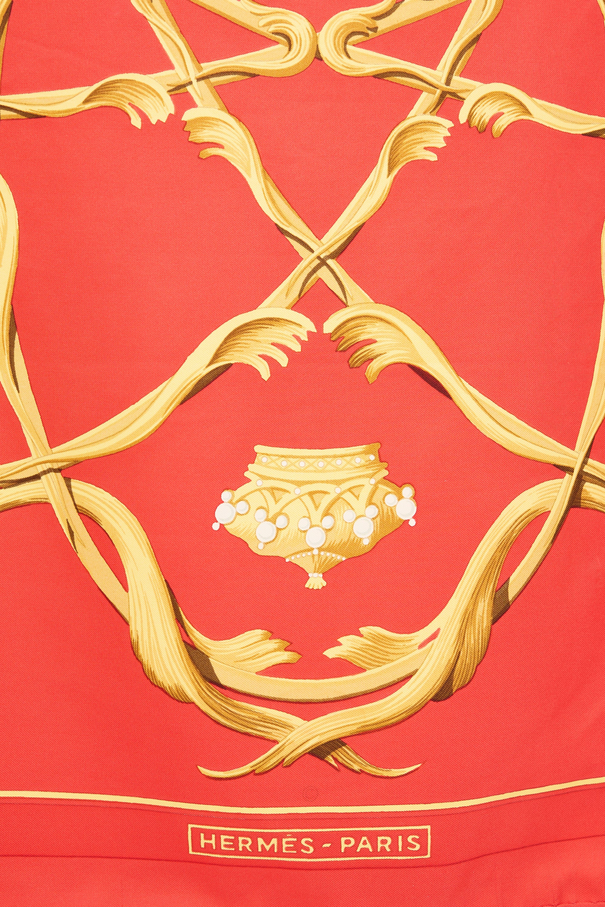 Pre-owned Hermès red and gold tone silk 90 scarf featuring Couronnes design by Julie Abadie, crown motif, and hand rolled edges.