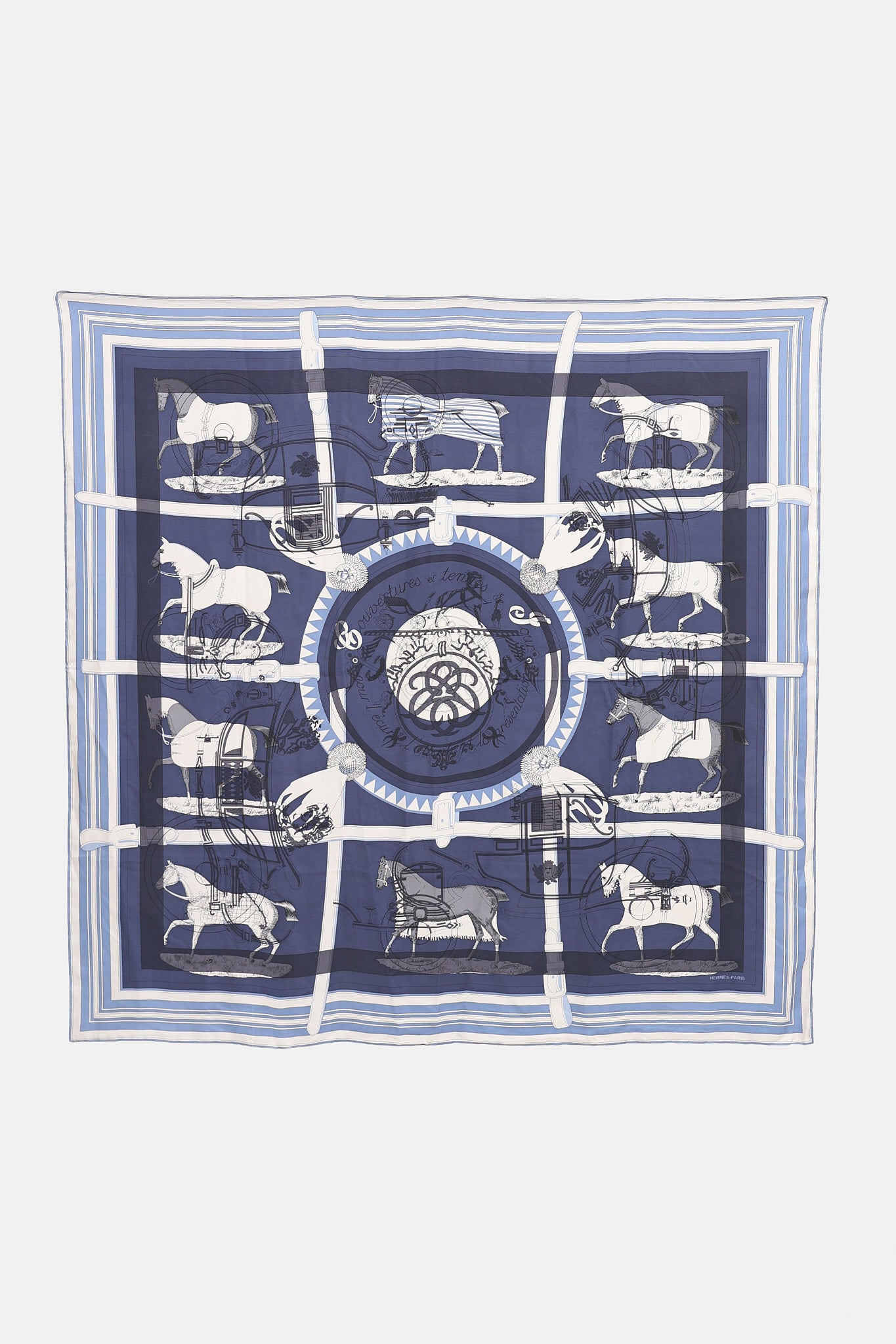 Pre-owned Hermès blue silk shawl featuring "Couvertures et Tenues" horse illustration by Jacques Eudel and hand rolled edges.