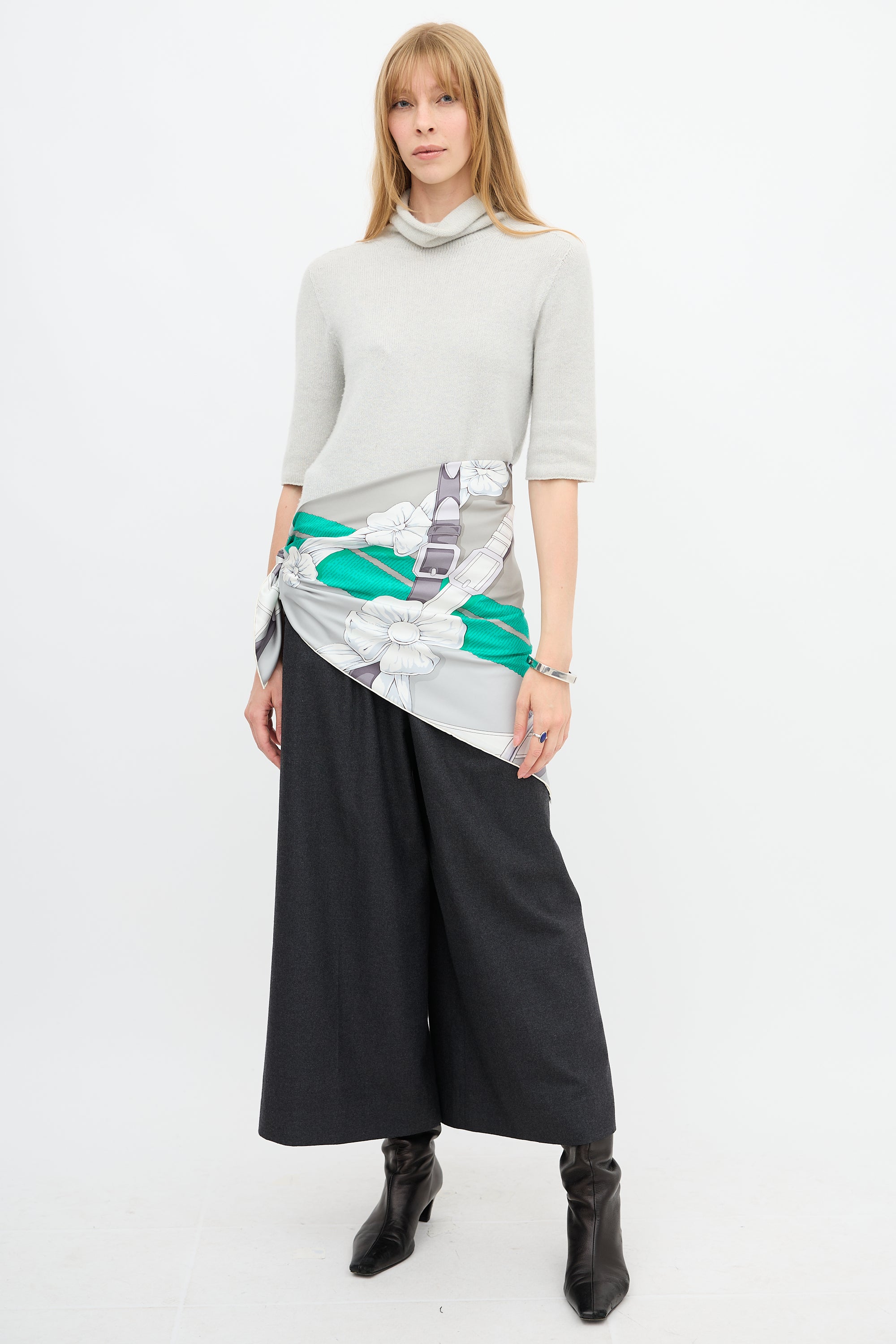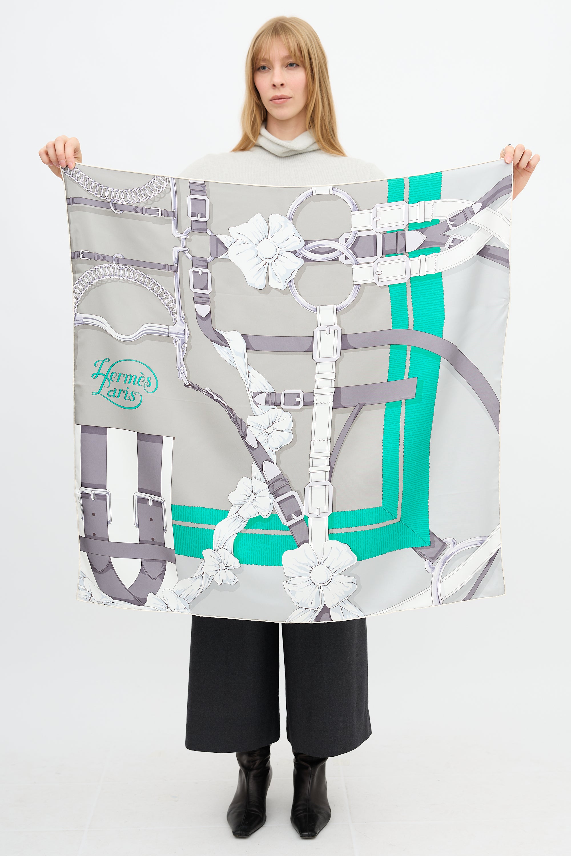 Pre-owned Hermès grey and green silk scarf featuring Grand Manege Detail print by Henri d'Origny, belt and flower motif, and hand rolled trim edges.