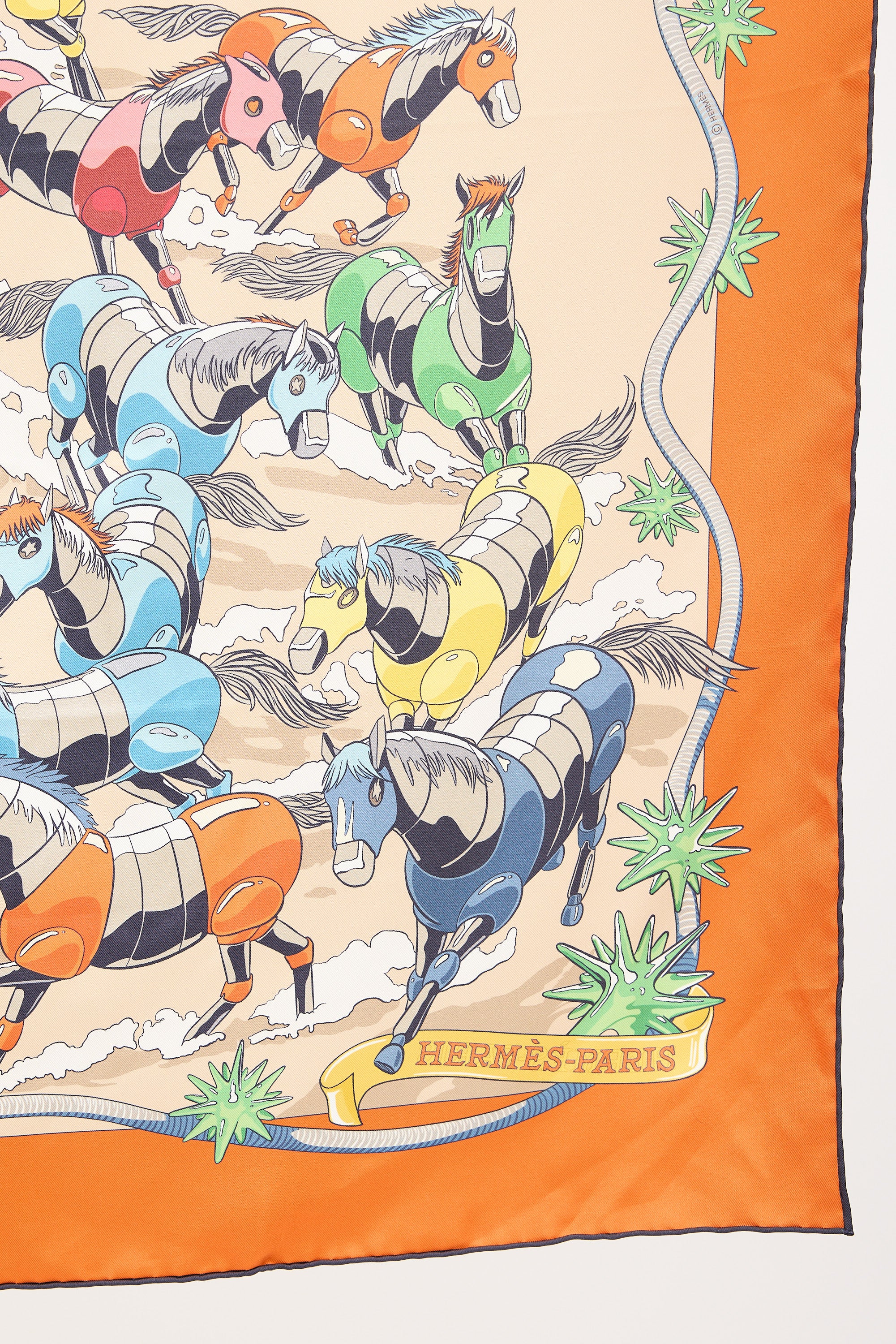 Pre-owned Hermès orange and multicolour silk scarf featuring Les Mustangs II design by Ugo Bienvenu and hand rolled edges. Comes with original box.