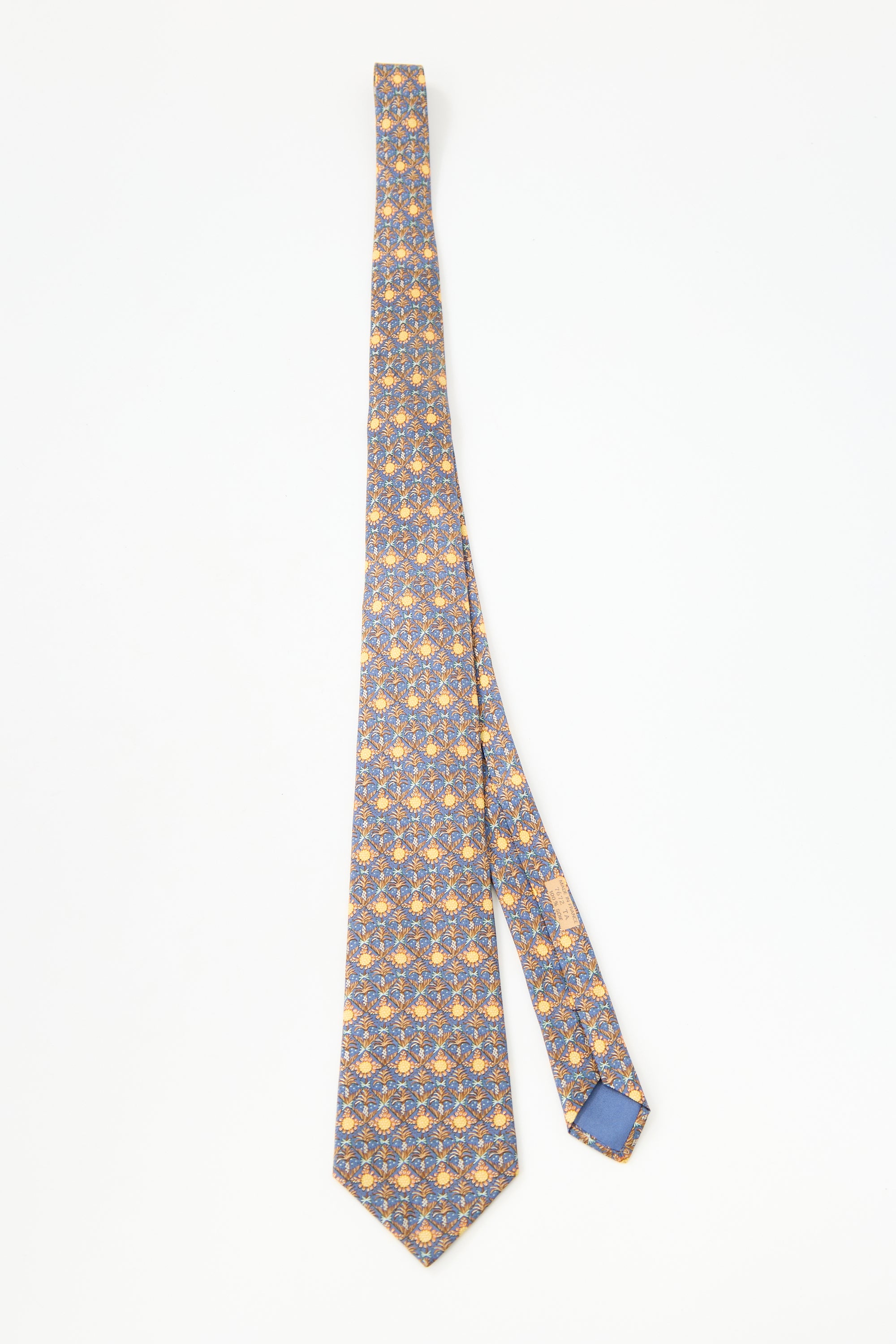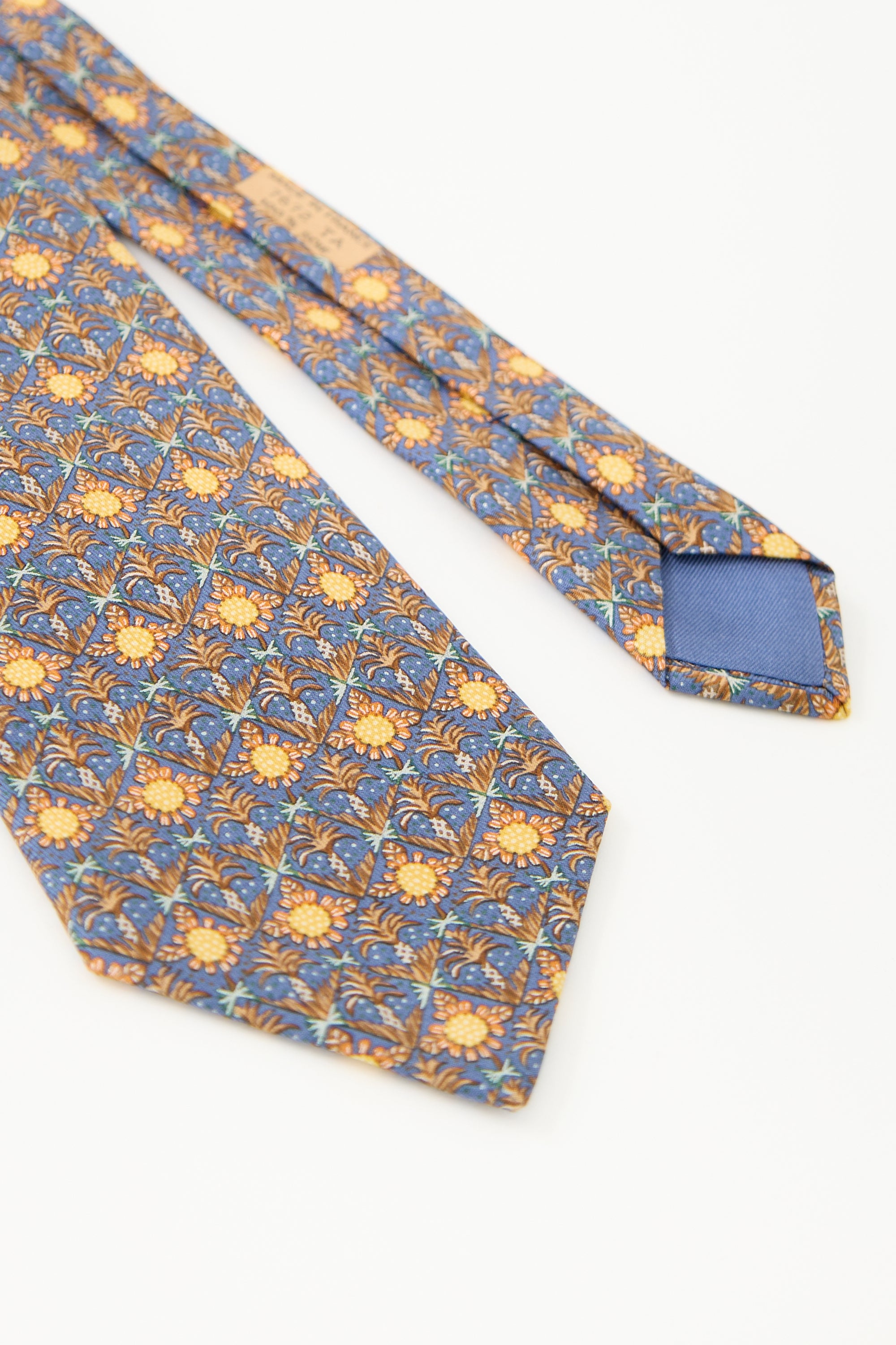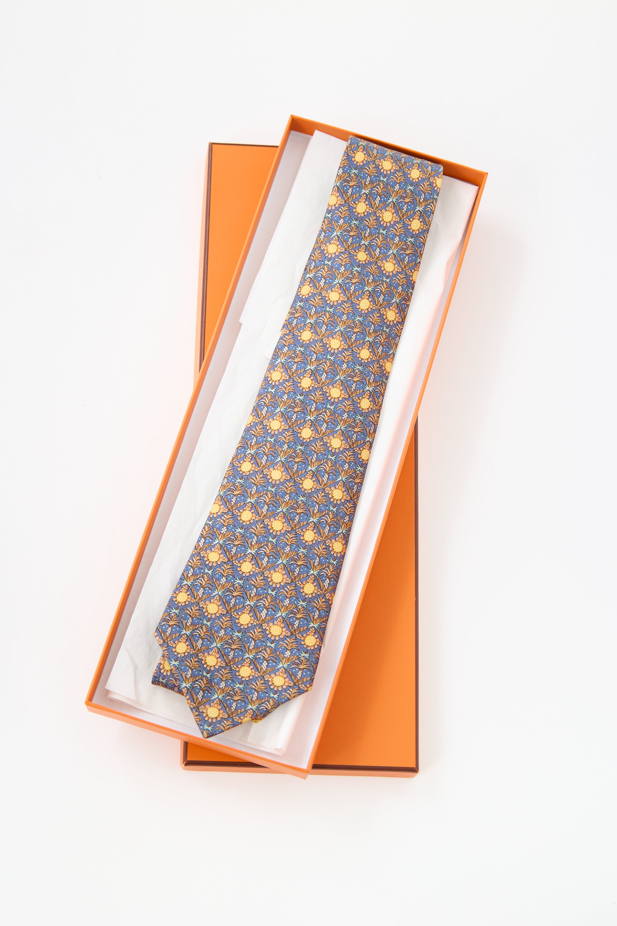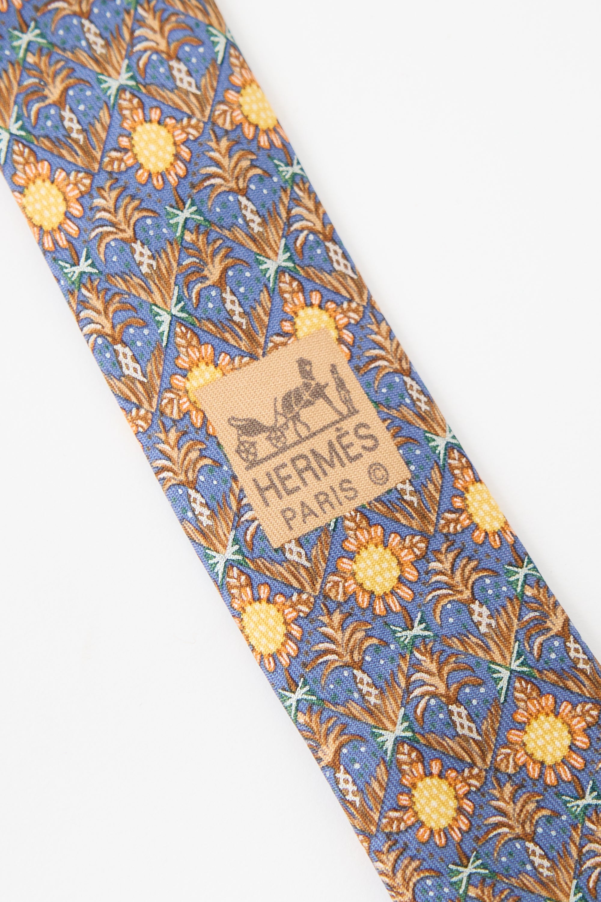 Pre-owned Hermès blue and yellow silk tie featuring sunflower print and printed logo at back. Comes with original box.