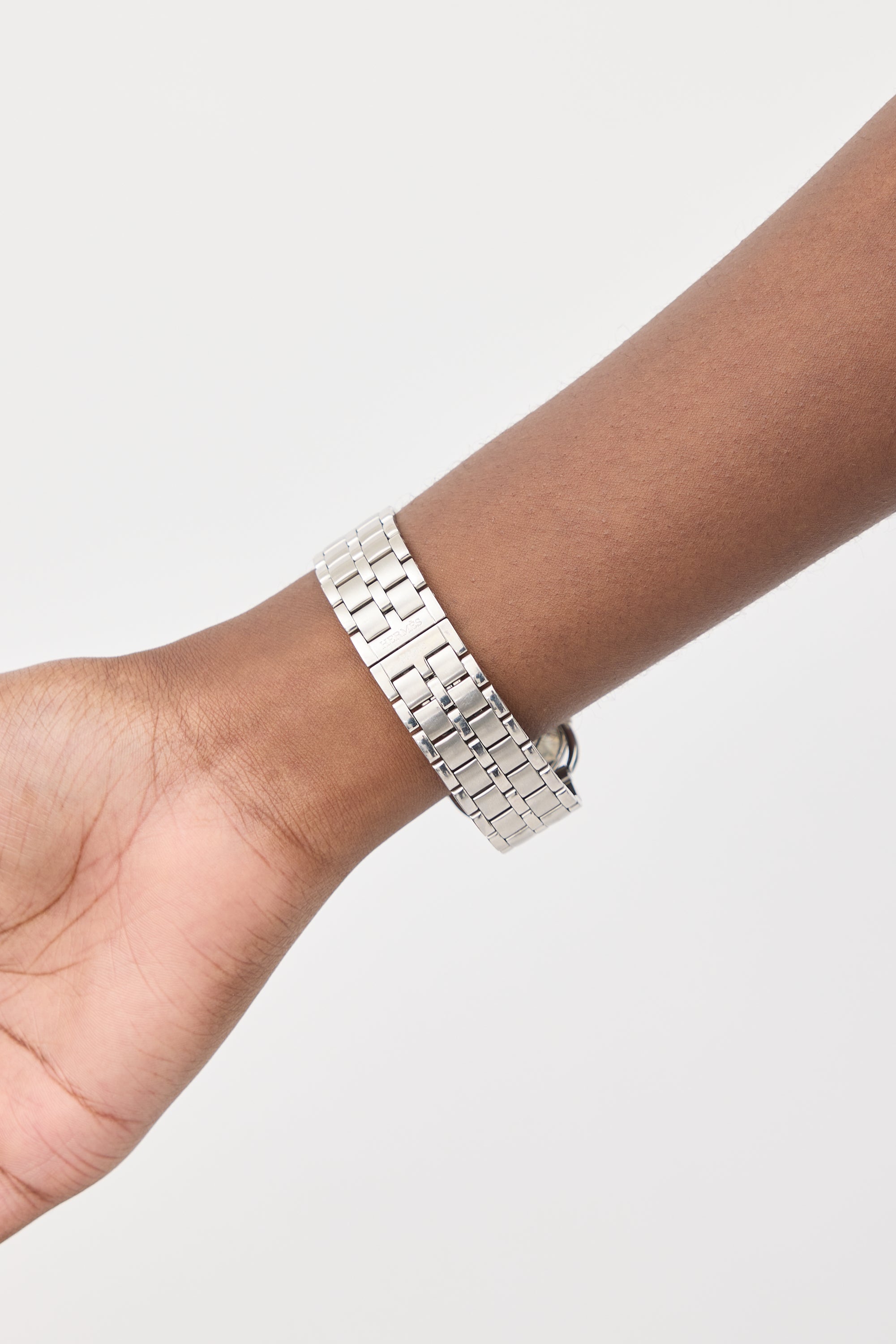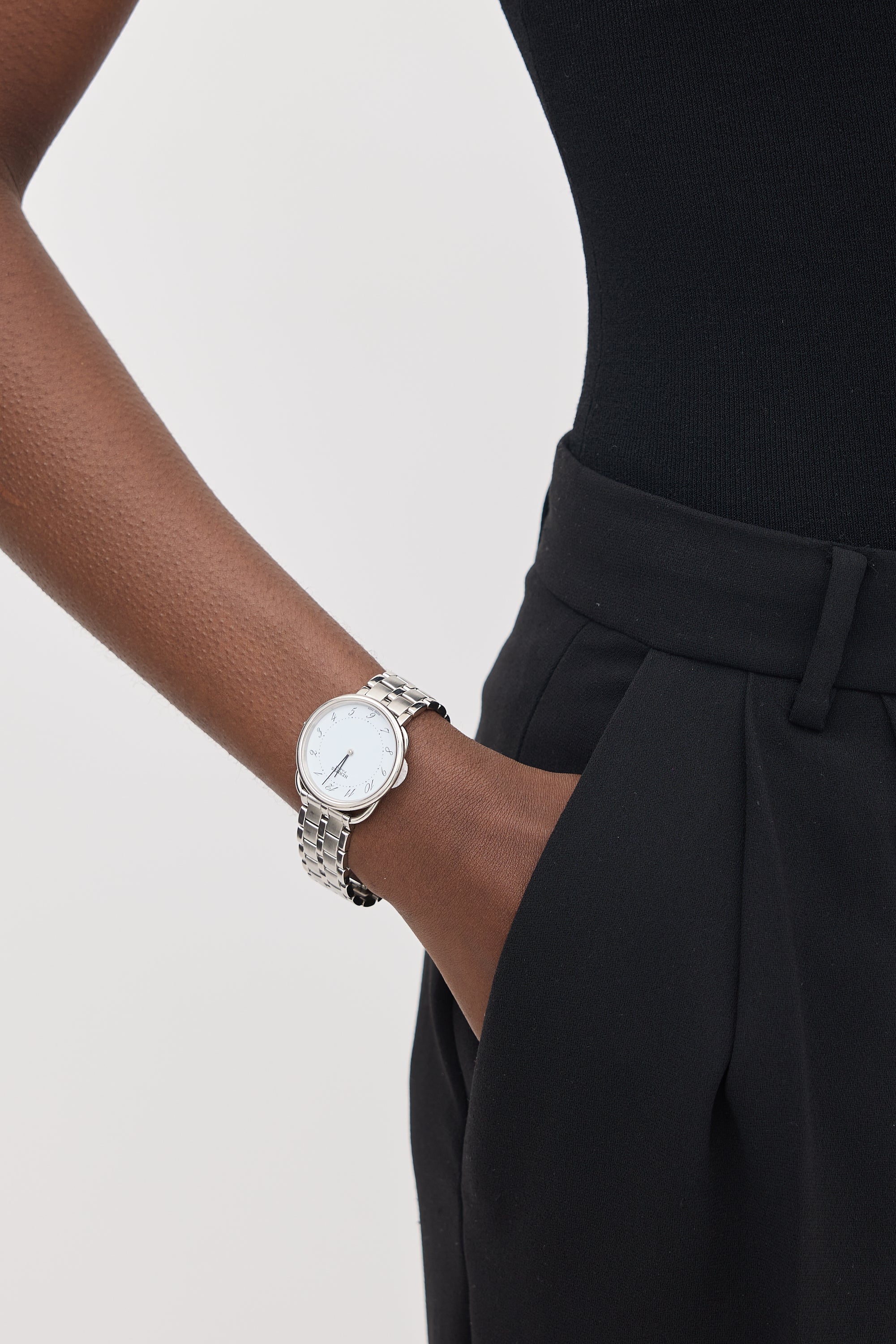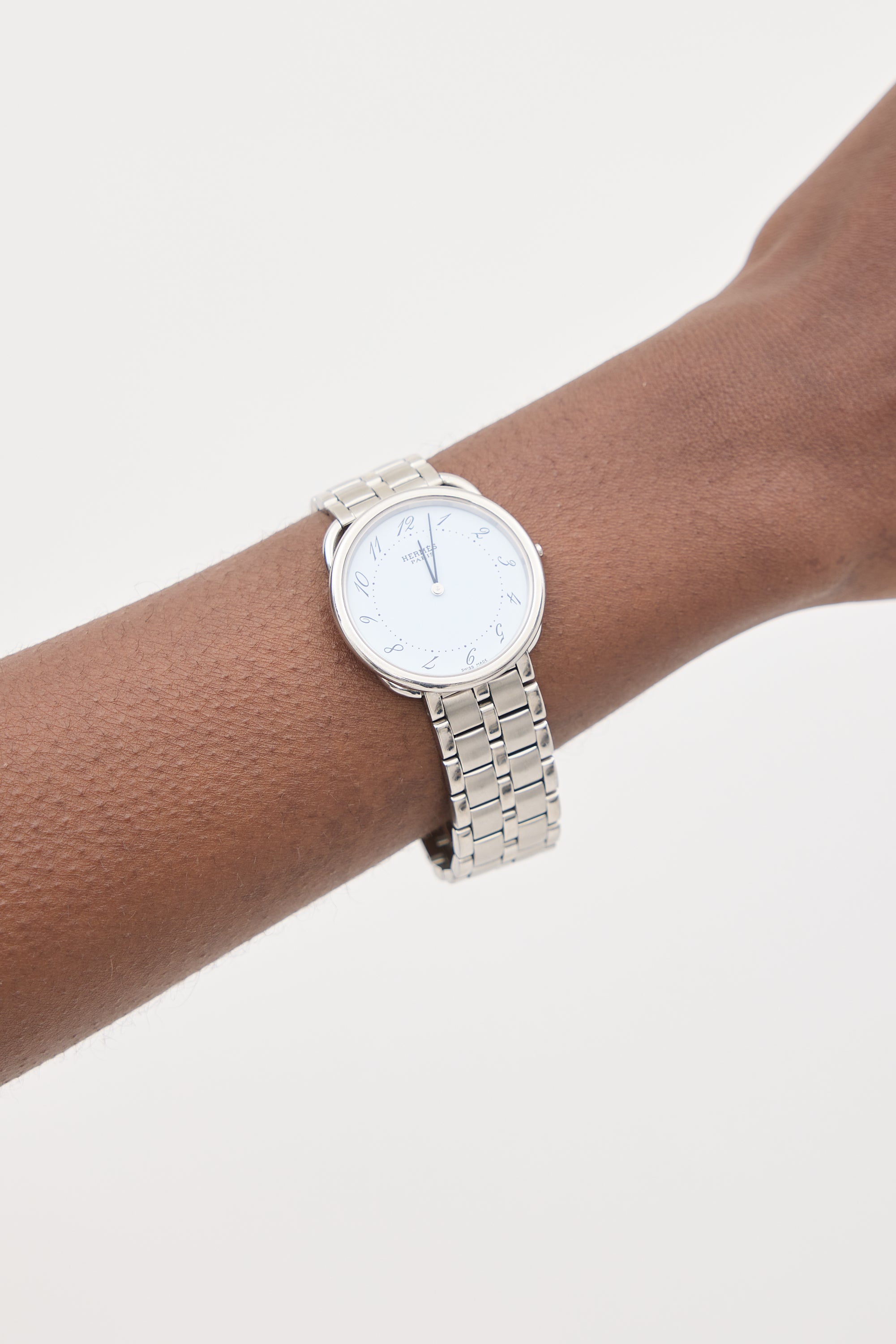 Pre-owned Hermès silver Arceau 40mm watch featuring a steel case, anti glare sapphire crystal, quartz movement, white-lacquered face with black numerals, water resistant to 3 bar, chain link band, and double fold clasp closure.