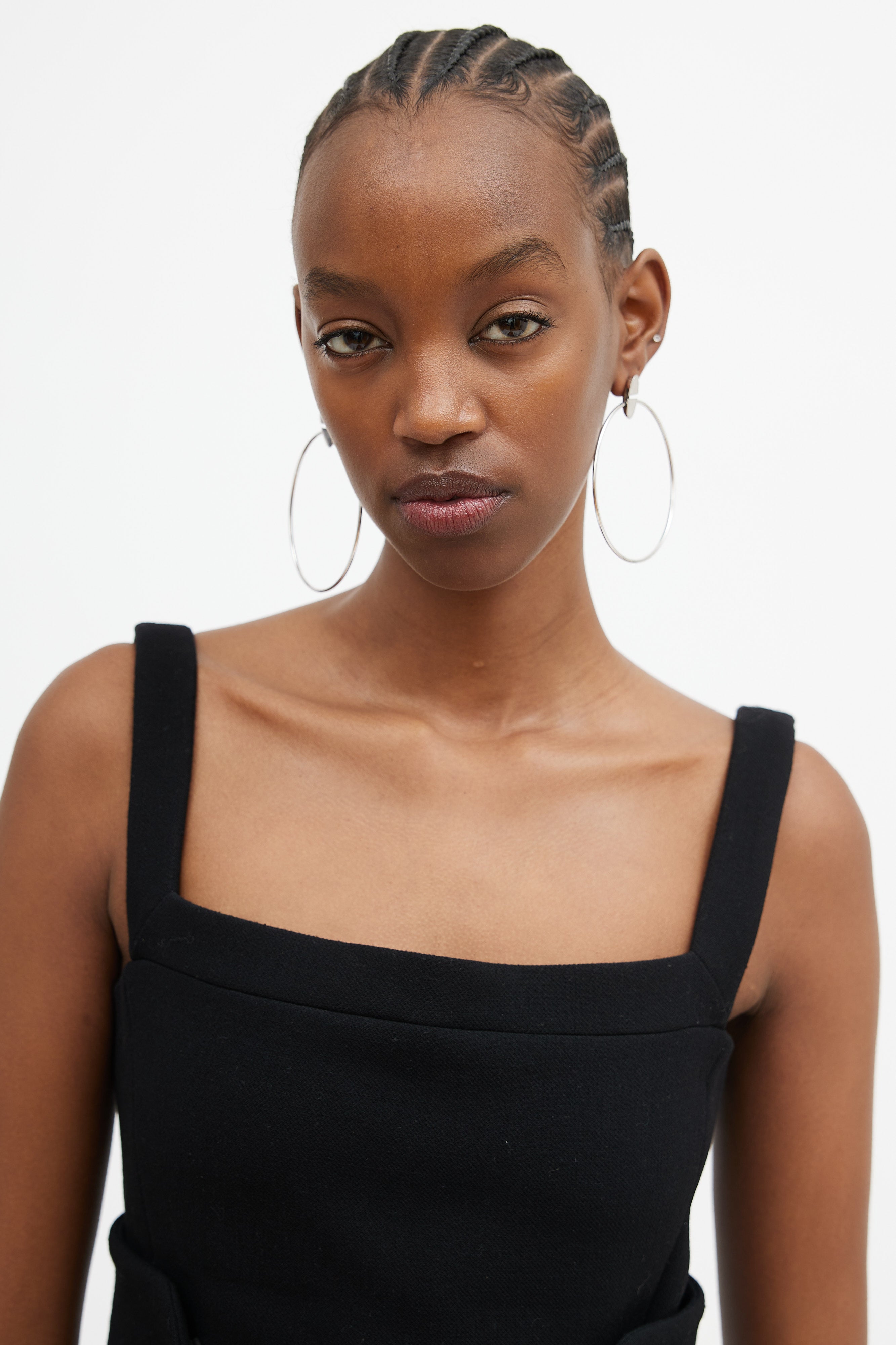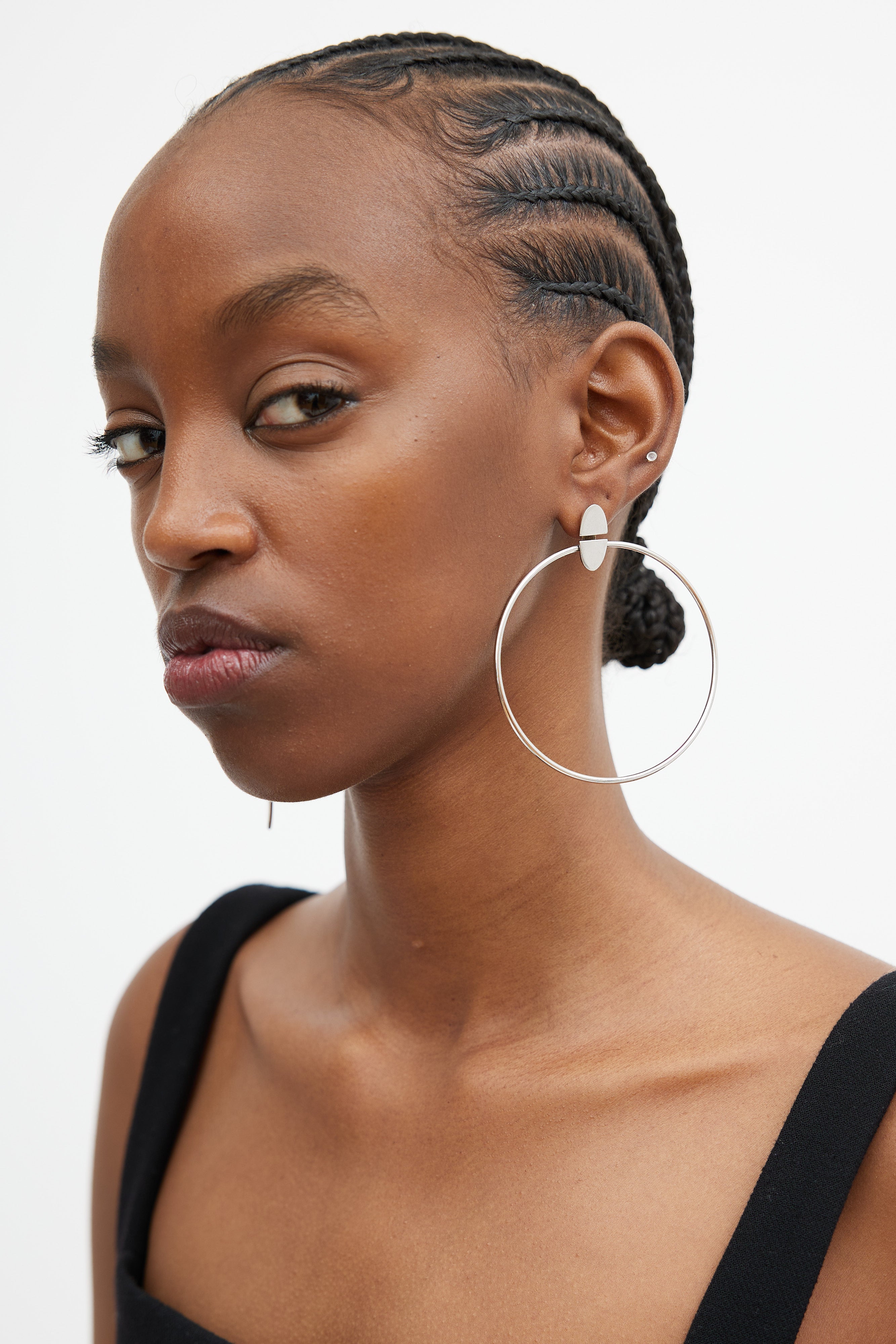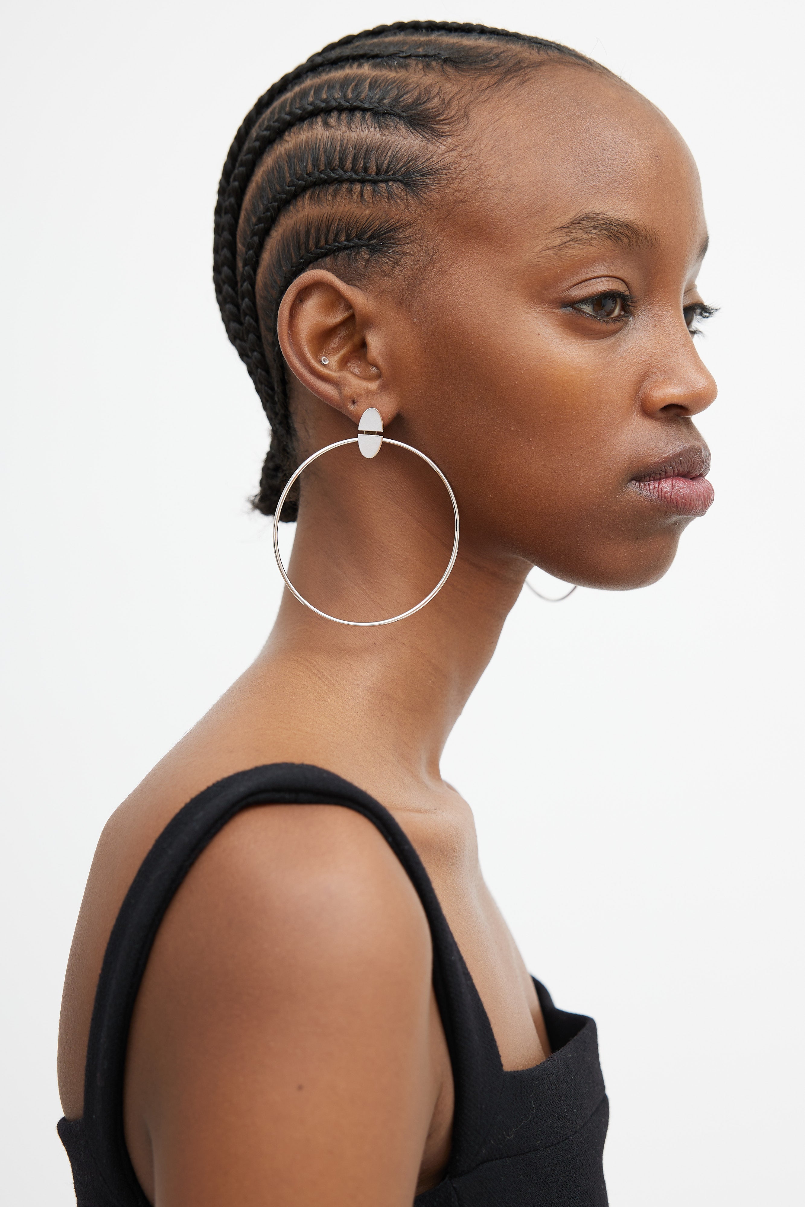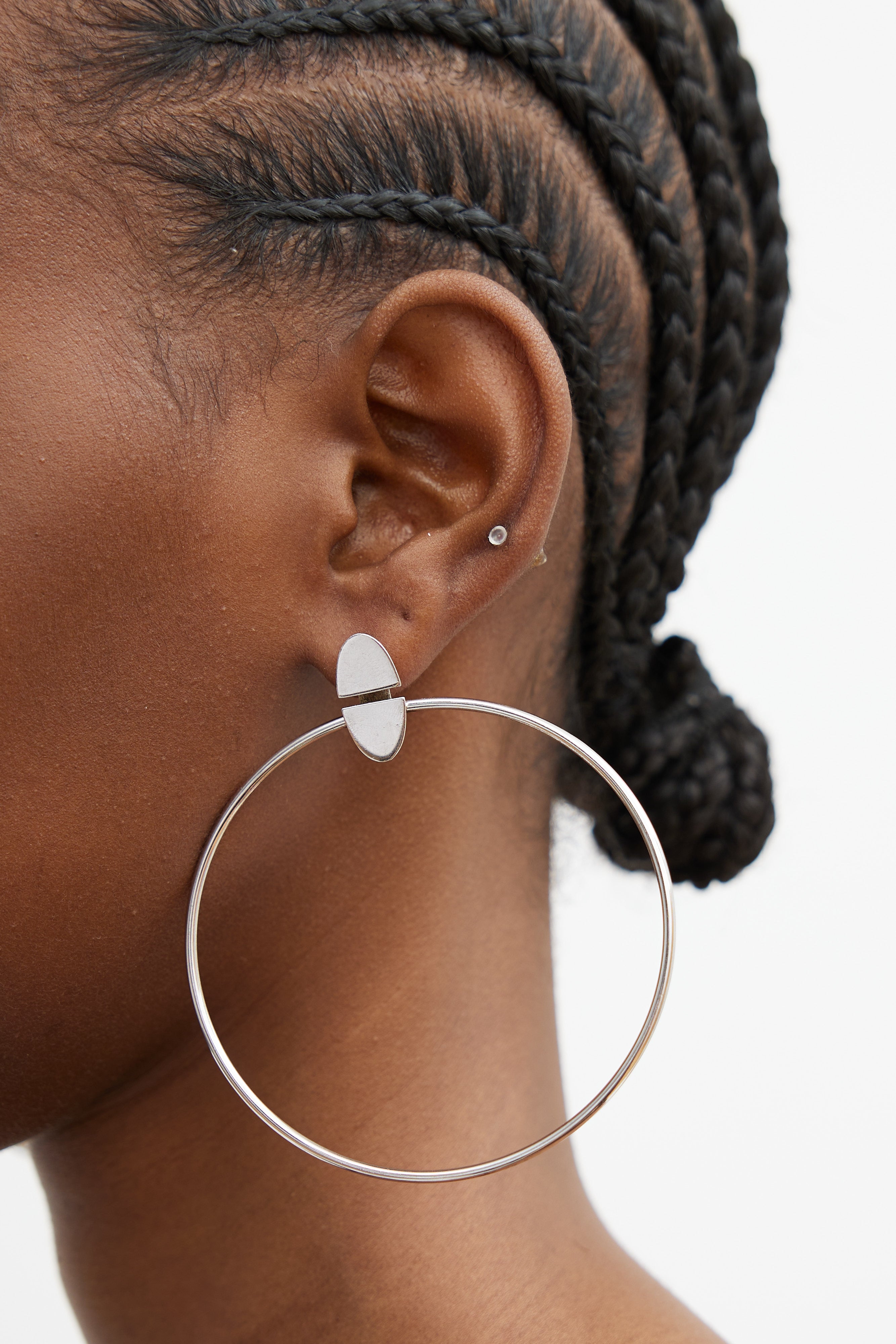 Pre-owned Hermès sterling silver earrings featuring a dangling loop design and back post closure. Stamped with "HERMÈS" and "925." Comes with pouch.