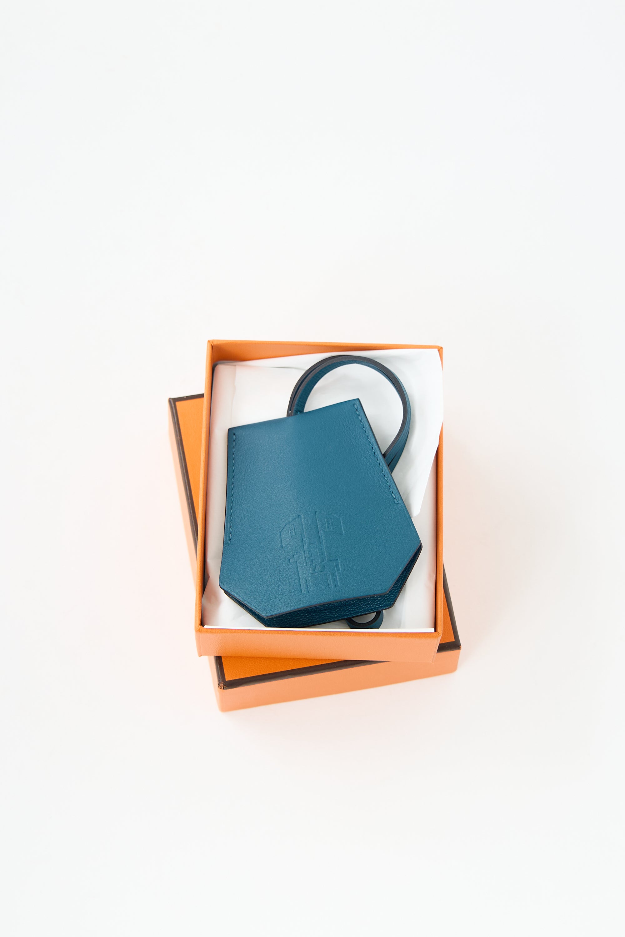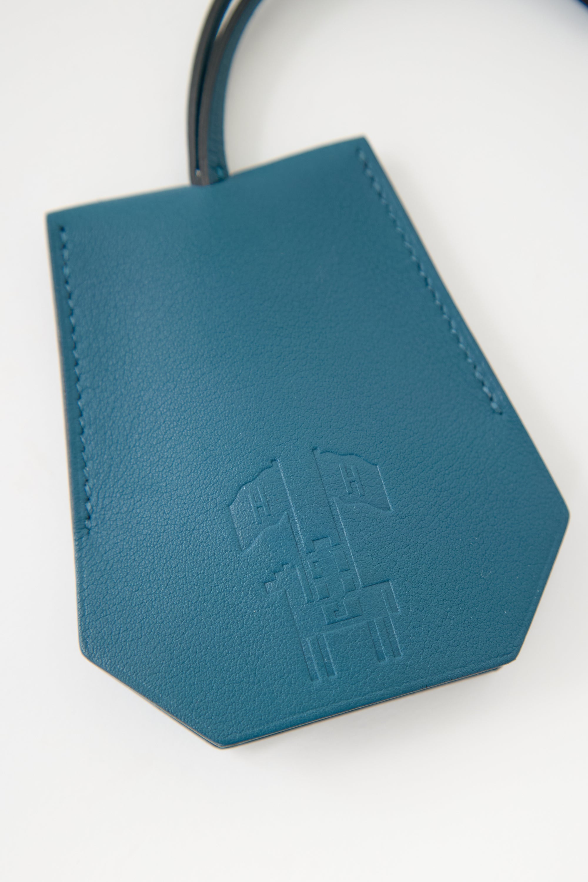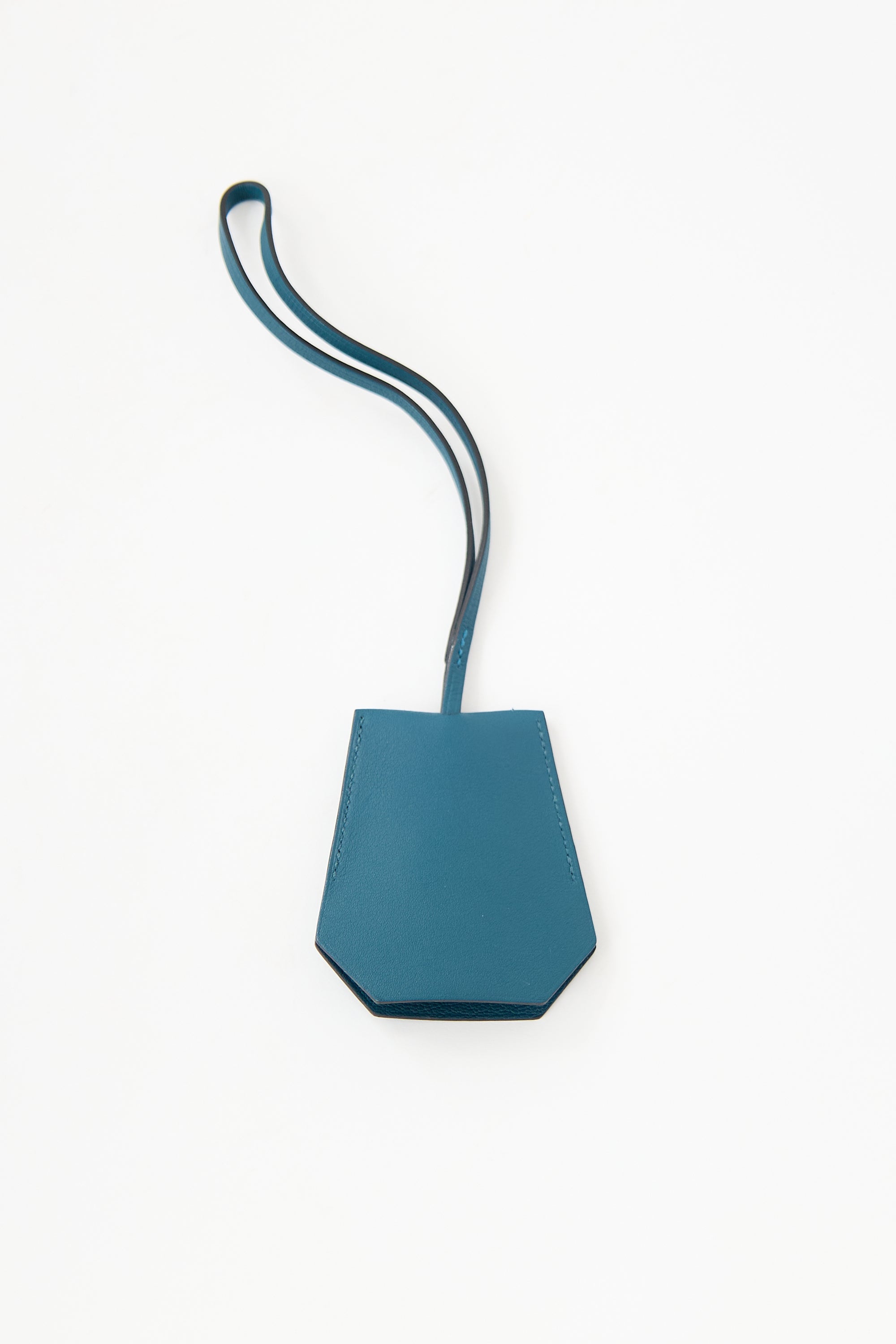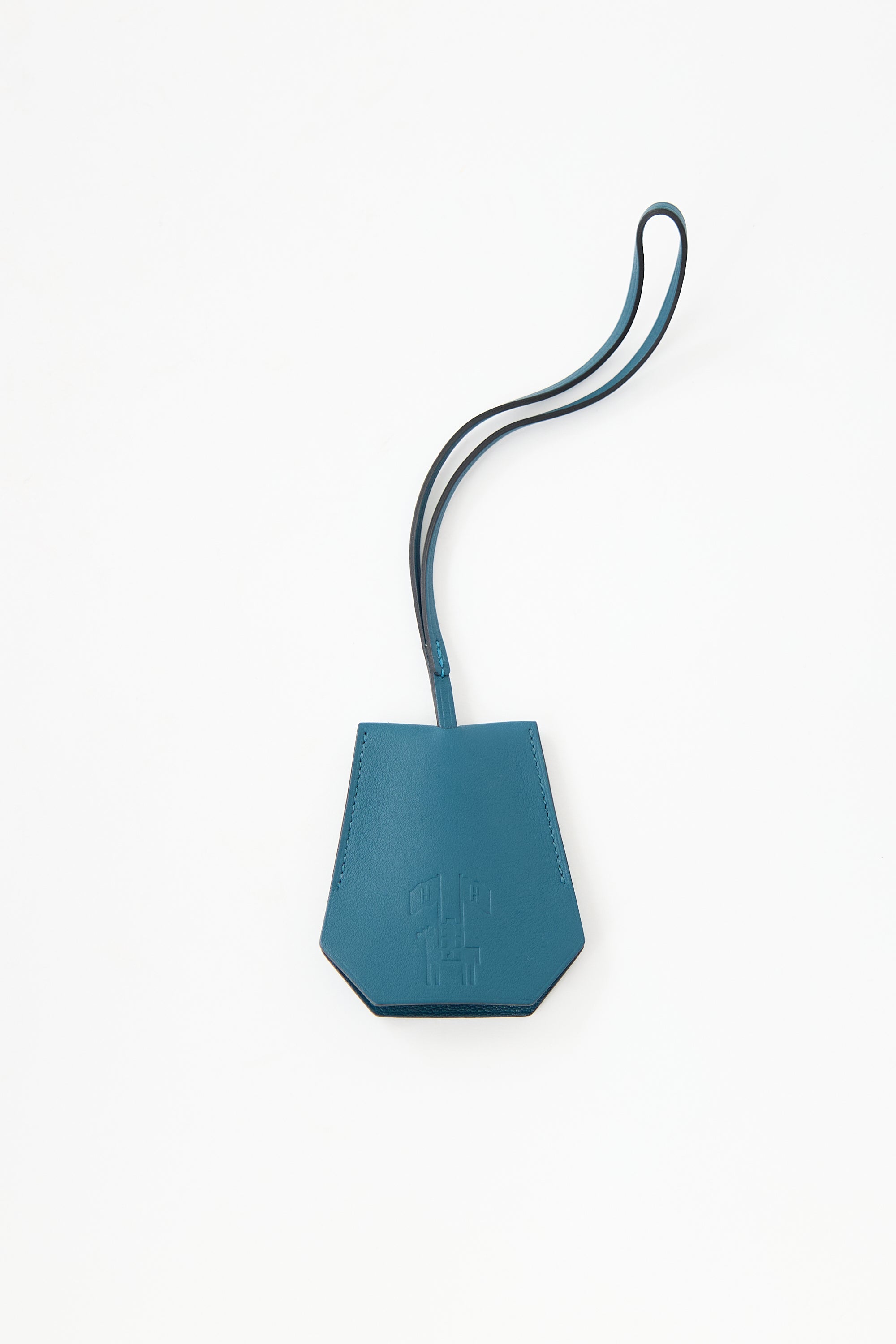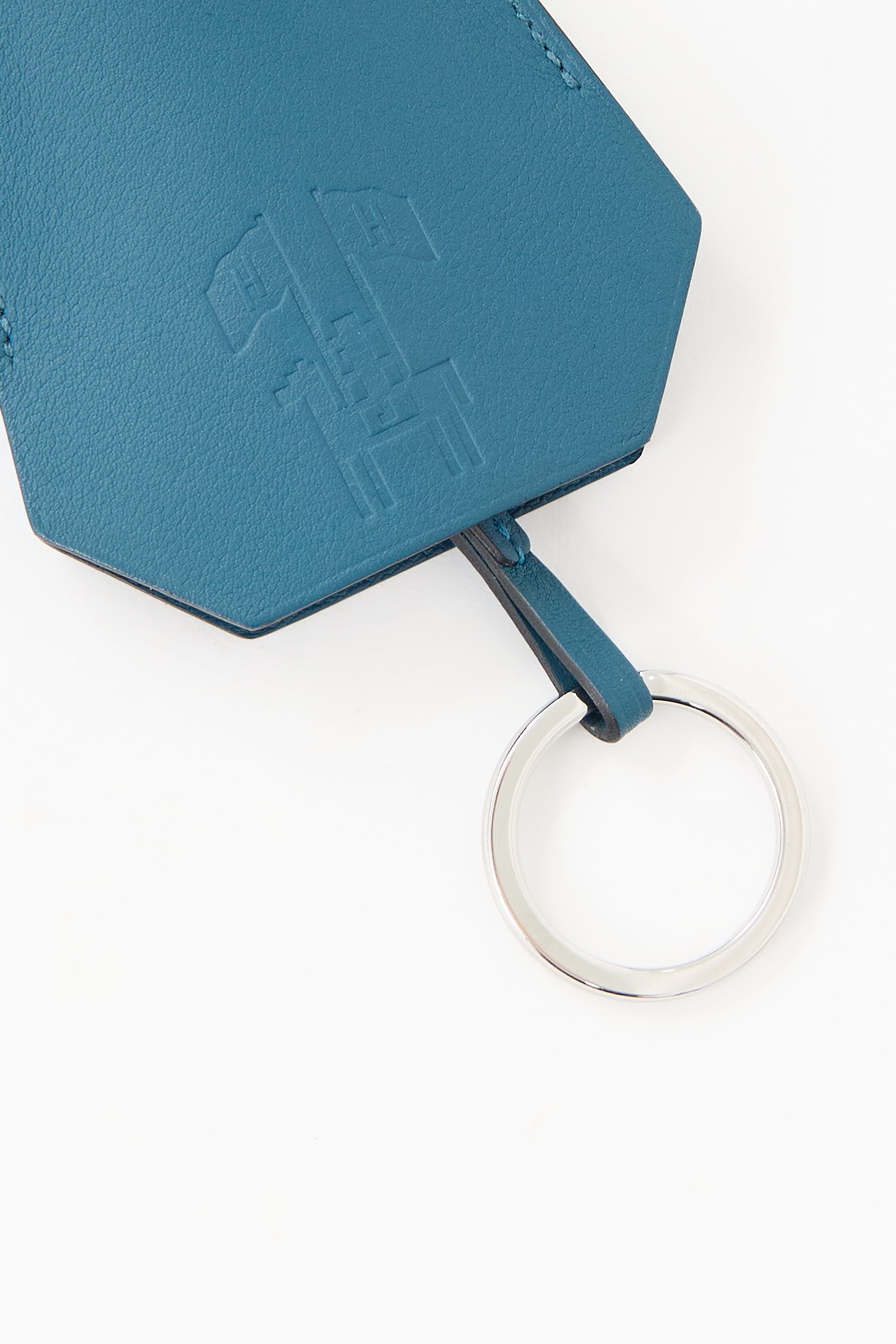 Pre-owned Hermès blue swift leather Clochette Cles keychain featuring leather strap, tonal stitch, silver tone key ring, and horse and flag stamp at front.