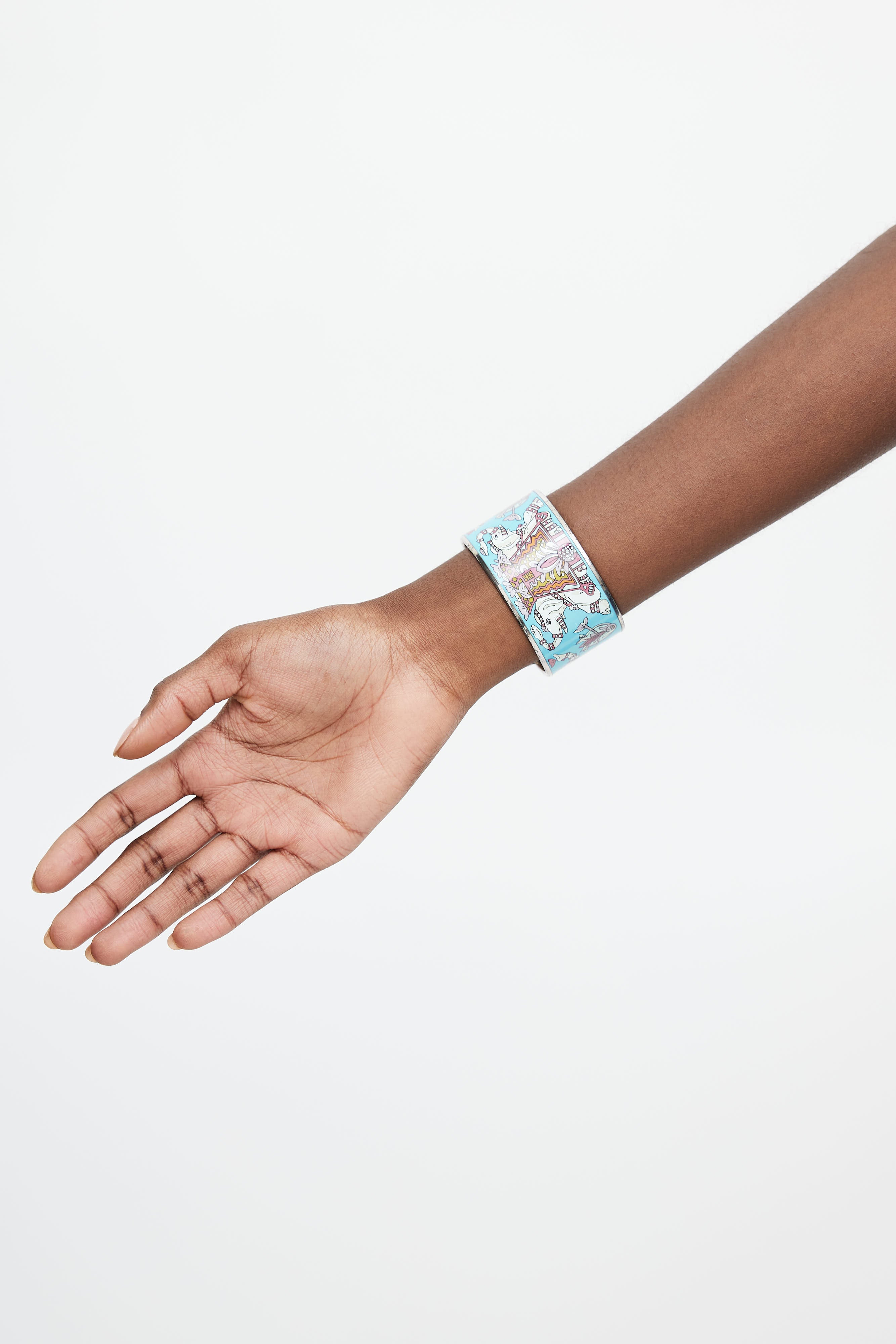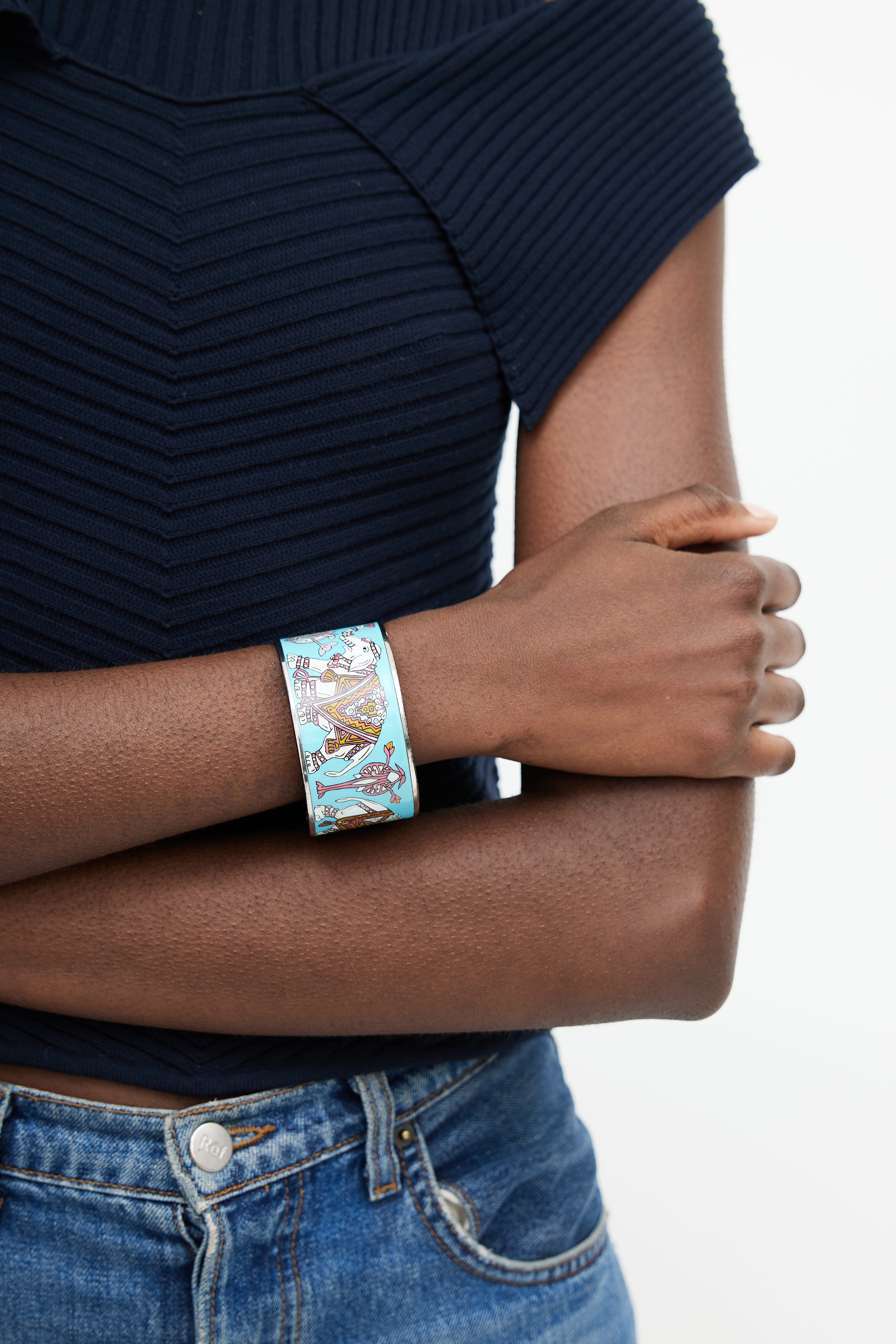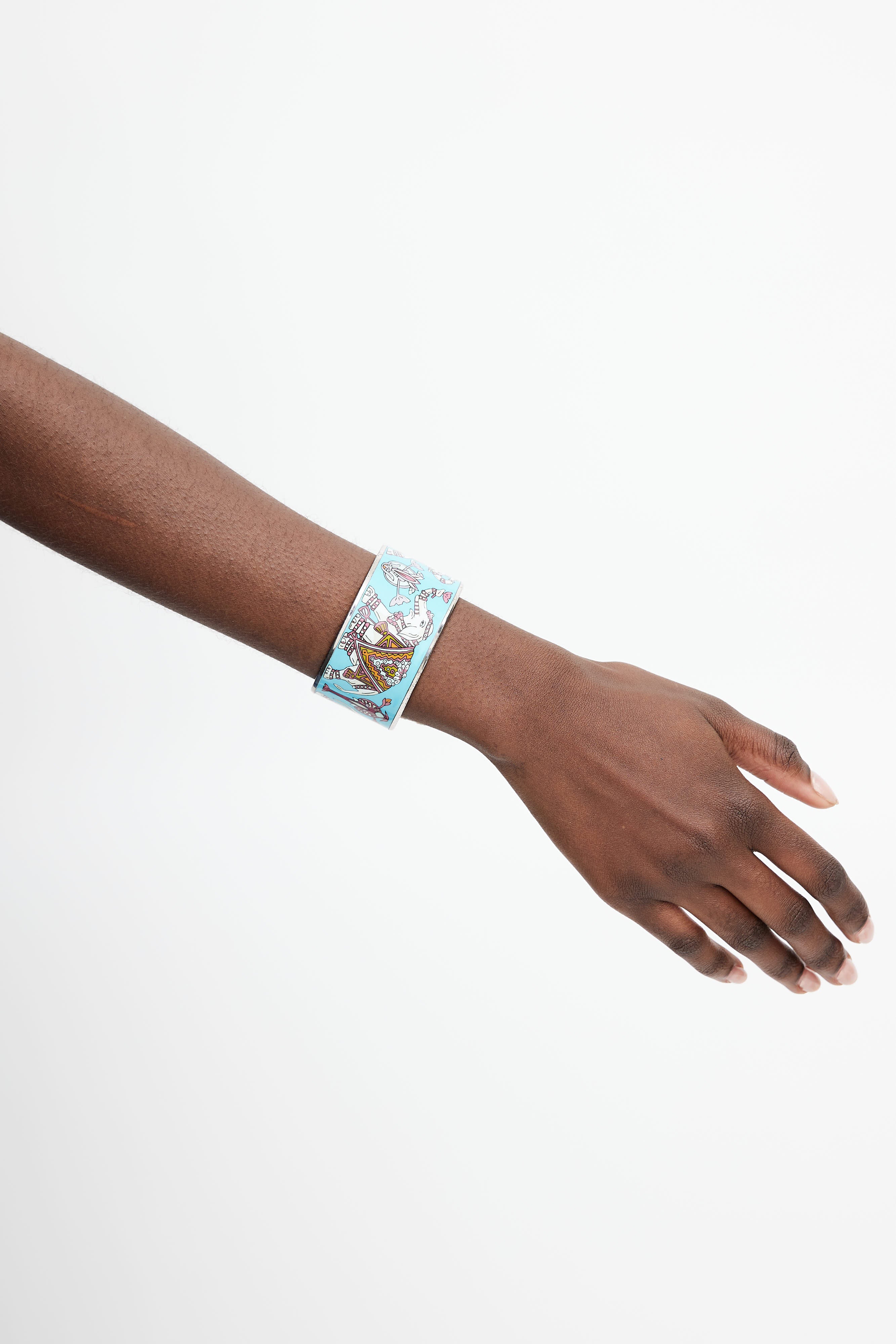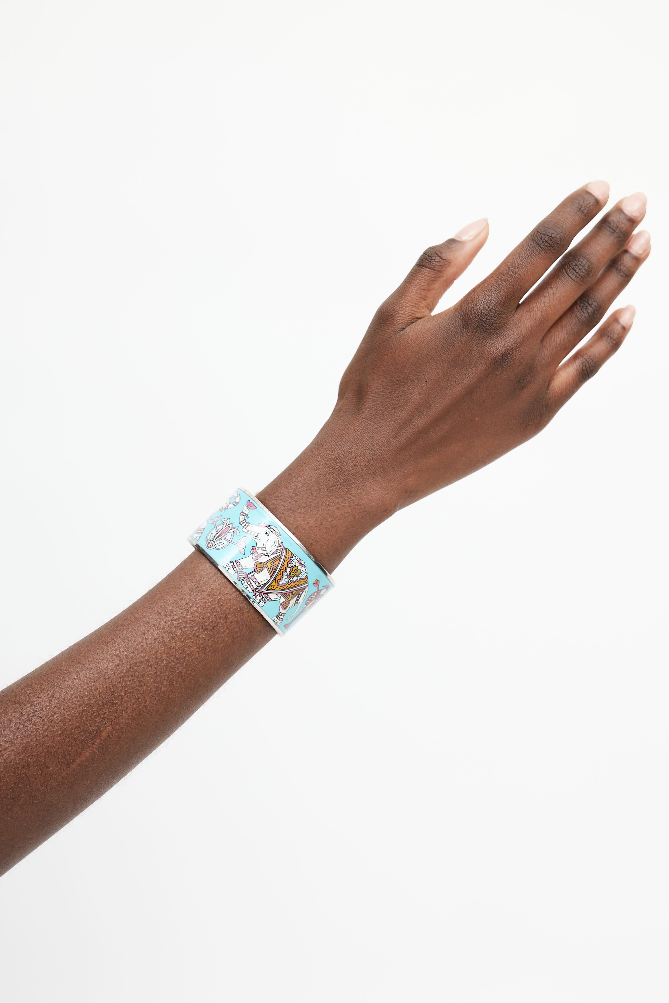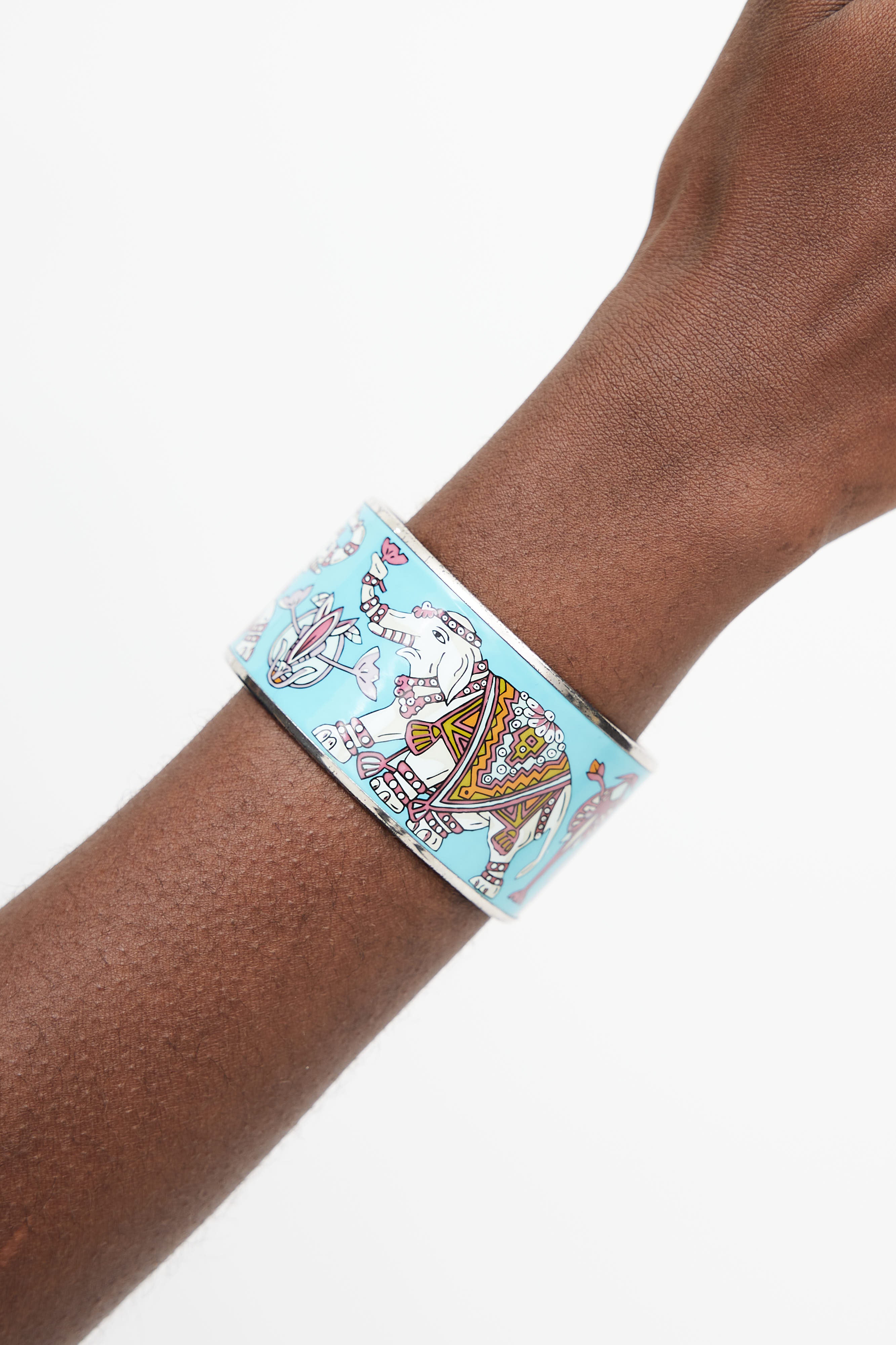 Pre-owned Hermès teal bangle featuring a multicolour elephant Ameille GM print, silver tone trim, and gold tone logo stamp at interior.