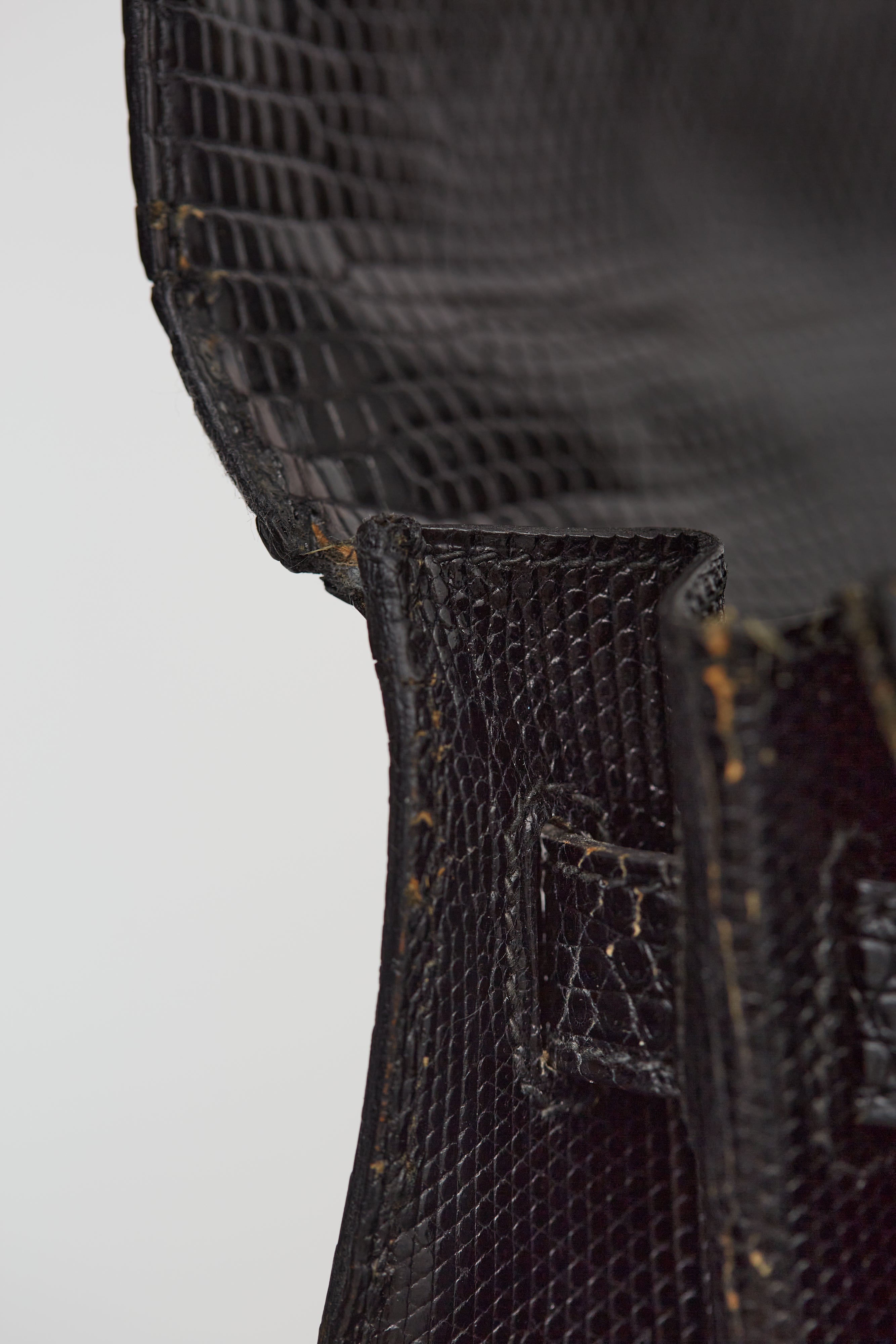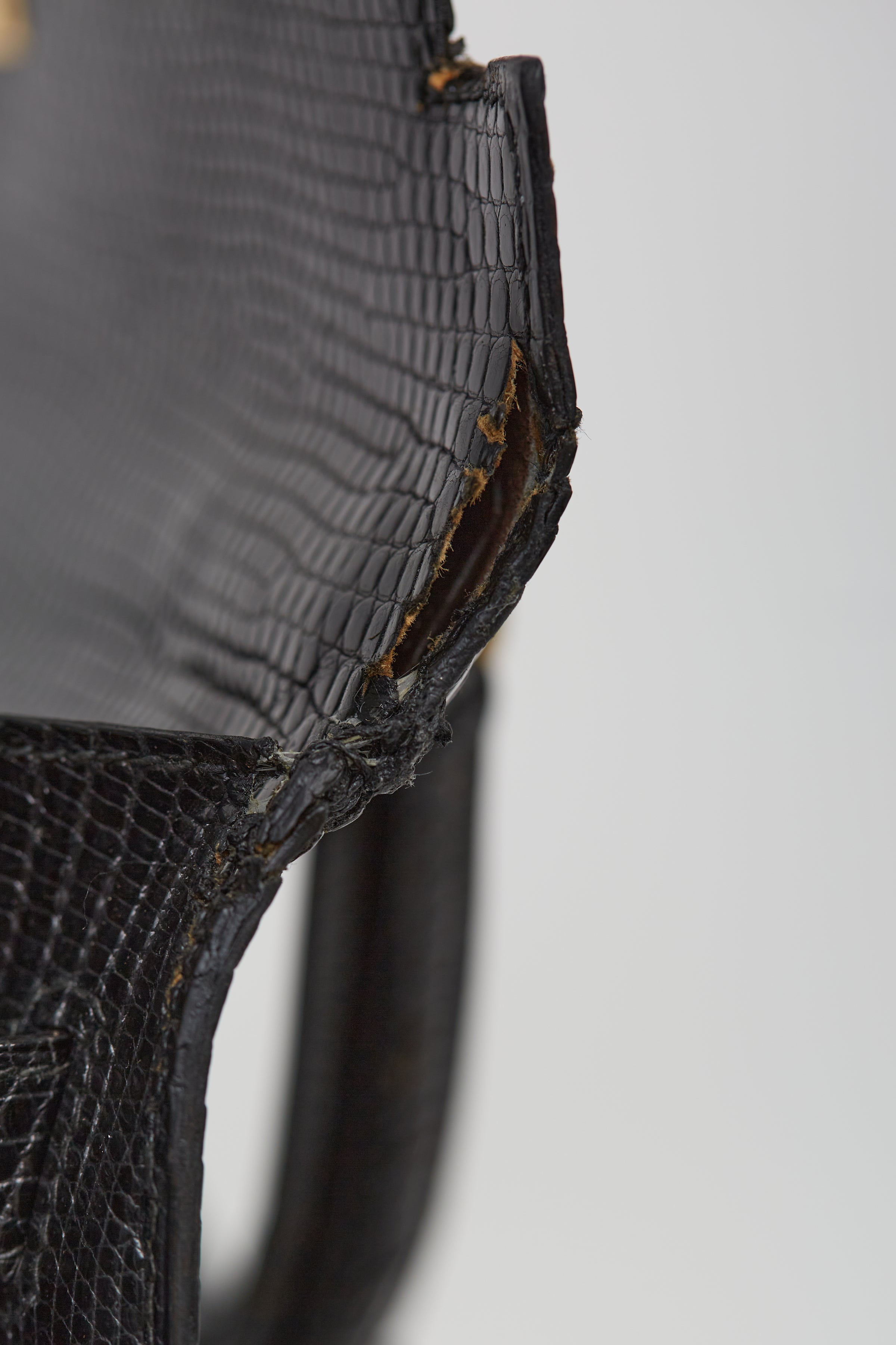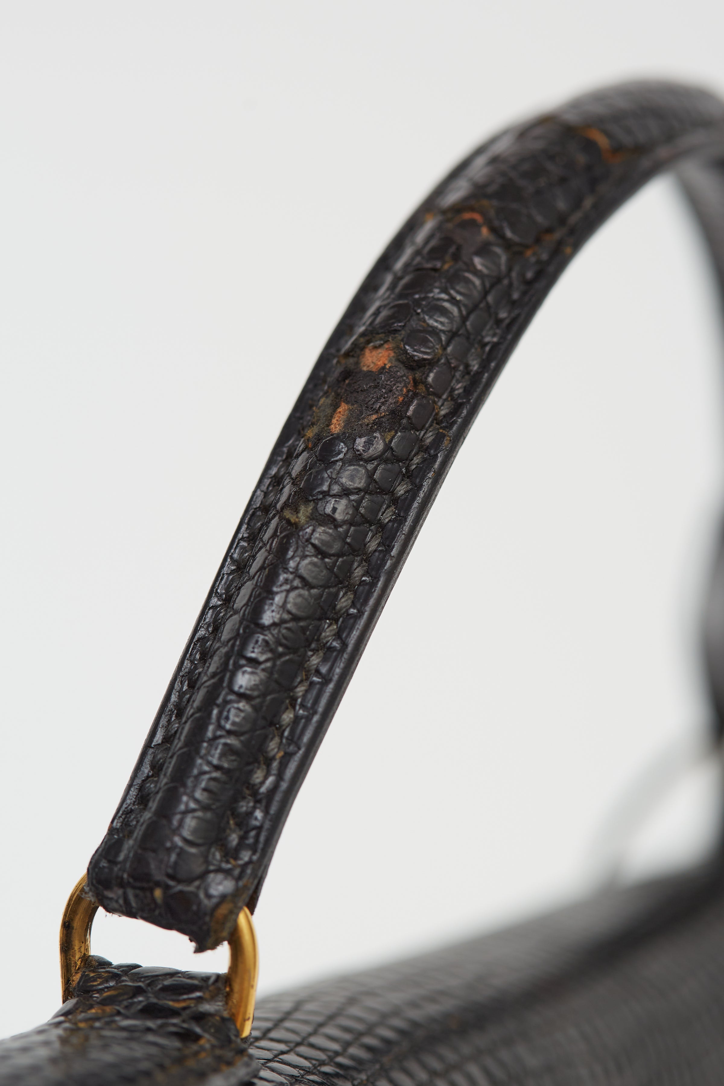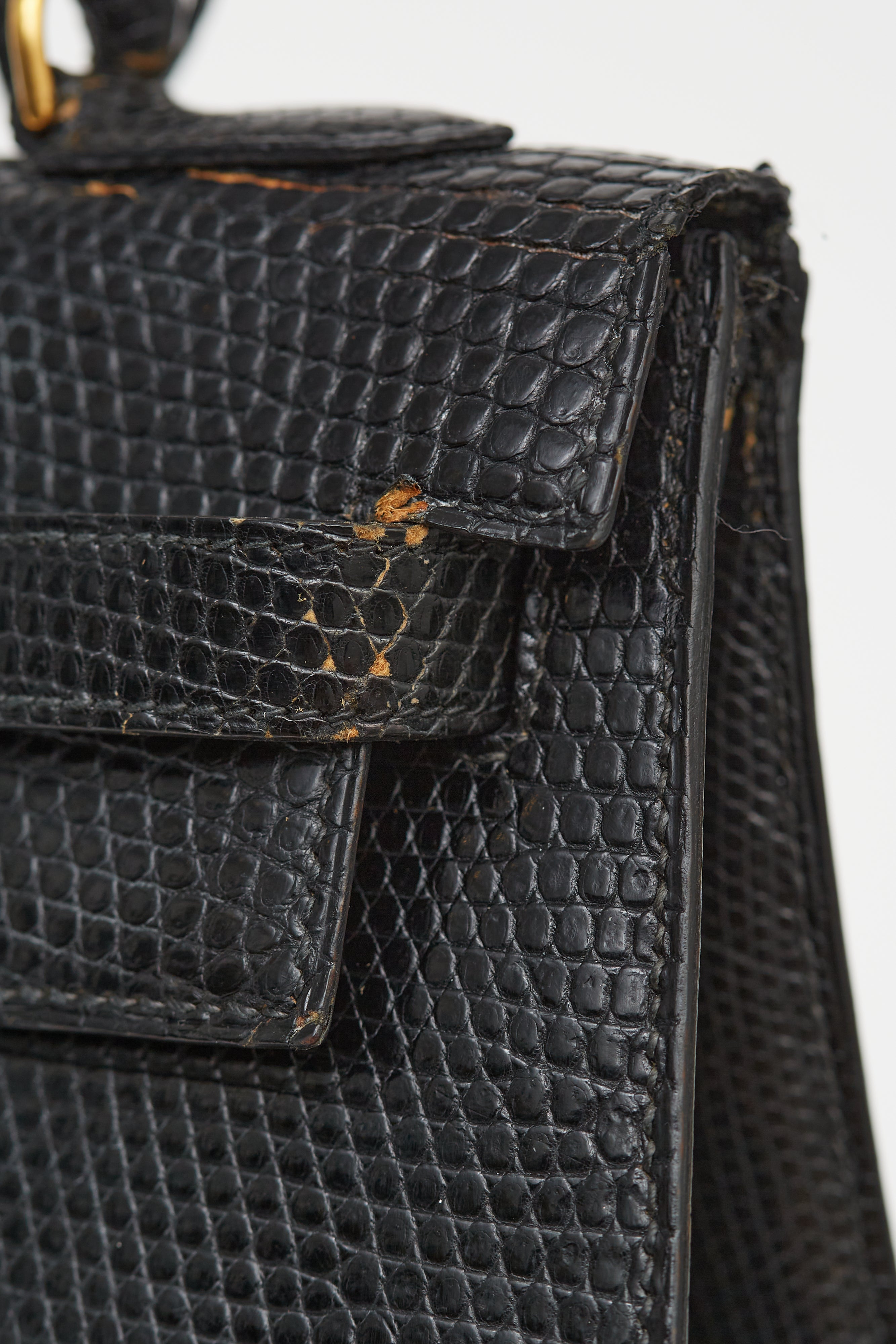 Pre-loved vintage 1990 Hermès Kelly 32 in Noir shiny lizard leather featuring top handle, tonal stitching and glazing, gold-tone hardware, top flap with side straps, twist closure, protective metal feet at bottom, leather key and padlock attachment with single compartment with one inner slip, zip pocket and tonal leather lining.